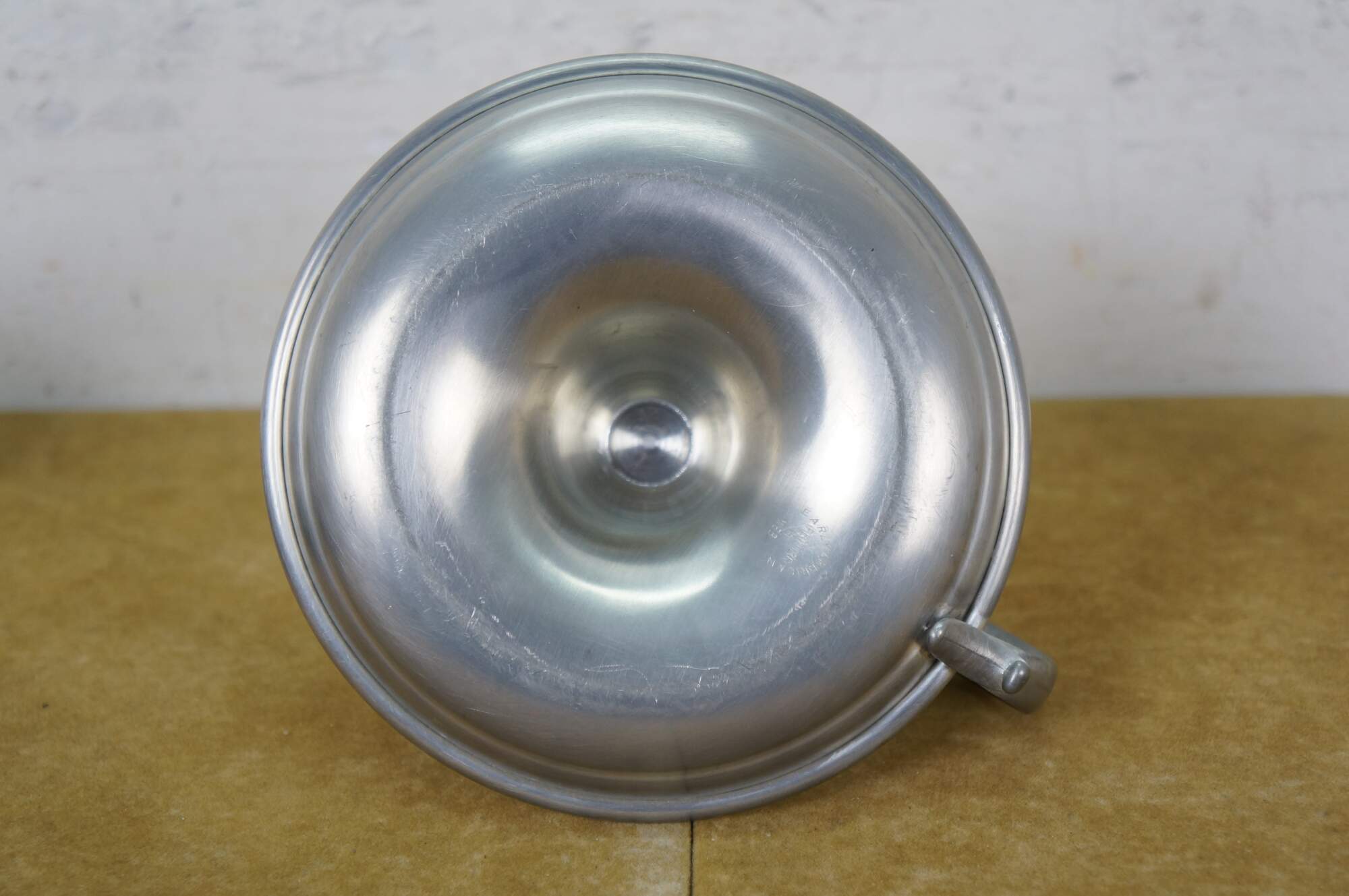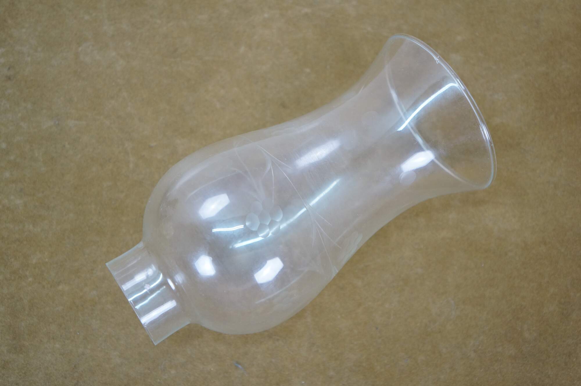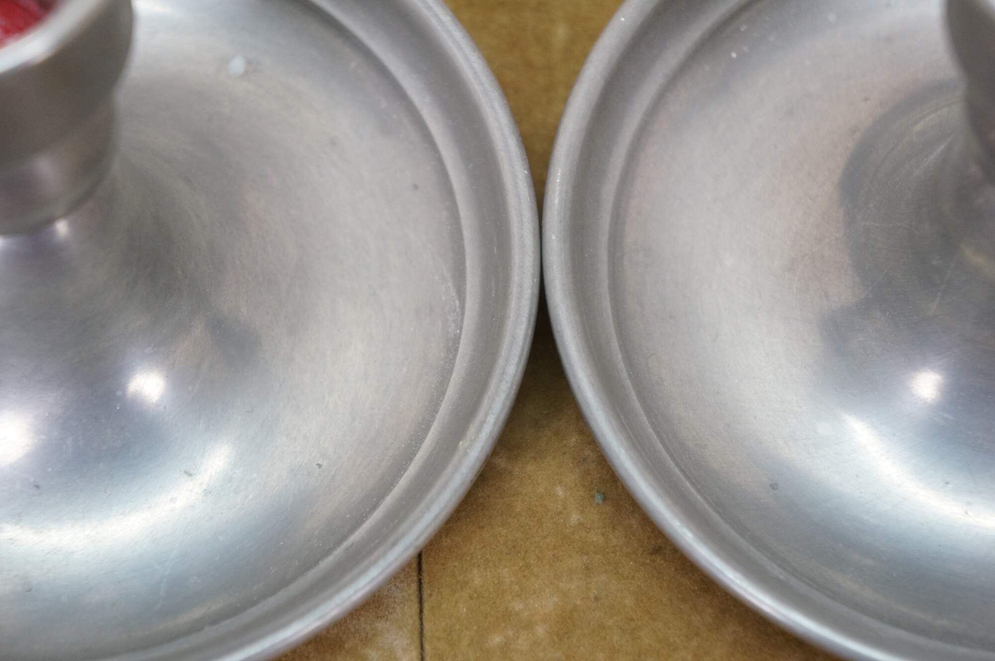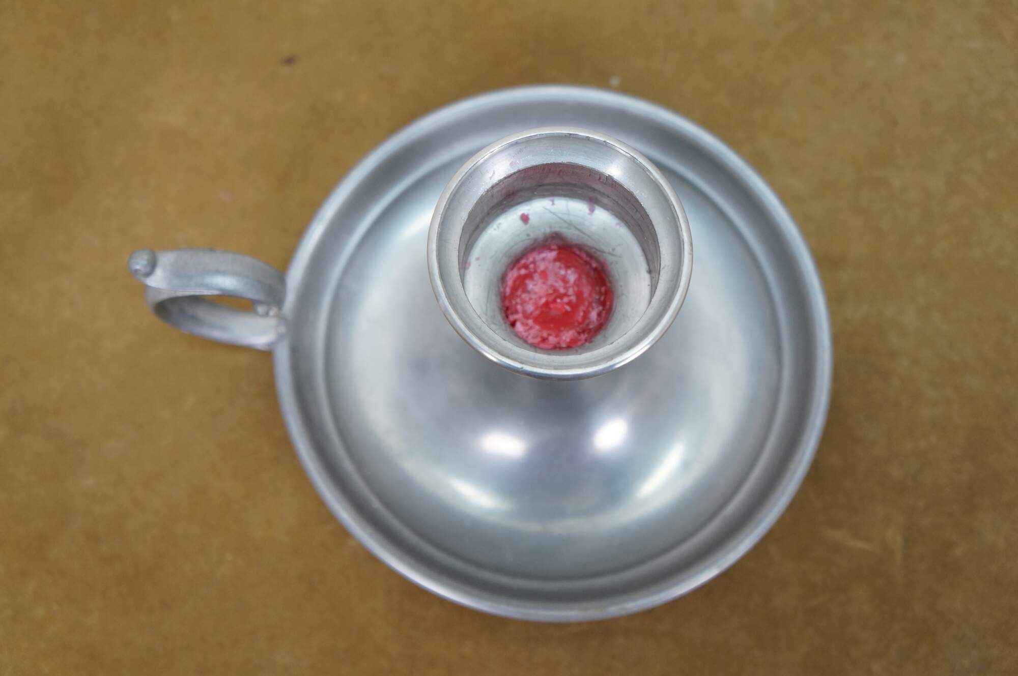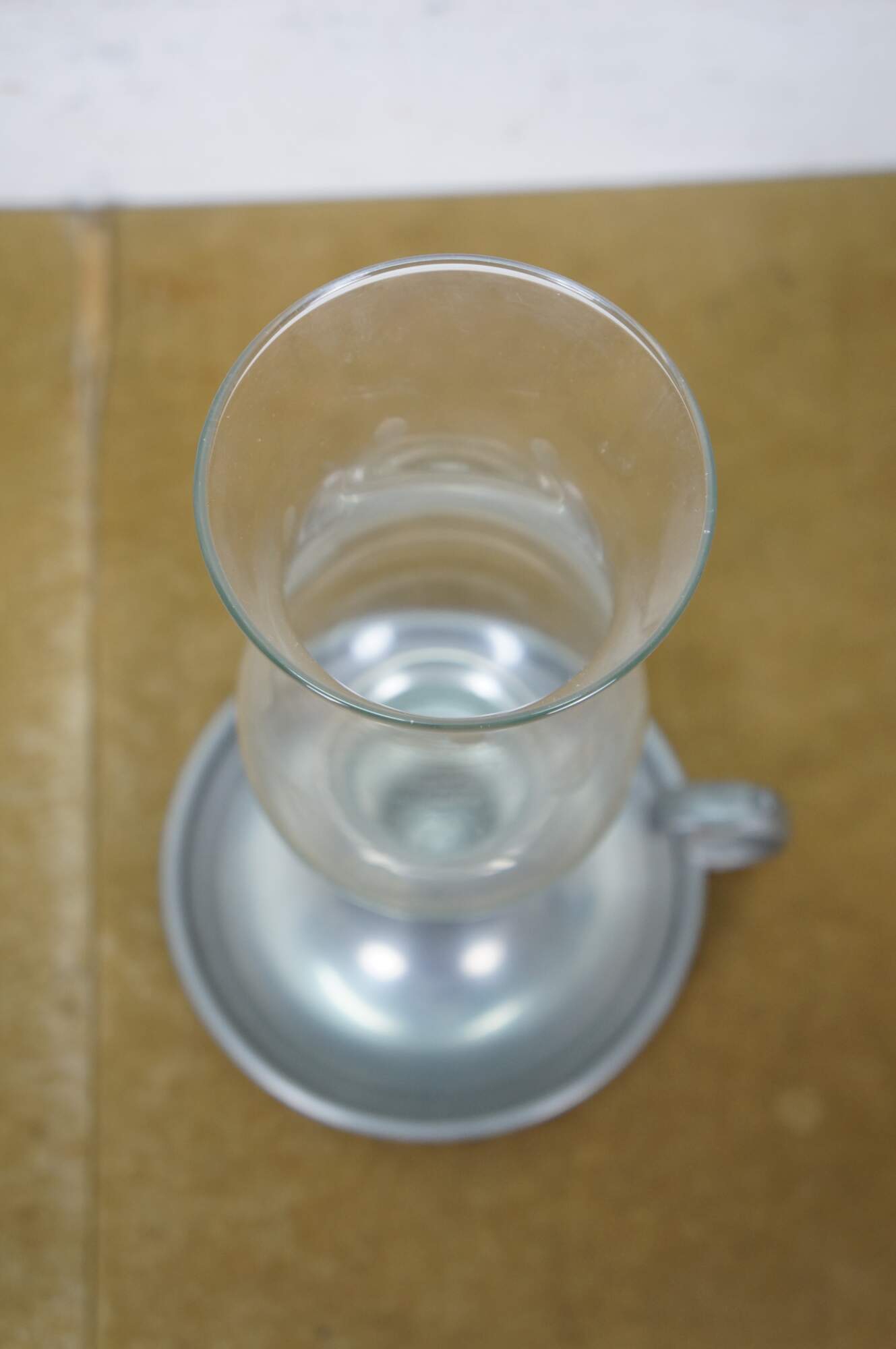 Pair of vintage Early American Pewter by Web chamberstick style candle holders with scrolled handles and clear glass hurricanes witched with flowers.