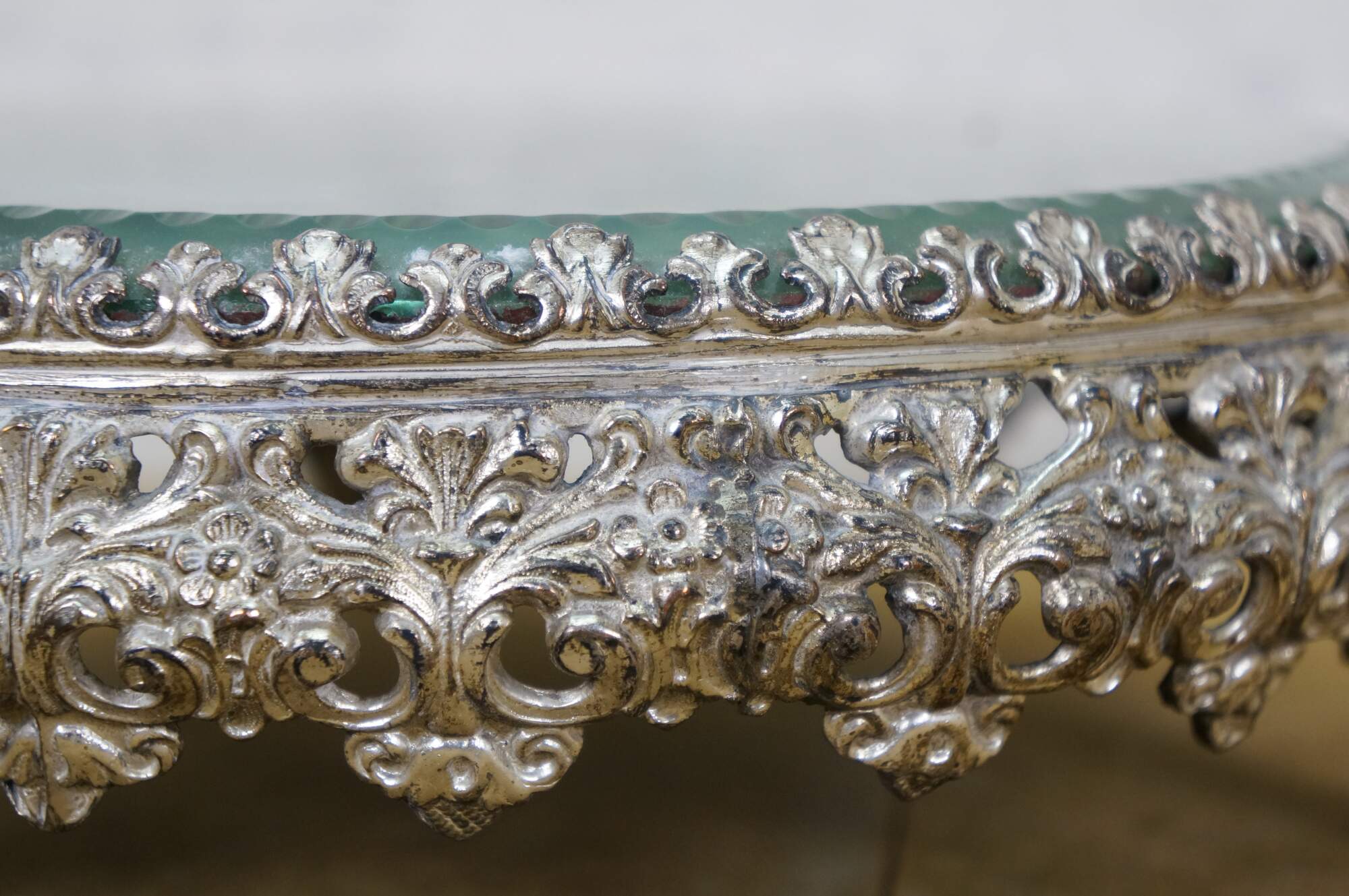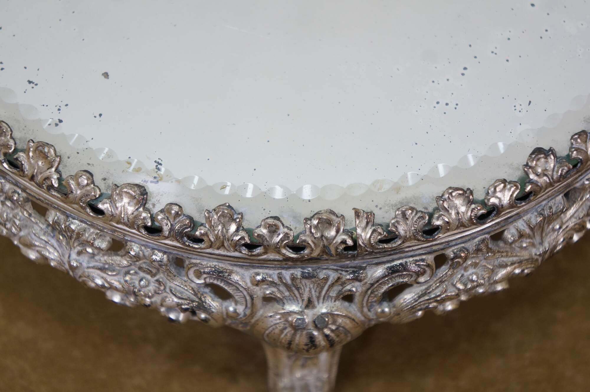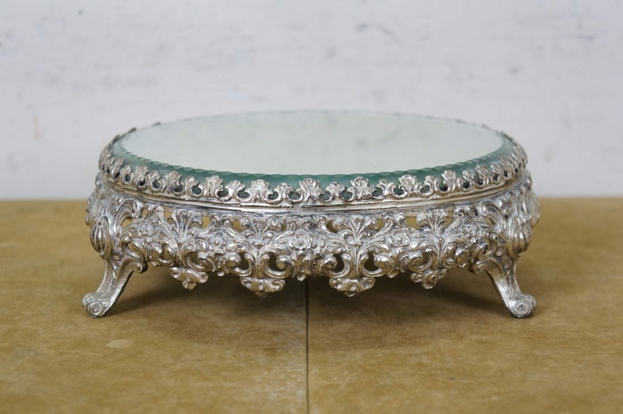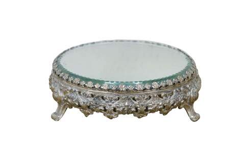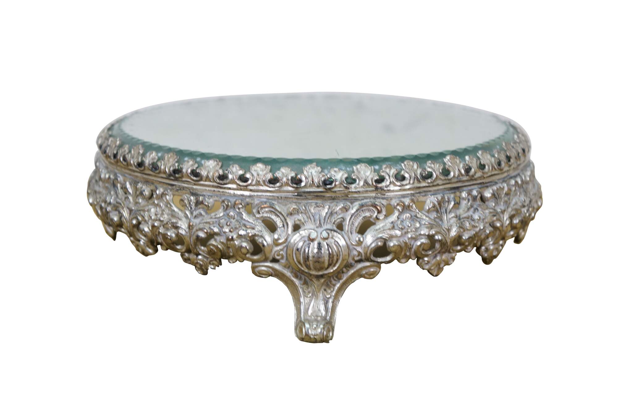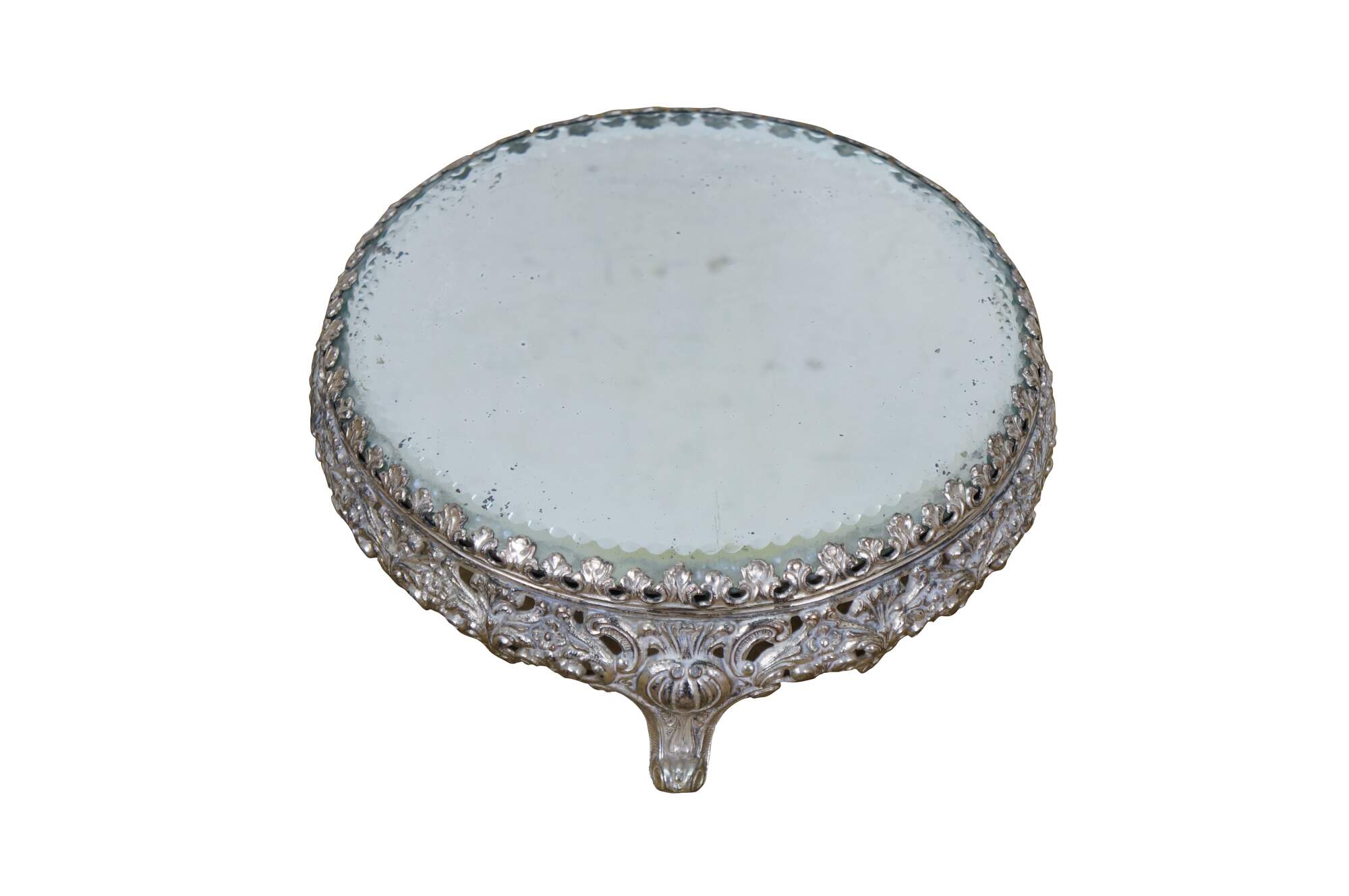 Late 19th to early 20th century tabletop mirror / plateau - features a round thick glass mirror with beveled and cut edge, framed in an art nouveau silverplate stand with three scrolled feet and floral and foliate patterns.