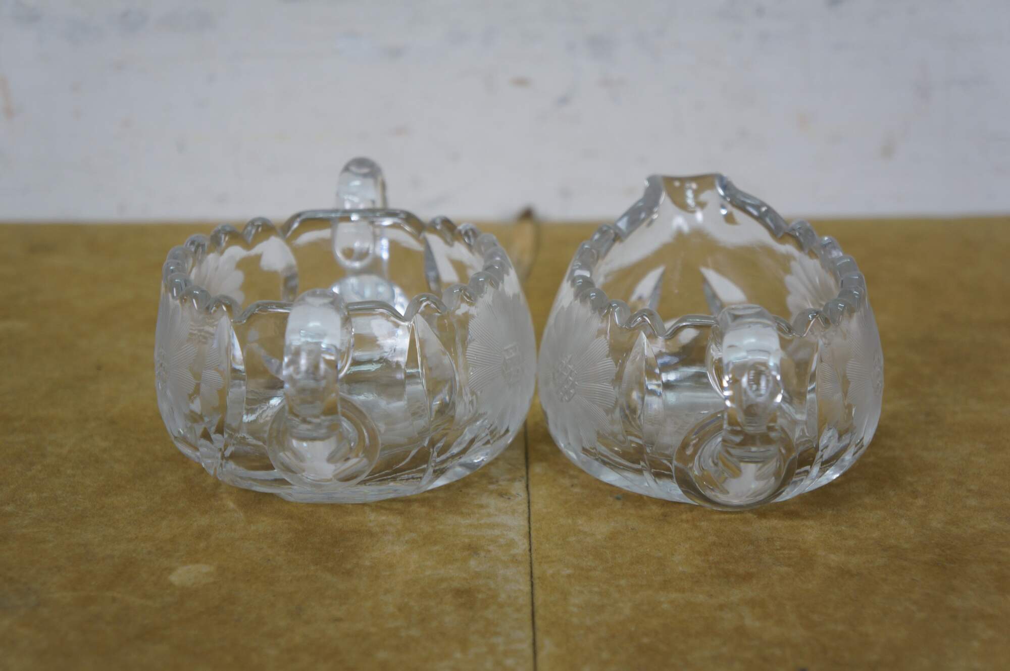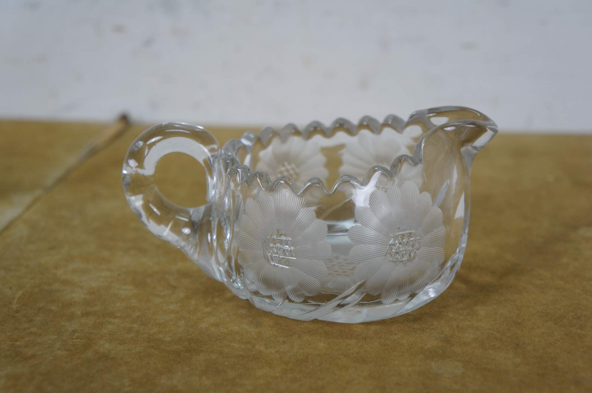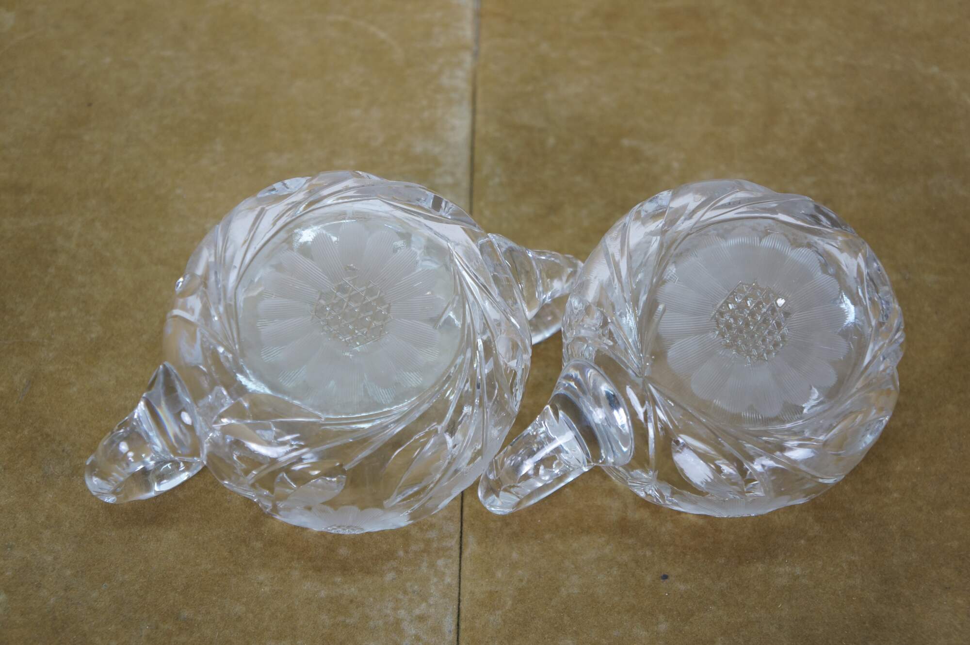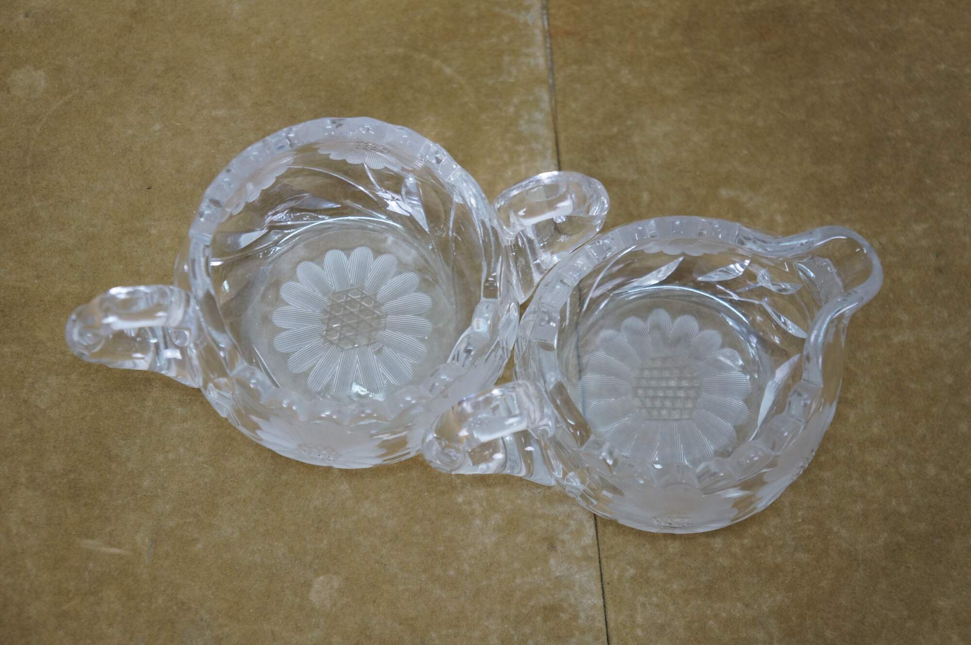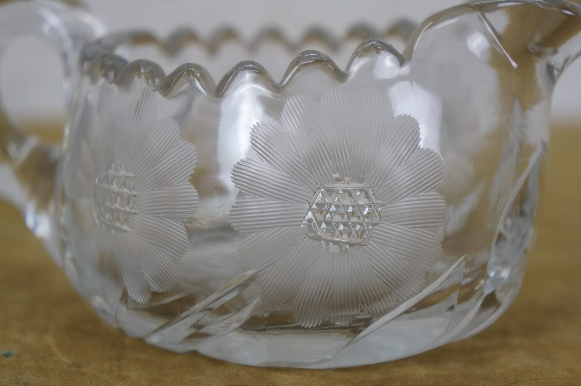Early 20th century American Brilliant cut glass / crystal cream and sugar bowl set. Squat rounded forms with thumbprint handles, sawtooth edge and a pattern of large etched daisies.