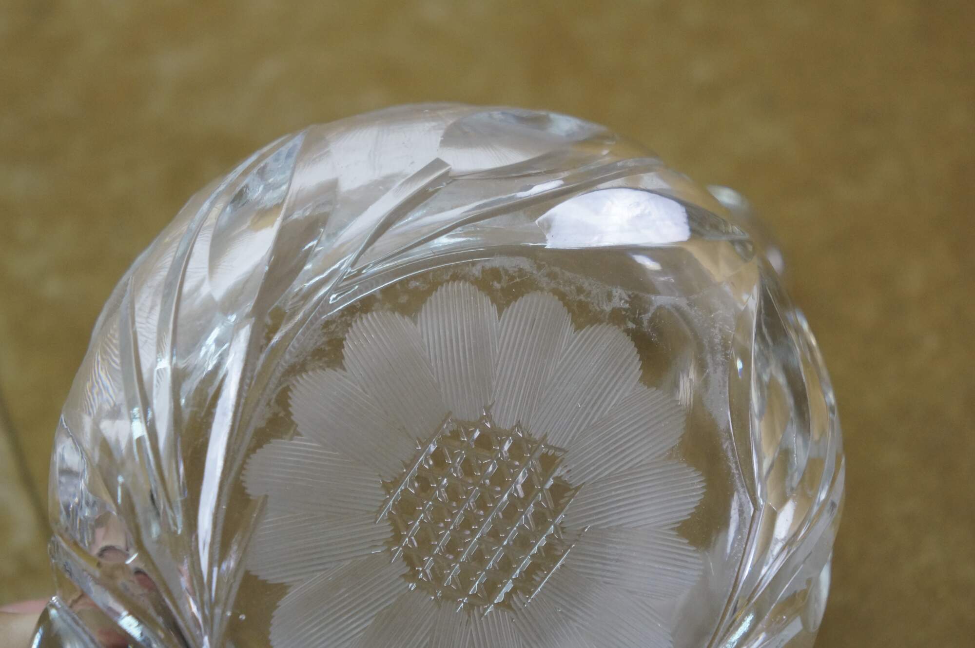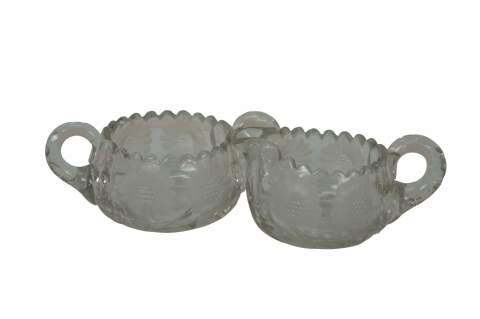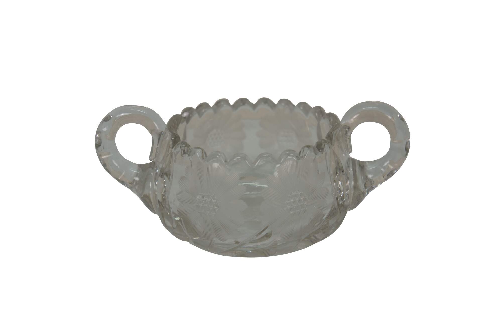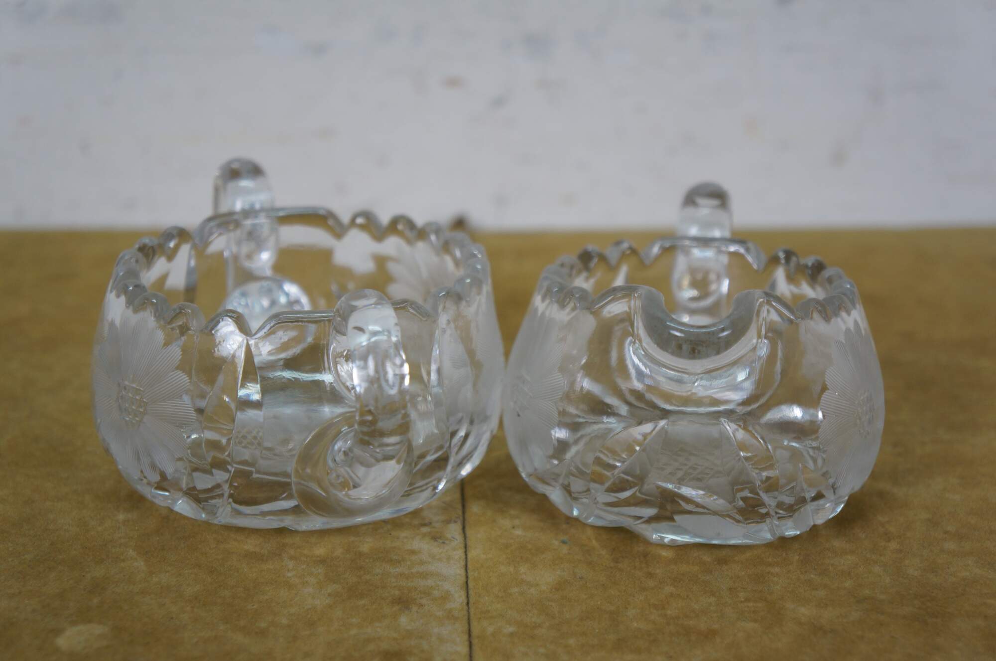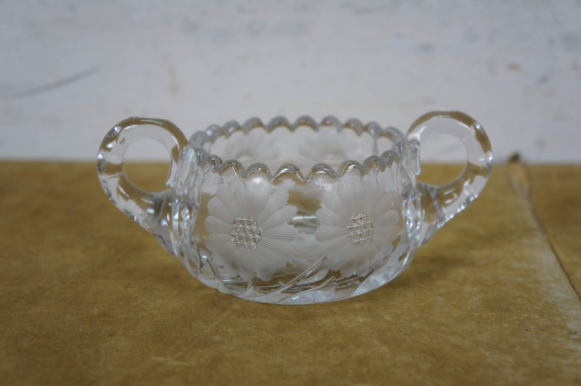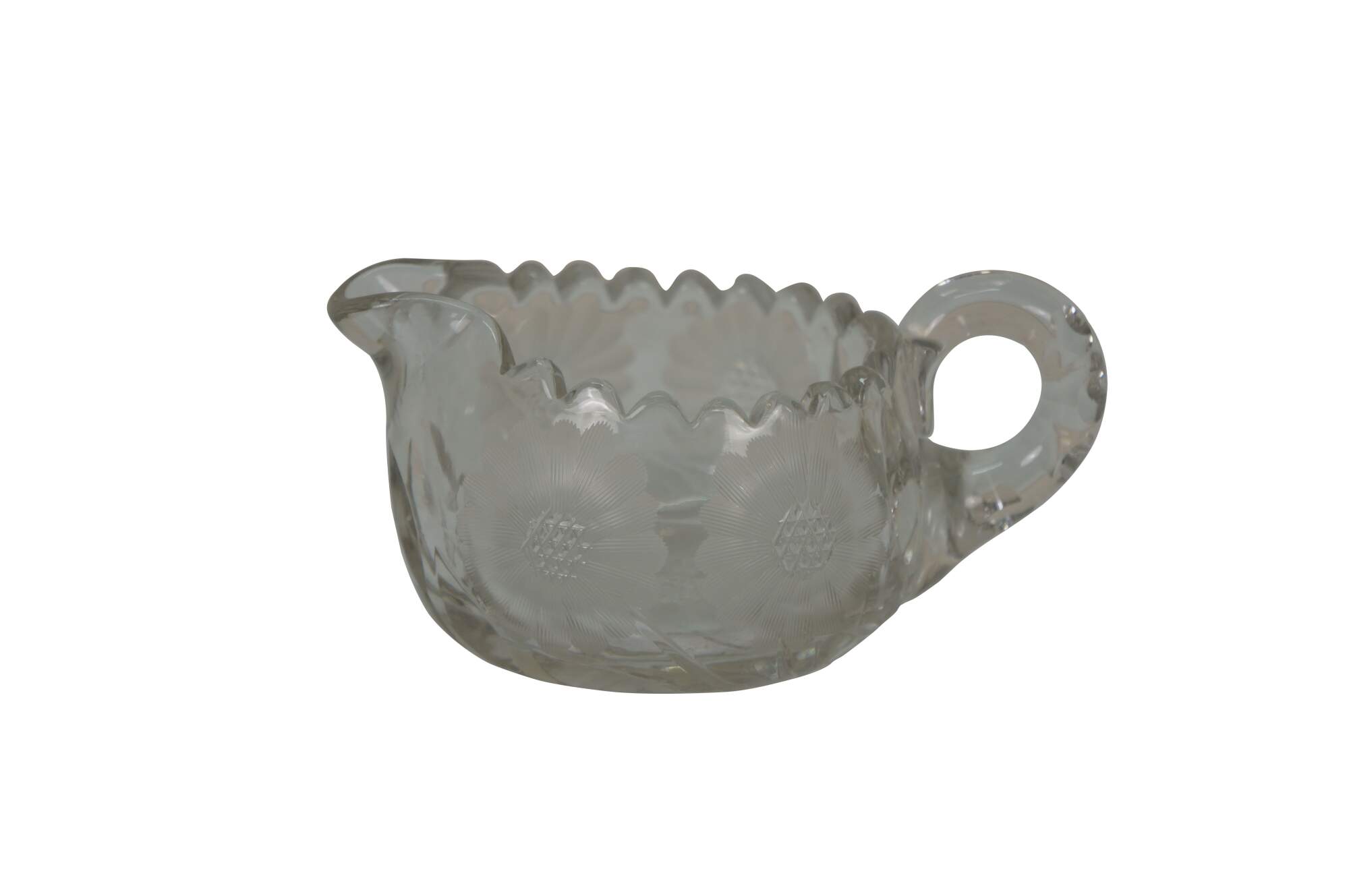 Early 20th century American Brilliant cut glass / crystal cream and sugar bowl set. Squat rounded forms with thumbprint handles, sawtooth edge and a pattern of large etched daisies.