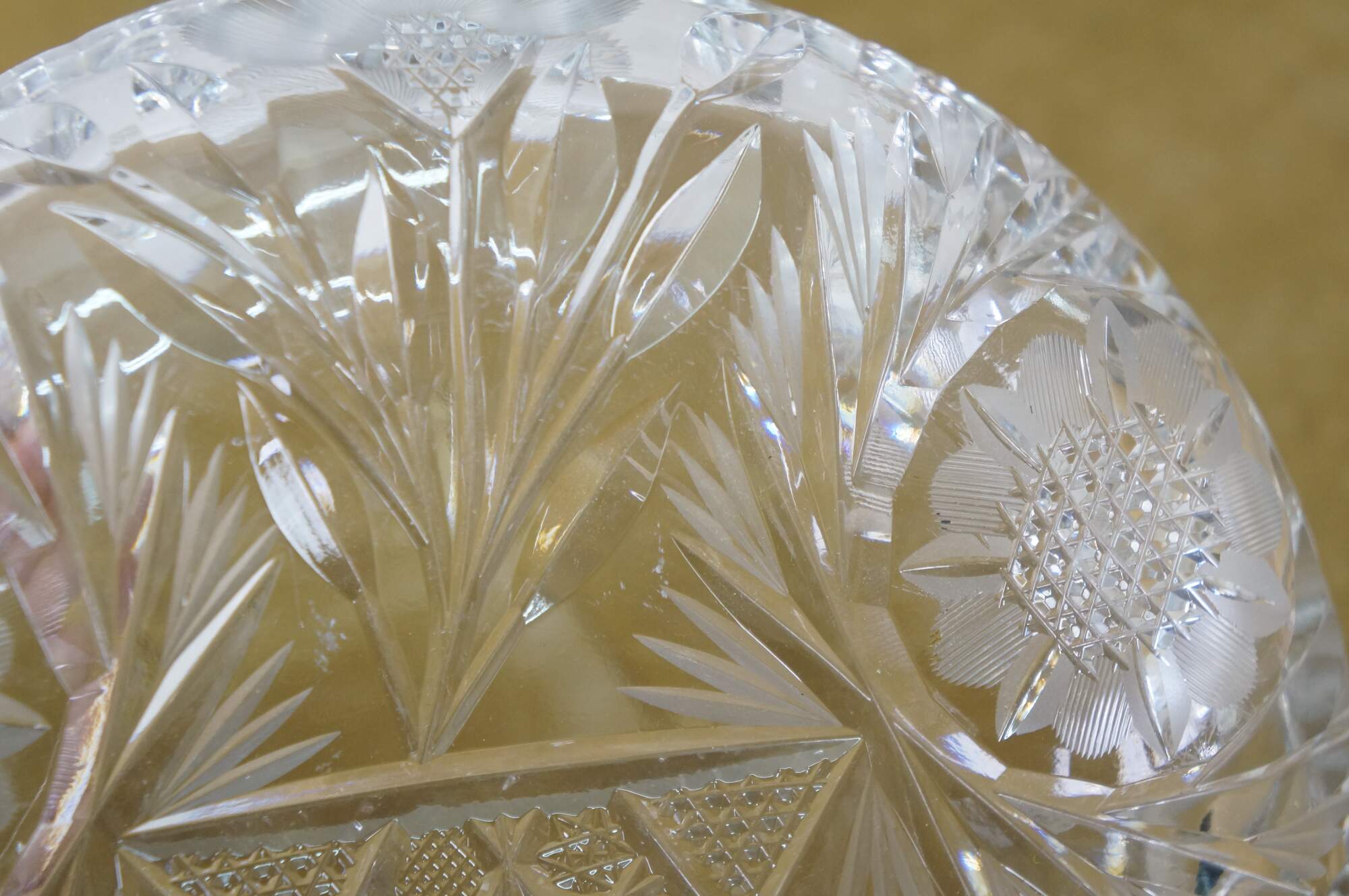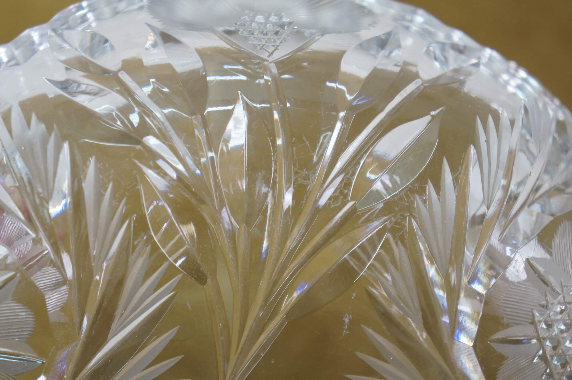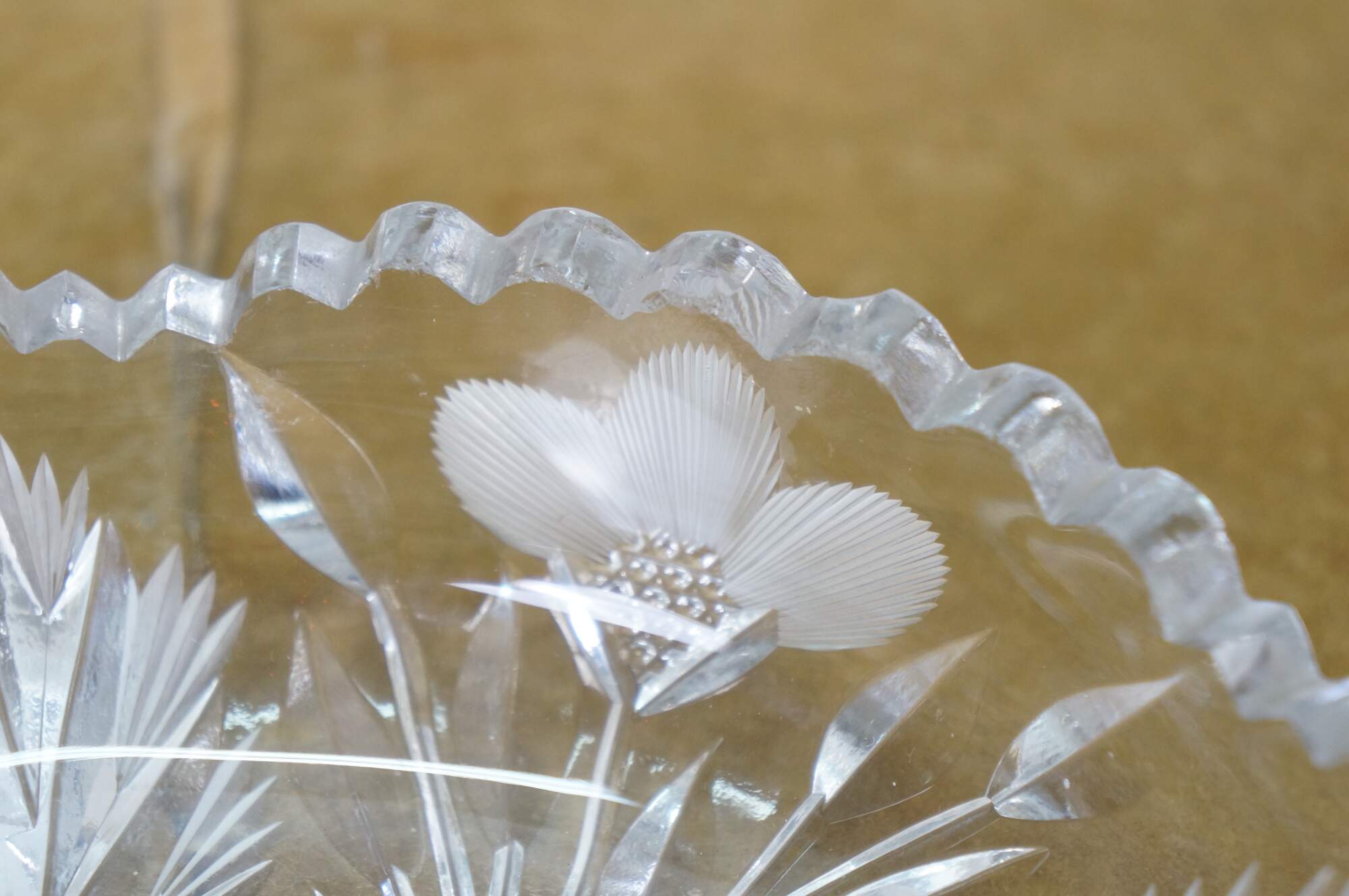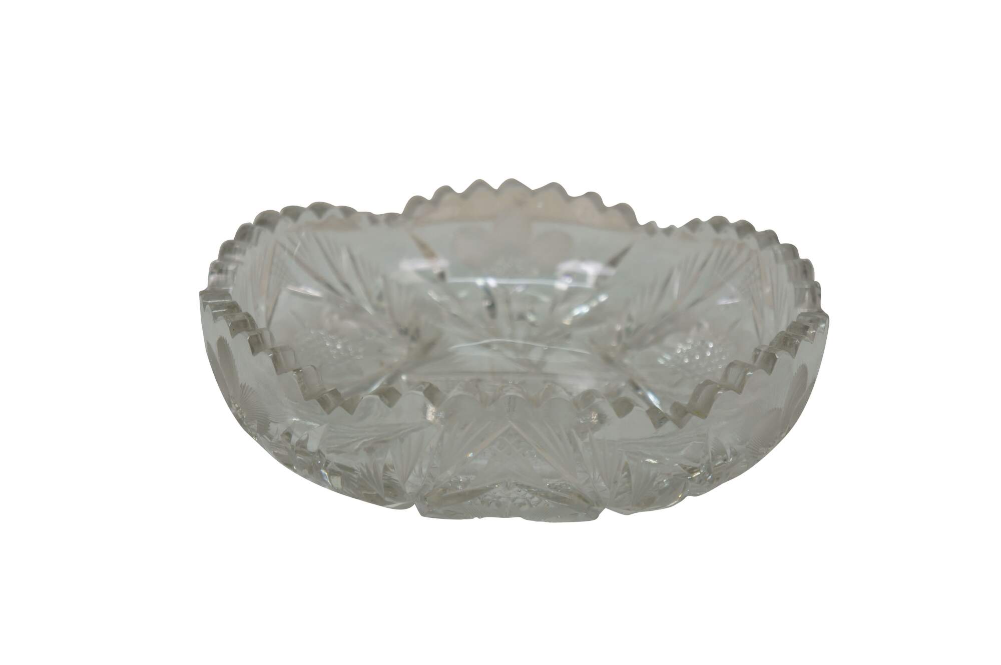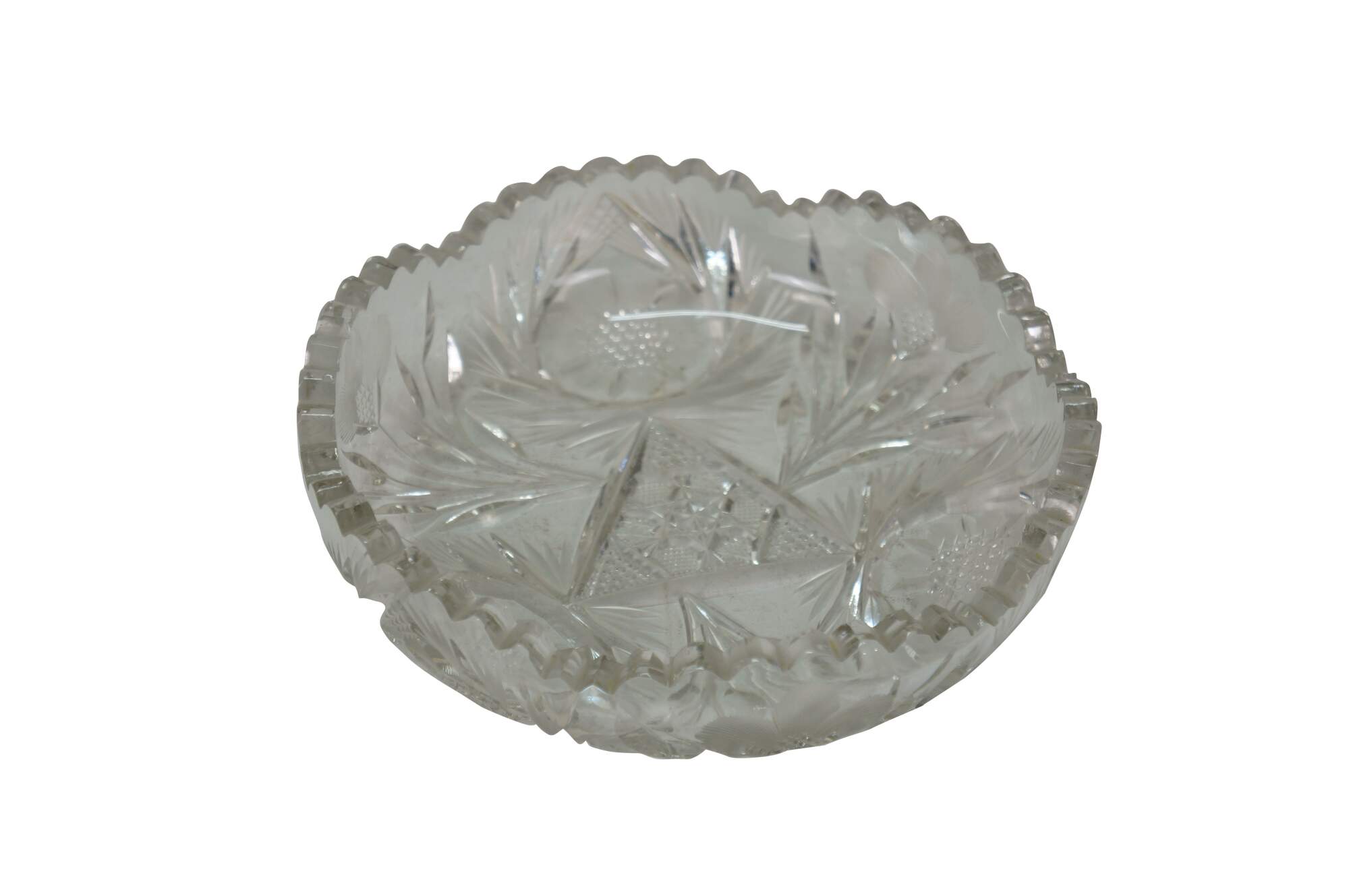 Early 20th century American Brilliant Period cut crystal / glass nut / candy dish - low, round shape with sawtooth edge, cut with a triangular patterned center riinged with leafy stems and etched flower blossoms.