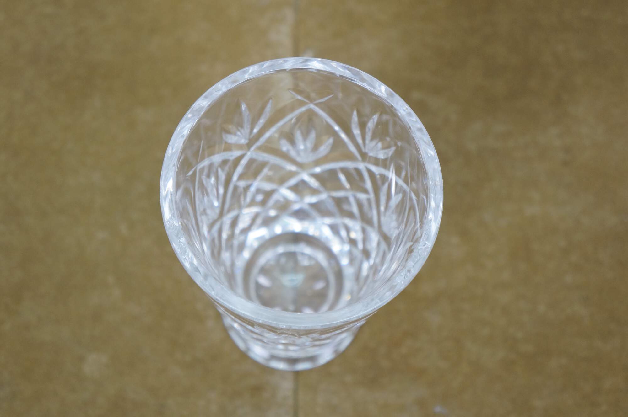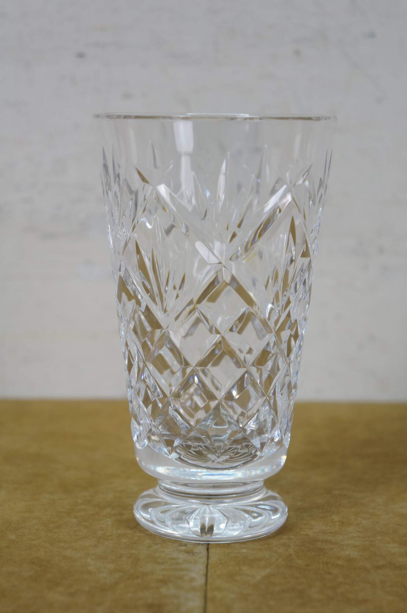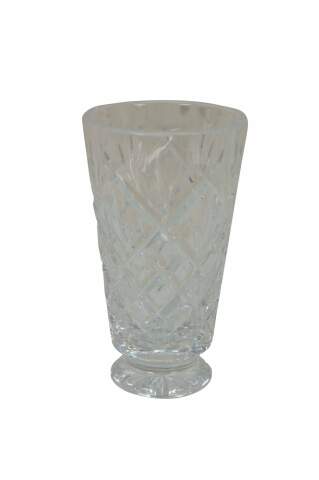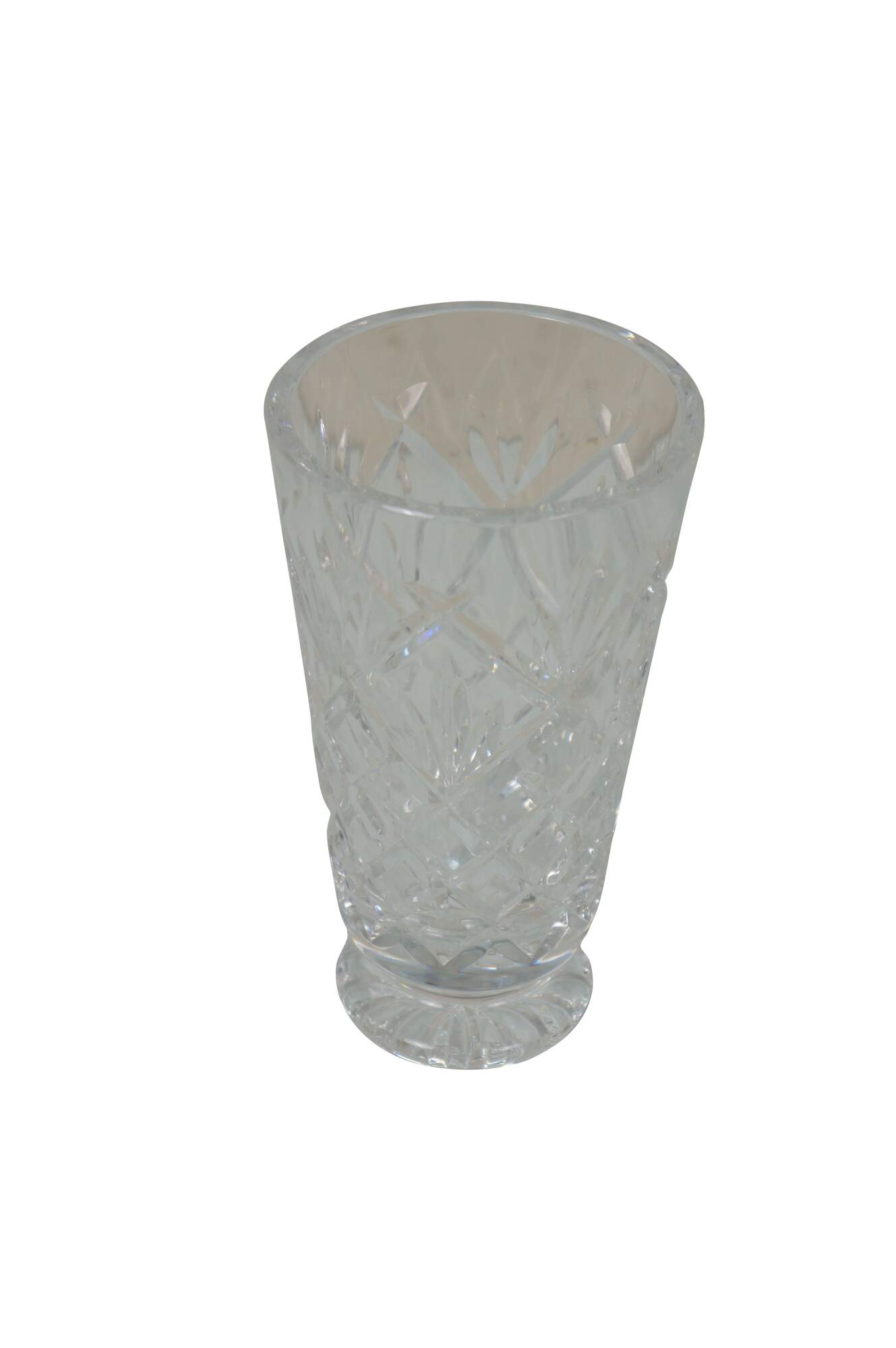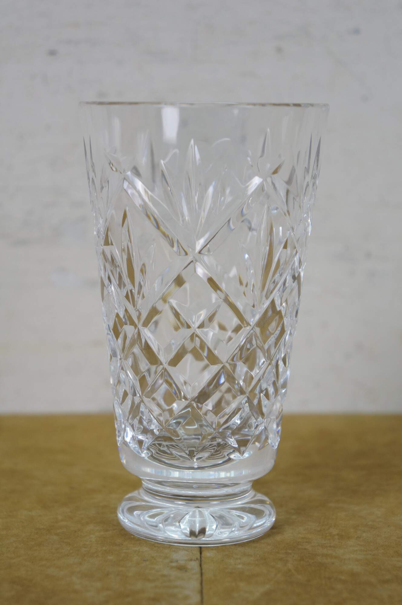 Late 20th century Waterford clear cut crystal Innisfree flower vase. Round pedestal foot with trumpet shaped body with diamond and fan shaped cuts.