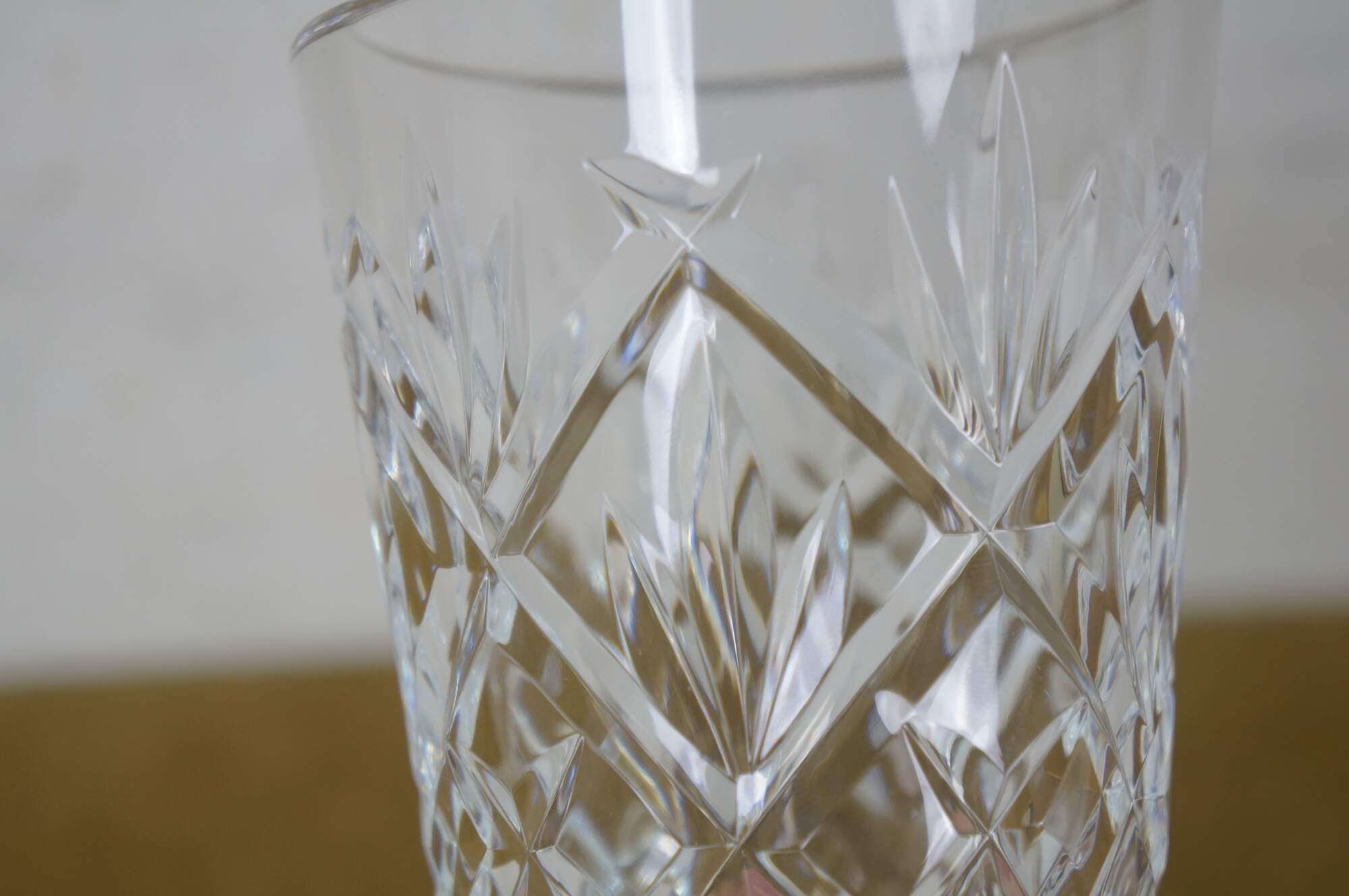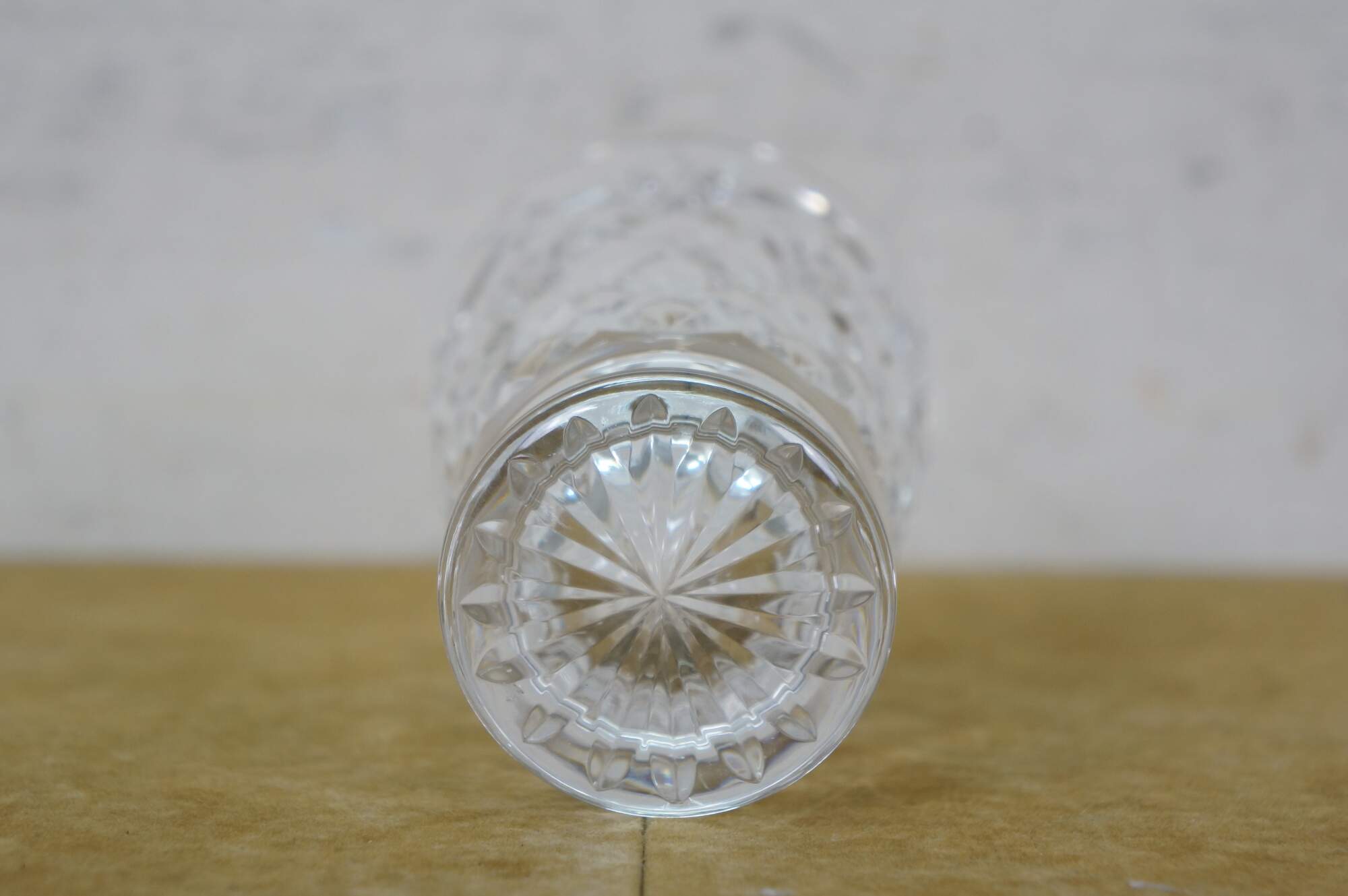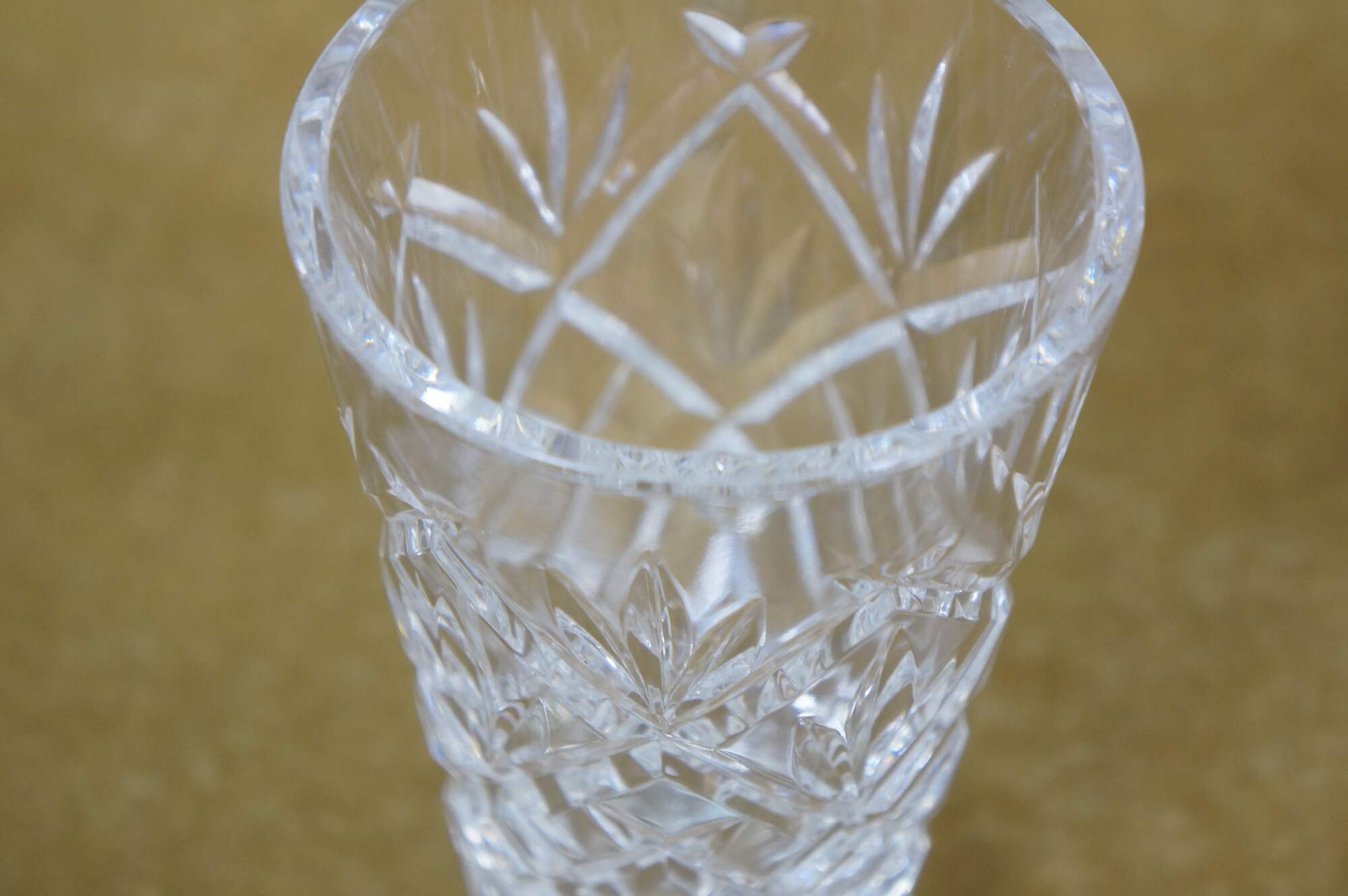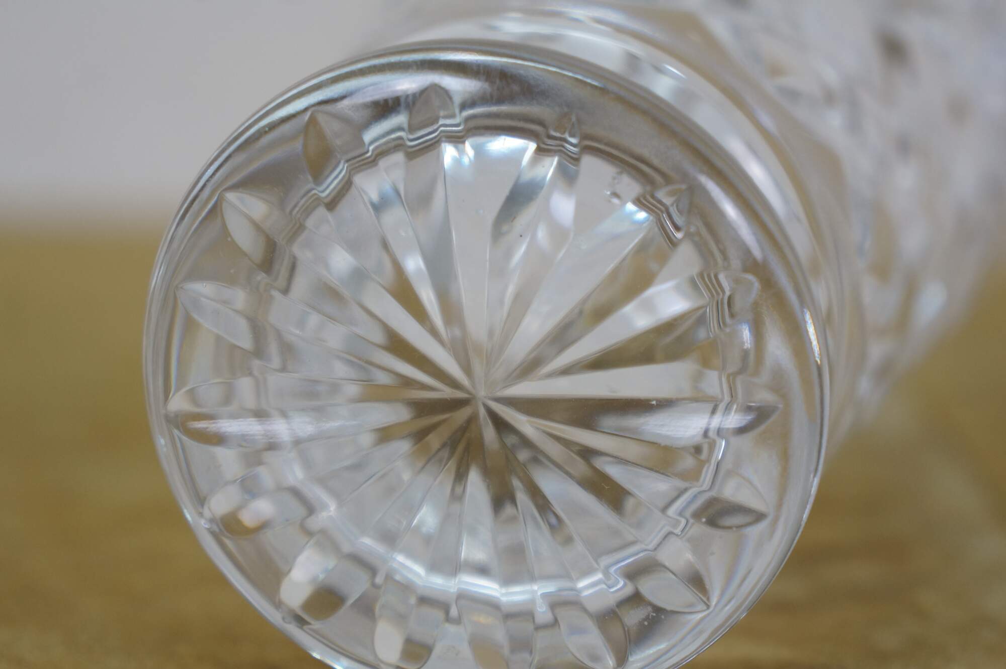 Late 20th century Waterford clear cut crystal Innisfree flower vase. Round pedestal foot with trumpet shaped body with diamond and fan shaped cuts.