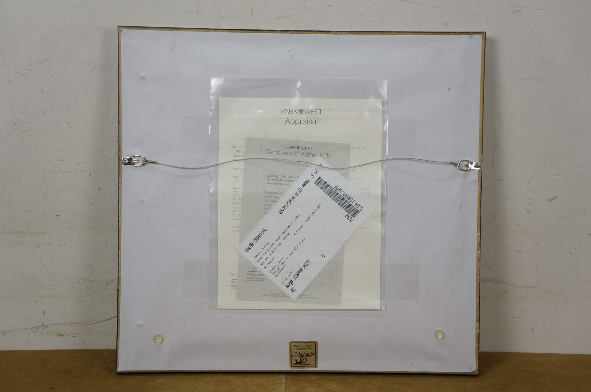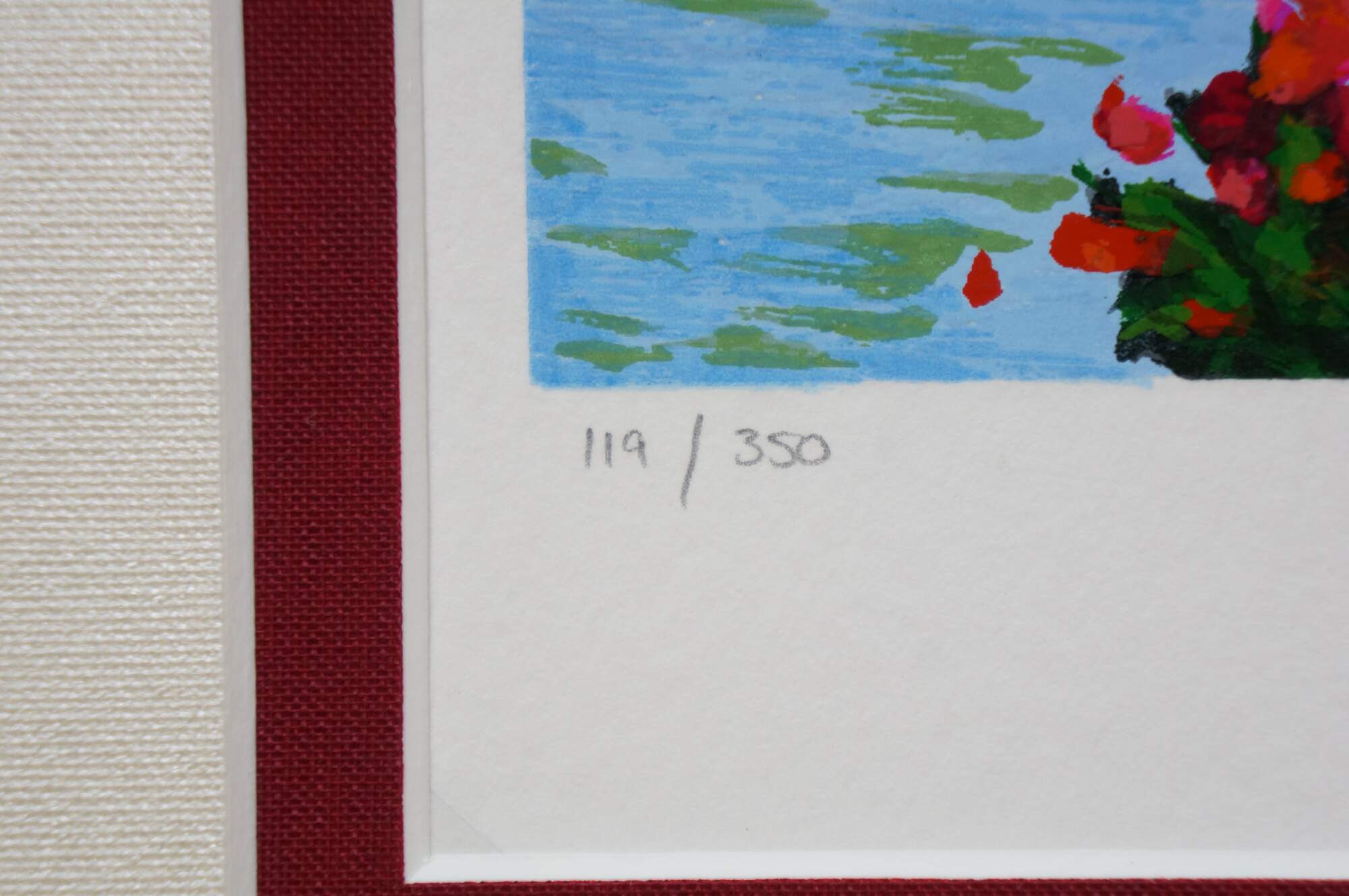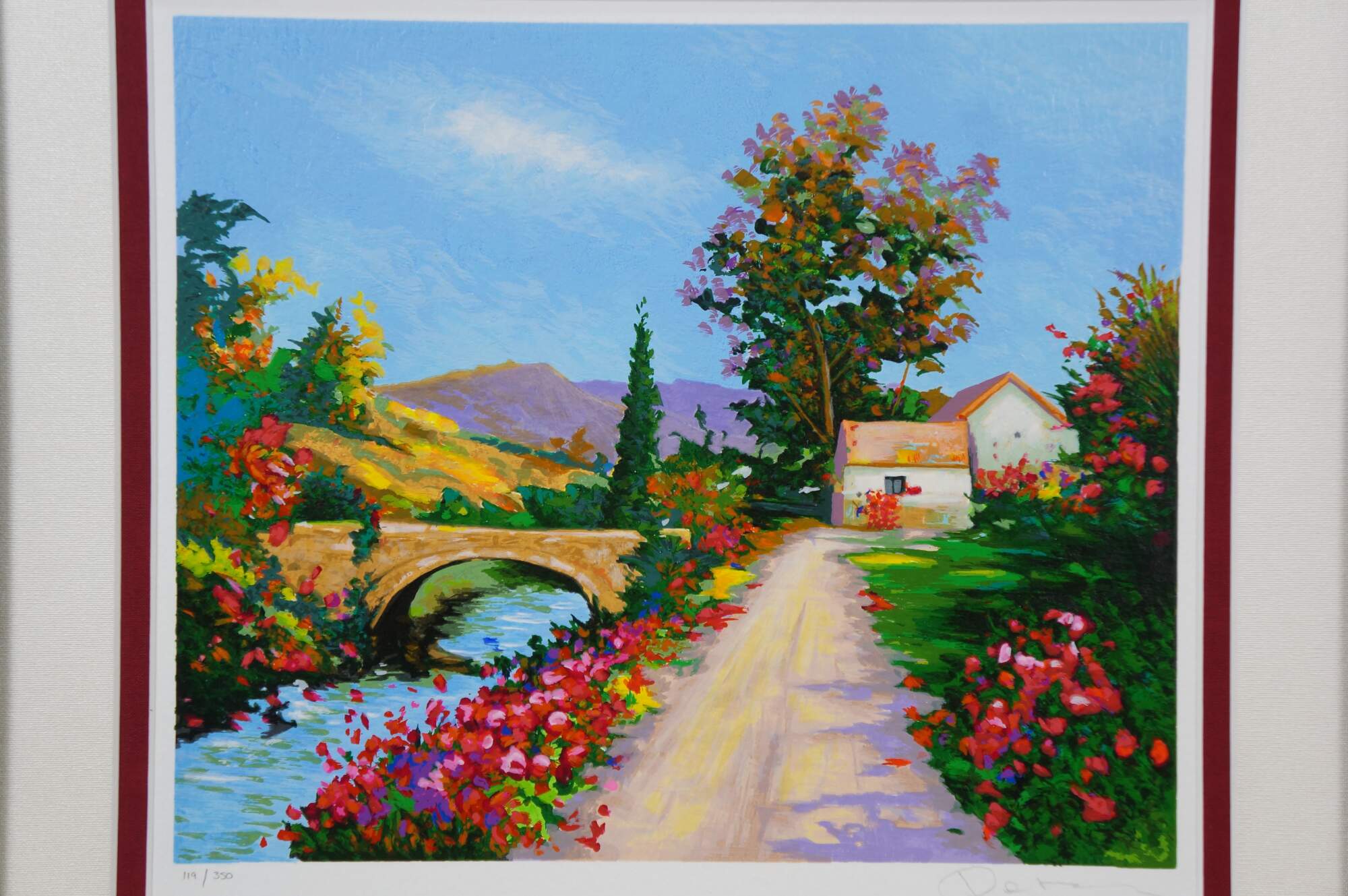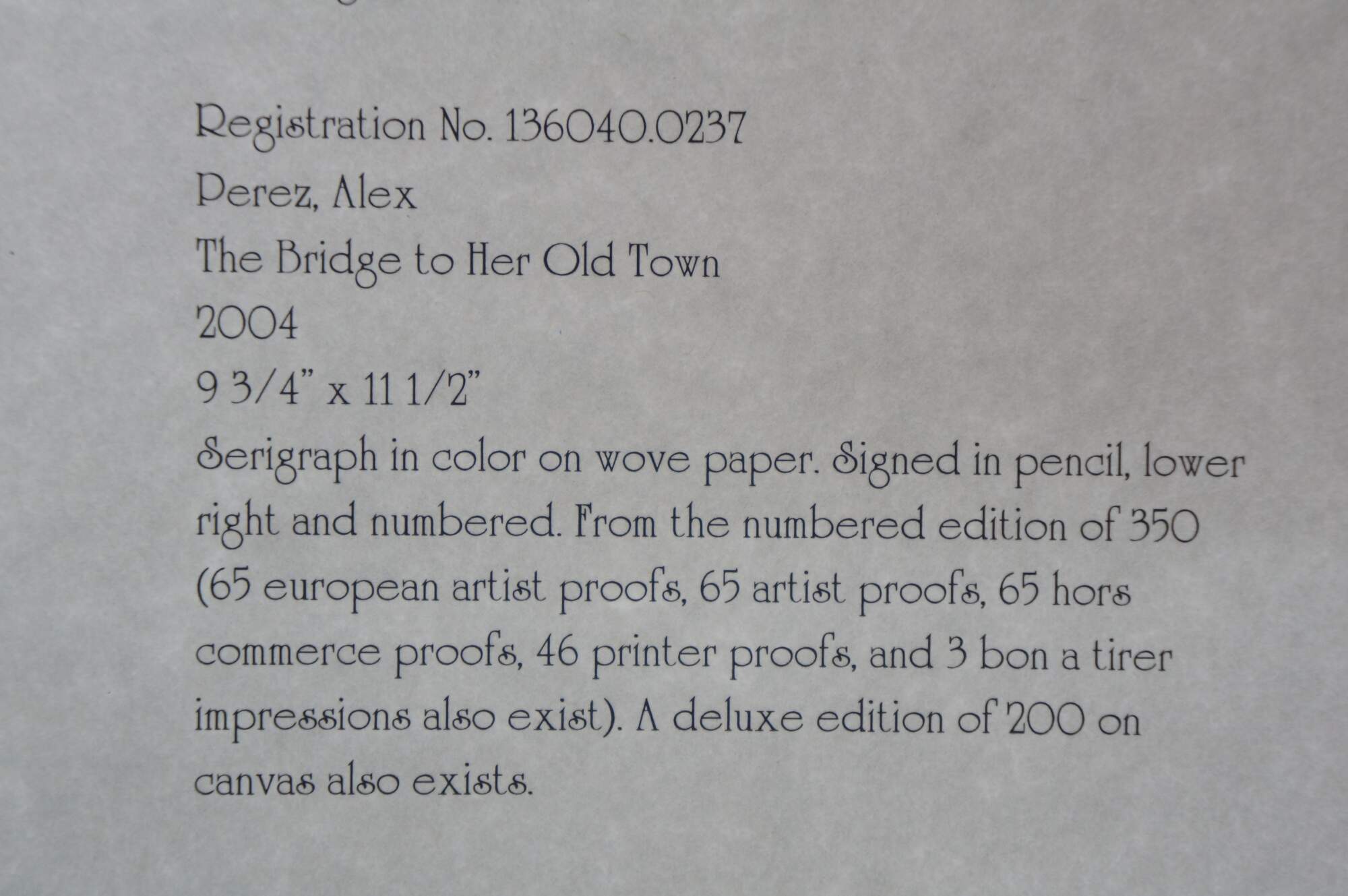 2004 limited edition serigraph on paper titled "The Bridge to Her Old Town" by Alex Perez. Impressionist landscape of a bright country road along a canal or river, with a stone bridge, red roofed cottage and mountains in the background. Pencil signed, lower right. Numbered 119/350, lower left. Black beveled wood frame with gilt foliate edge; white and red layered mat. Includes Certificate of Authenticity.