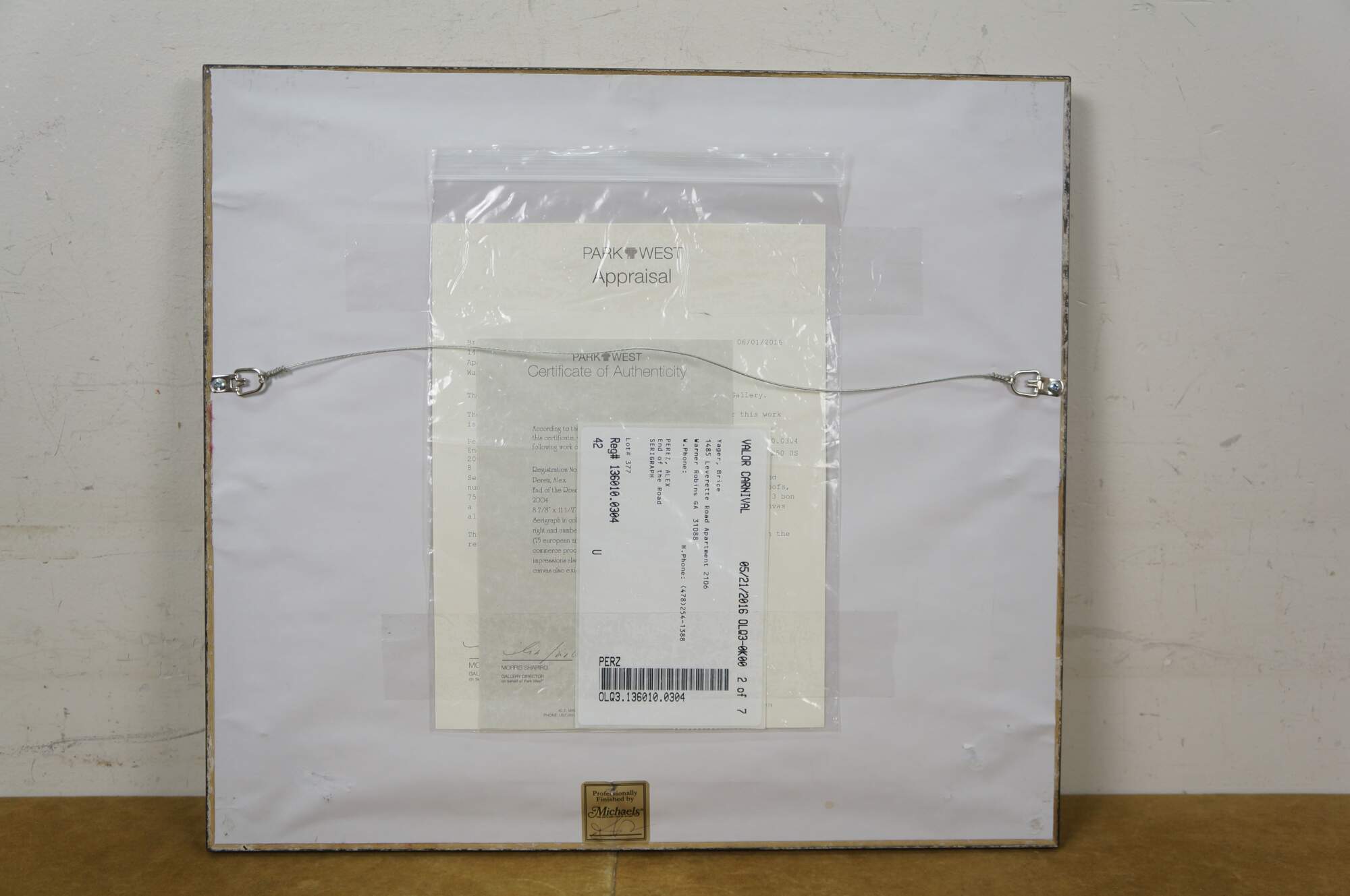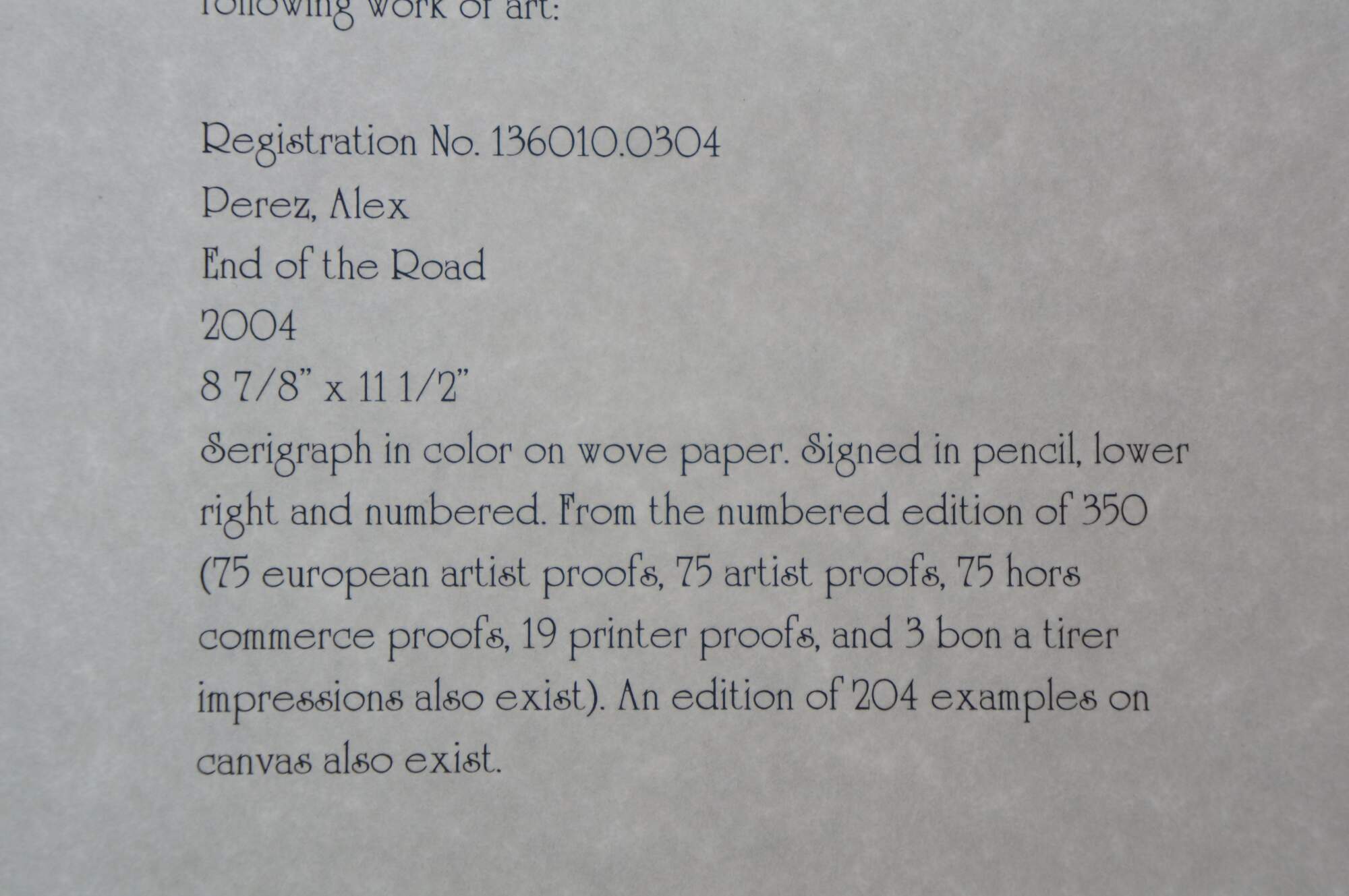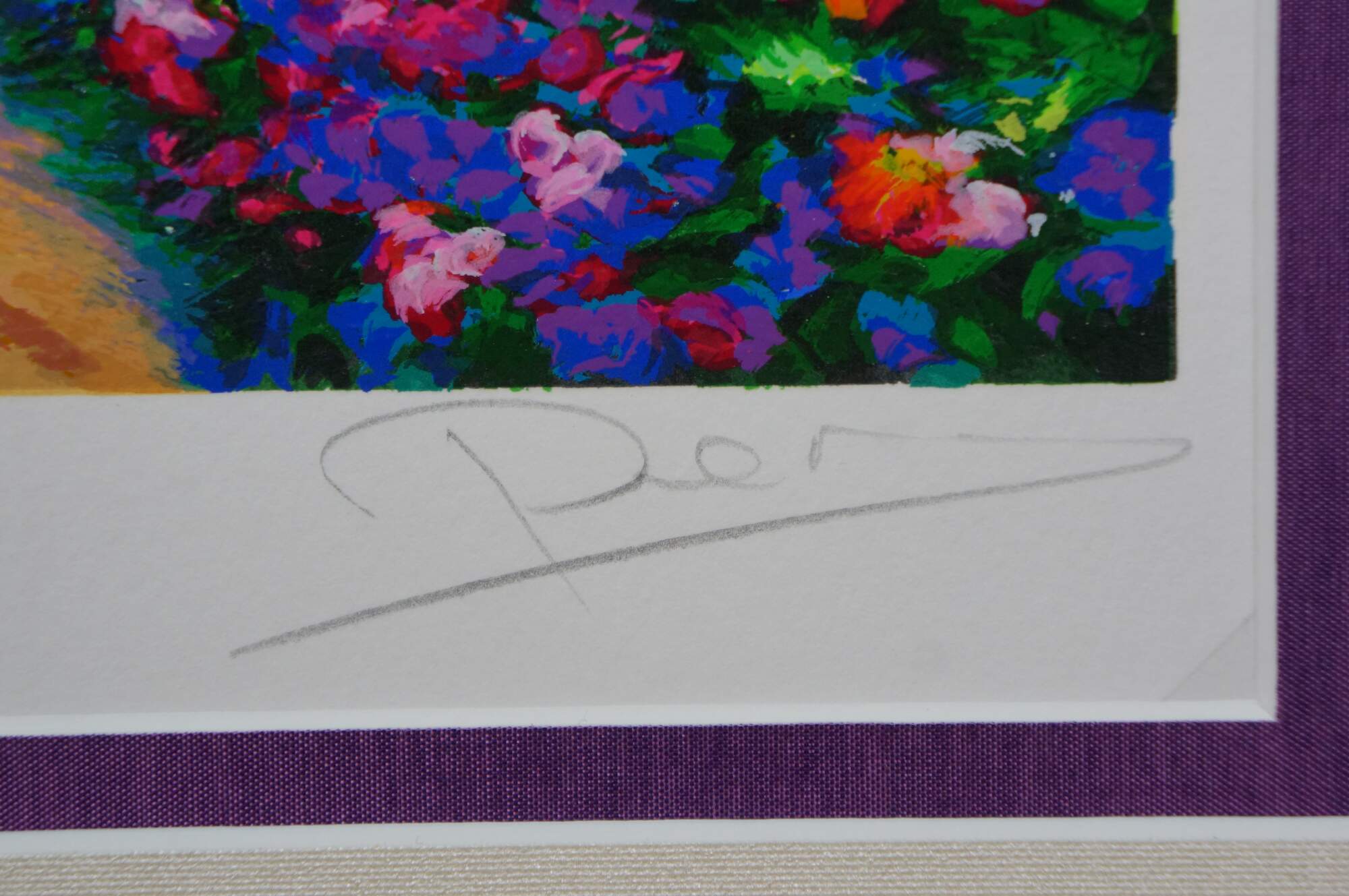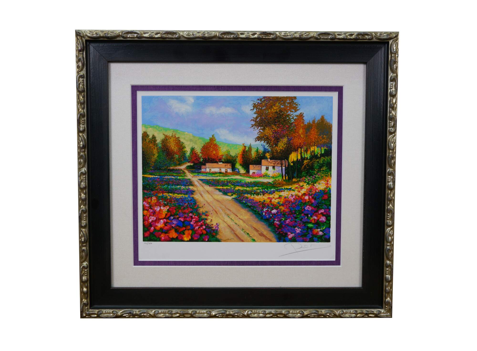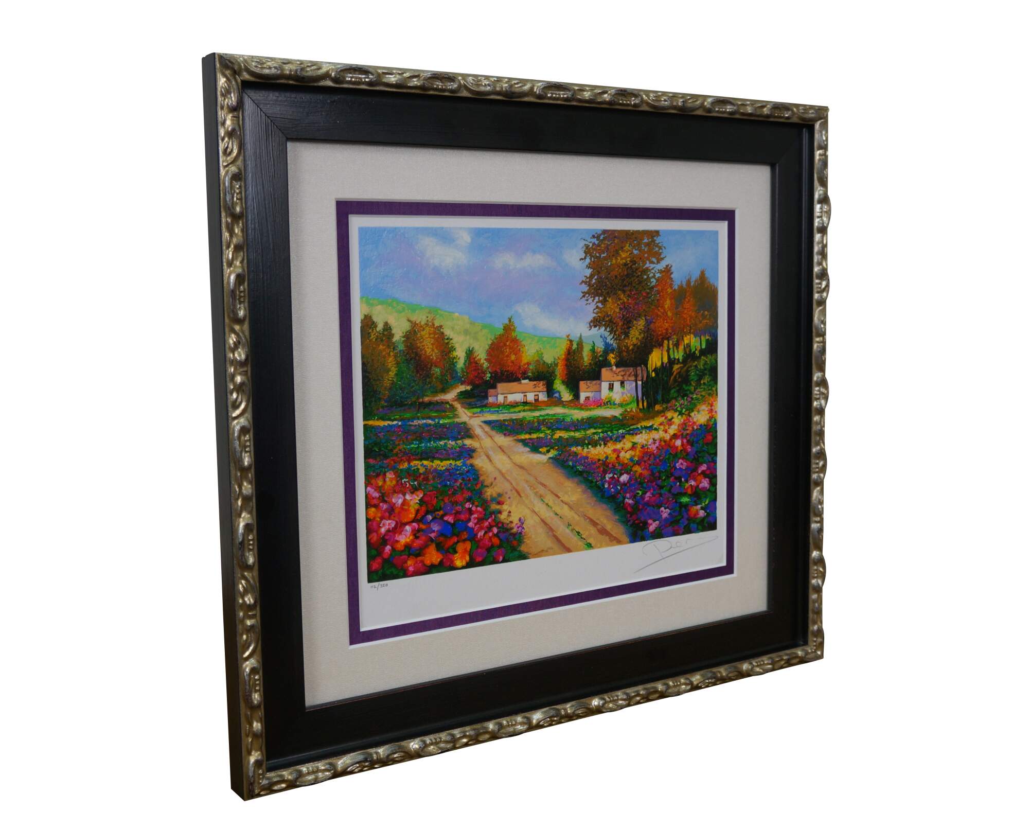 2004 limited edition serigraph on paper titled "End of the Road" by Alex Perez. An impressionist style country road lined with carpets of brightly colored flowers and cluster of red roofed cottages. Pencil signed, lower right. Numbered 112/350, lower left. Black beveled wood frame with gilt foliate edge; white and purple layered mat. Includes Certificate of Authenticity.