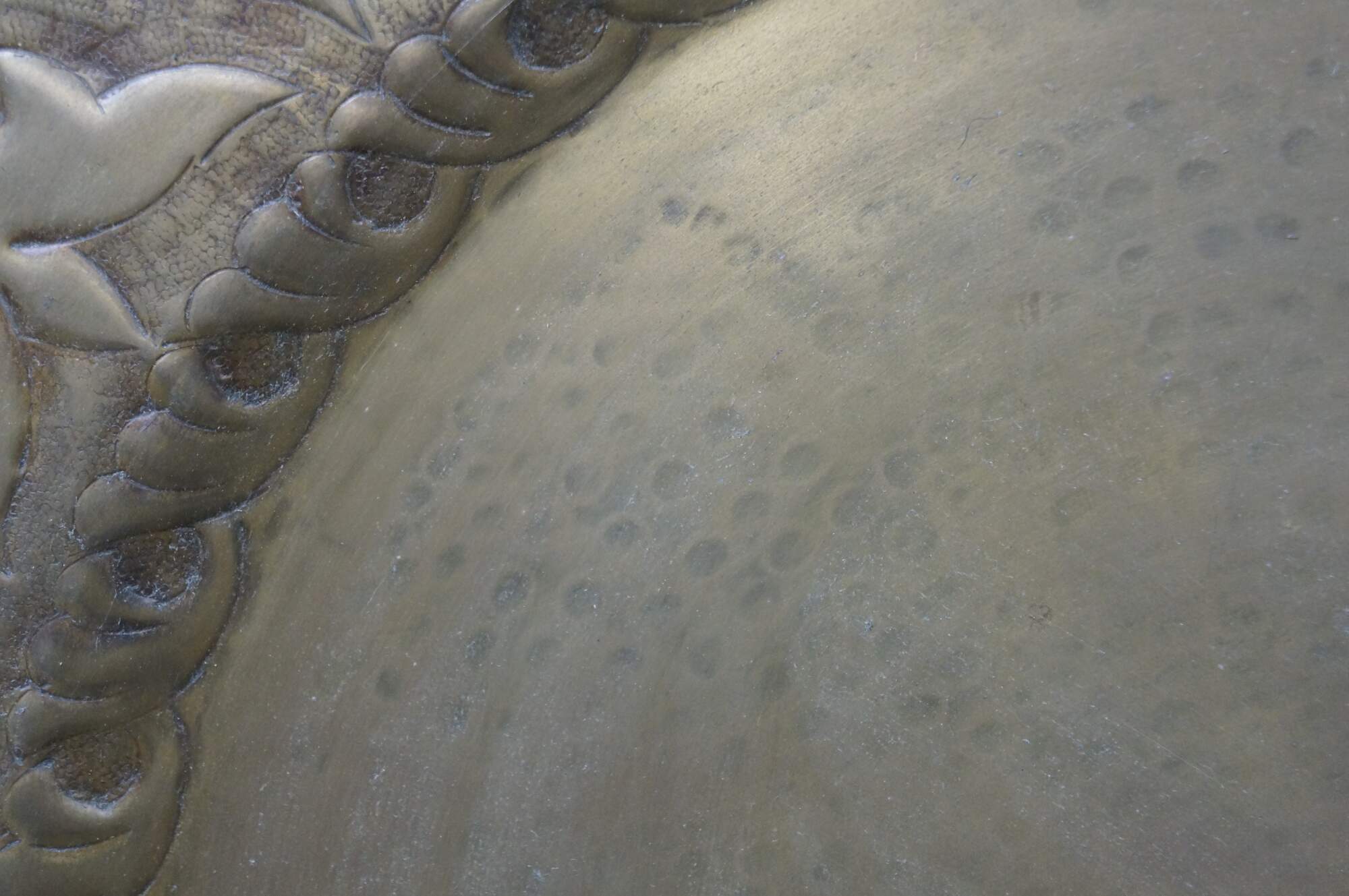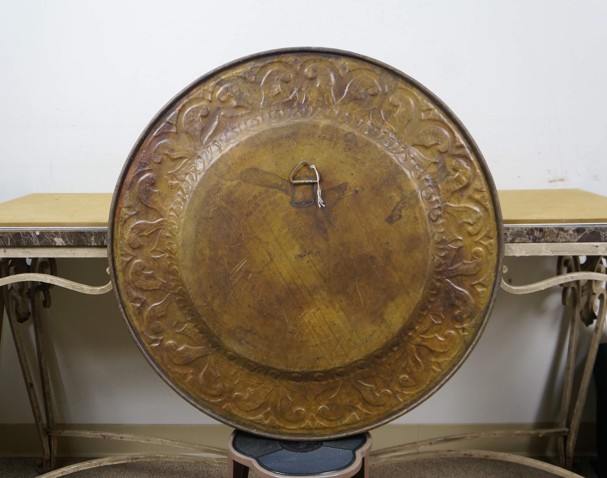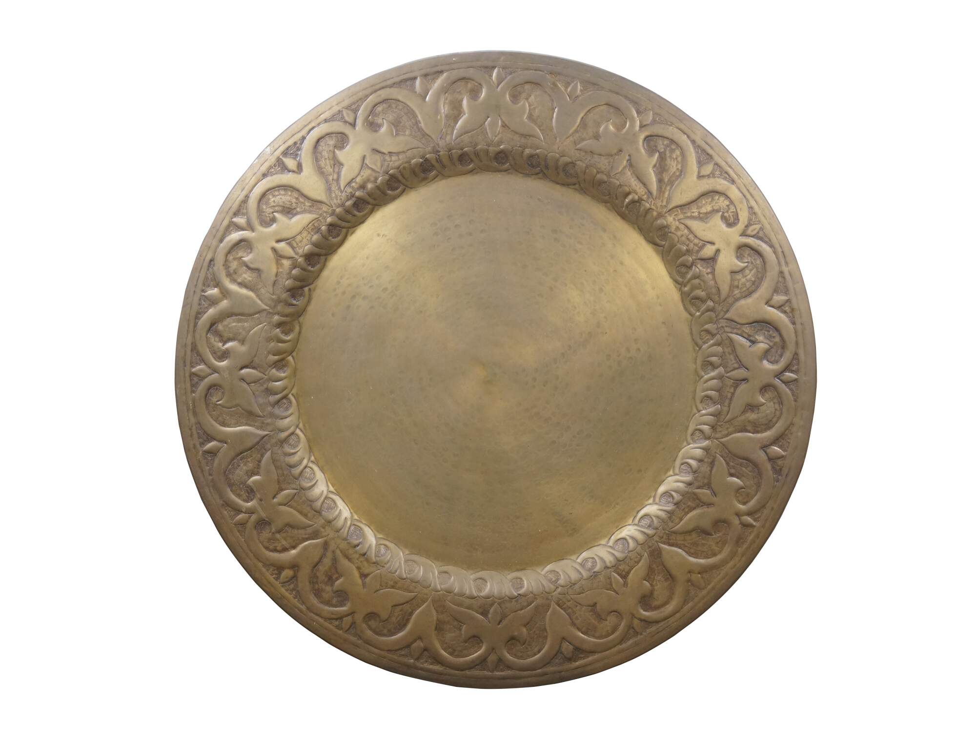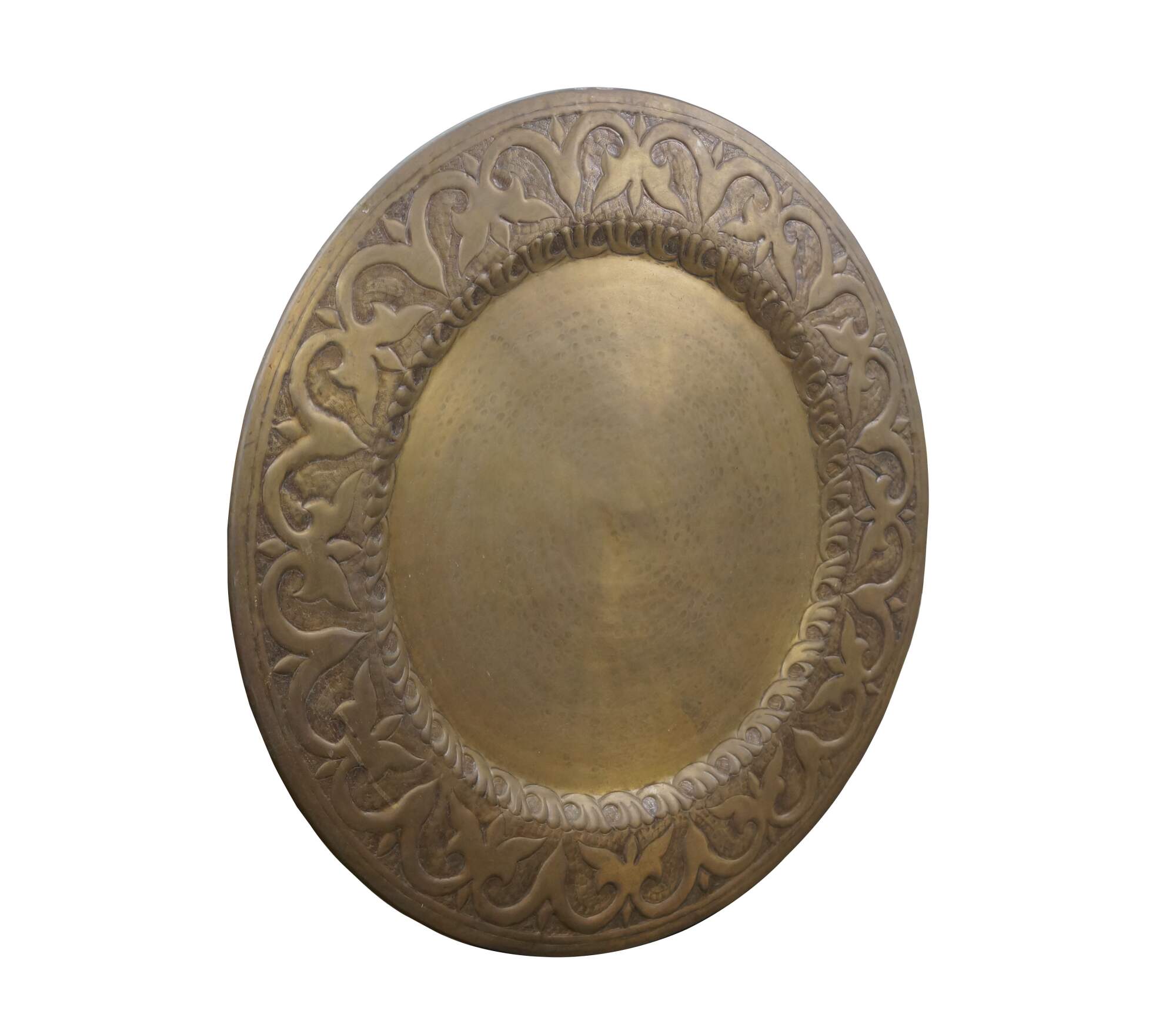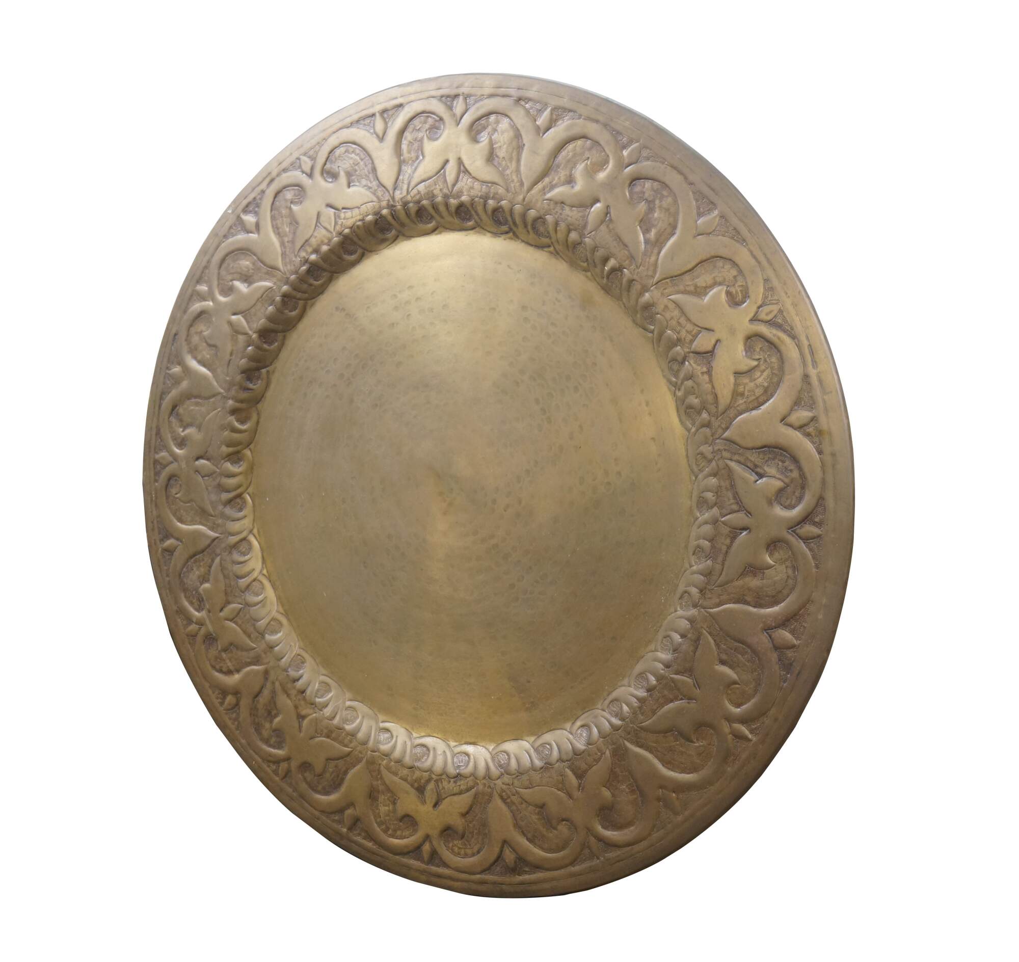 Vintage 20th century immense wall hanging brass platter / tray. Hammered brass with a plain center and bold foliate / vine design around the edge.