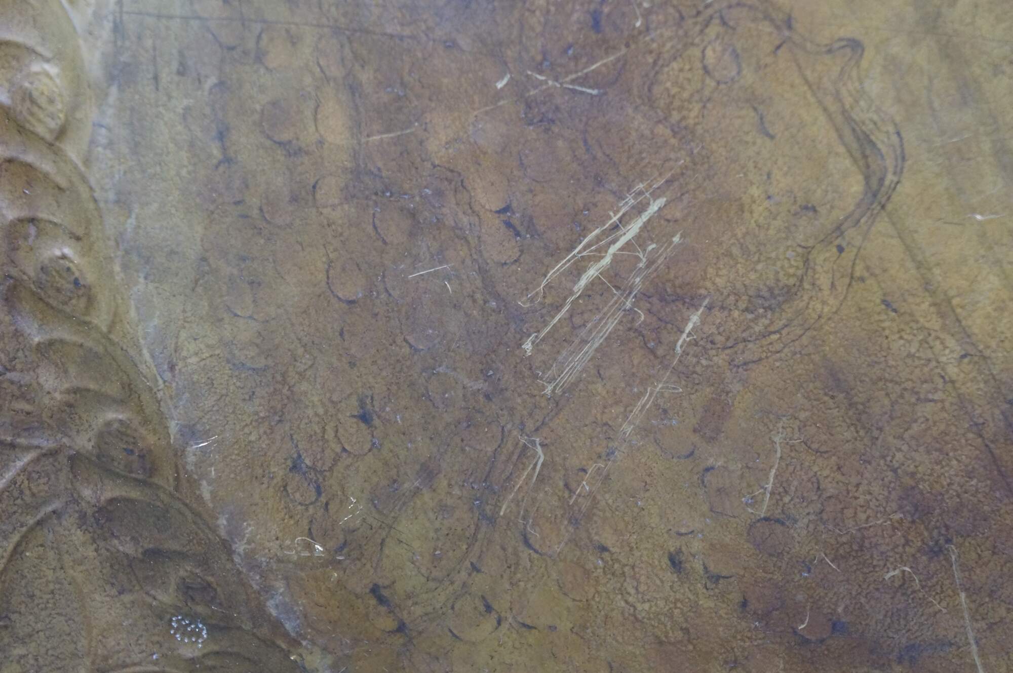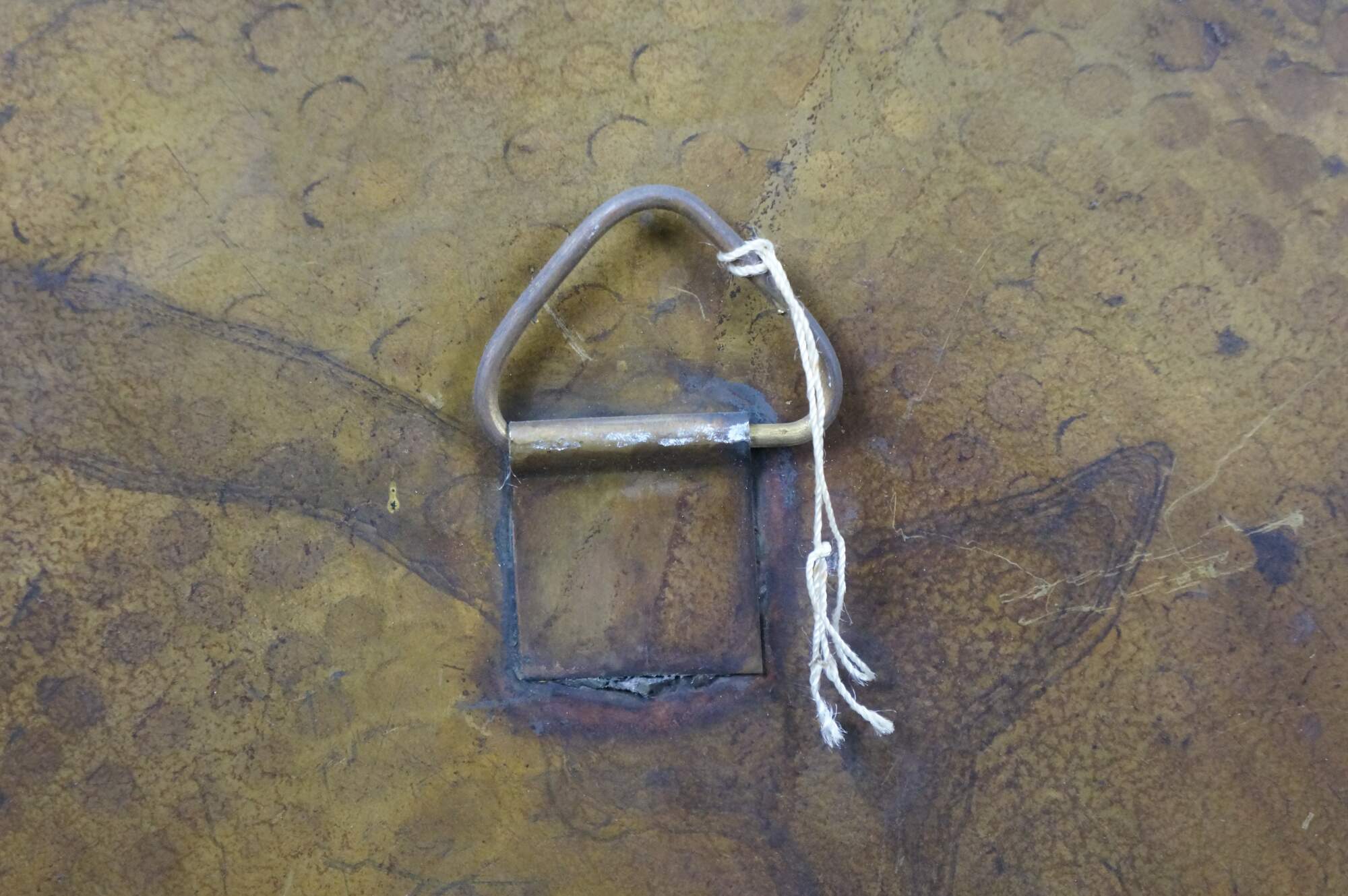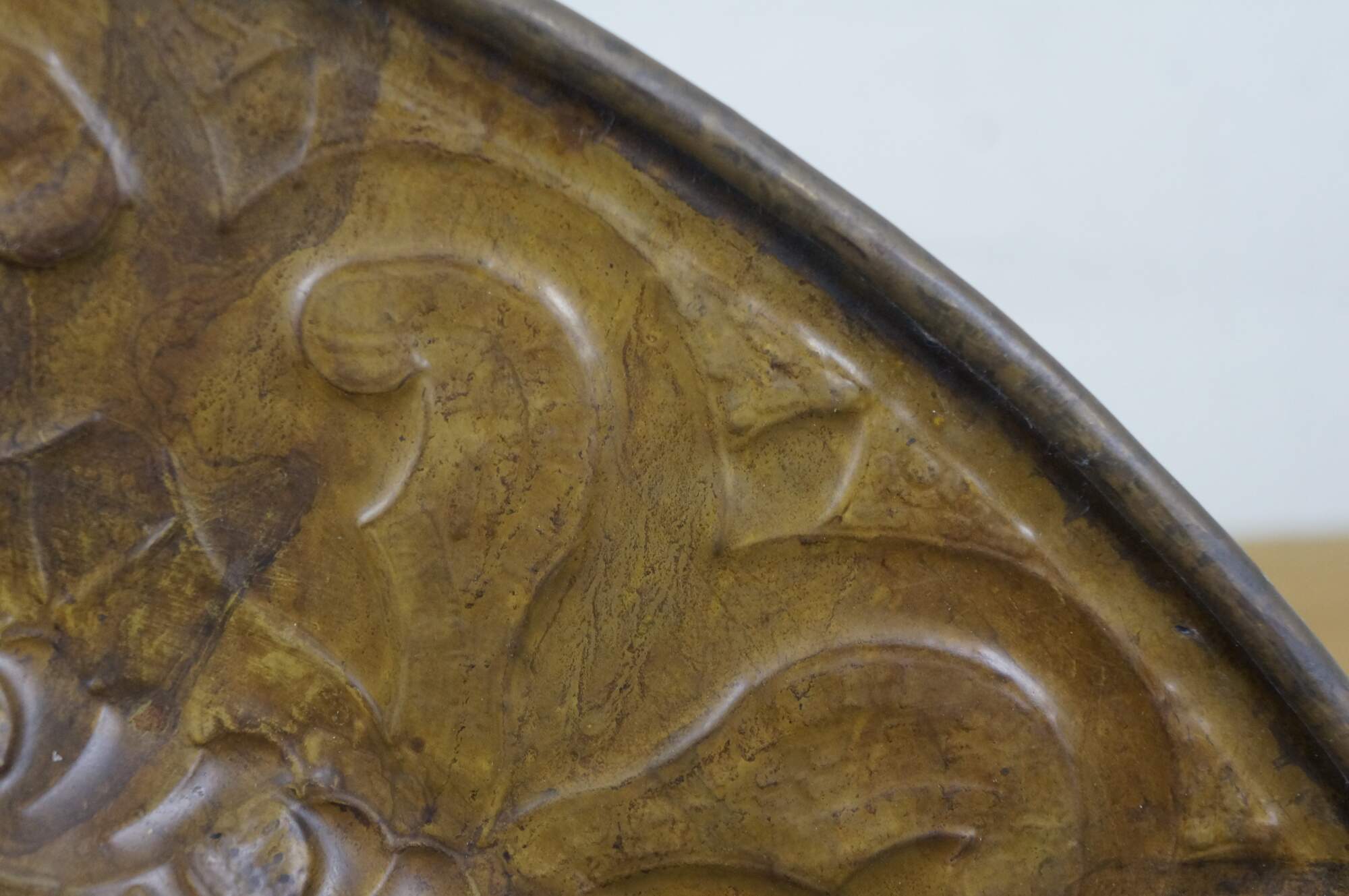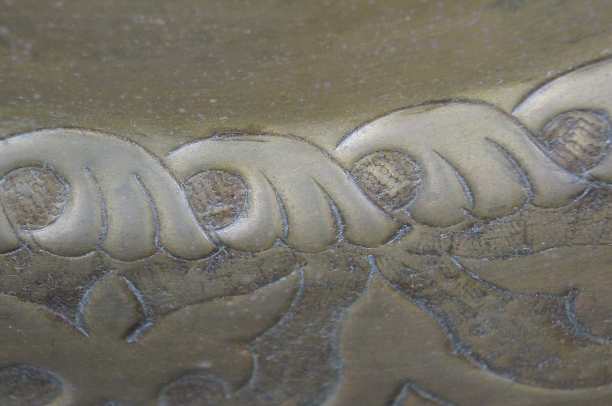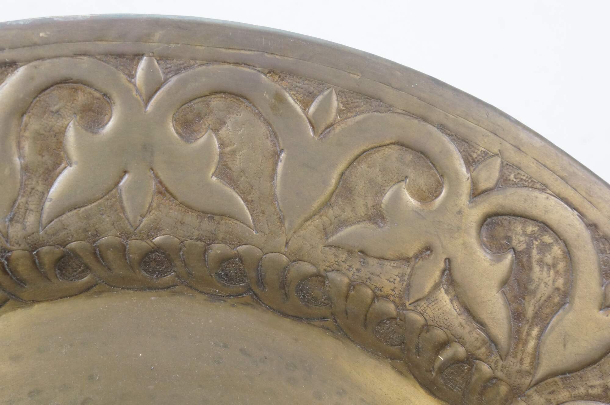Vintage 20th century immense wall hanging brass platter / tray. Hammered brass with a plain center and bold foliate / vine design around the edge.