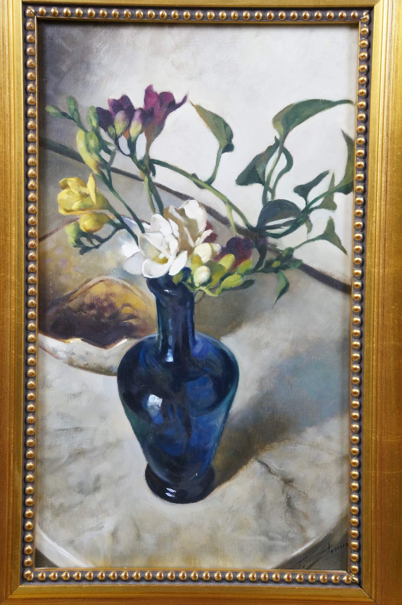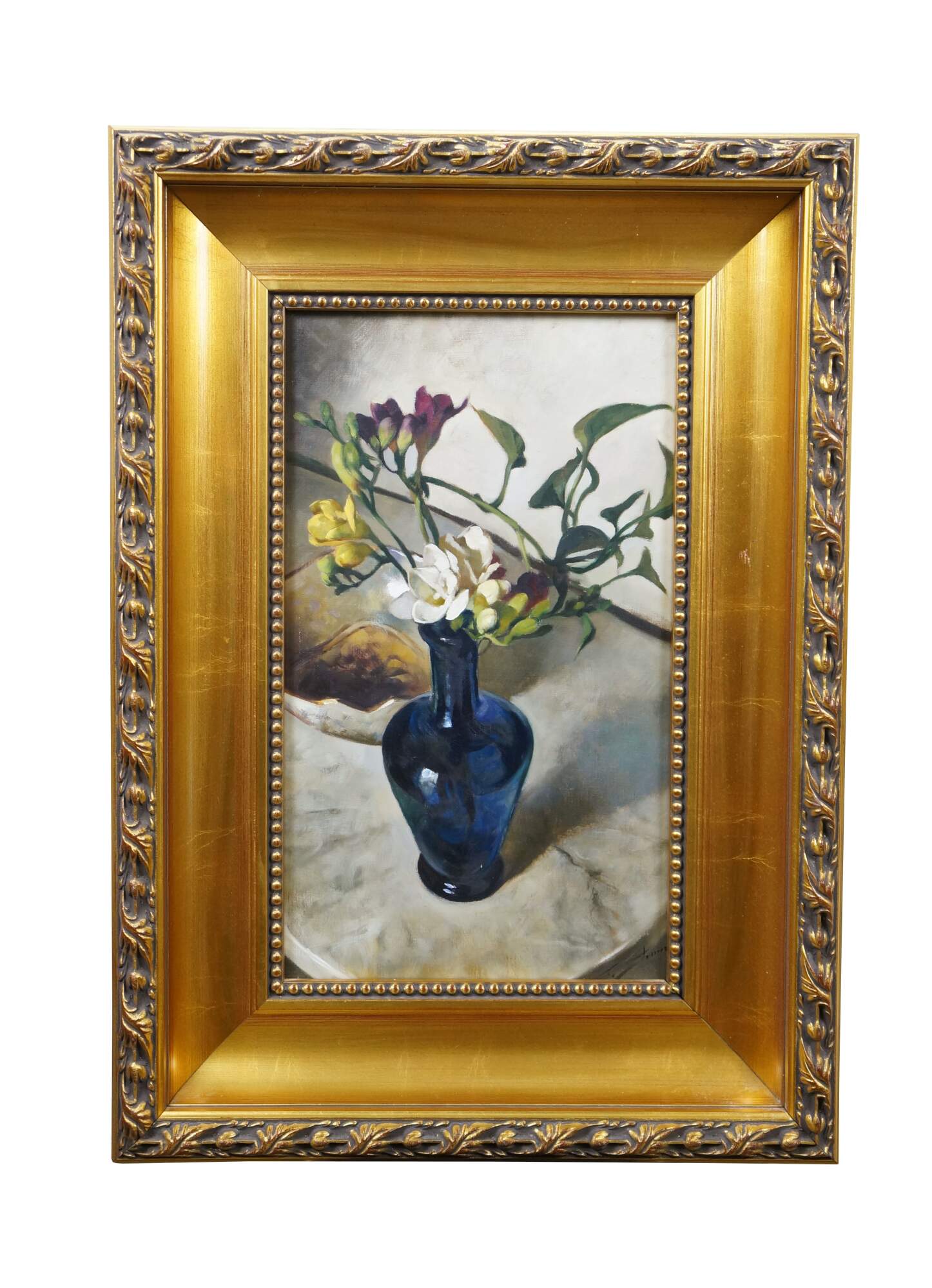 Late 20th century oil on canvas still life painting titled "Vasetto con Fioria (Vase with Flowers)" by Gianni Strino. Depicts a blue glass vase yellow, white, and purple flowers, viewed from above on a white marble table. Signed, lower right corner. Beveled gilt composite frame with beaded inner edge and foliate border. Includes Certificate of Authenticity.
