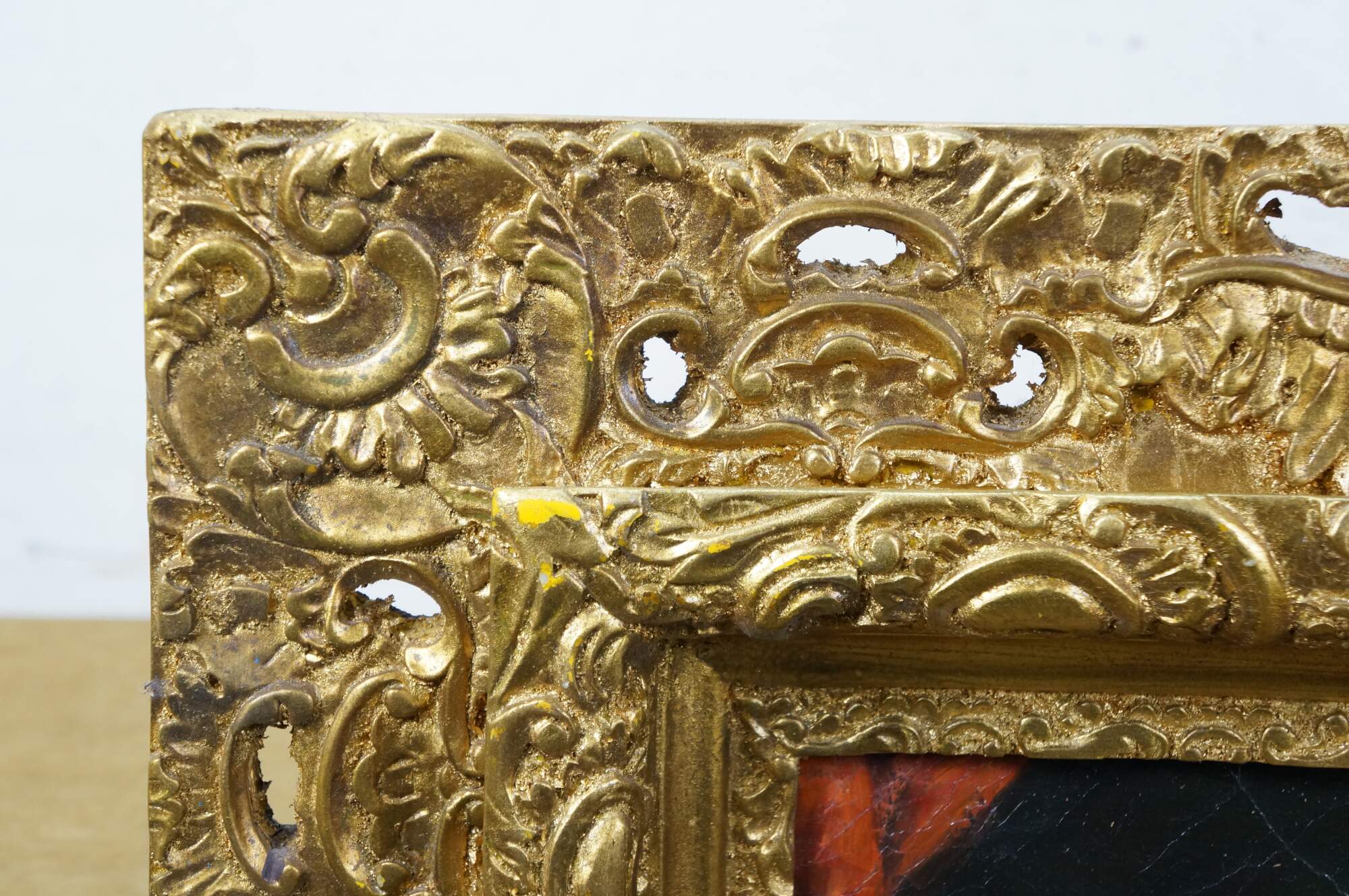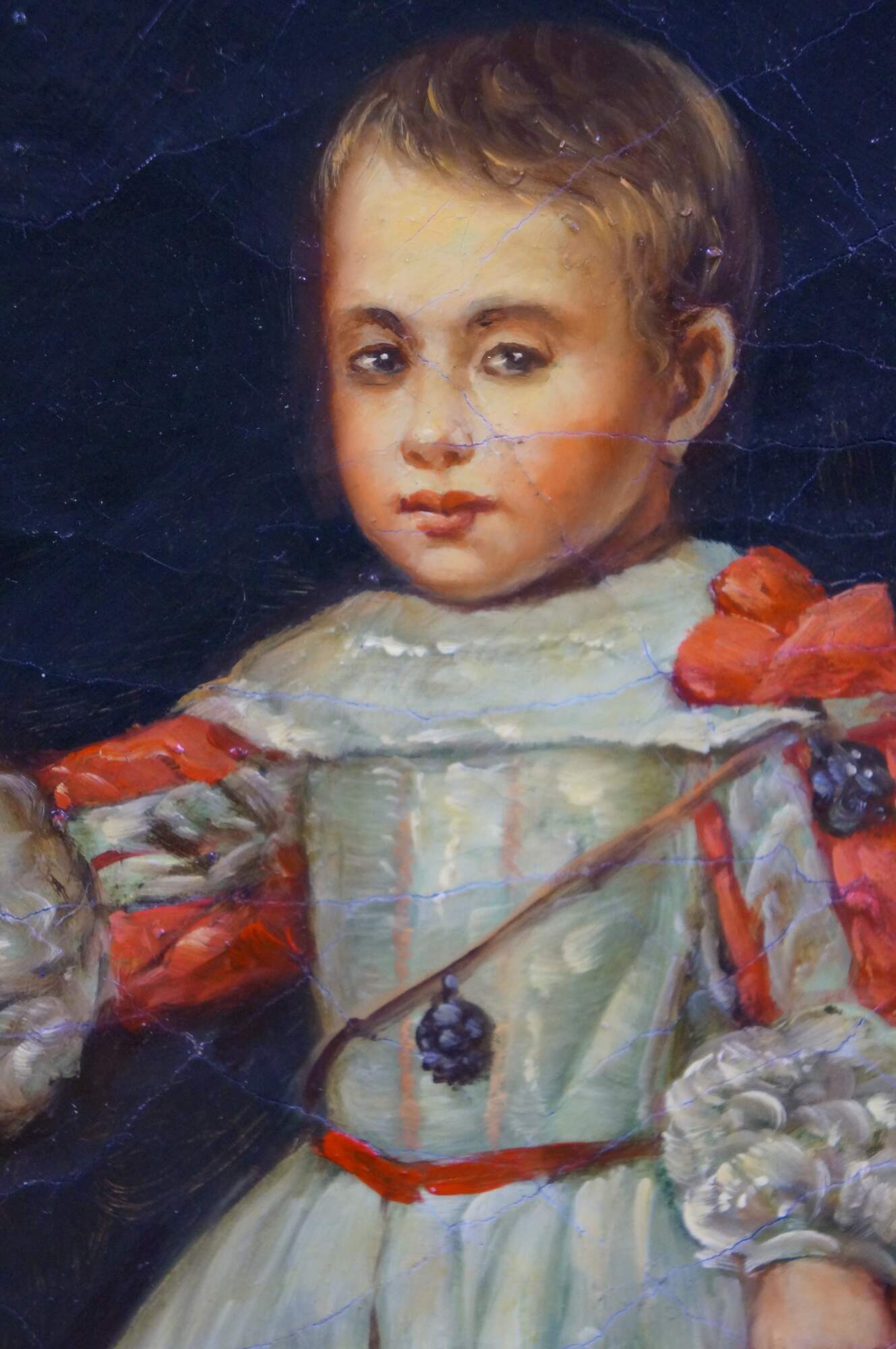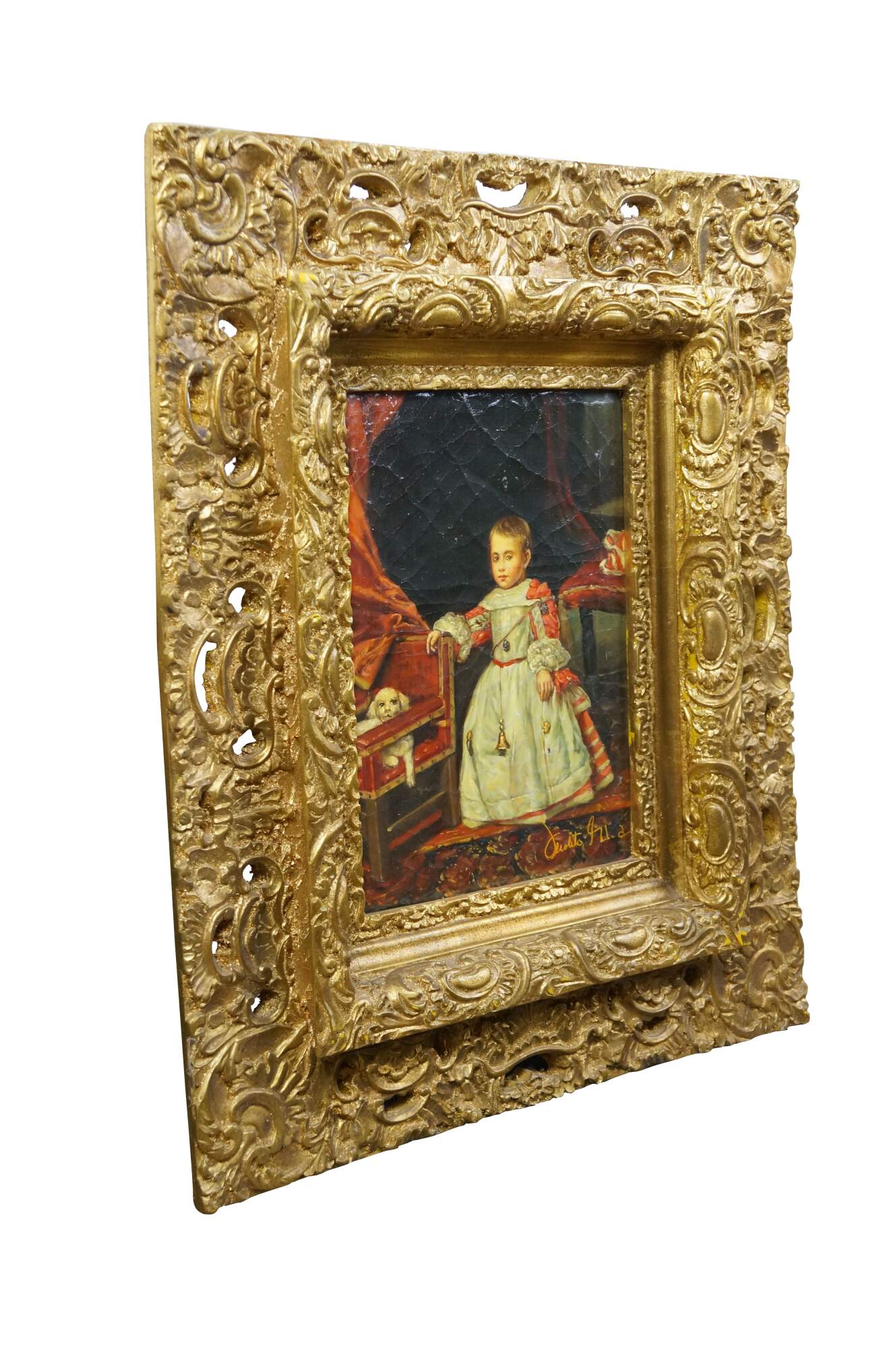 Late 20th century oil on canvas portrait painting after a work depicting the infant Prince Philip Prospero, originally painted in 1659 by Diego Velazquez. "The painting depicts Philip Prospero, Prince of Asturias (Madrid, November 20, 1657 - Madrid, November 1, 1661), the short lived heir to the Spanish crown, who died aged only 3 years old. He was the third son and the first from the marriage of Philip IV of Spain and Mariana of Austria. In this portrait, the child is standing, he wears a dress typical of toddlers, while he rests his right arm on an armchair, which seems to grant him more compassion than majesty, since his health was precarious as evidenced by the amulets that he carries. On the chair, at the left, there is a lapdog, whose watery look accentuates the melancholy of the scene. The subject of the painting is located in a room, and in the background there is an open door through which light enters. To the right there is a stool with a cushion on which a hat is placed. Red tones predominate in the work and the dark tones of the background increase the contrast between the colors." (Wikipedia) Signed, lower right. Heavy, ornate, gilt foliate composite frame.