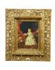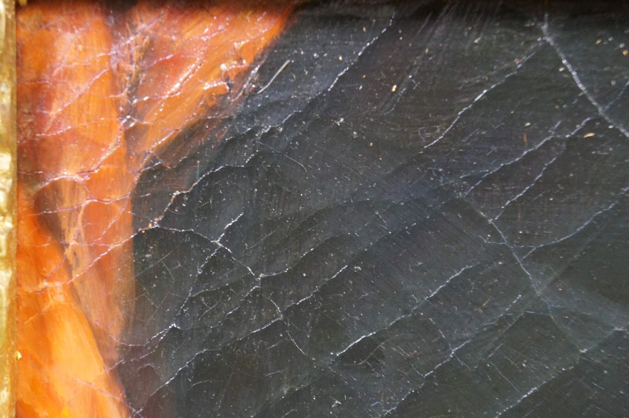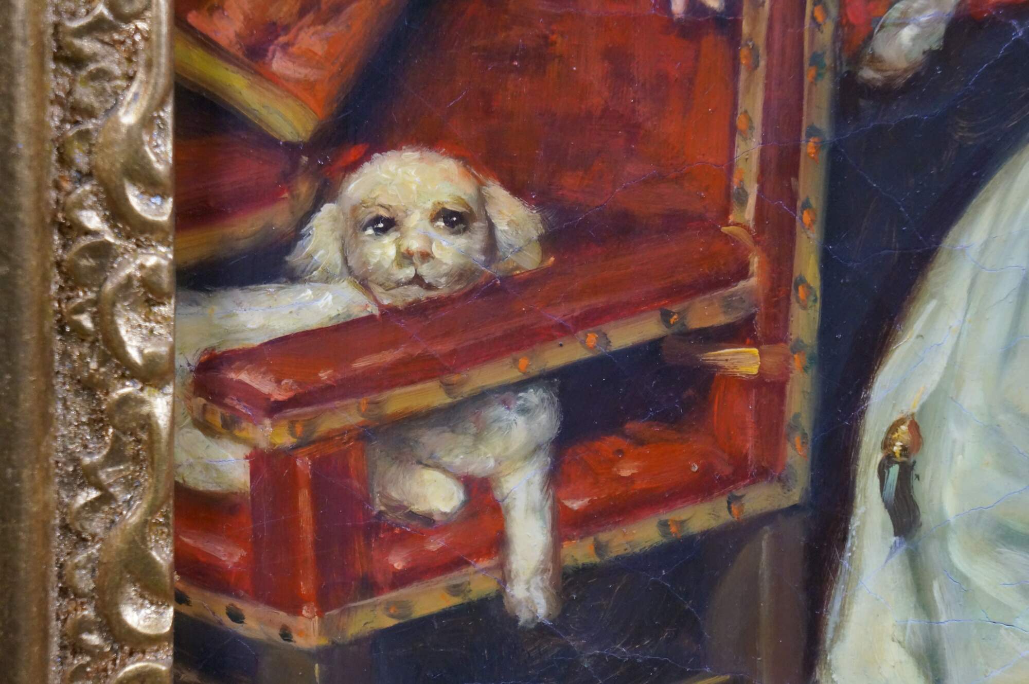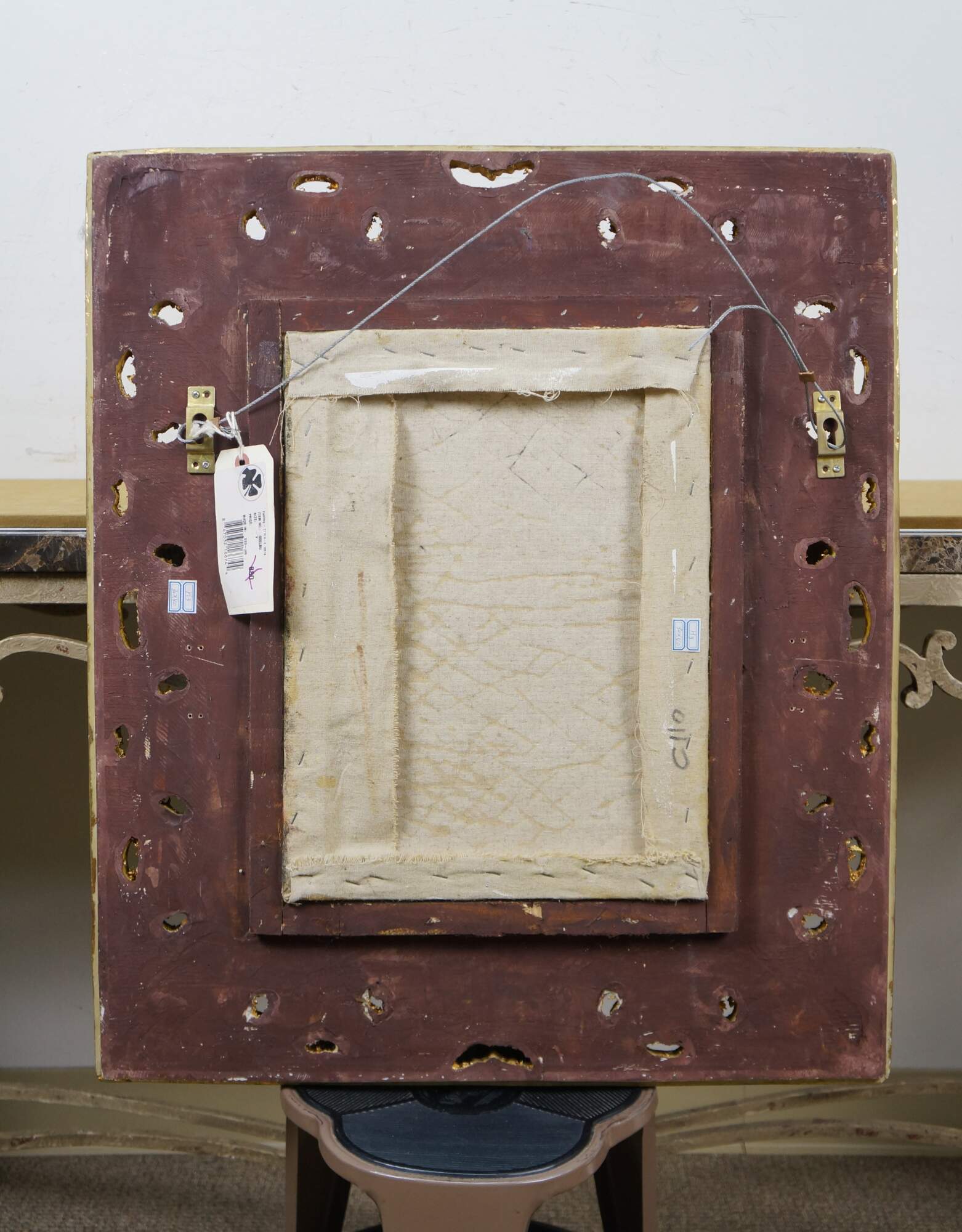 Late 20th century oil on canvas portrait painting after a work depicting the infant Prince Philip Prospero, originally painted in 1659 by Diego Velazquez. "The painting depicts Philip Prospero, Prince of Asturias (Madrid, November 20, 1657 - Madrid, November 1, 1661), the short lived heir to the Spanish crown, who died aged only 3 years old. He was the third son and the first from the marriage of Philip IV of Spain and Mariana of Austria. In this portrait, the child is standing, he wears a dress typical of toddlers, while he rests his right arm on an armchair, which seems to grant him more compassion than majesty, since his health was precarious as evidenced by the amulets that he carries. On the chair, at the left, there is a lapdog, whose watery look accentuates the melancholy of the scene. The subject of the painting is located in a room, and in the background there is an open door through which light enters. To the right there is a stool with a cushion on which a hat is placed. Red tones predominate in the work and the dark tones of the background increase the contrast between the colors." (Wikipedia) Signed, lower right. Heavy, ornate, gilt foliate composite frame.