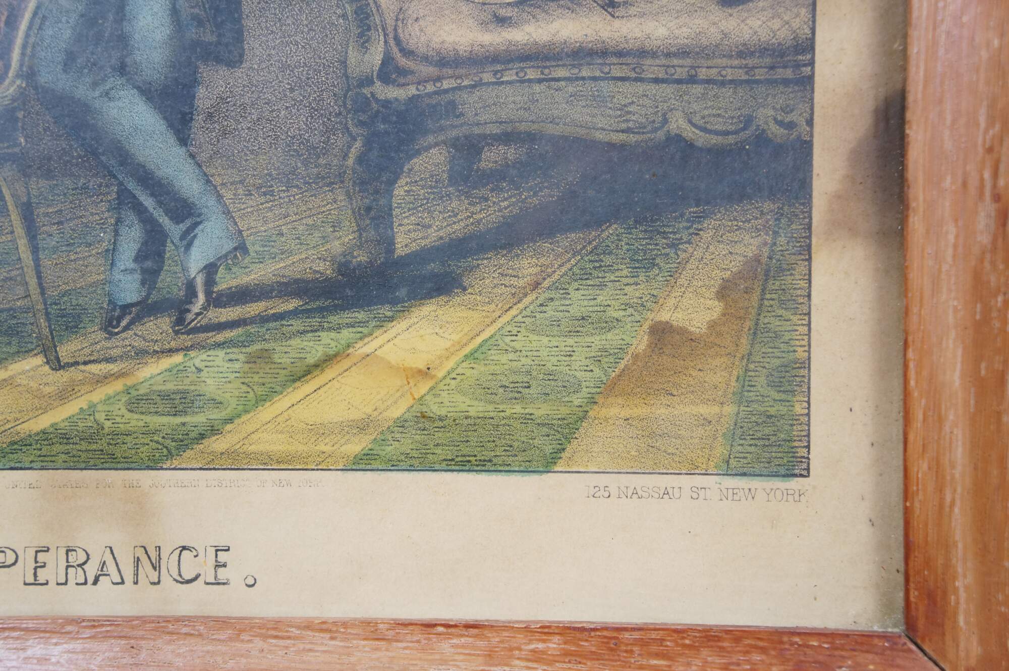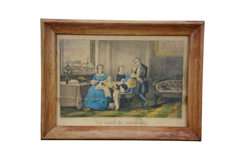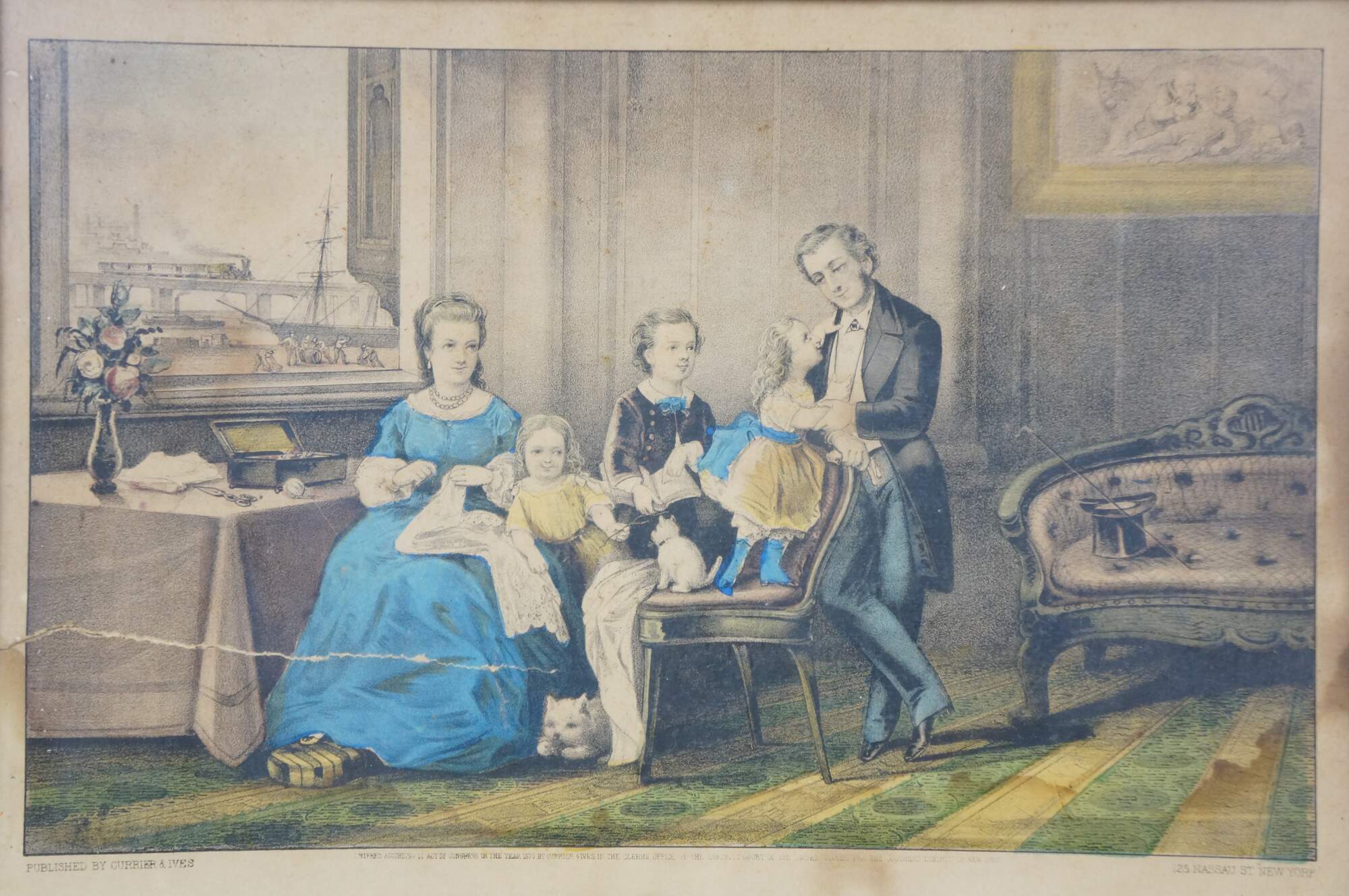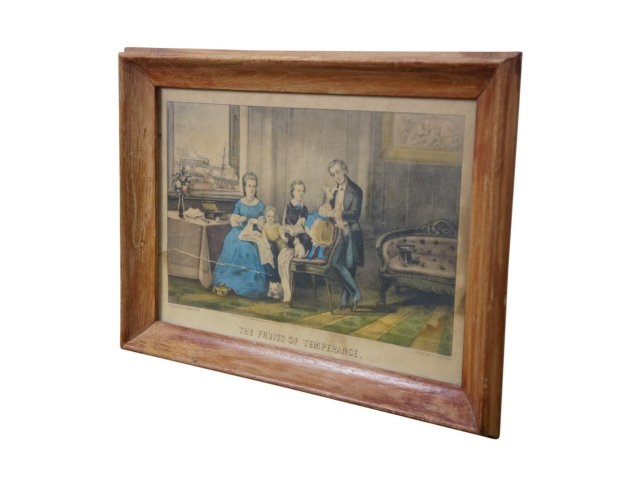 Late 19th century hand colored llithograph print titled "The Fruits of Temperance," published by Currier & Ives "Family (Husband, wife, three children) with a dog and cat sitting in a living room/parlor next to a window with a scene outside of a train crossing over a bridge and a ship in the water. Currier & Ives produced a series of prints that encouraged pious living and moderation. In this work, which celebrates the positive effects of temperance, a wealthy family is shown together in their comfortable home. This image, a companion to The Fruits of Intemperance, was also published under the name The Good Husband." (Springfield Museums) Entered According to Act of Congress in the Year 1870 by currier & Ives in the Clerks Office of the District Court of the united States for the Southern district of New York. Beveled wood frame.