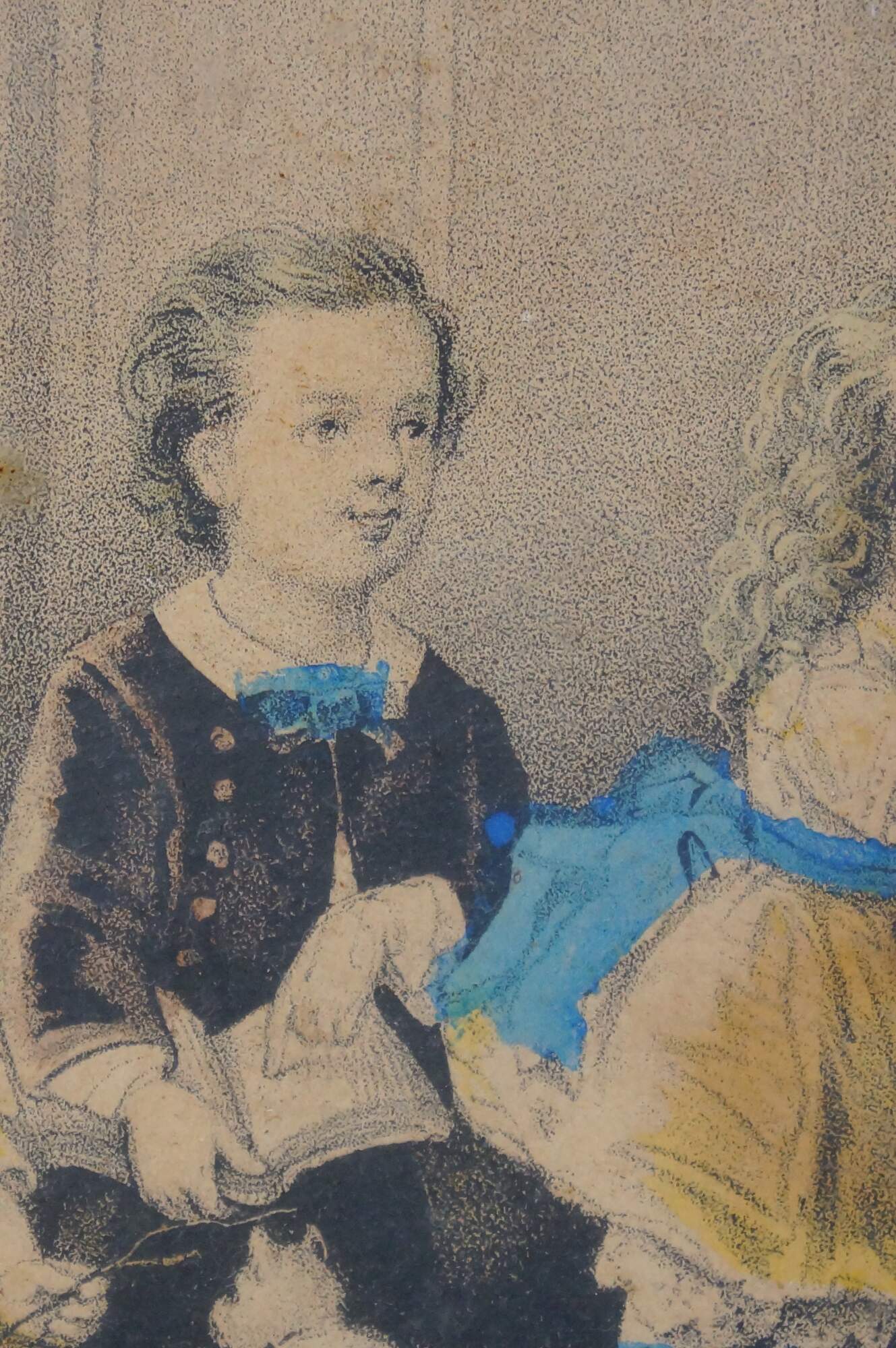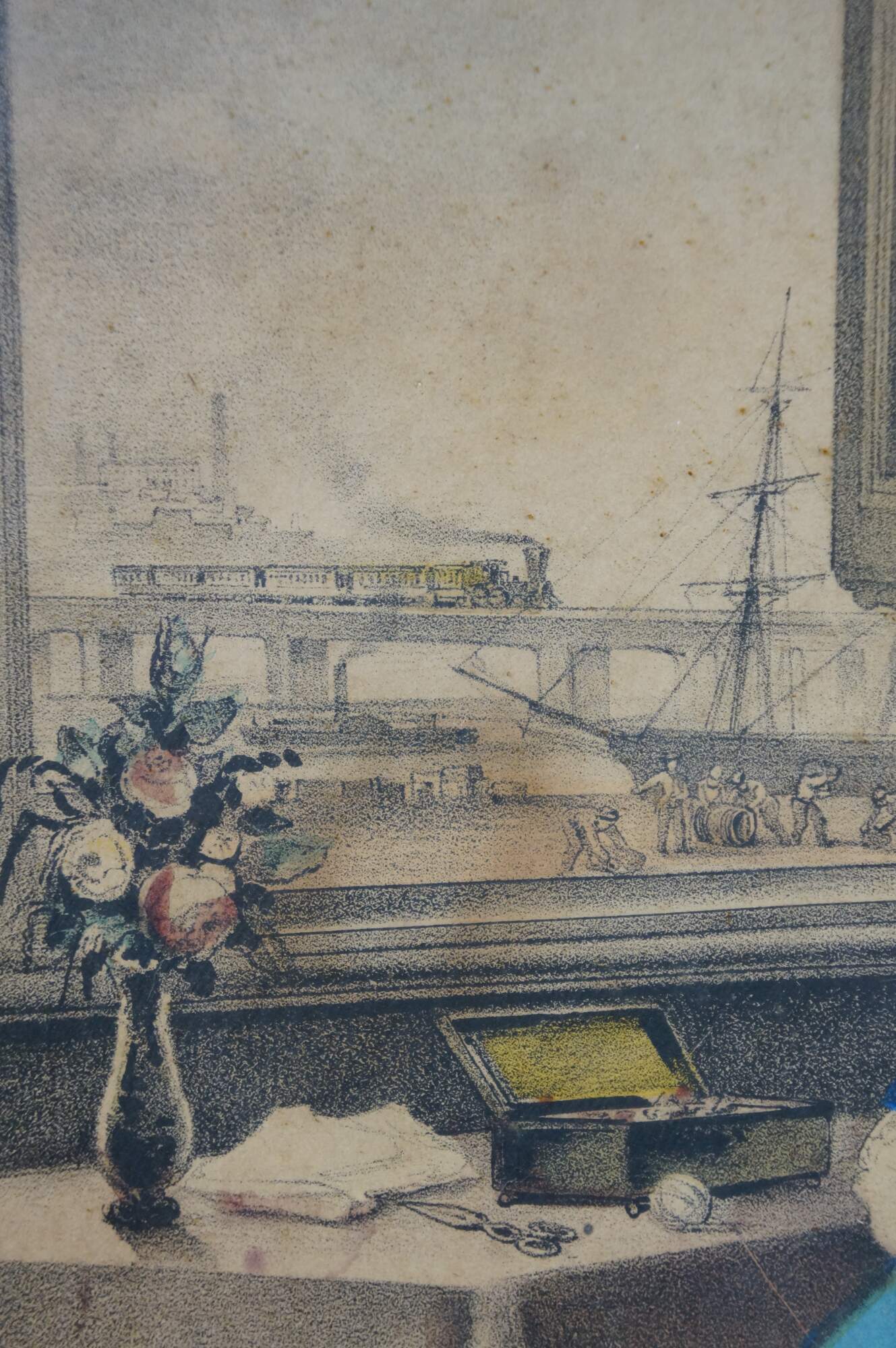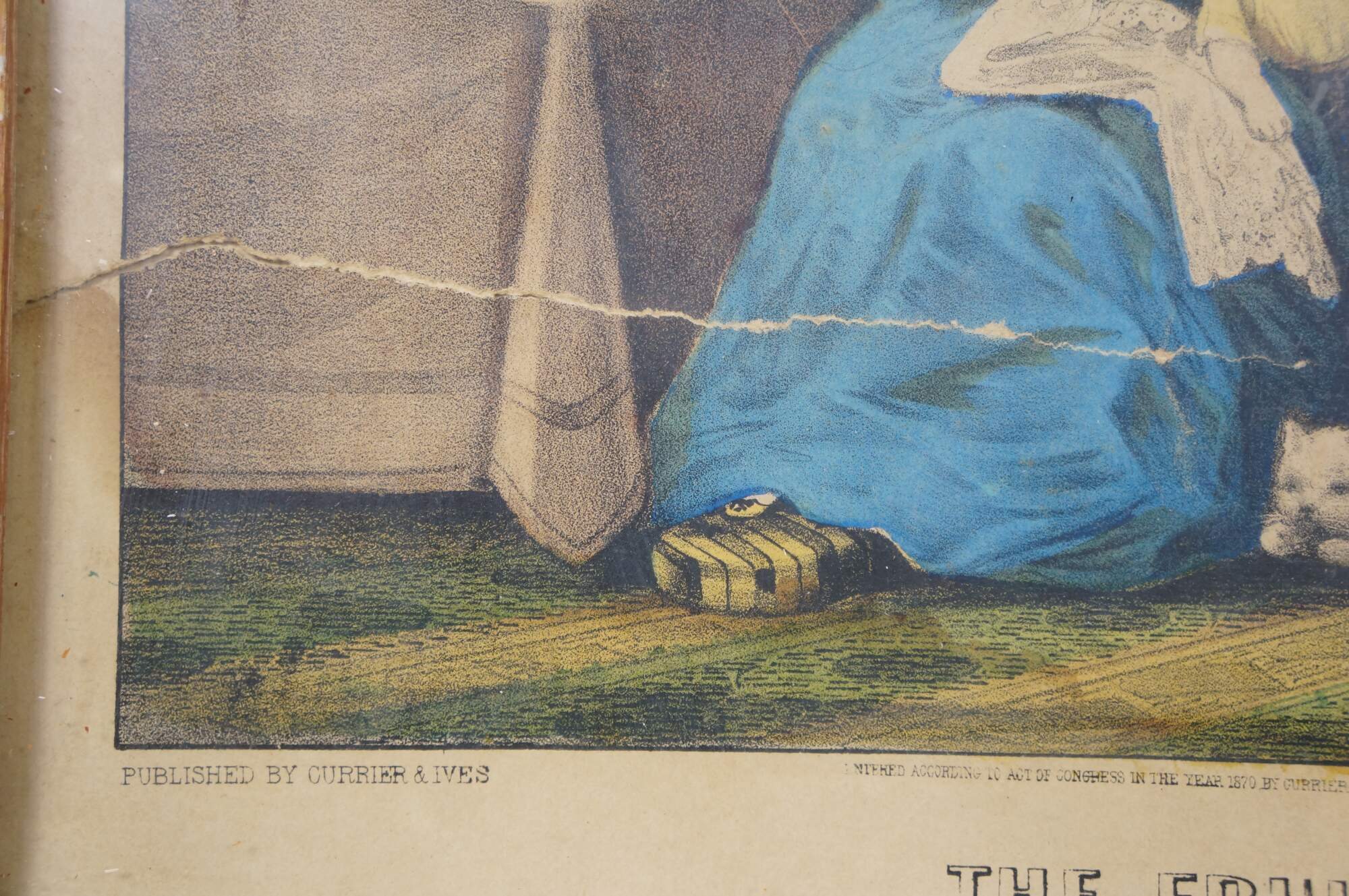 Late 19th century hand colored llithograph print titled "The Fruits of Temperance," published by Currier & Ives "Family (Husband, wife, three children) with a dog and cat sitting in a living room/parlor next to a window with a scene outside of a train crossing over a bridge and a ship in the water. Currier & Ives produced a series of prints that encouraged pious living and moderation. In this work, which celebrates the positive effects of temperance, a wealthy family is shown together in their comfortable home. This image, a companion to The Fruits of Intemperance, was also published under the name The Good Husband." (Springfield Museums) Entered According to Act of Congress in the Year 1870 by currier & Ives in the Clerks Office of the District Court of the united States for the Southern district of New York. Beveled wood frame.
