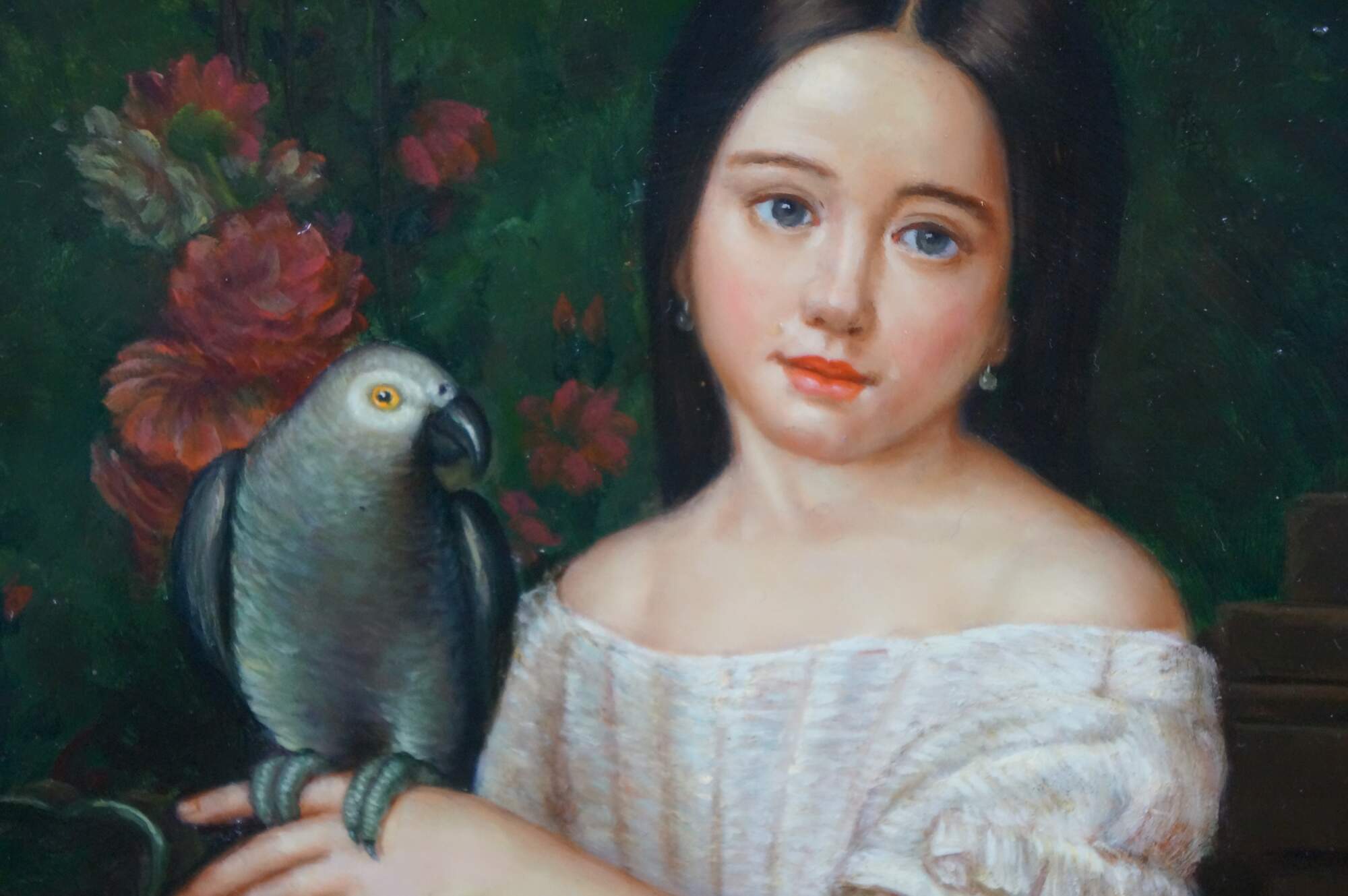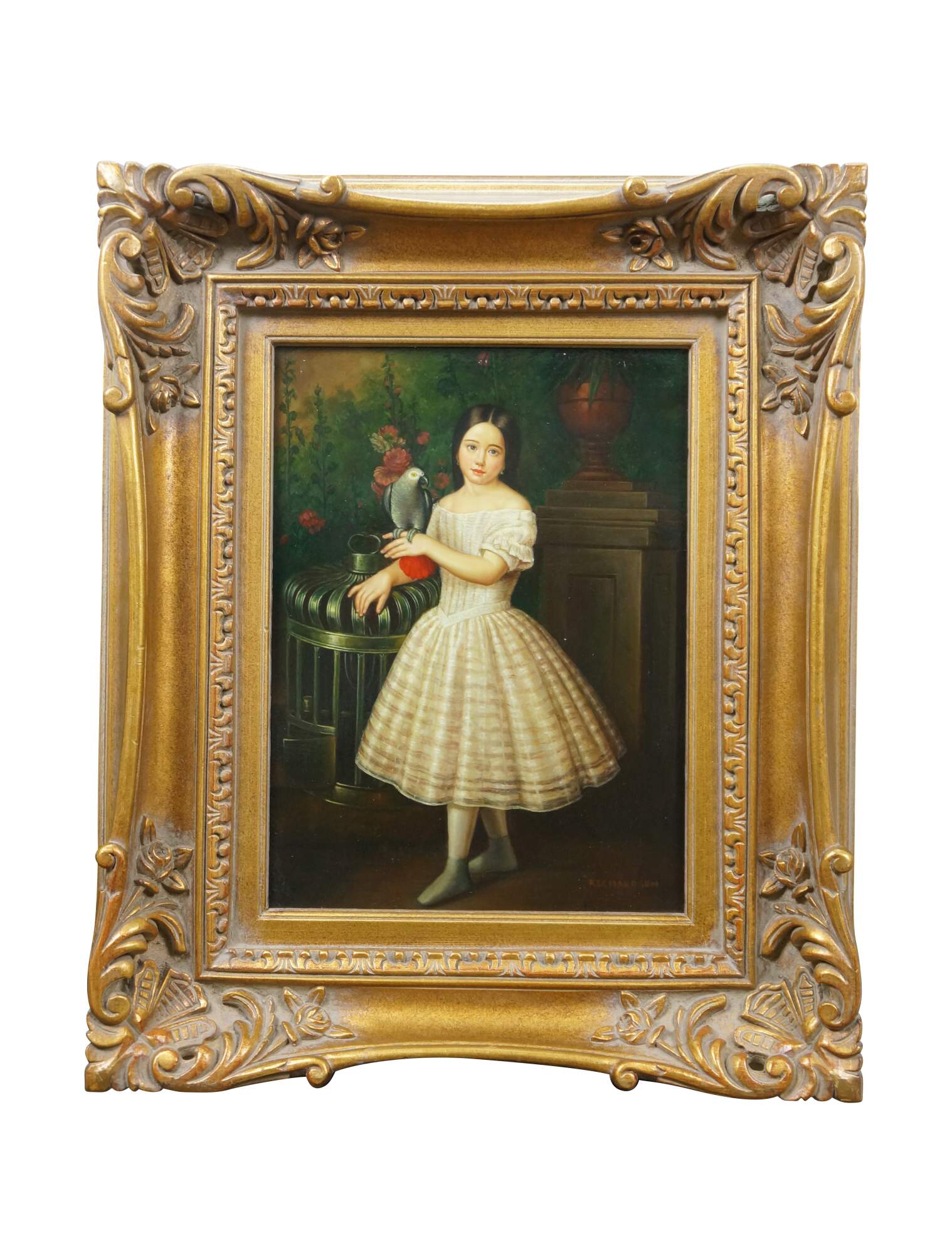 Late 20th century oil on board portrait painting after a work depicting "Rafaela Flores Calderon," originally painted circa 1842 by Antonio Maria Esquivel. Depicts a child of Lorenzo Flores Calderon (1804 - 1865) and Isabel Cipriana García Del Busto Alonso De Viado (1811 - 1859) in s triped white dress, standing near a vase topped pedestal in a garden, one arm leaning on an open bird cage, and the other supporting a gray parrot. Signed richardson, lower right. Gilt composite frame with simple foliate border and foliate and rose patterned corners.