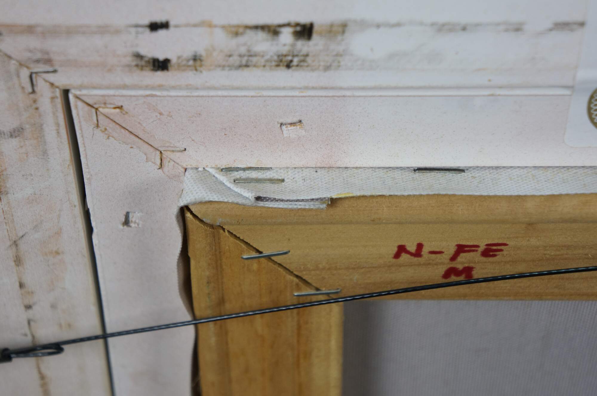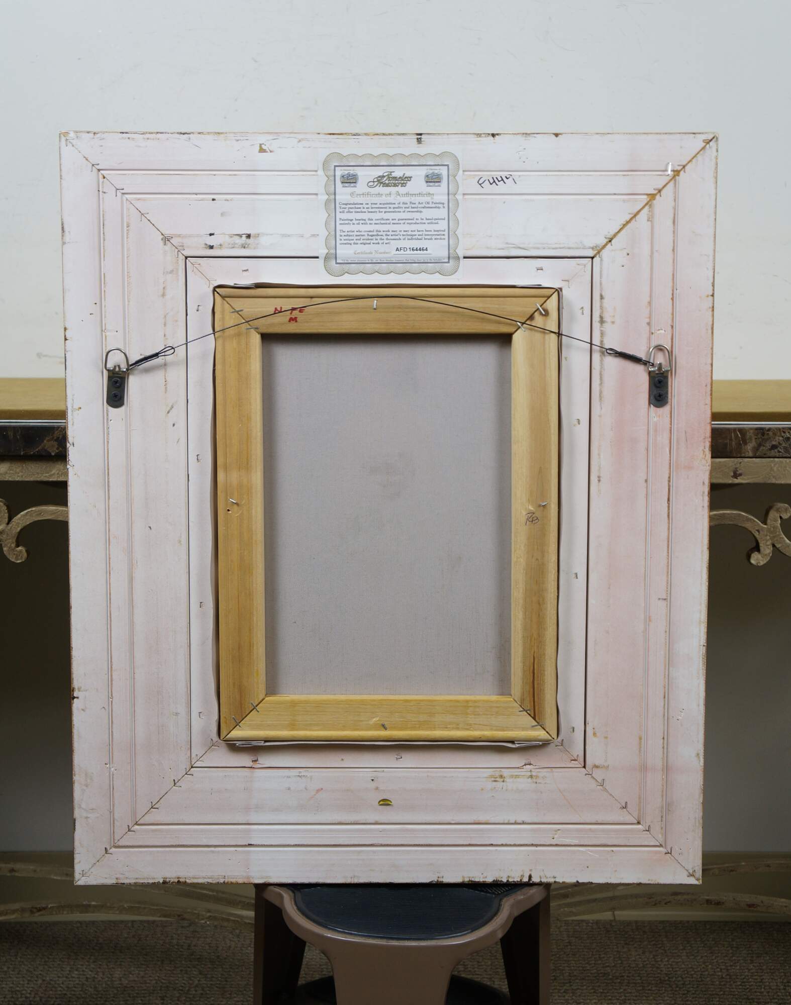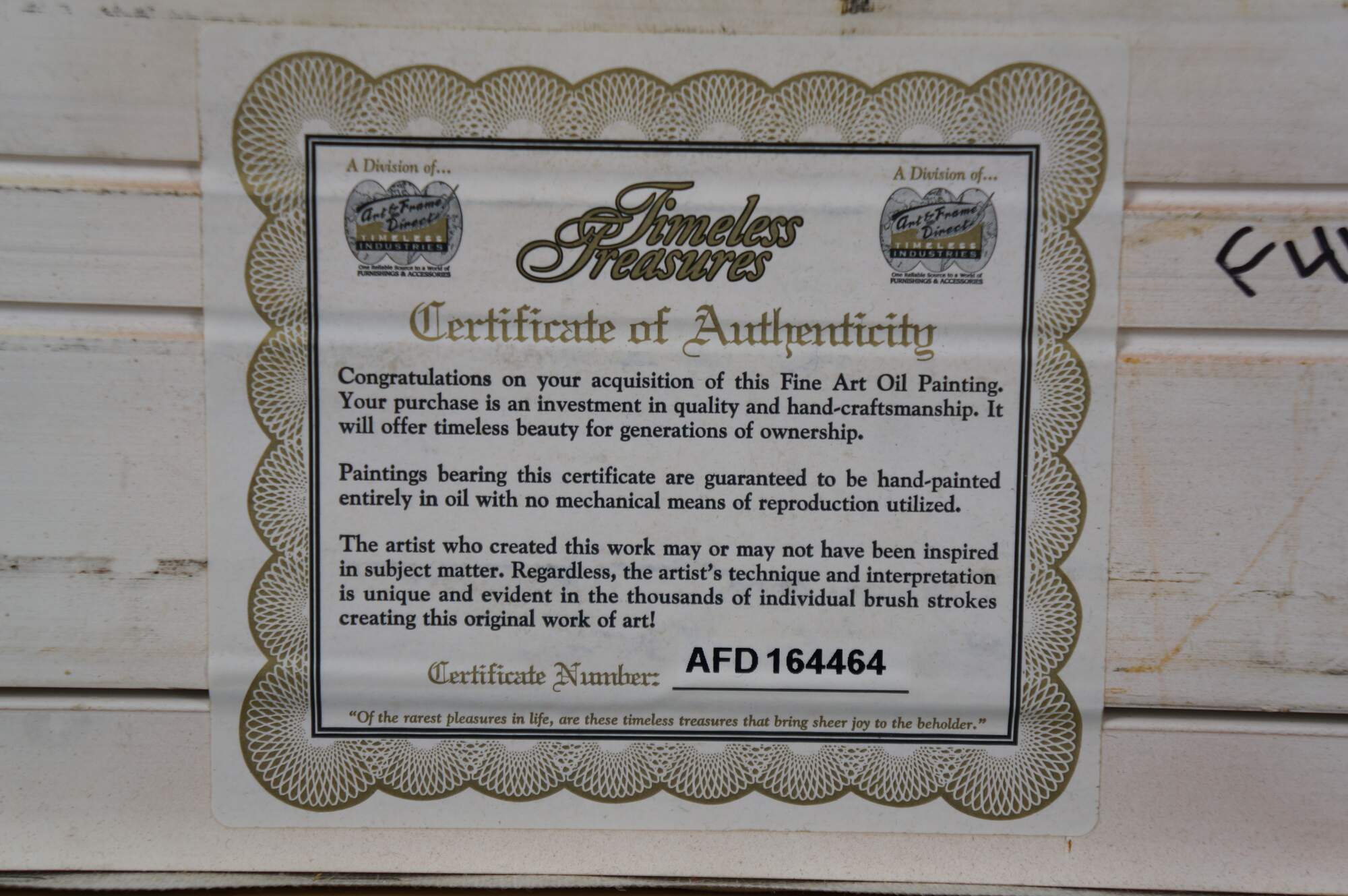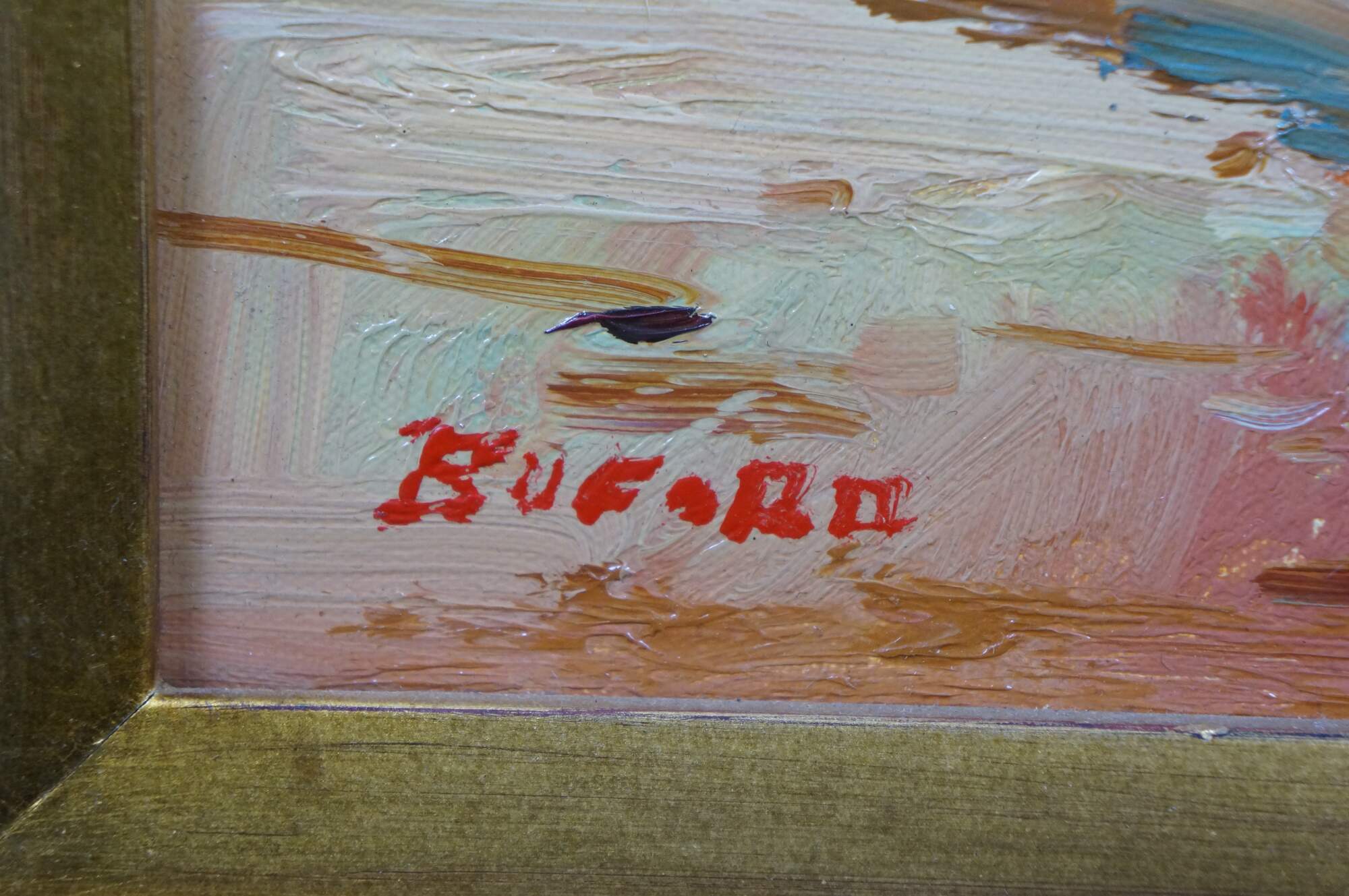 Late 20th century oil on canvas painting produced for Timeless Treasures. Impressionist style coastal painting depicting a young child standing on a beach with bucket and umbrella, staring into the surf. Signed Buford, lower left. Gilt wood and geso frame, molded with neoclassically inspired patternes and vines. Certificate of Authenticity Number AFD164464.