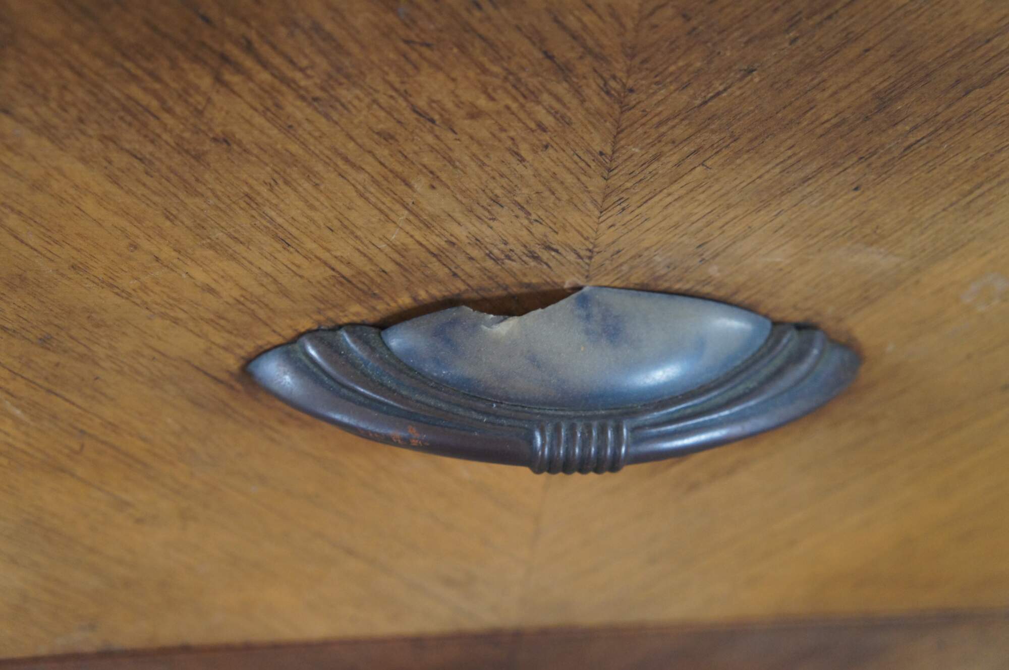 Antique Art Deco chifferobe cabinet. Made from walnut with a waterfall design and matchbook veneer drawer fronts. Includes a full length cabinet to the left for hanging garments and four drawers and upper cubby / cabinet.