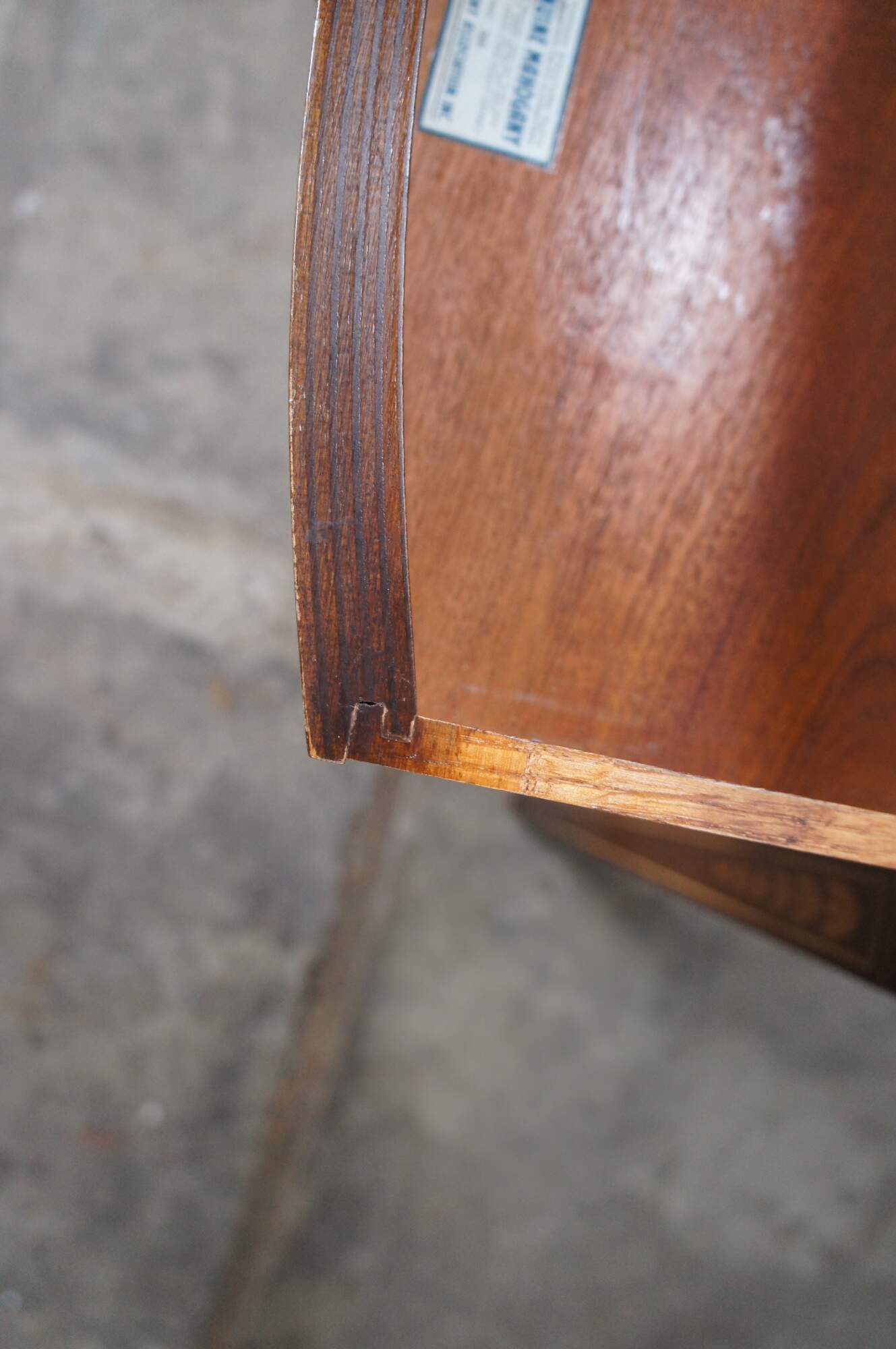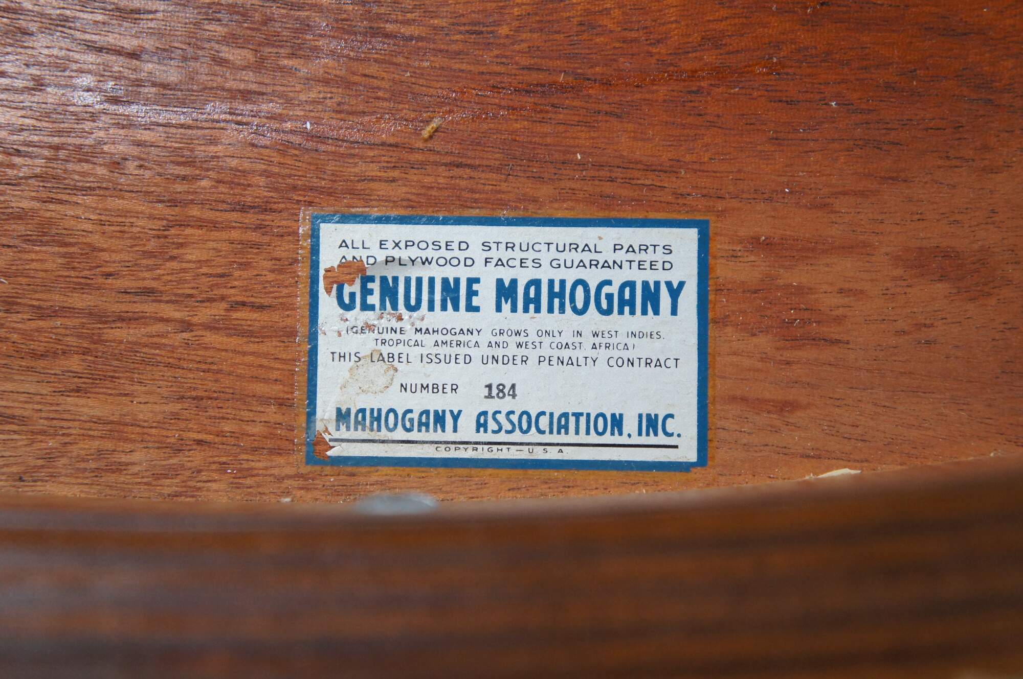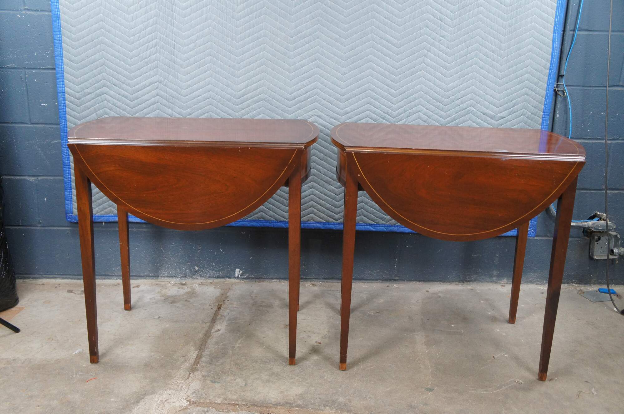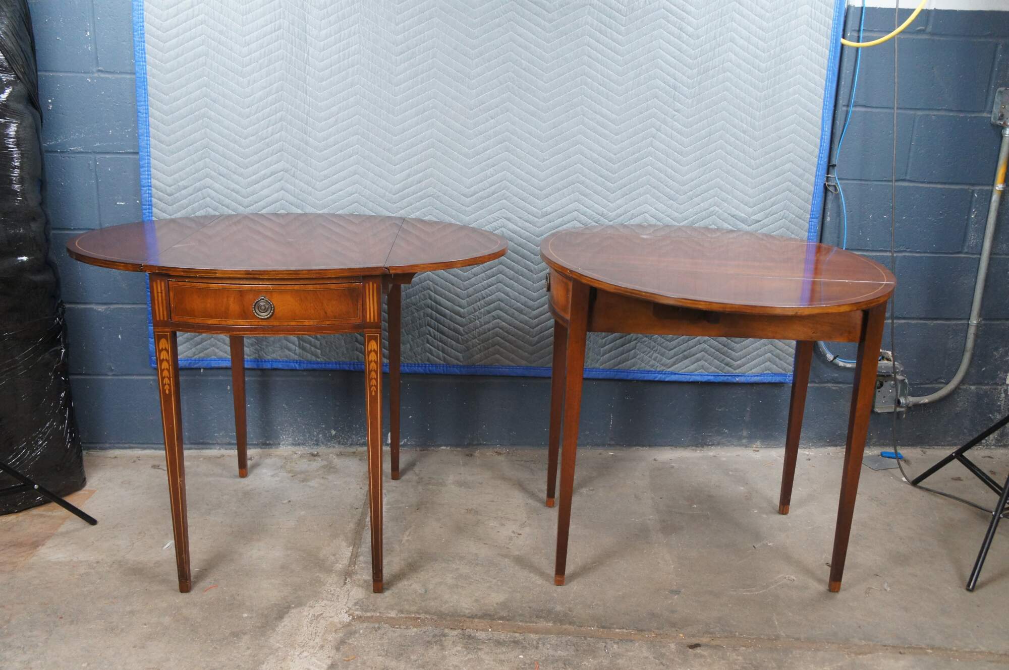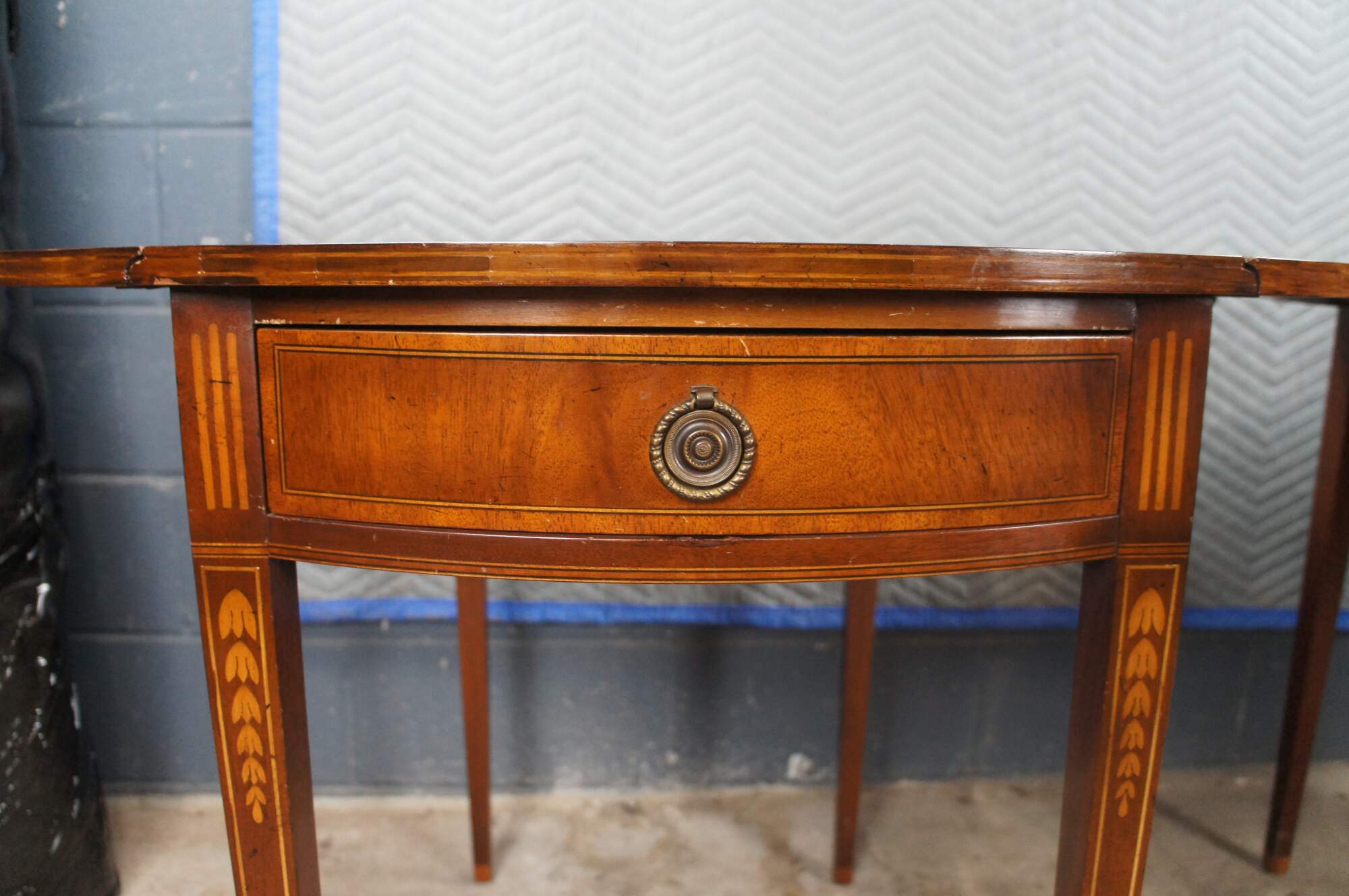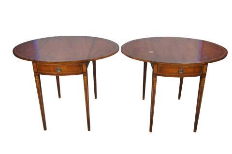 Made from mahogany with drop leaves that open to create an oval surface. Features banding over square tapered legs, inlay, dovetailed drawers and brass hardware. Inspired by Sheraton and Federal styling. Genuine Mahogany, Mahogany Association #184.