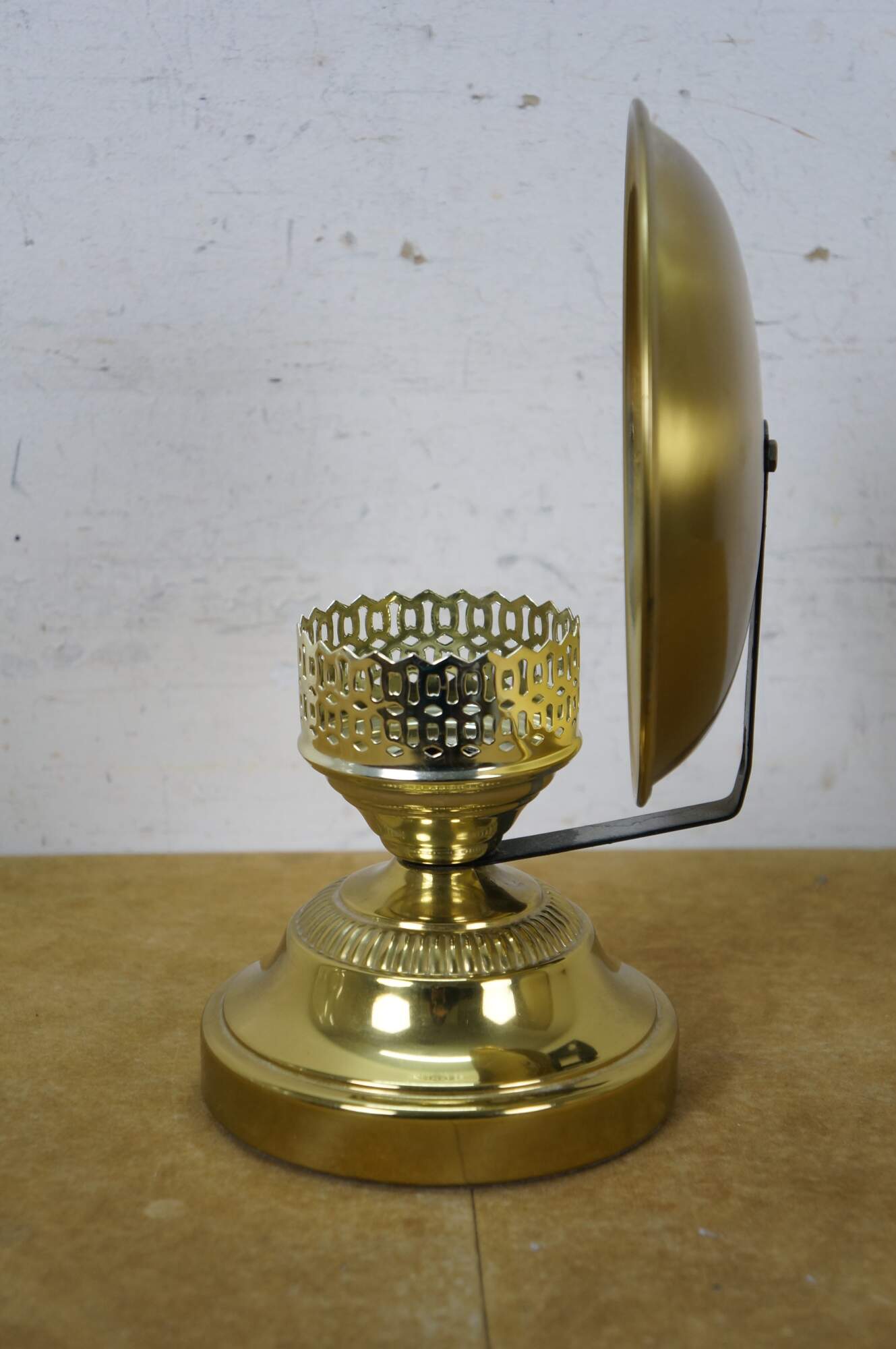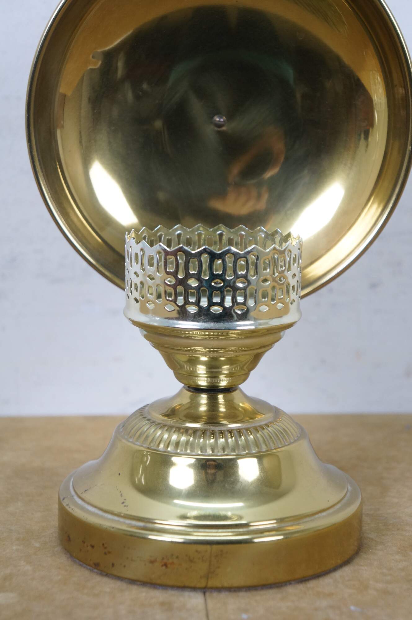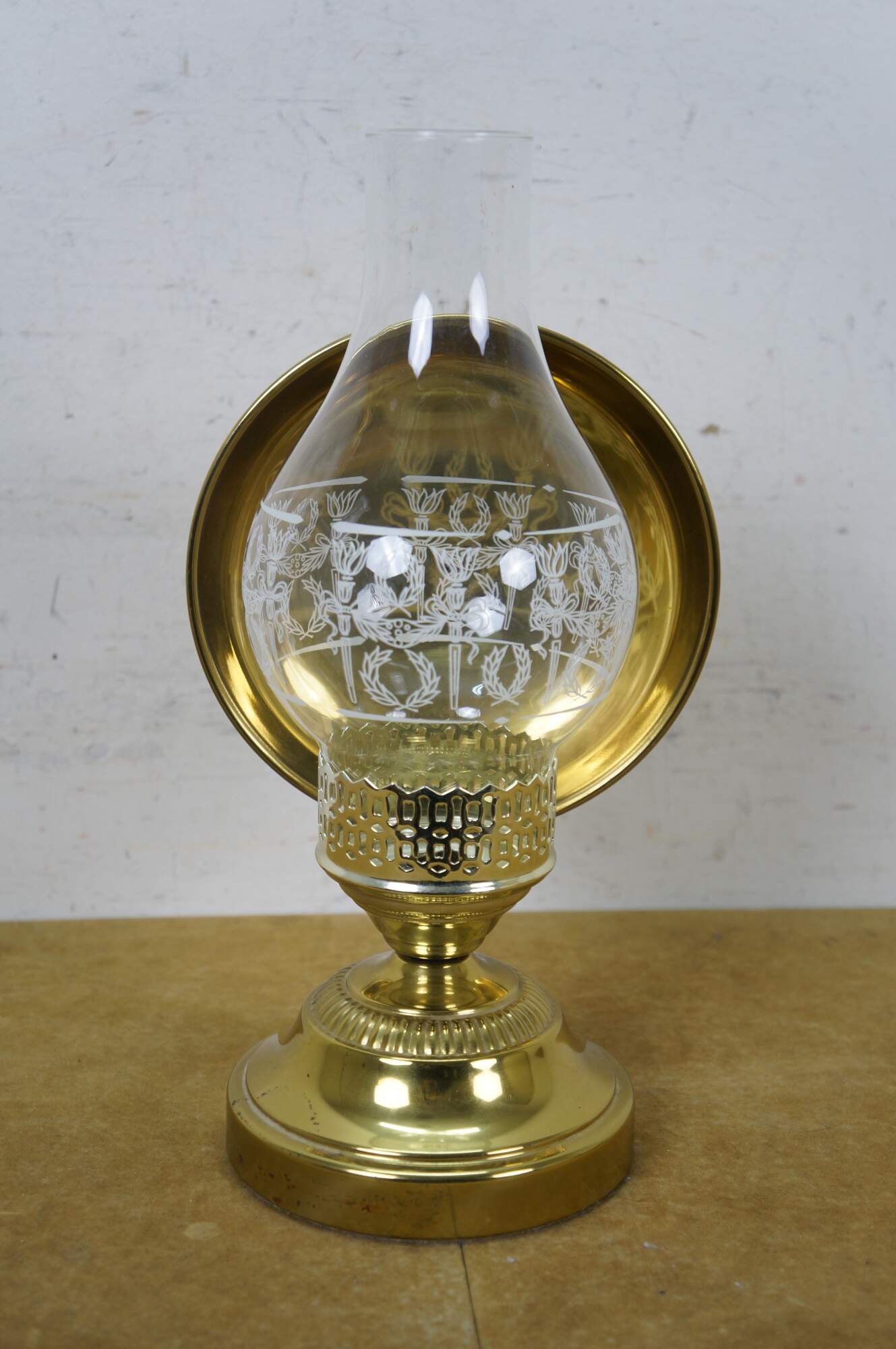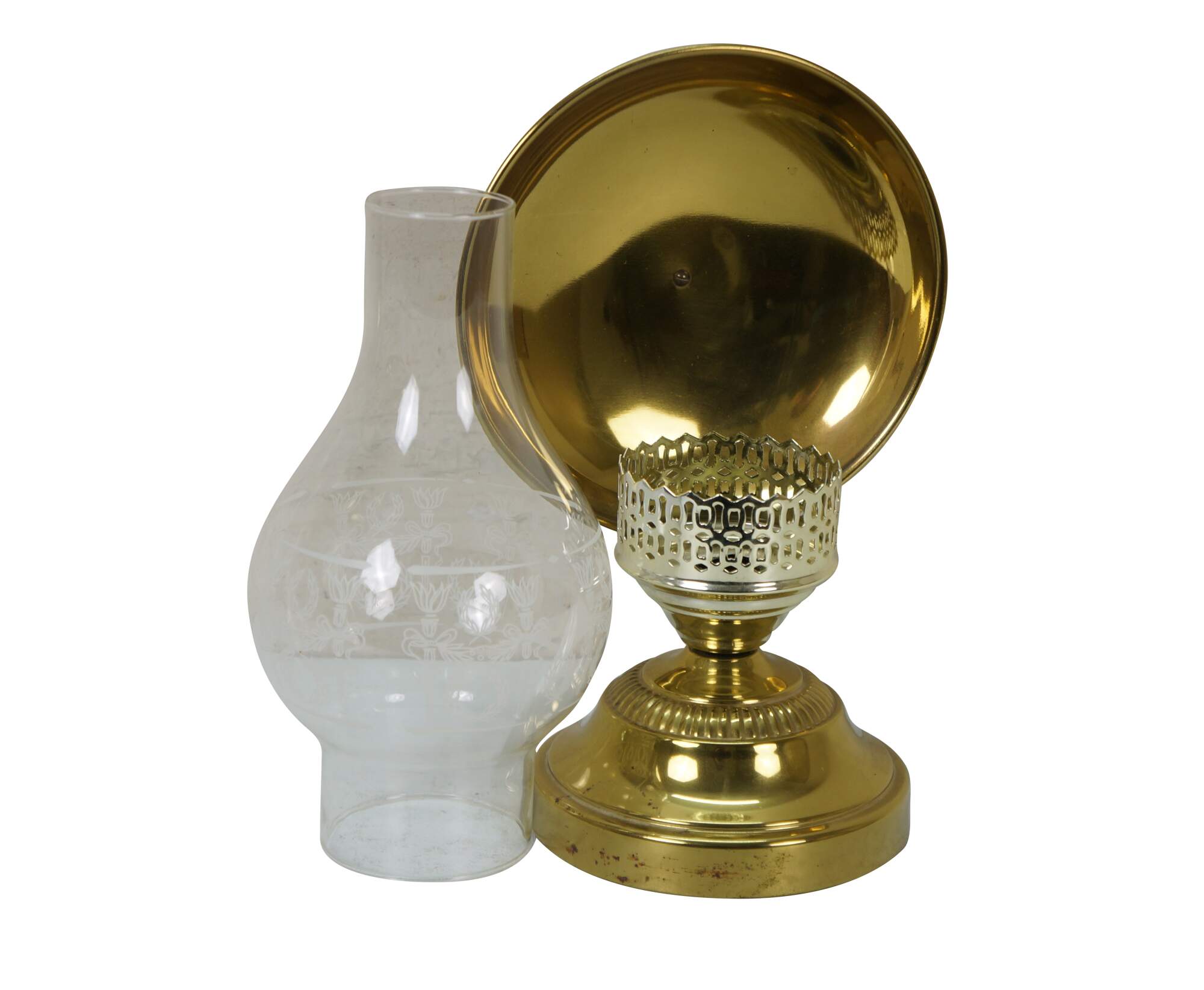 Vintage 20th century lacquered brass tabletop candle holder featuring an oil lamp chamberstick style base, single taper candle cup, attached reflector, and glass hurricane painted with neoclassical torches and wreaths.