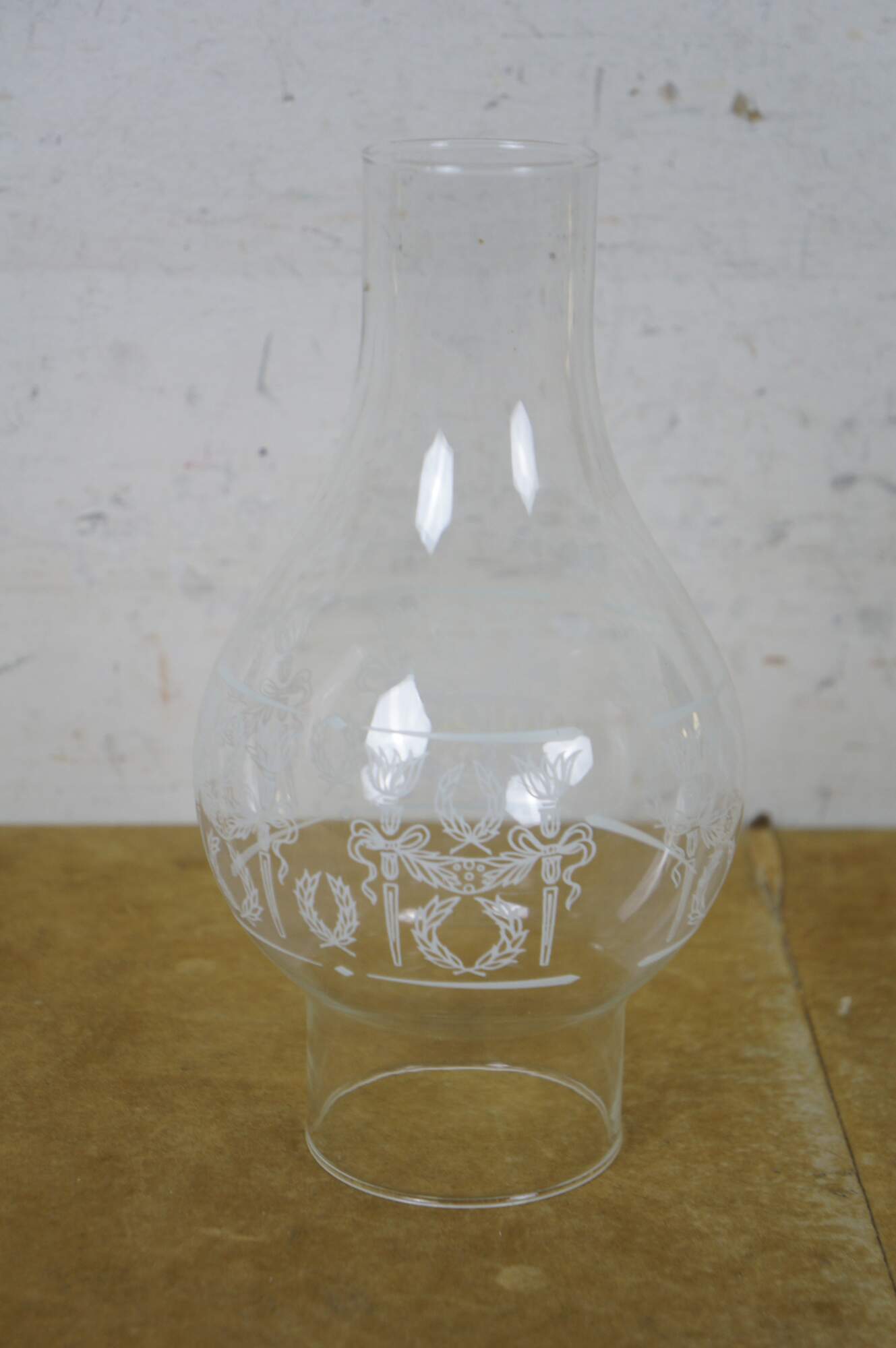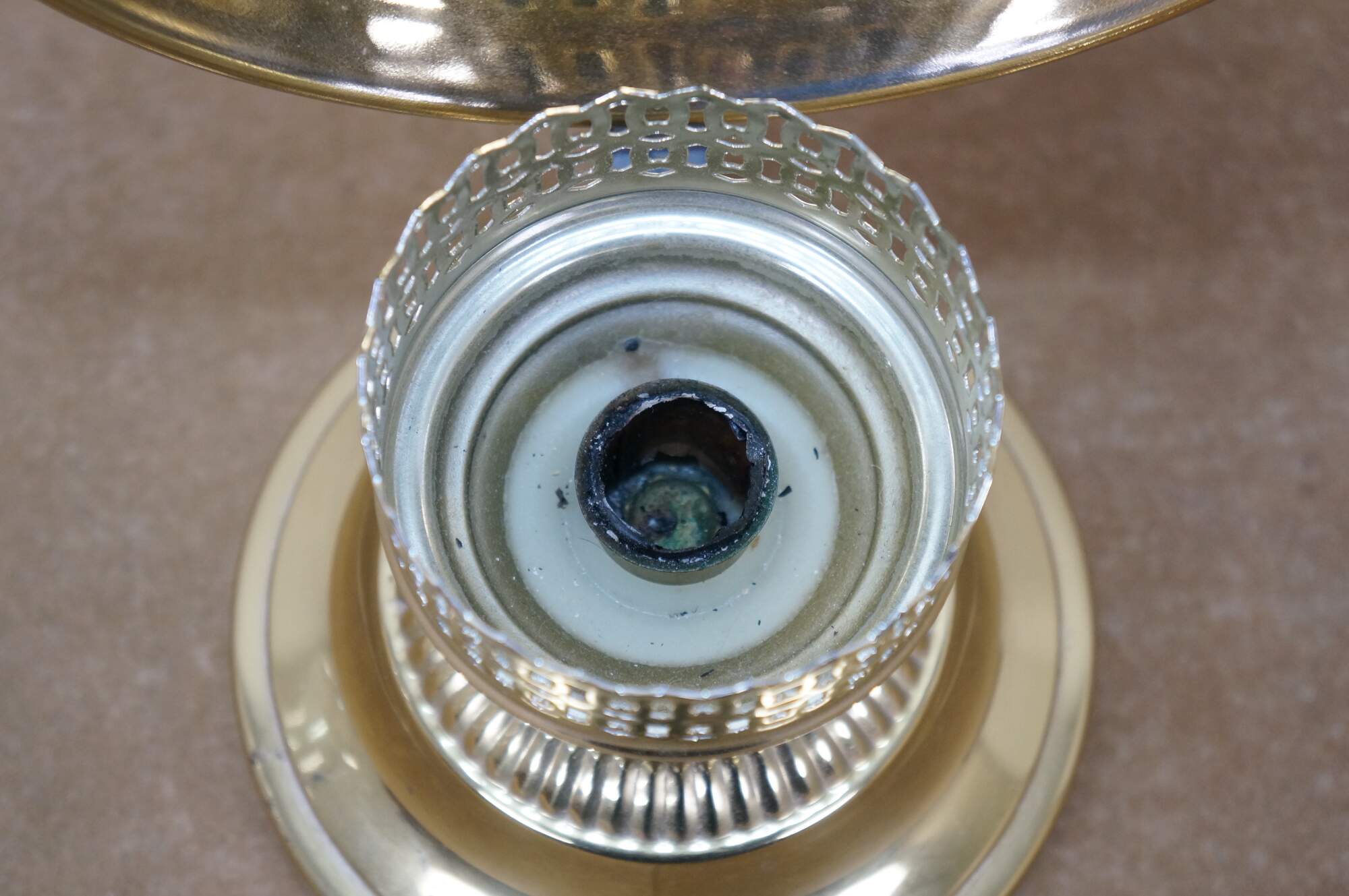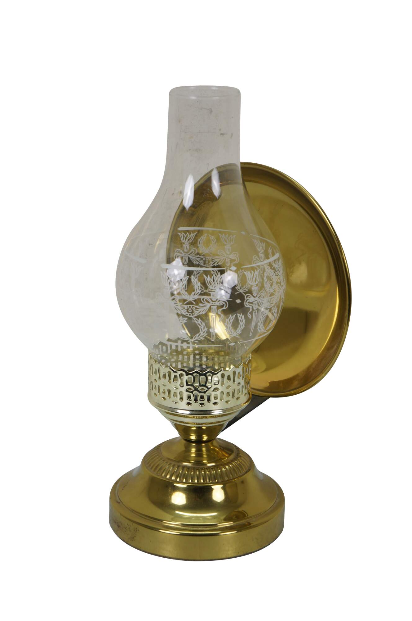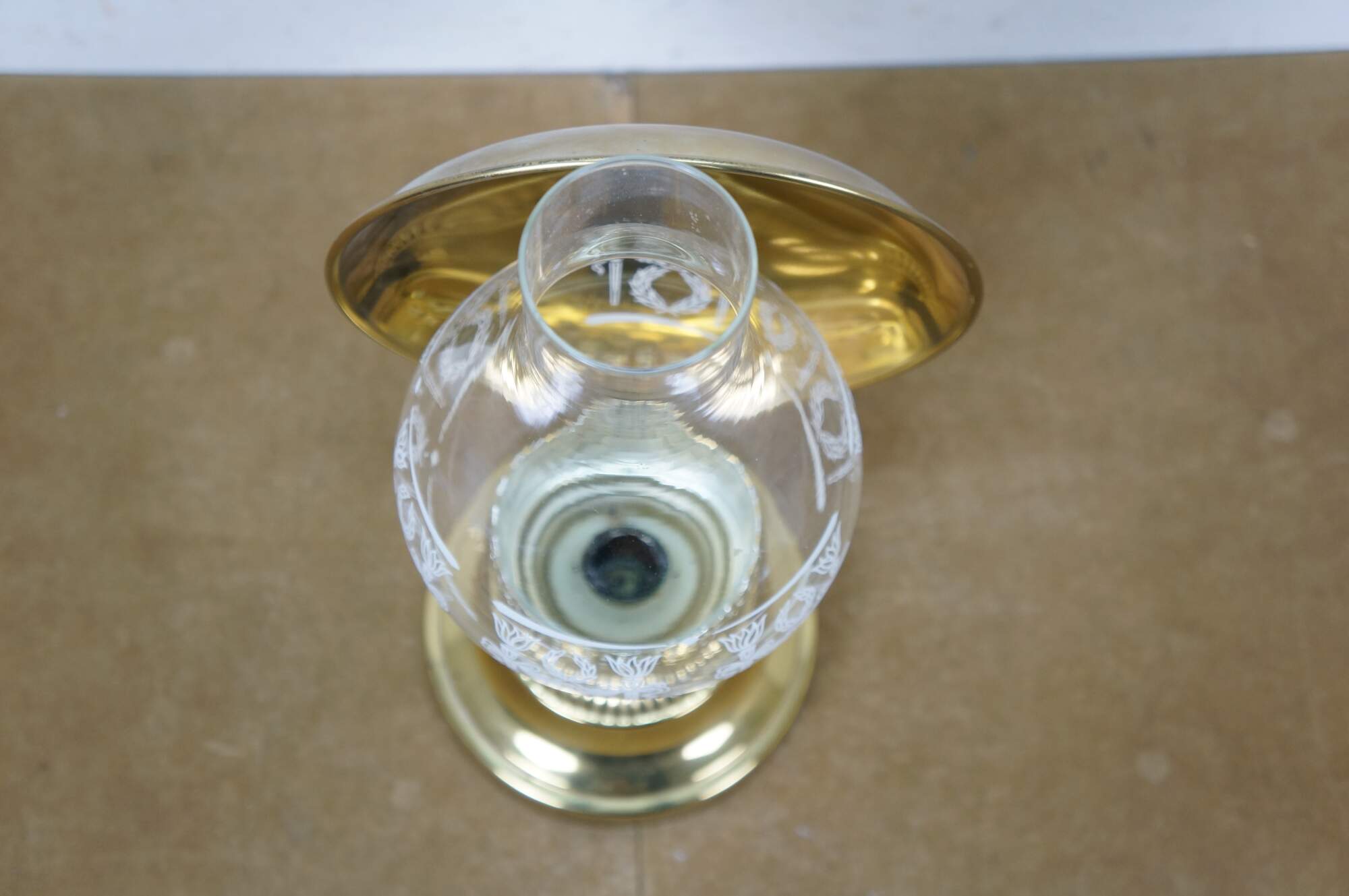 Vintage 20th century lacquered brass tabletop candle holder featuring an oil lamp chamberstick style base, single taper candle cup, attached reflector, and glass hurricane painted with neoclassical torches and wreaths.