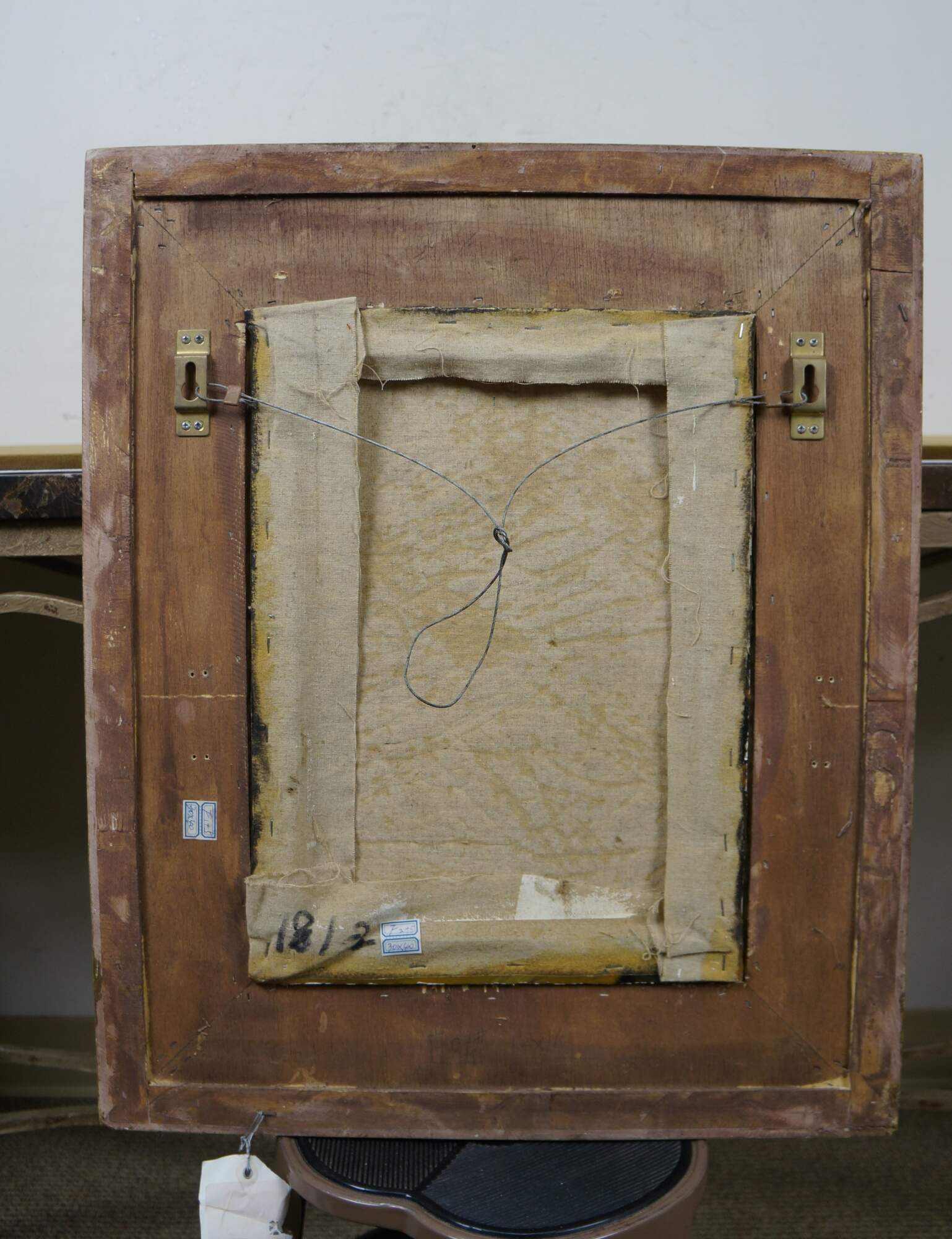 Late 20th century oil painting on linen after a circa 1598-99 portrait of "Saint Catherine of Alexandria" by Caravaggio. Depicts Saint Catherine kneeling on a red cushion by the wheel used to kill her, holding a sword. Ornate gilt composite frame, molded with a dense array of scallop, floral and foliate designs.