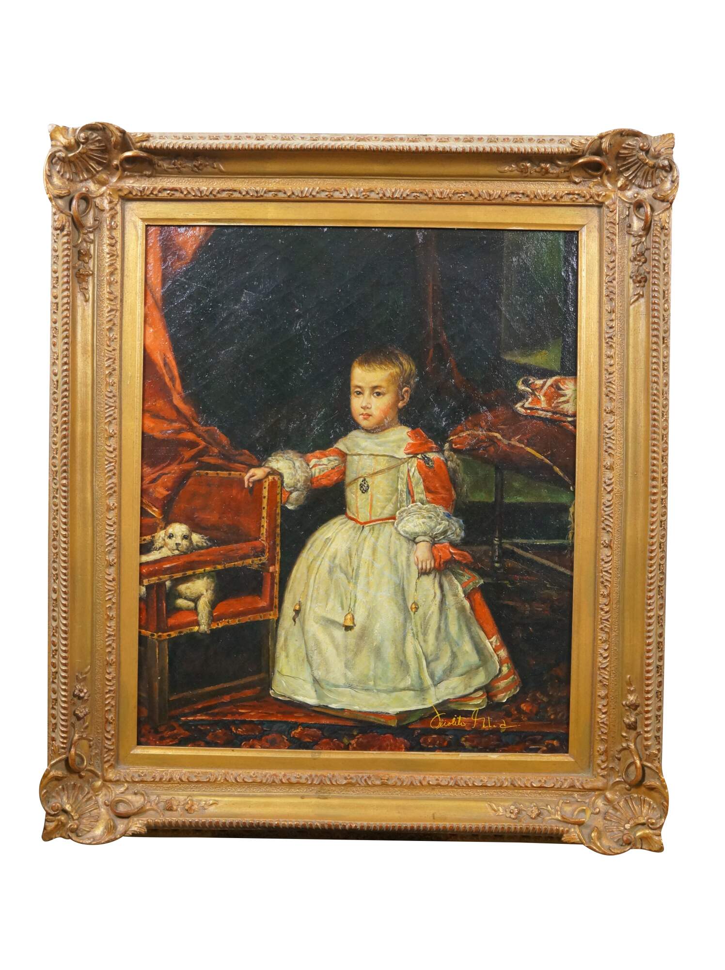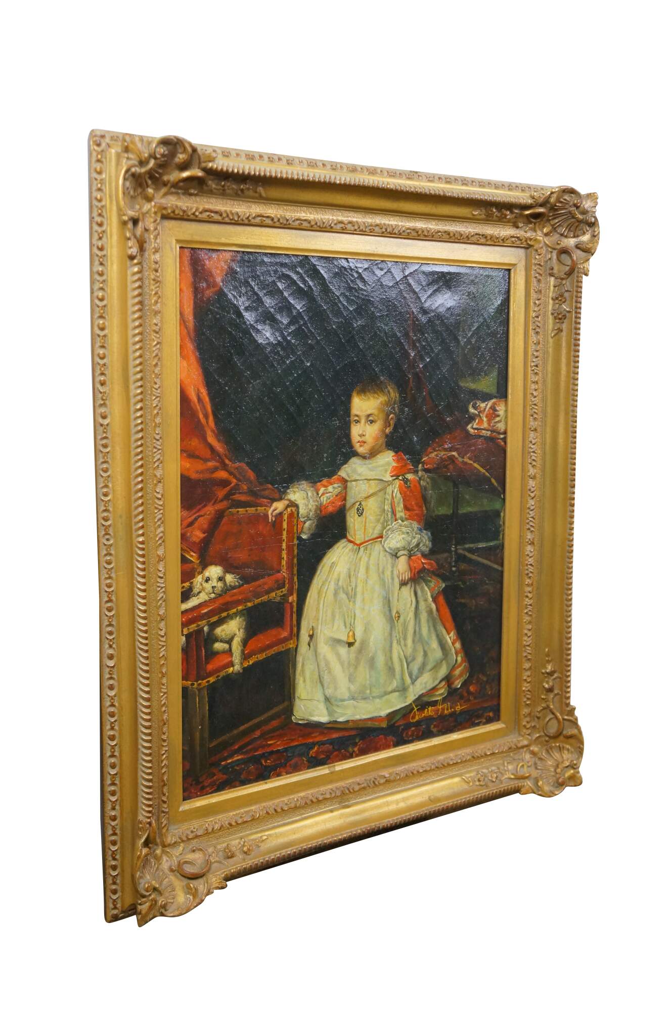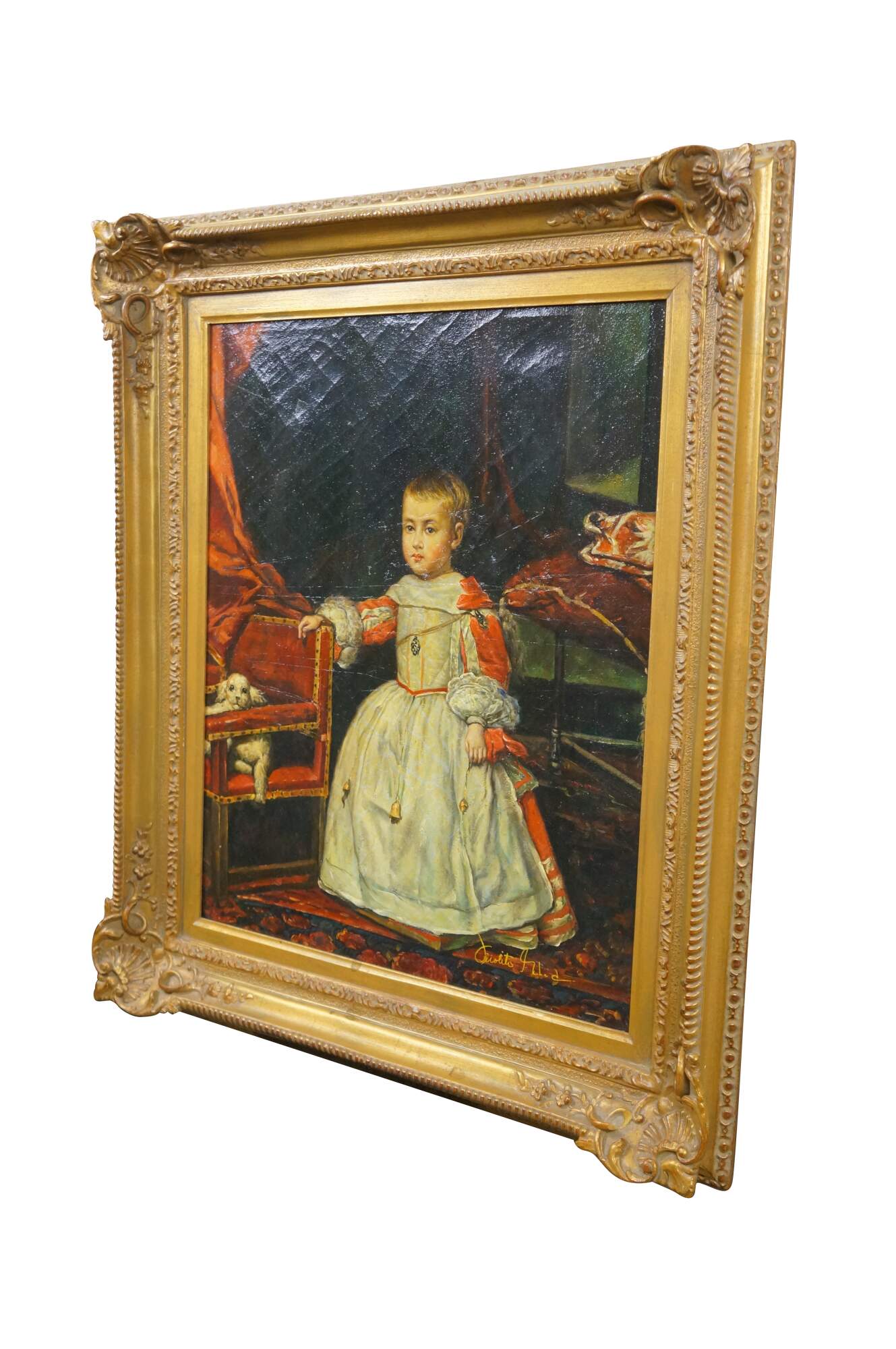 Late 20th century oil on canvas portrait painting after a work depicting the infant Prince Philip Prospero, originally painted in 1659 by Diego Velazquez. "The painting depicts Philip Prospero, Prince of Asturias (Madrid, November 20, 1657 - Madrid, November 1, 1661), the short lived heir to the Spanish crown, who died aged only 3 years old. He was the third son and the first from the marriage of Philip IV of Spain and Mariana of Austria. In this portrait, the child is standing, he wears a dress typical of toddlers, while he rests his right arm on an armchair, which seems to grant him more compassion than majesty, since his health was precarious as evidenced by the amulets that he carries. On the chair, at the left, there is a lapdog, whose watery look accentuates the melancholy of the scene. The subject of the painting is located in a room, and in the background there is an open door through which light enters. To the right there is a stool with a cushion on which a hat is placed. Red tones predominate in the work and the dark tones of the background increase the contrast between the colors." (Wikipedia) Signed, lower right. Gilt composite frame with foliate and rope twist trim, and scallop shell and floral corners.