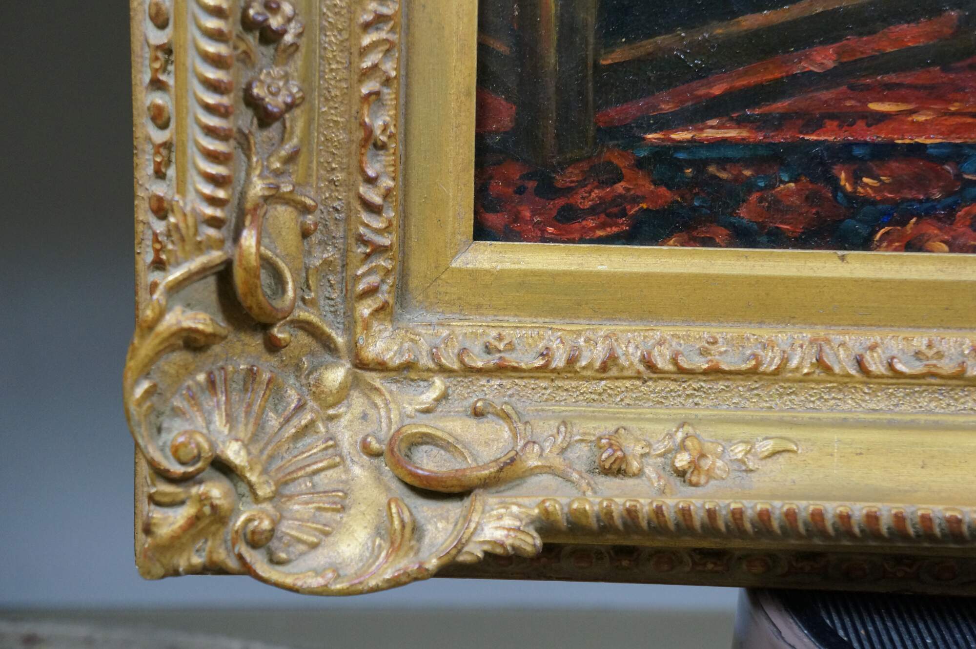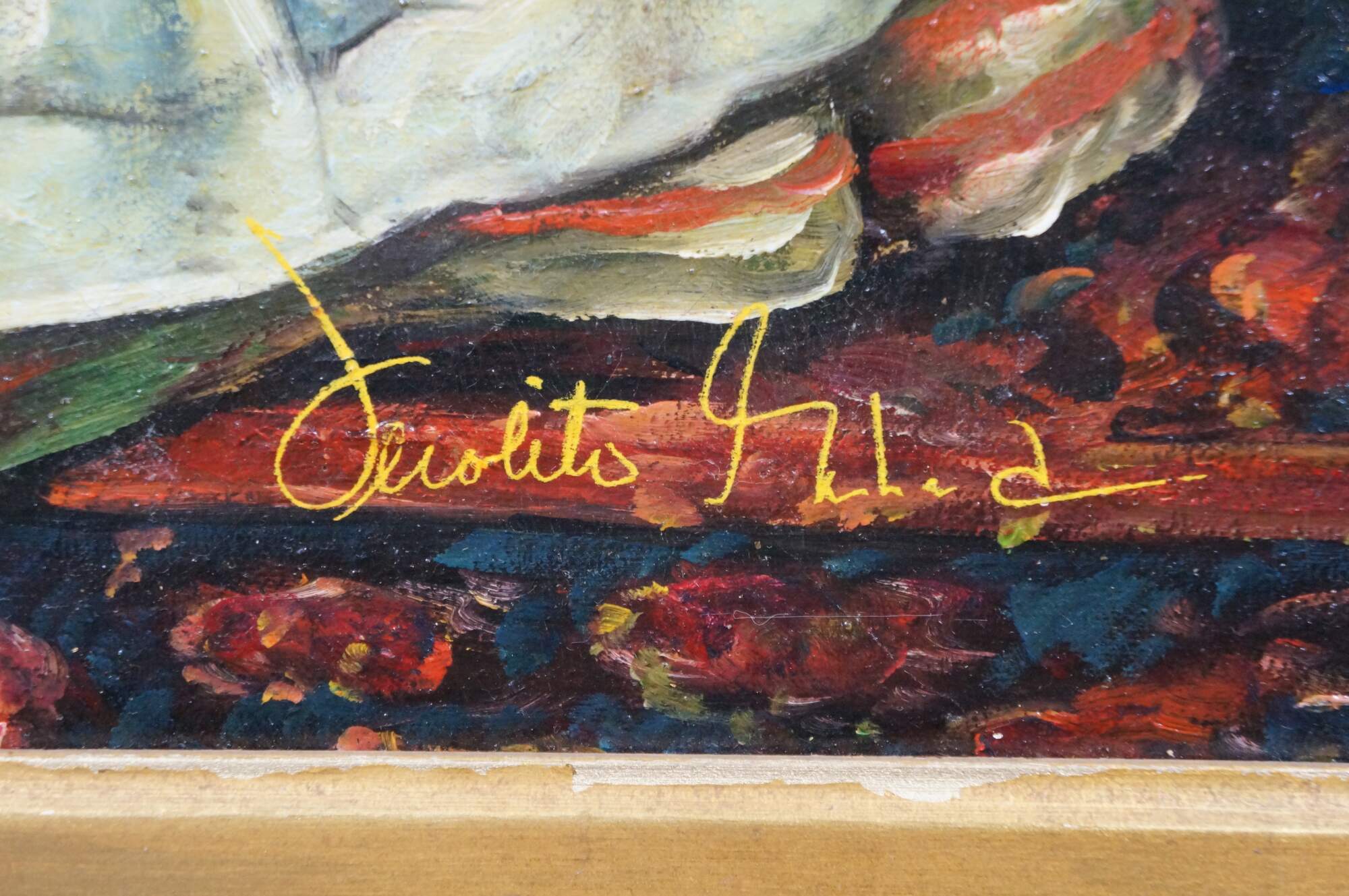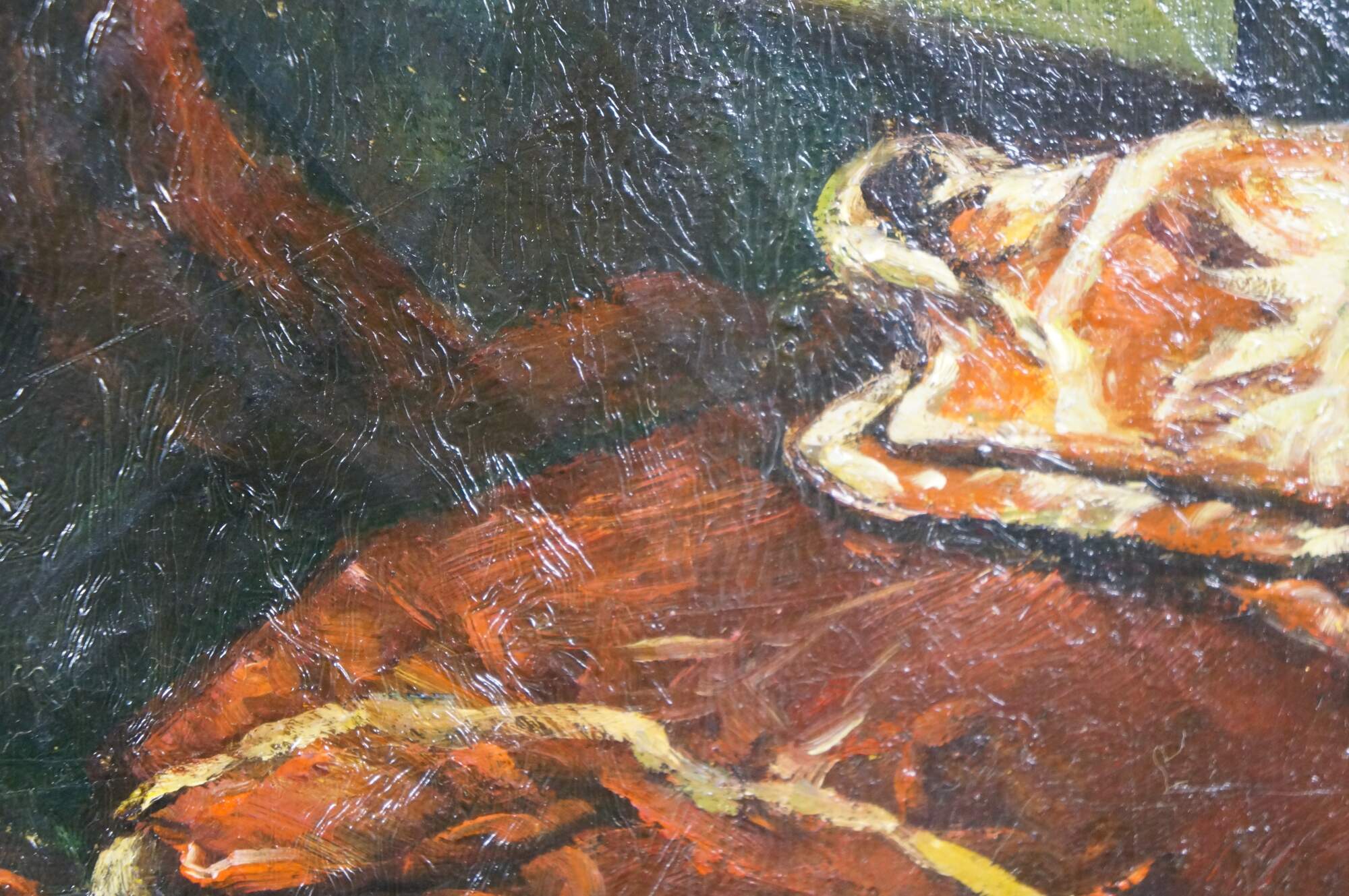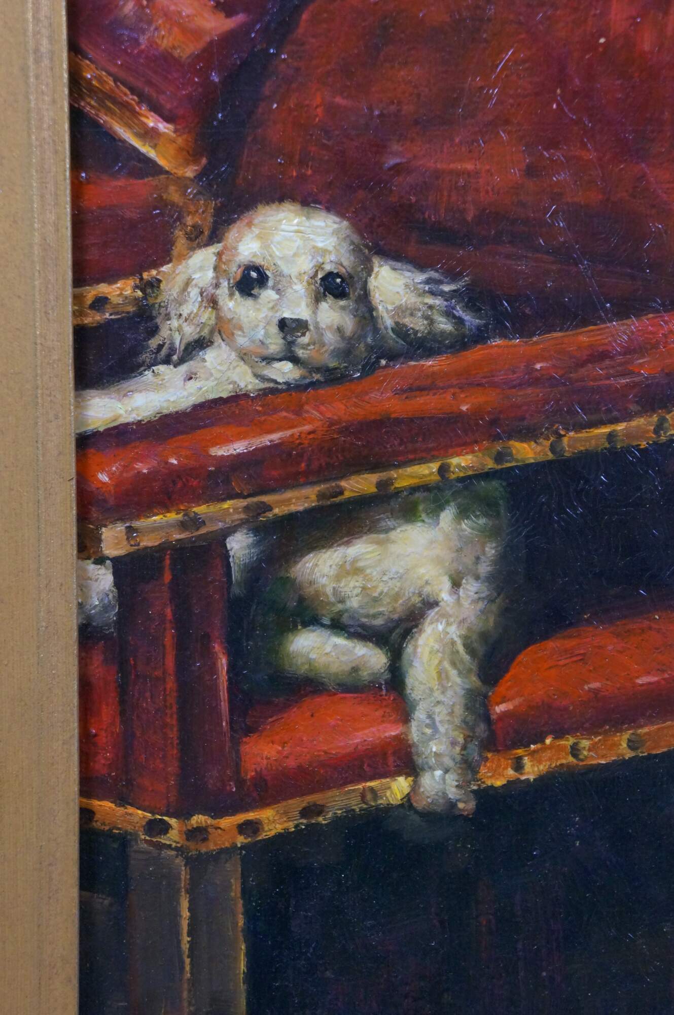 Late 20th century oil on canvas portrait painting after a work depicting the infant Prince Philip Prospero, originally painted in 1659 by Diego Velazquez. "The painting depicts Philip Prospero, Prince of Asturias (Madrid, November 20, 1657 - Madrid, November 1, 1661), the short lived heir to the Spanish crown, who died aged only 3 years old. He was the third son and the first from the marriage of Philip IV of Spain and Mariana of Austria. In this portrait, the child is standing, he wears a dress typical of toddlers, while he rests his right arm on an armchair, which seems to grant him more compassion than majesty, since his health was precarious as evidenced by the amulets that he carries. On the chair, at the left, there is a lapdog, whose watery look accentuates the melancholy of the scene. The subject of the painting is located in a room, and in the background there is an open door through which light enters. To the right there is a stool with a cushion on which a hat is placed. Red tones predominate in the work and the dark tones of the background increase the contrast between the colors." (Wikipedia) Signed, lower right. Gilt composite frame with foliate and rope twist trim, and scallop shell and floral corners.