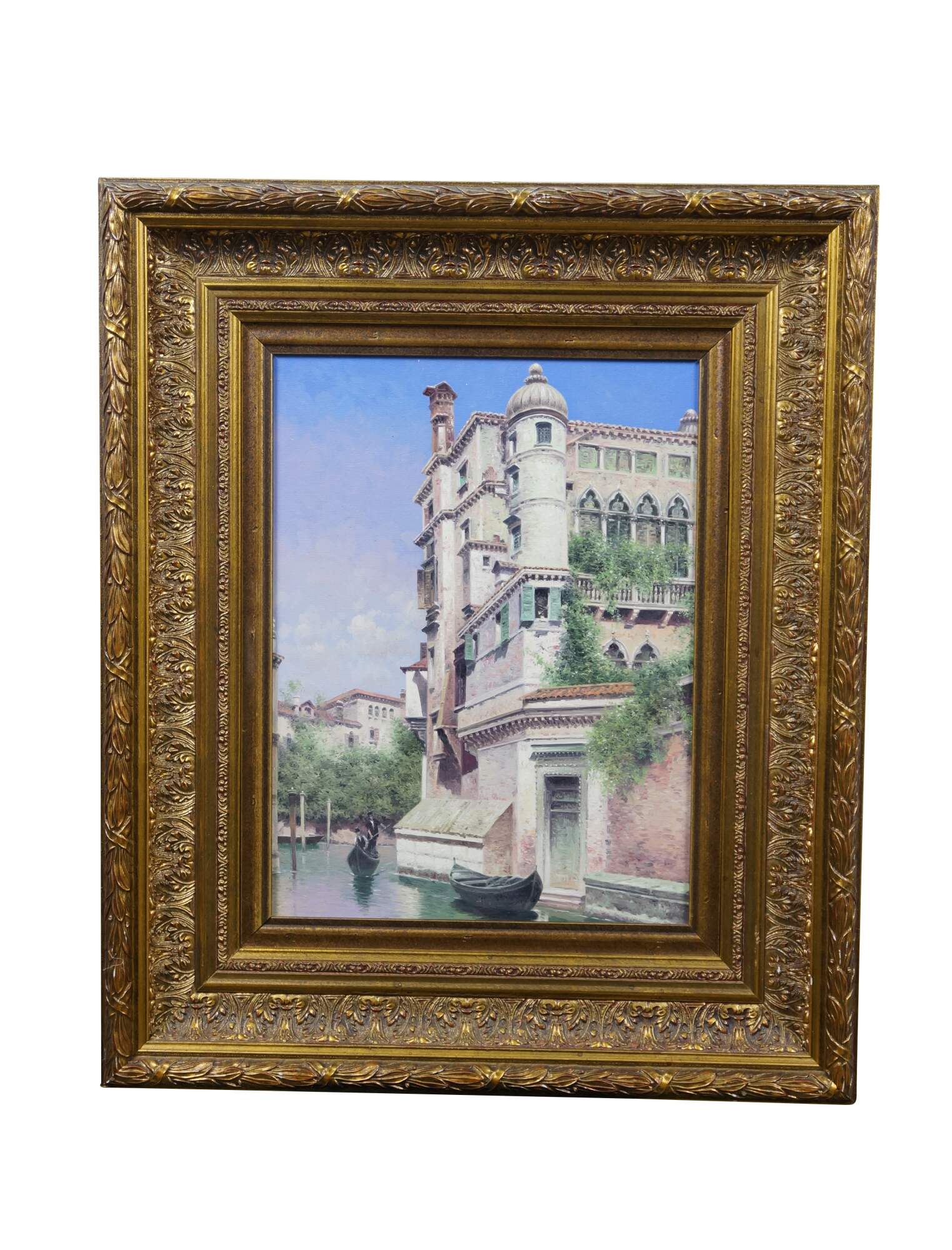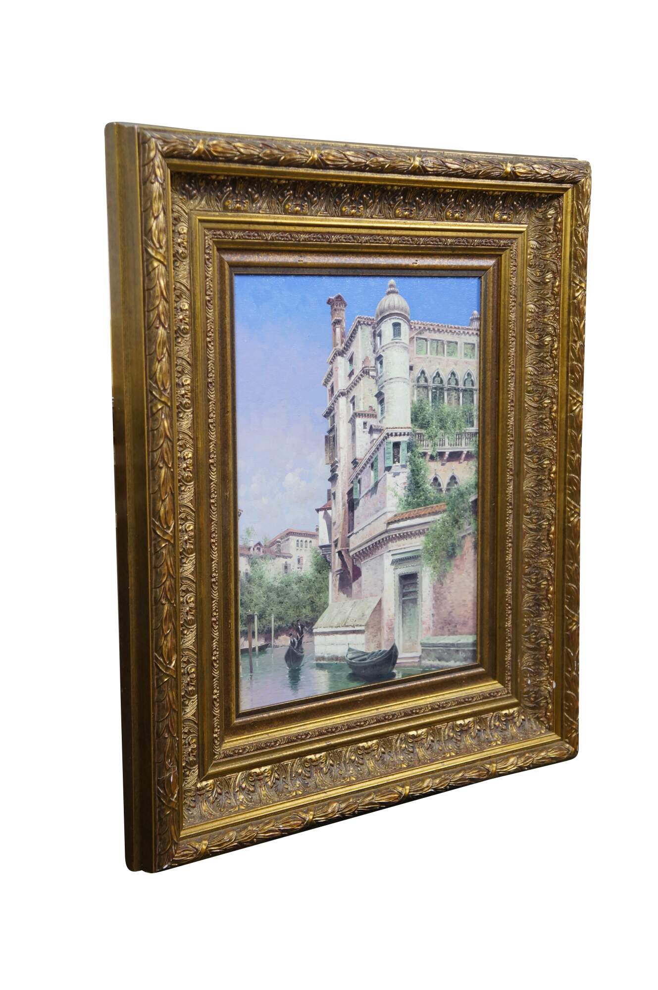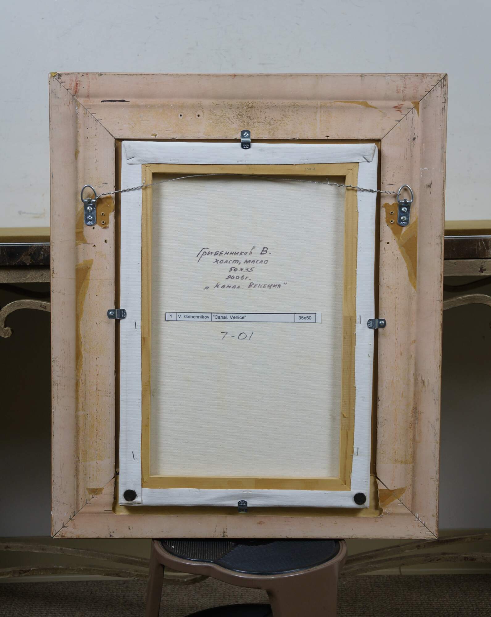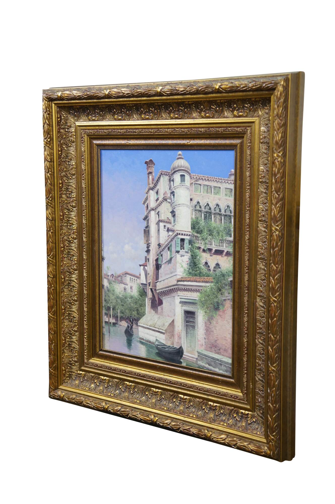 2006 oil on canvas painting titled "Canal, Venice" by Vasiliy Gribennikov. Depicts a view of gondaliers passing the Palazzo Contarini del Bovolo on the canal. Signed and titled on reverse. Gilt wood and gesso frame with a dense, ornate folaite design.