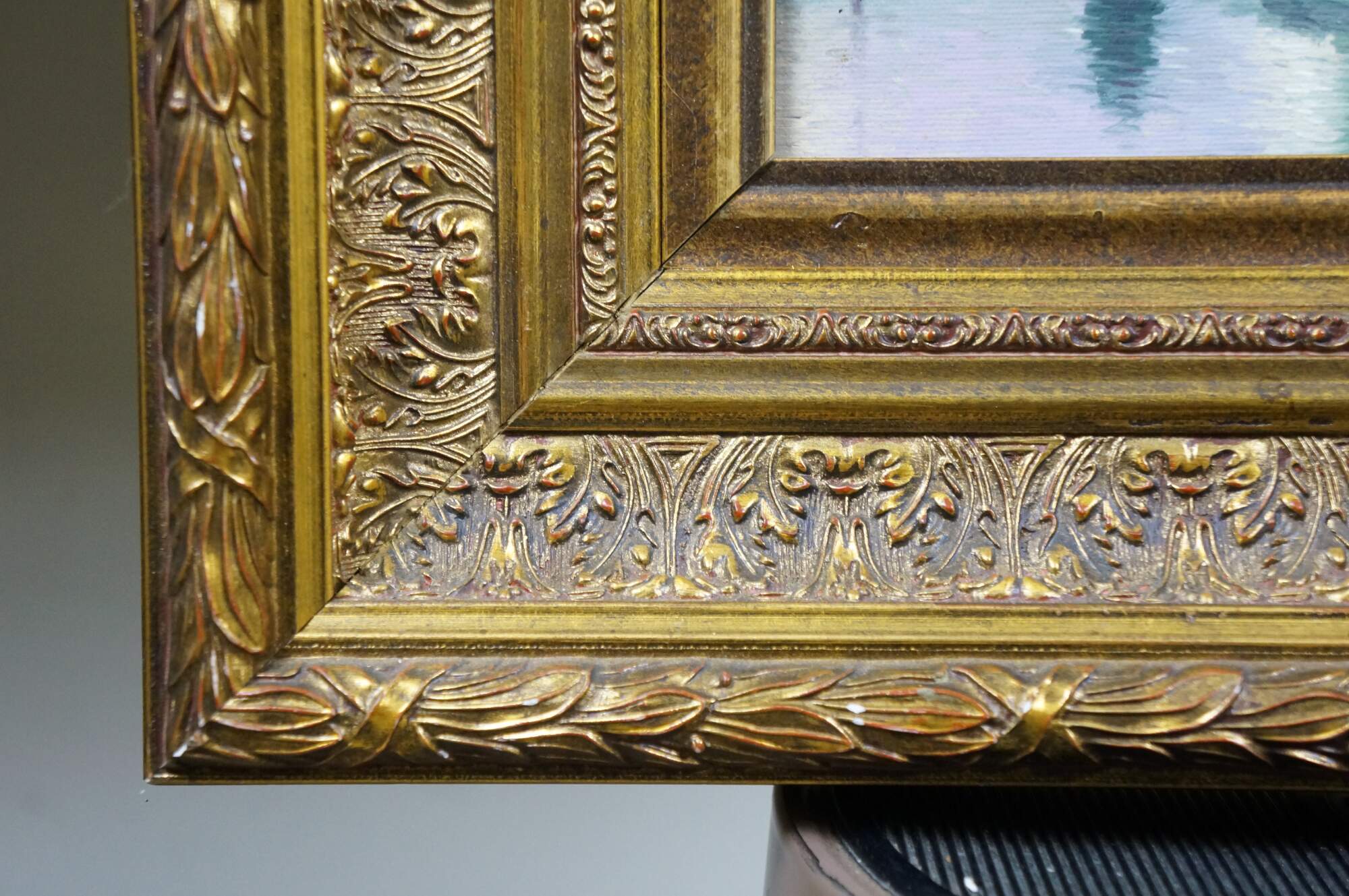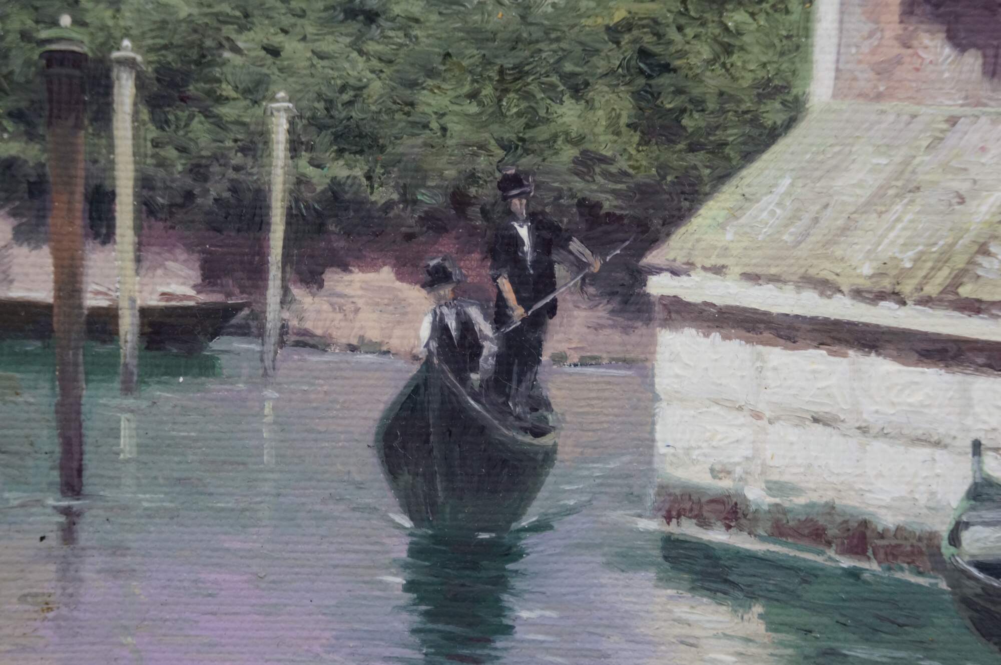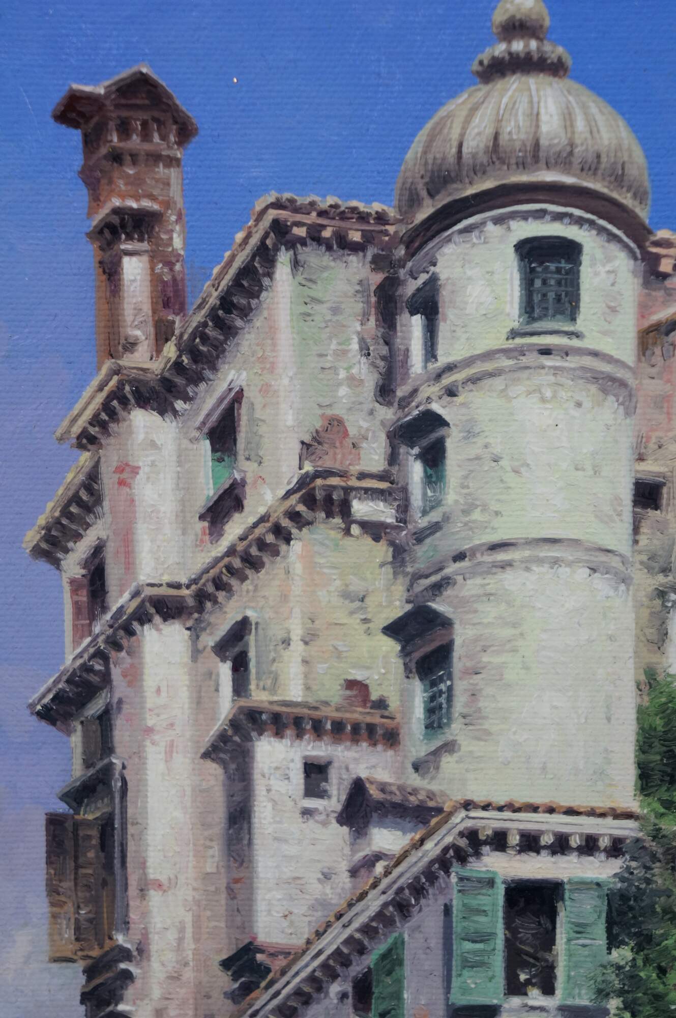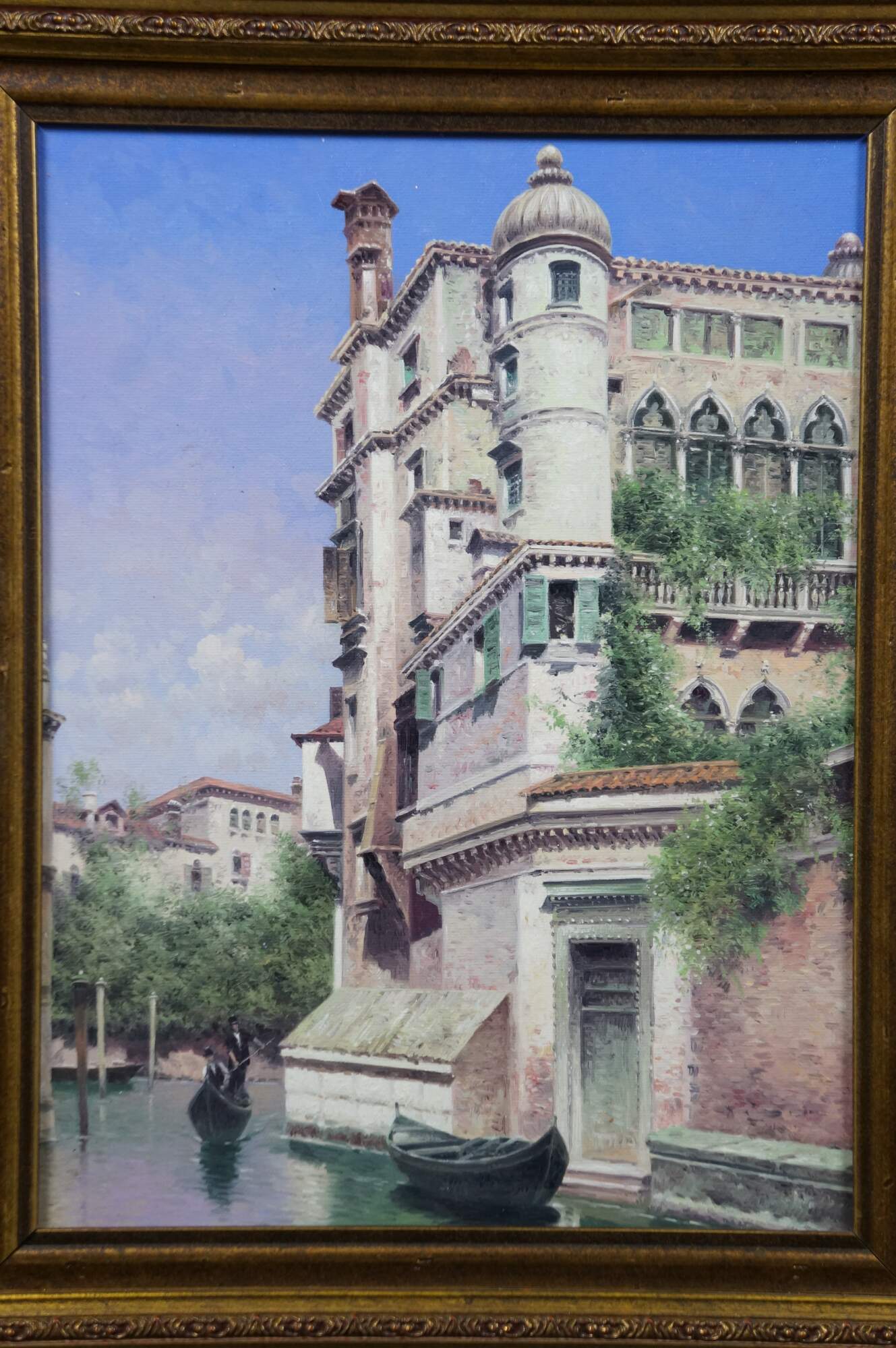 2006 oil on canvas painting titled "Canal, Venice" by Vasiliy Gribennikov. Depicts a view of gondaliers passing the Palazzo Contarini del Bovolo on the canal. Signed and titled on reverse. Gilt wood and gesso frame with a dense, ornate folaite design.
