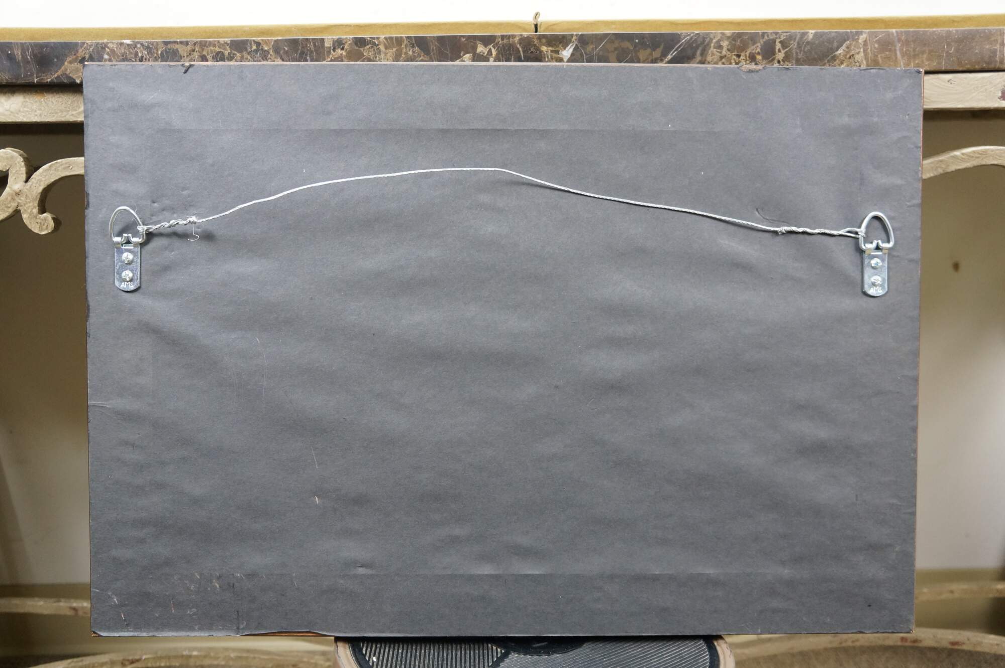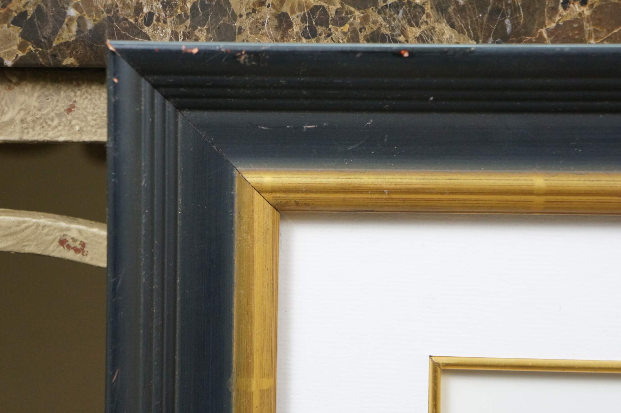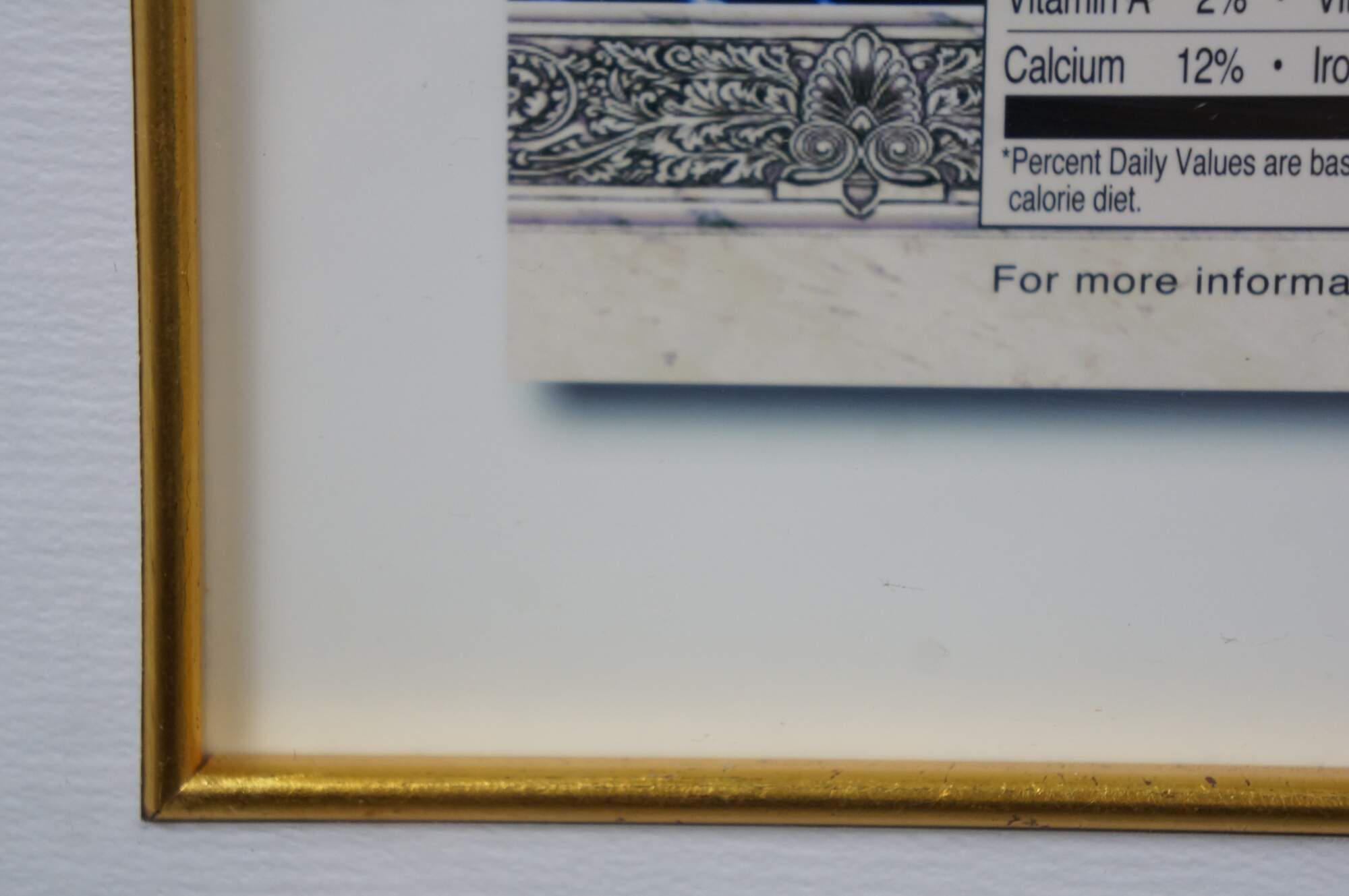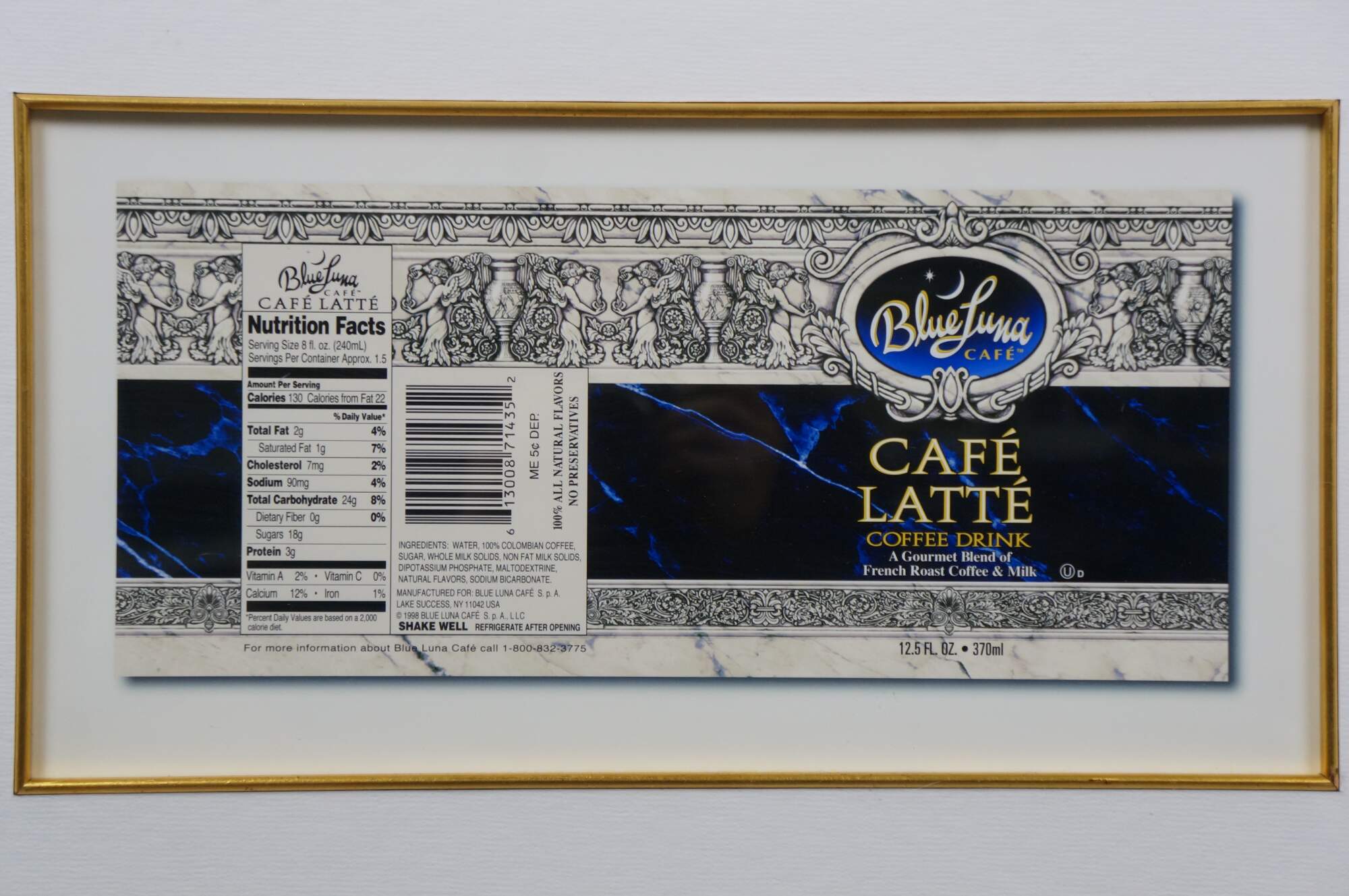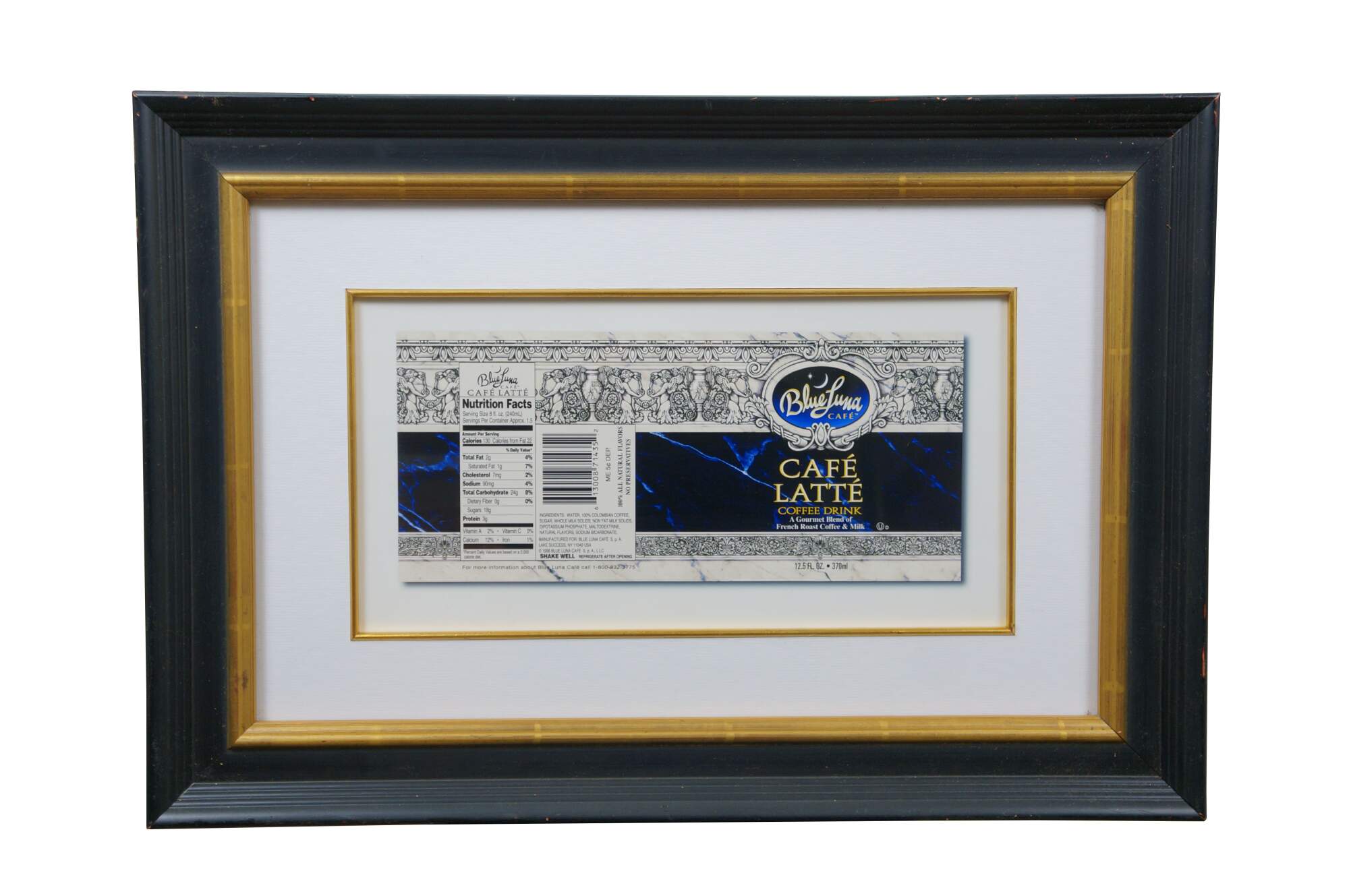 Late 20th century ad print of a label for Bella Luna Cafe Latte coffee Drink. Black and gold beveled wood frame; white and gold mat.