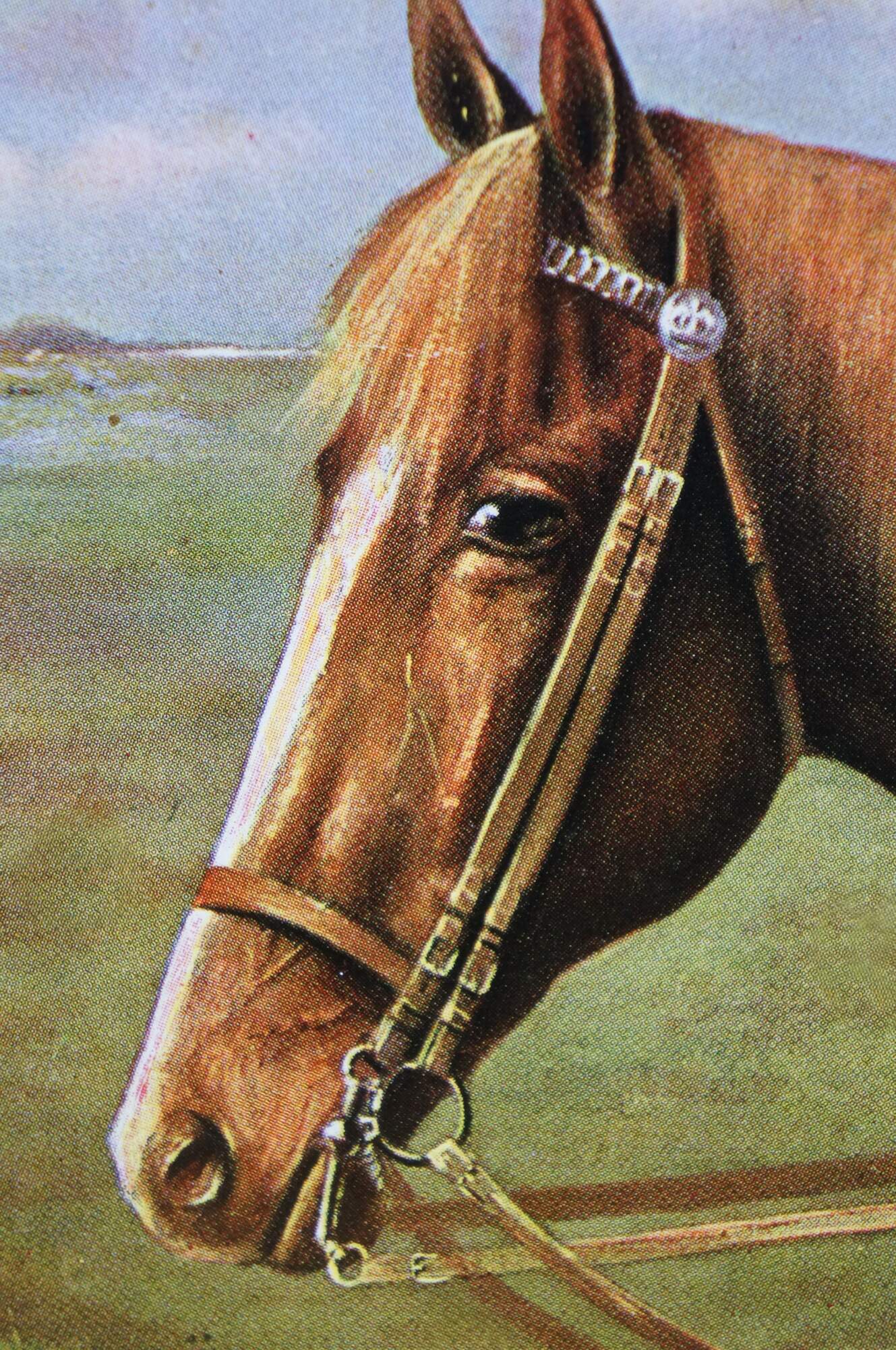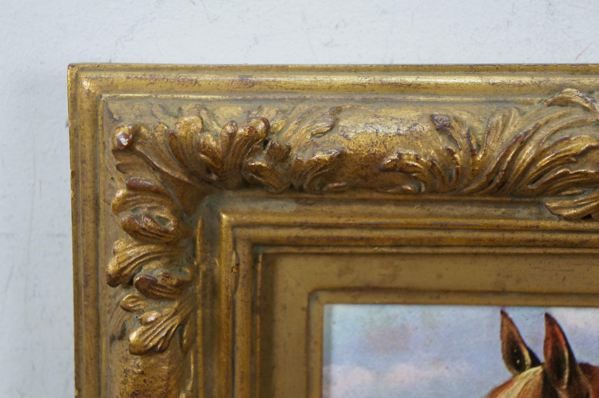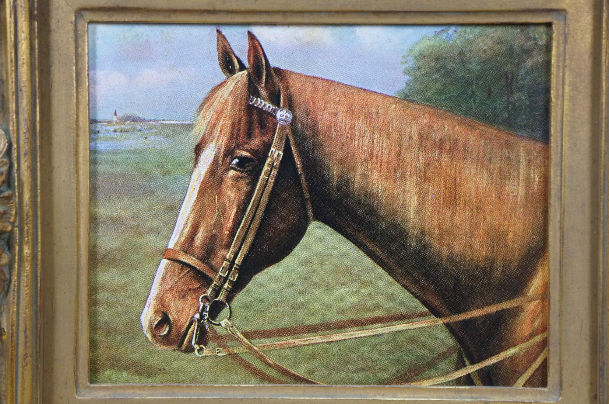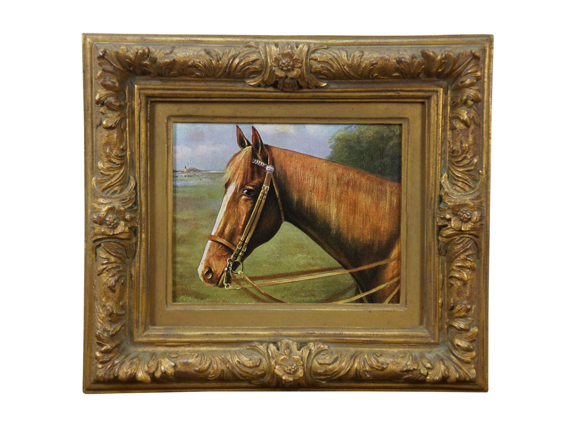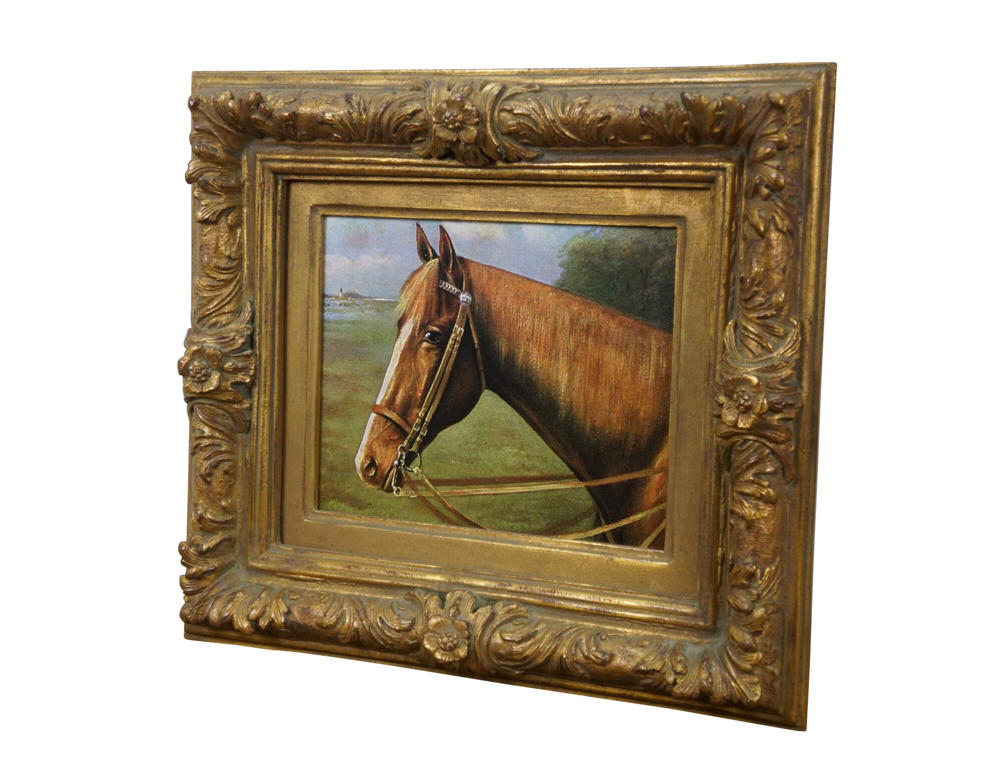 Late 20th century print on board of a brown horse in a landscape with a distant light house. Gilt composite frame with floral and acanthus leaf details.
