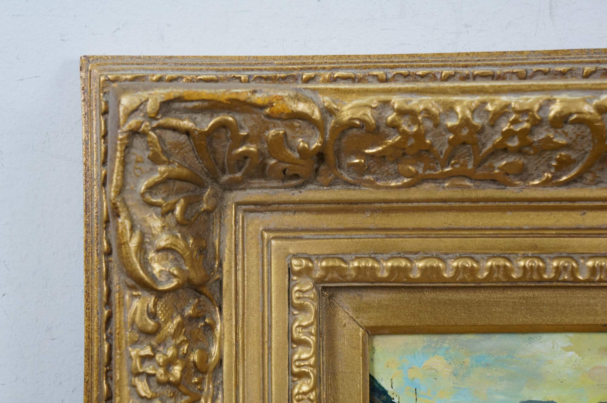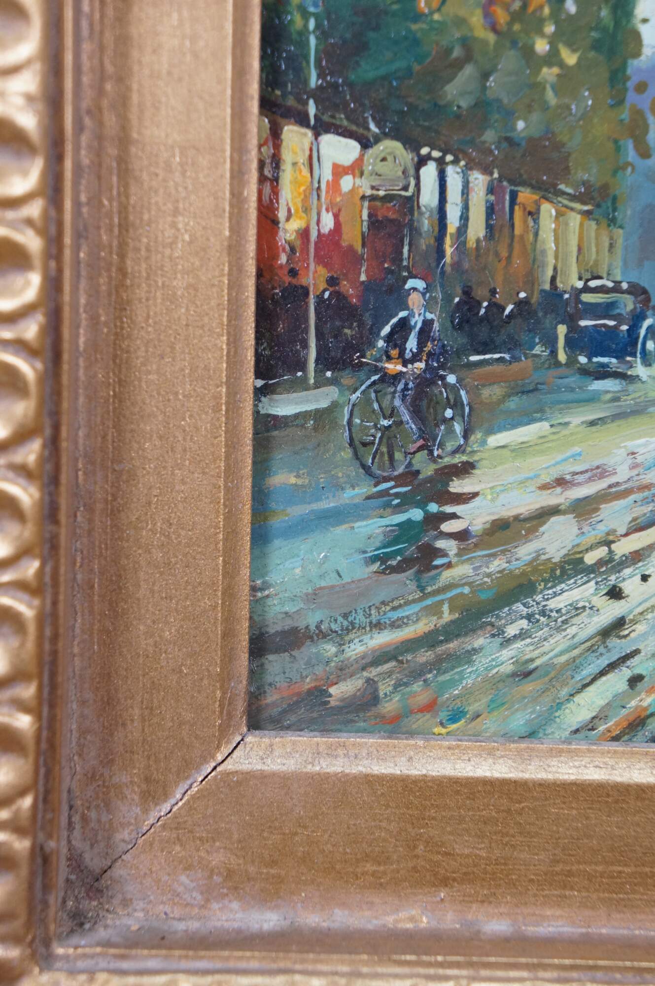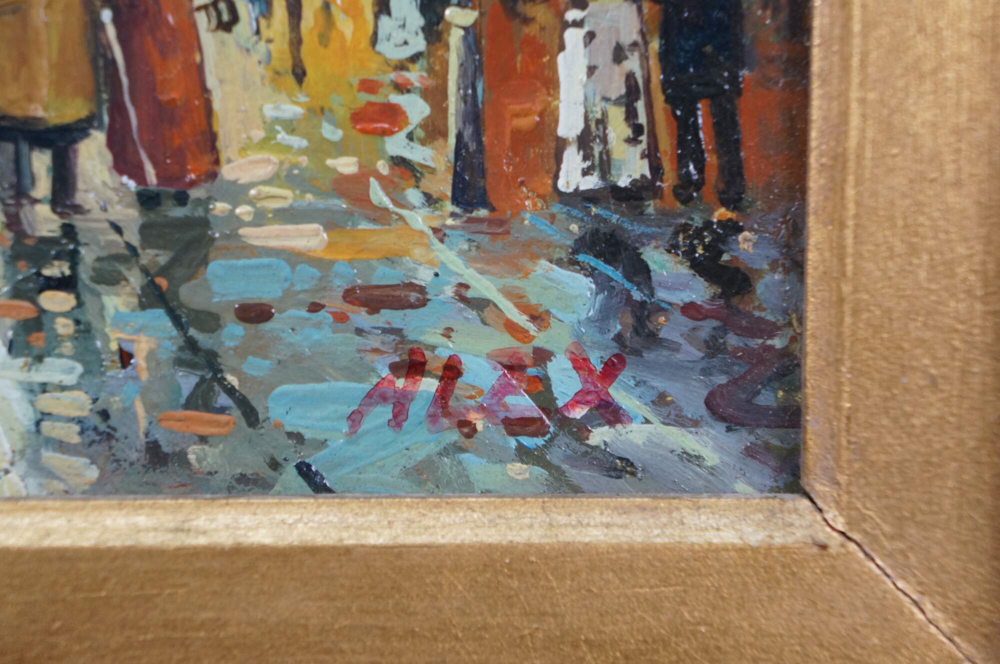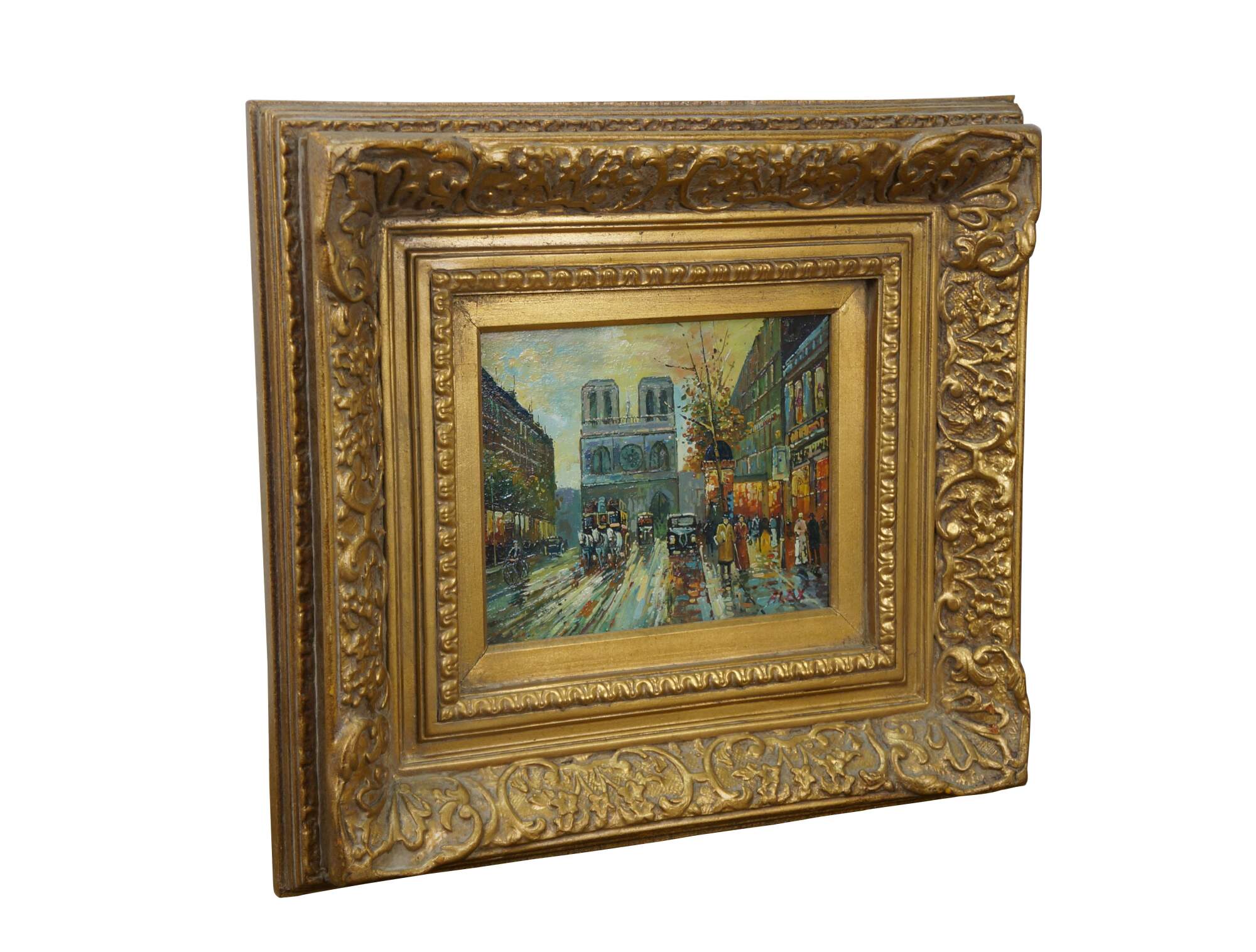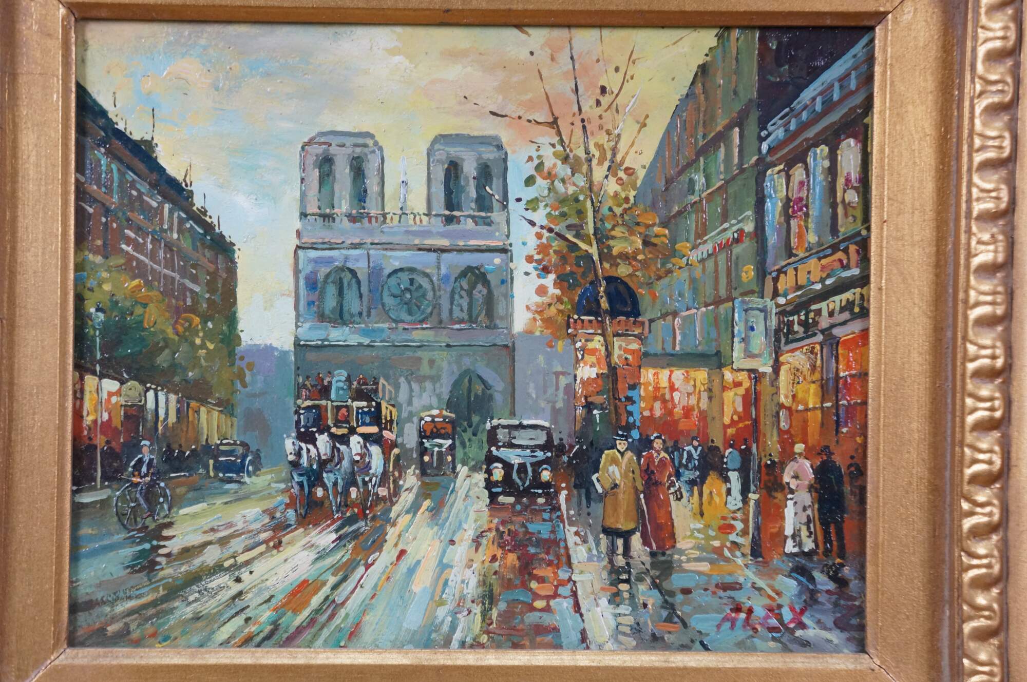 Late 20th century oil on board Parisan impressionist cityscape painting. Show a stree view of Notre Dame, with a horse and carriage, vehicles and walking figures in the rainy looking foreground. Signed Alex in lower right. Wood and gilt composite frame with a foliate and floral design.