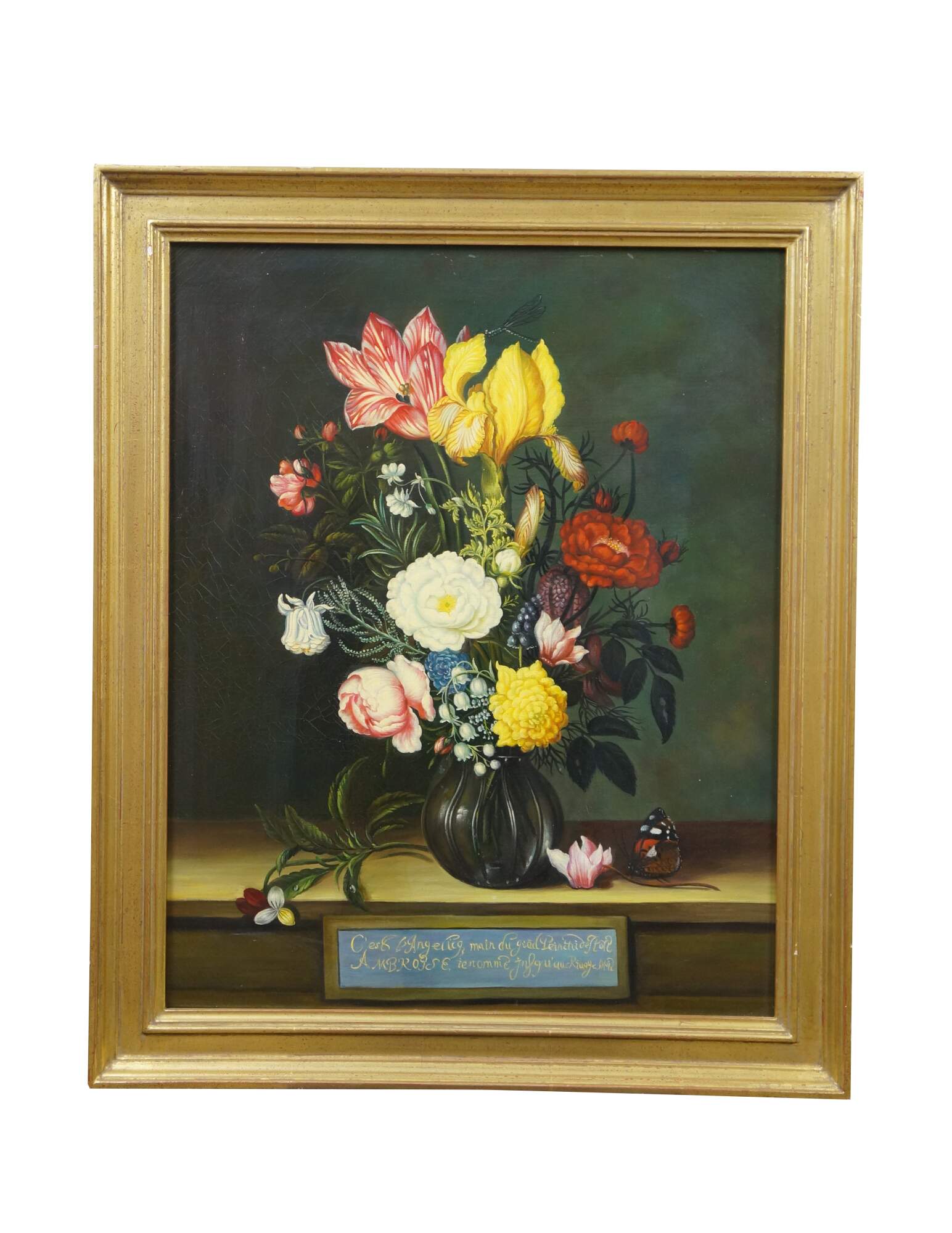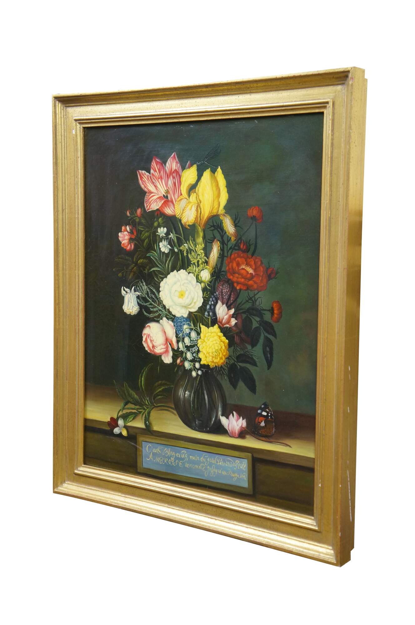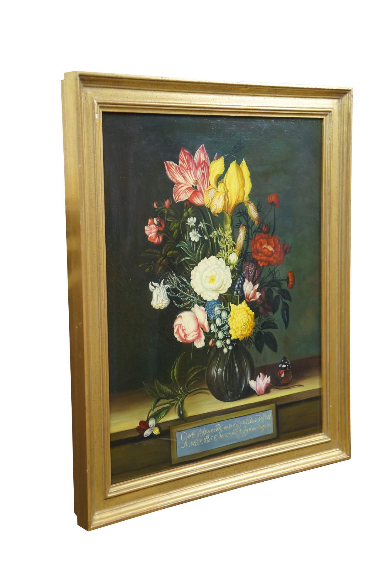 Late 20th Century oil on canvas painting after "Bouquet of Flowers in a Glass Vase" by Ambrosius Bosschaert, originally painted in 1621. "Here, two spectacular blossoms, a yellow iris and a red-and-white striped tulip, surmount a bouquet composed of numerous species, among them roses, a blue-and-white columbine, fritillaria, grape hyacinth, lily of the valley, and a sprig of rosemary. A damselfly alighting on the iris and a butterfly on the cyclamen blossom that rests on the wooden tabletop further enliven the composition." (National Gallery of Art) Beveled gilt wood & gesso frame.
