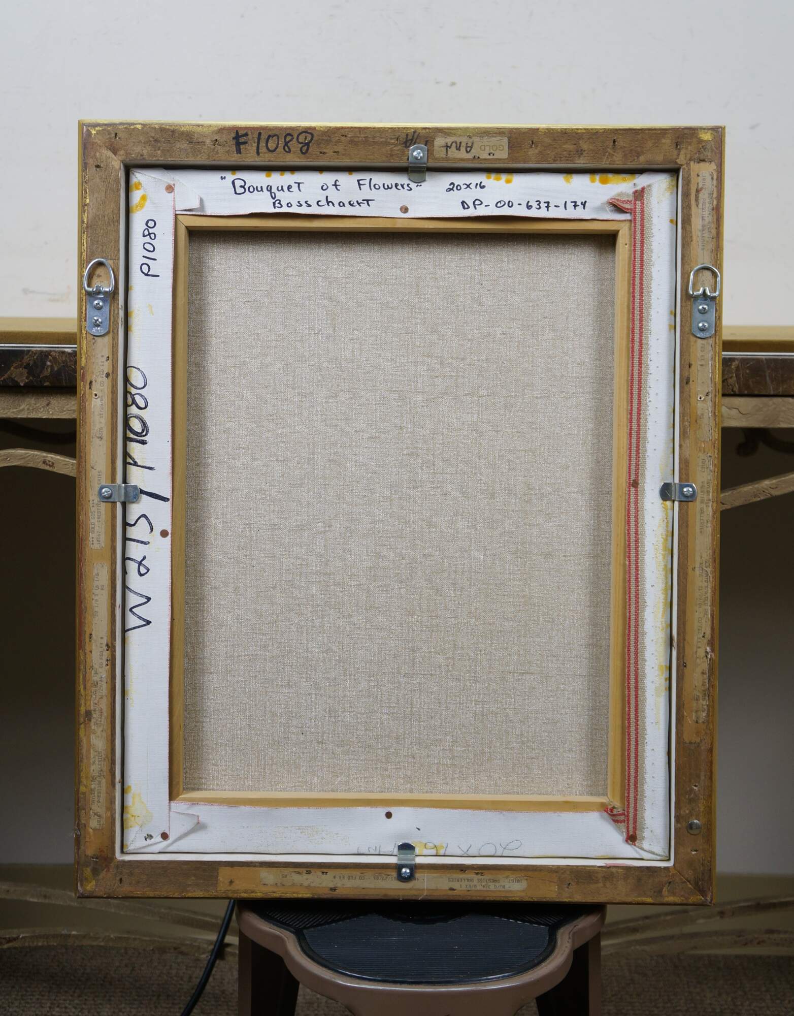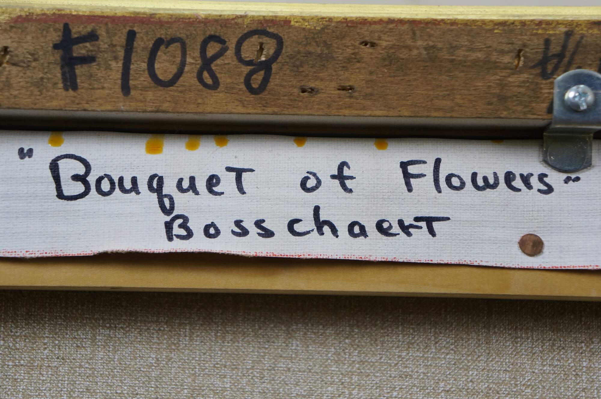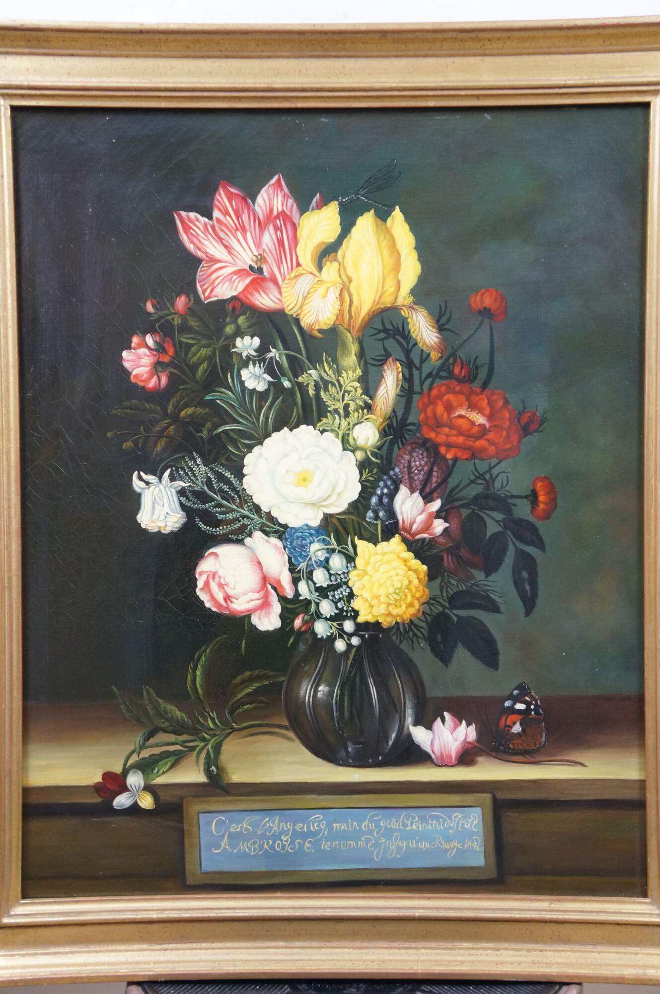Late 20th Century oil on canvas painting after "Bouquet of Flowers in a Glass Vase" by Ambrosius Bosschaert, originally painted in 1621. "Here, two spectacular blossoms, a yellow iris and a red-and-white striped tulip, surmount a bouquet composed of numerous species, among them roses, a blue-and-white columbine, fritillaria, grape hyacinth, lily of the valley, and a sprig of rosemary. A damselfly alighting on the iris and a butterfly on the cyclamen blossom that rests on the wooden tabletop further enliven the composition." (National Gallery of Art) Beveled gilt wood & gesso frame.