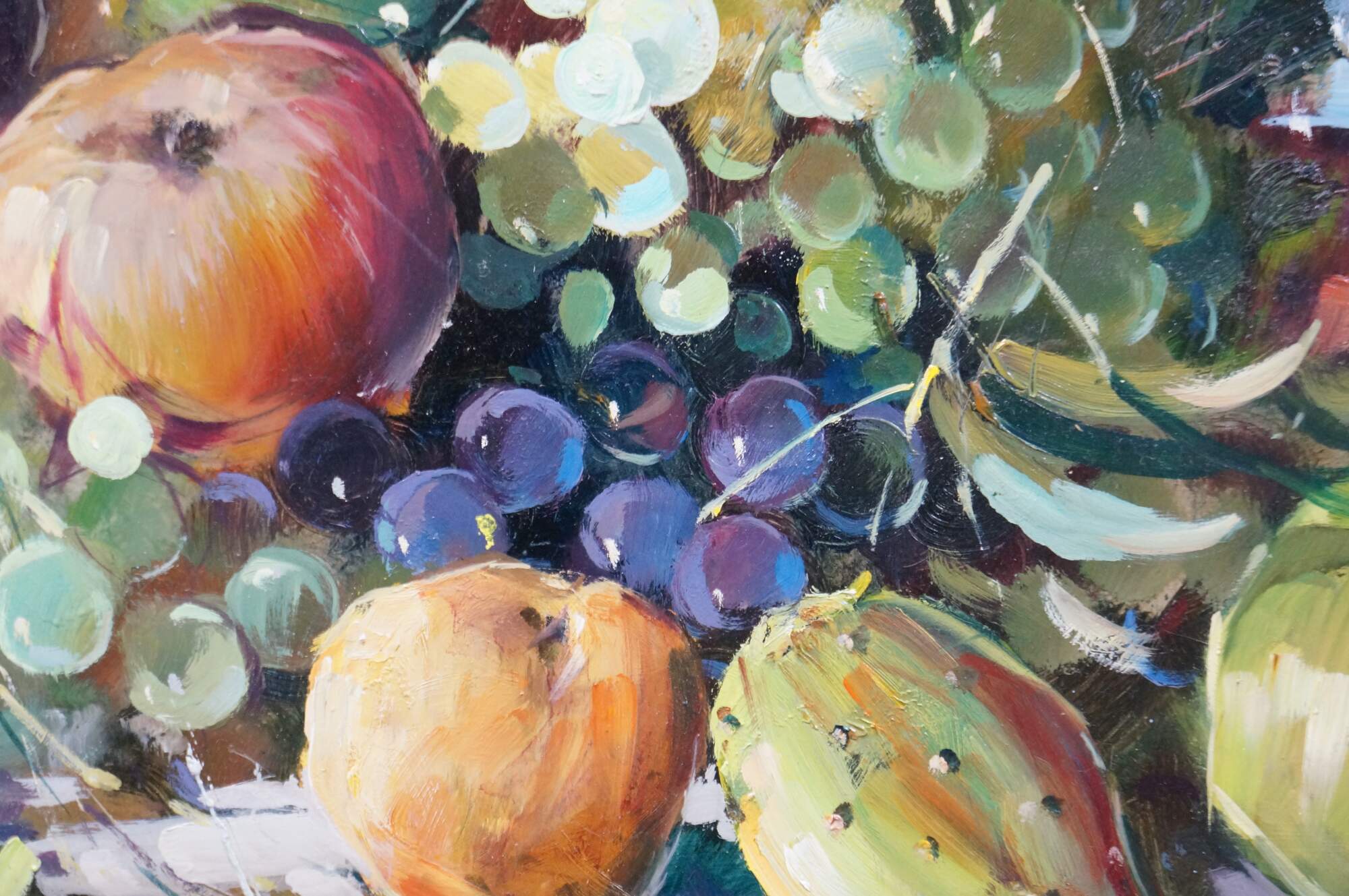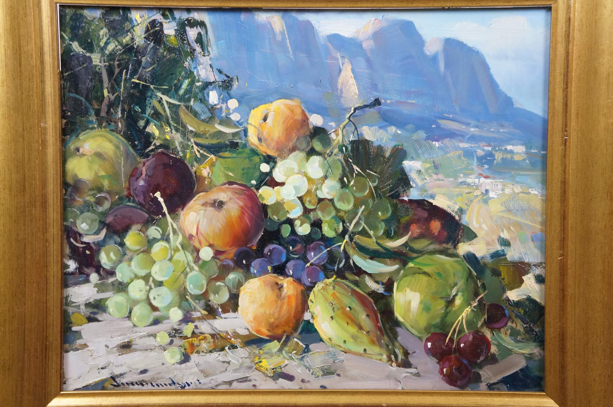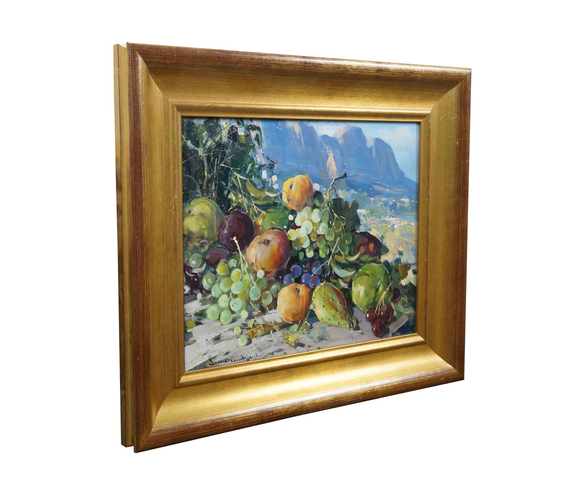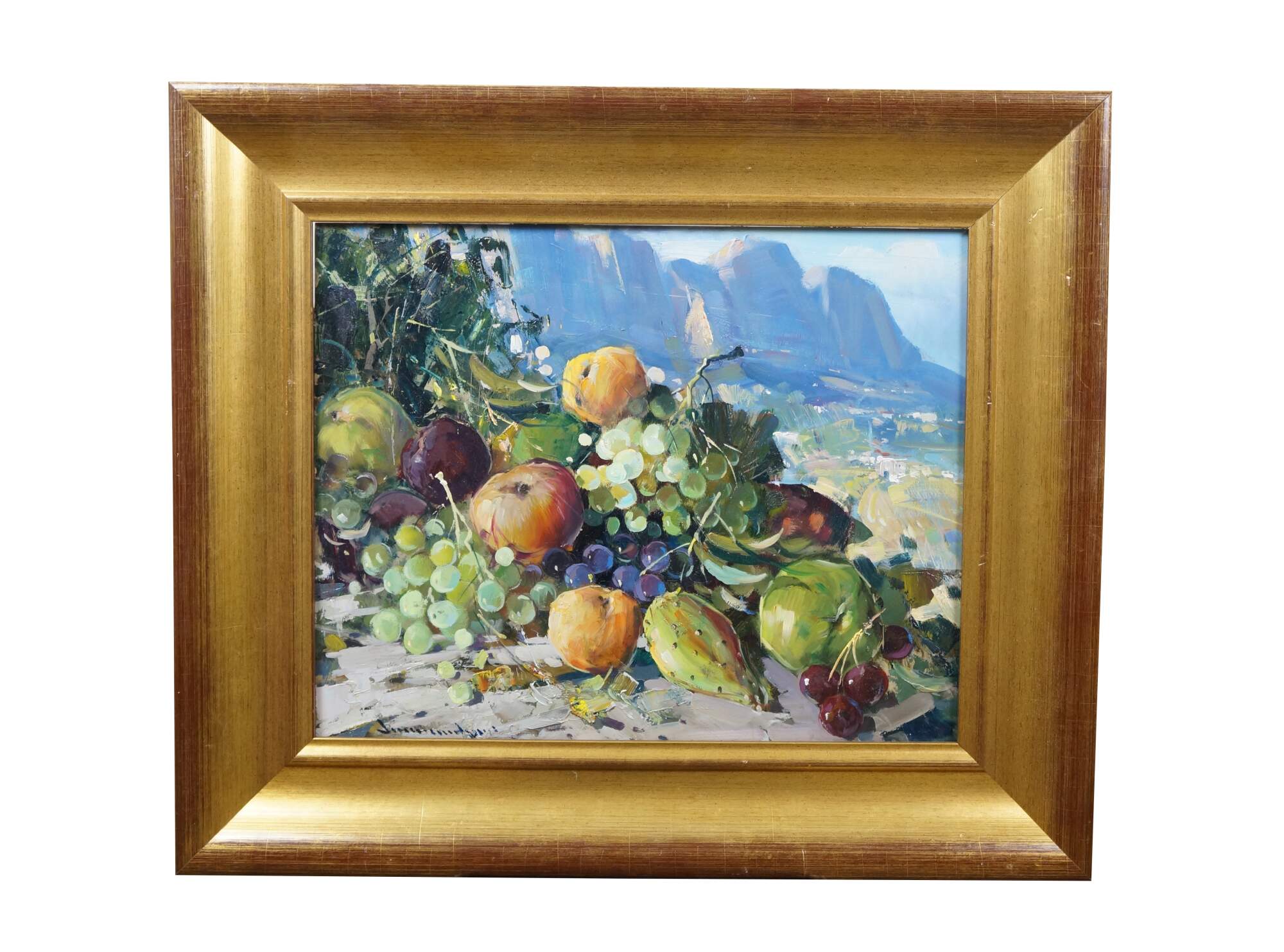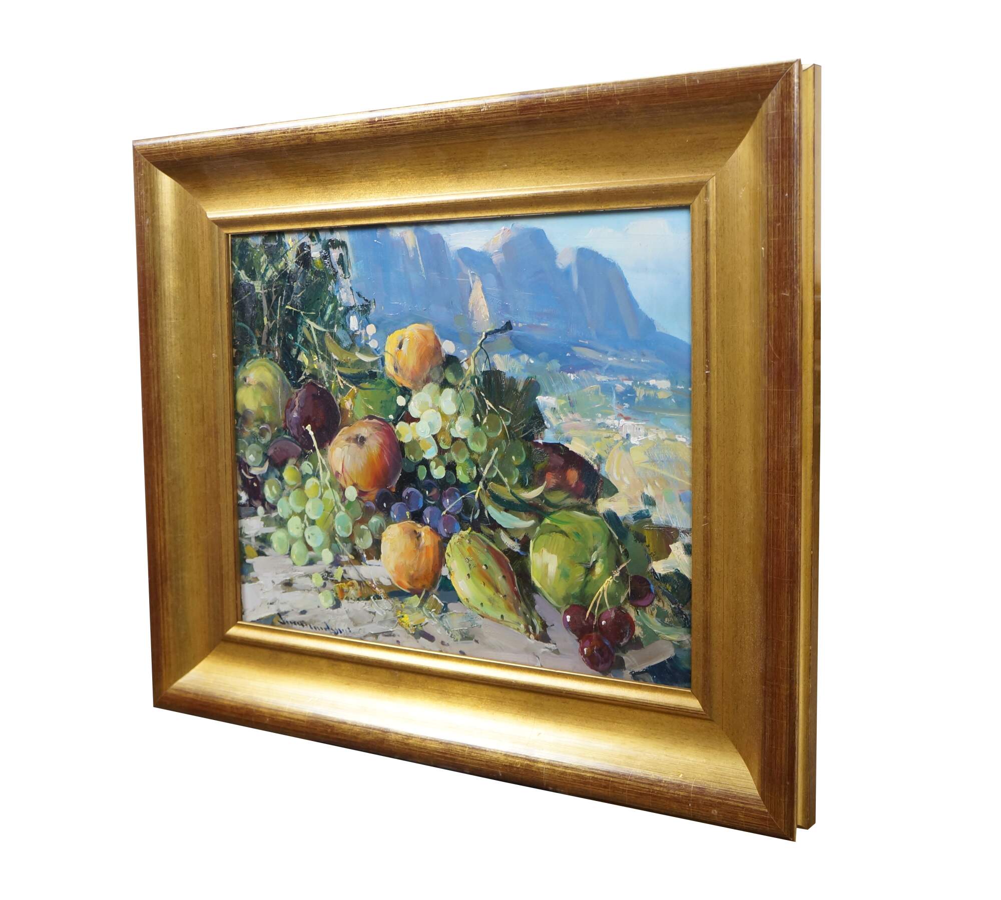 Late 20th century oil on board painting titled "Natura Morta (Still Life)" by Vincenzo Aprile. Shows a pile of ripe fruit in the foreground of an Italian mountain landscape. Signed, lower edge; titled and signed on reverse. Certificate of Authticity afixed to reverse. Beveled gilt wood & gesso frame.