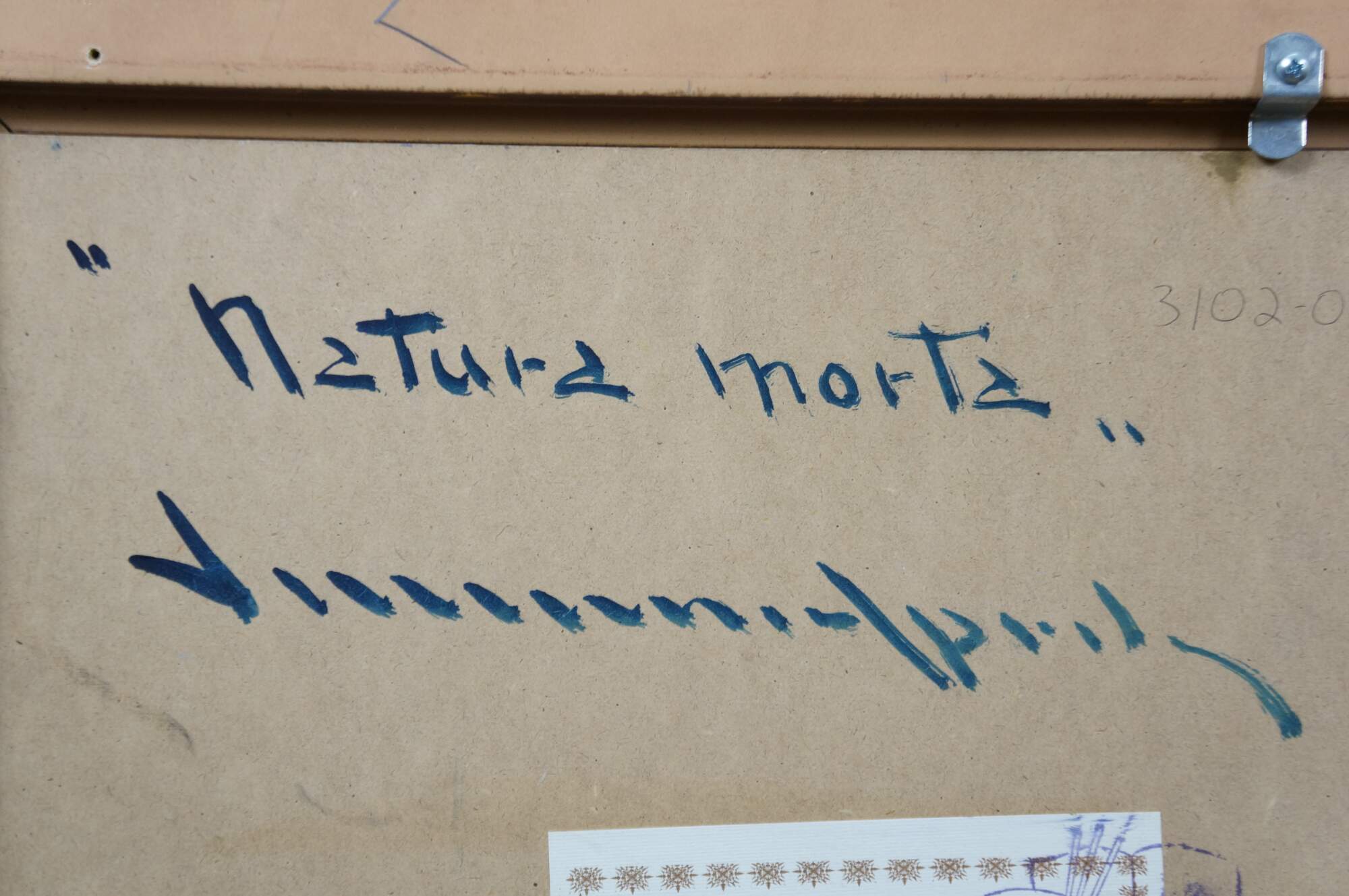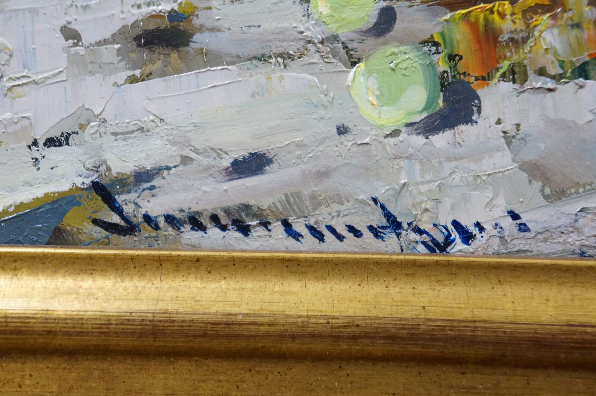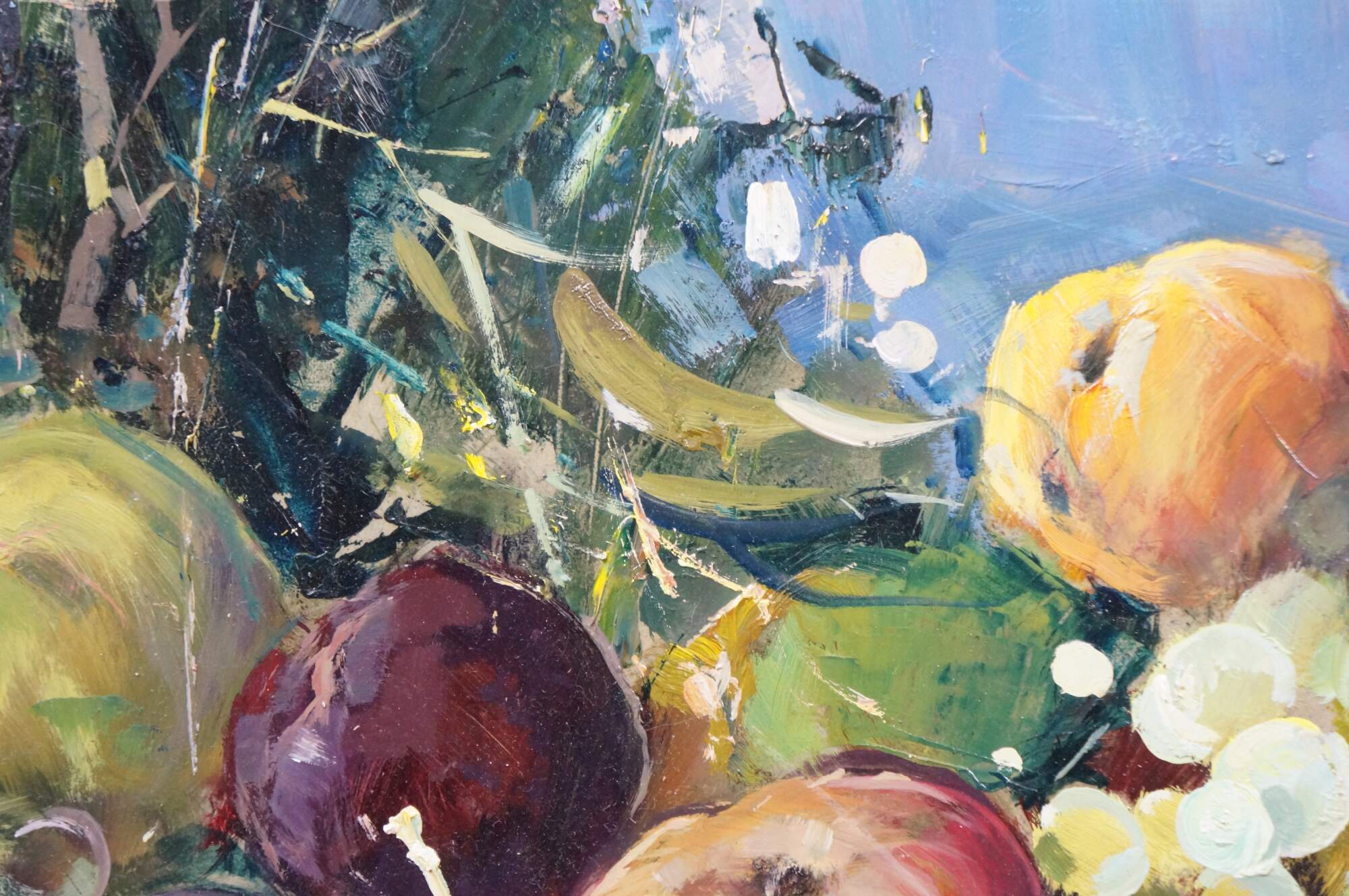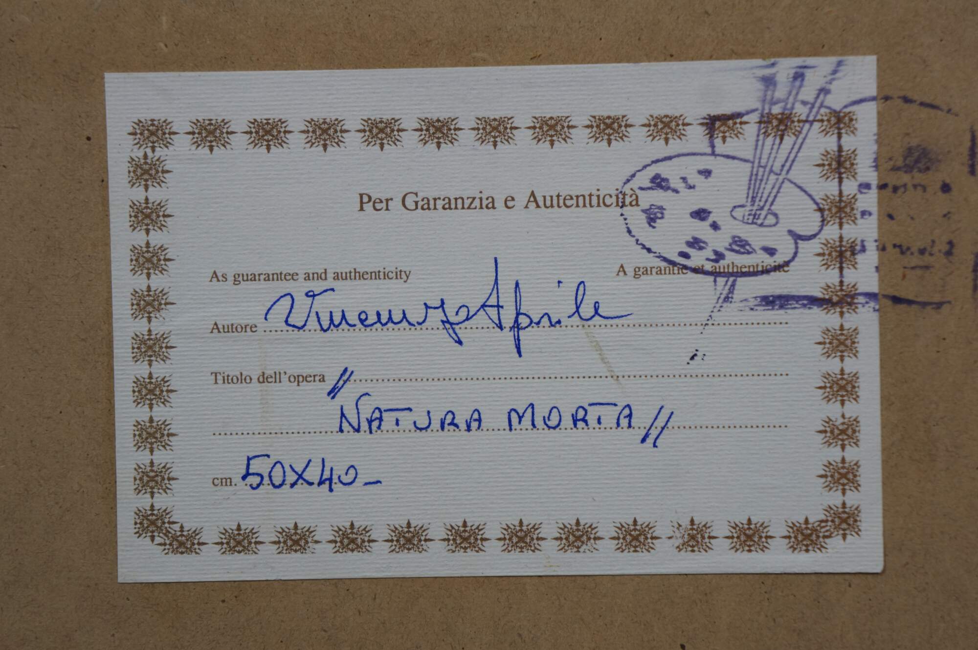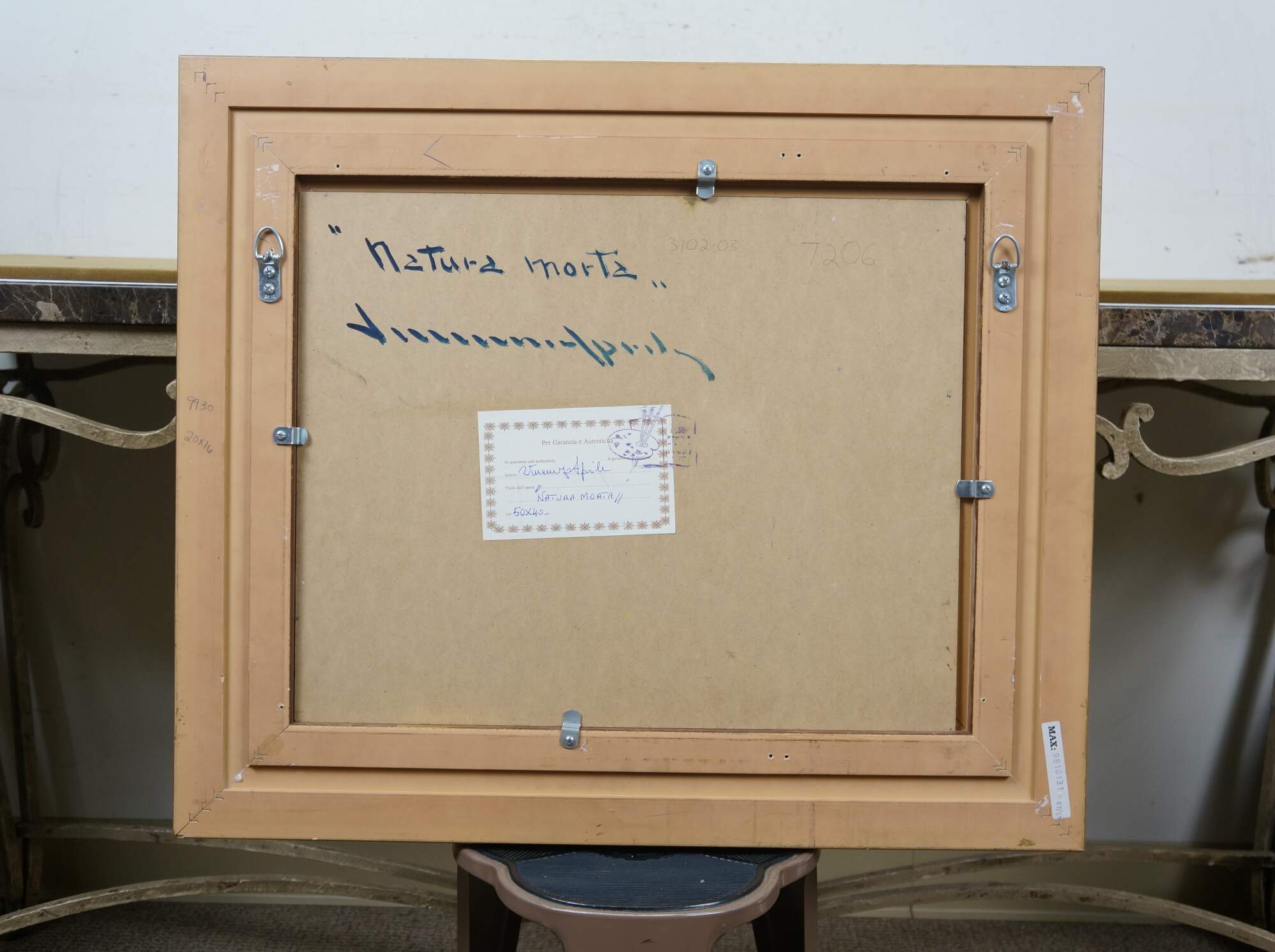 Late 20th century oil on board painting titled "Natura Morta (Still Life)" by Vincenzo Aprile. Shows a pile of ripe fruit in the foreground of an Italian mountain landscape. Signed, lower edge; titled and signed on reverse. Certificate of Authticity afixed to reverse. Beveled gilt wood & gesso frame.
