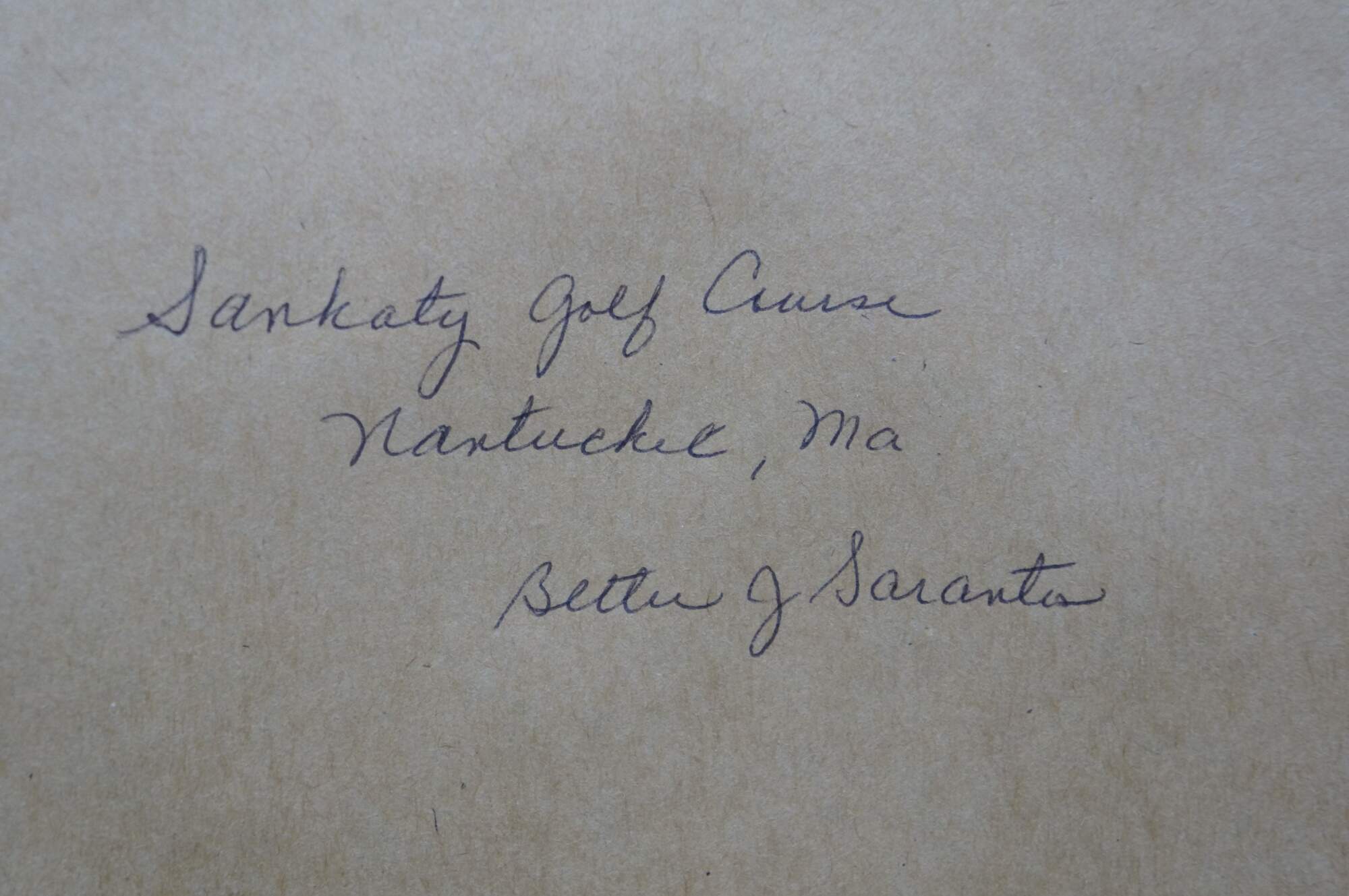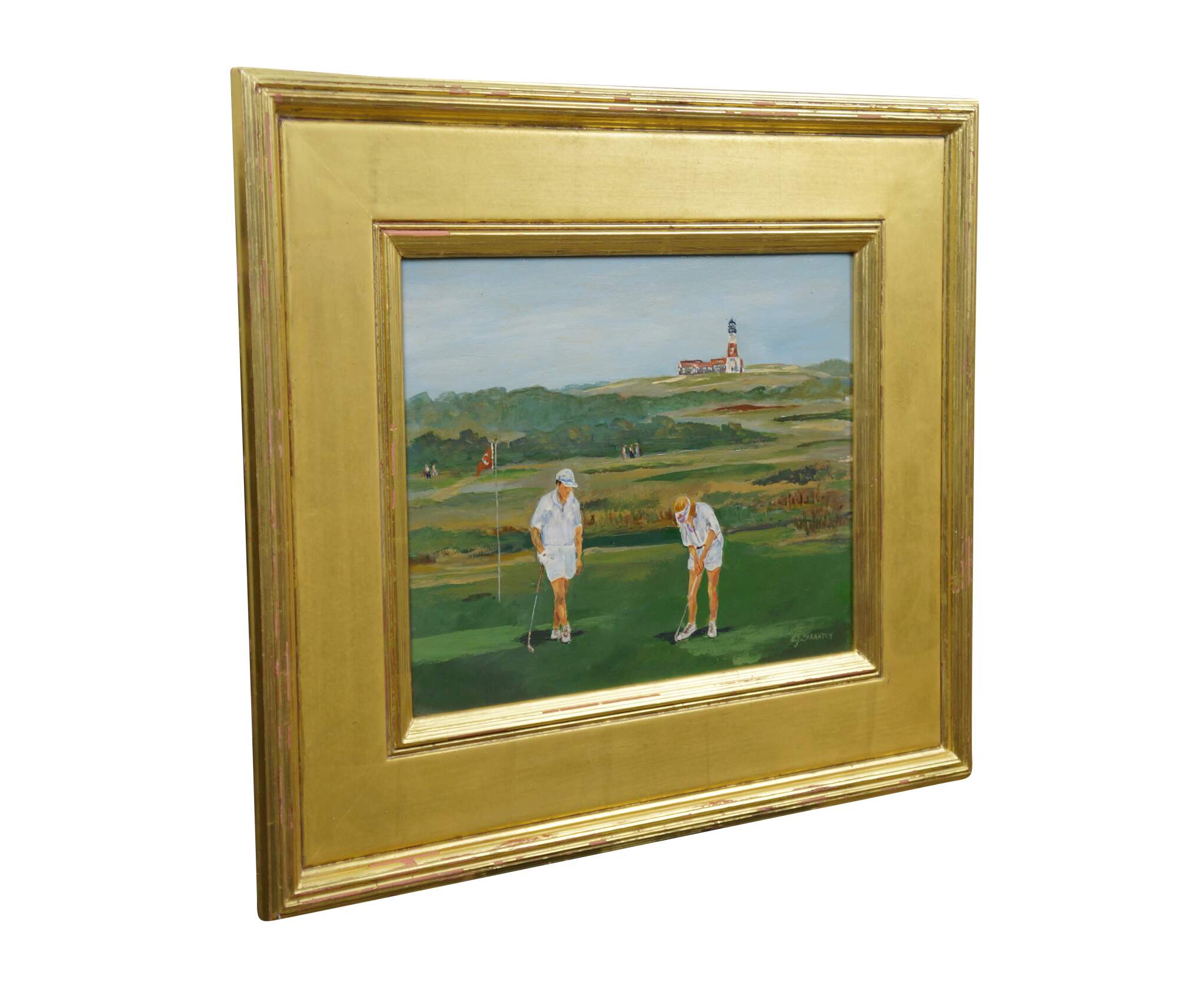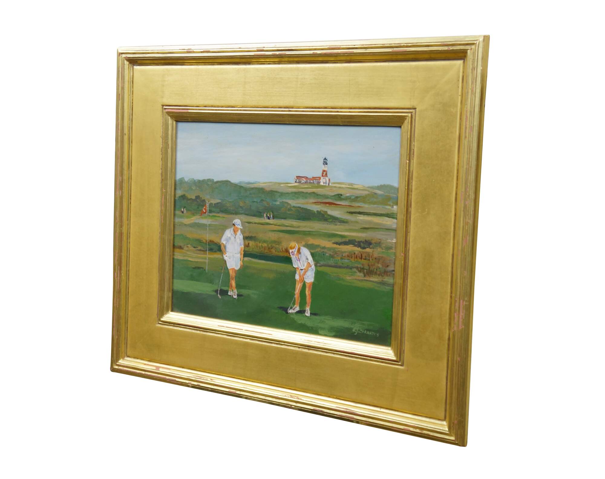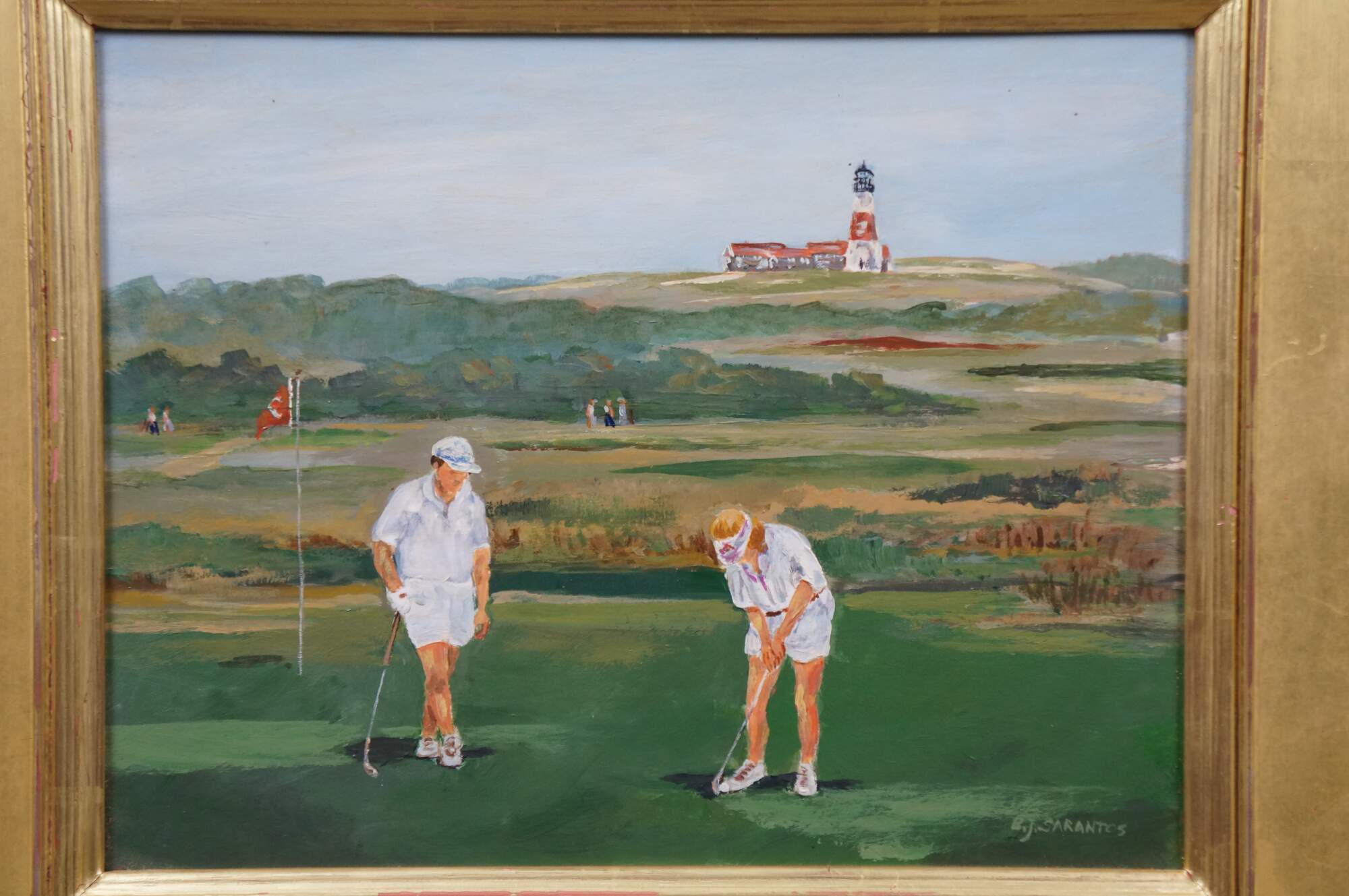 Late 20th century oil on board painting titled "Sankaty Golf Course Nantucket, MA" by Bettie J. Sarantos. Landscape from a putting green with two figures in white, with a view of a distant lighthouse. Signed, lower right. Beveled giltwood frame.