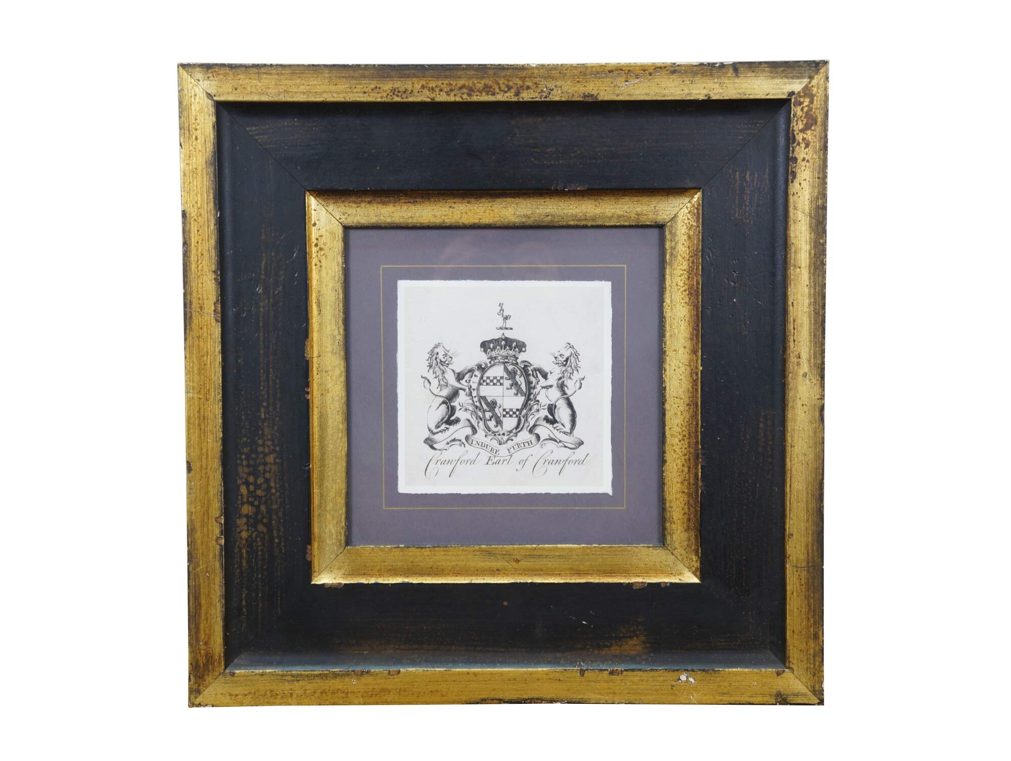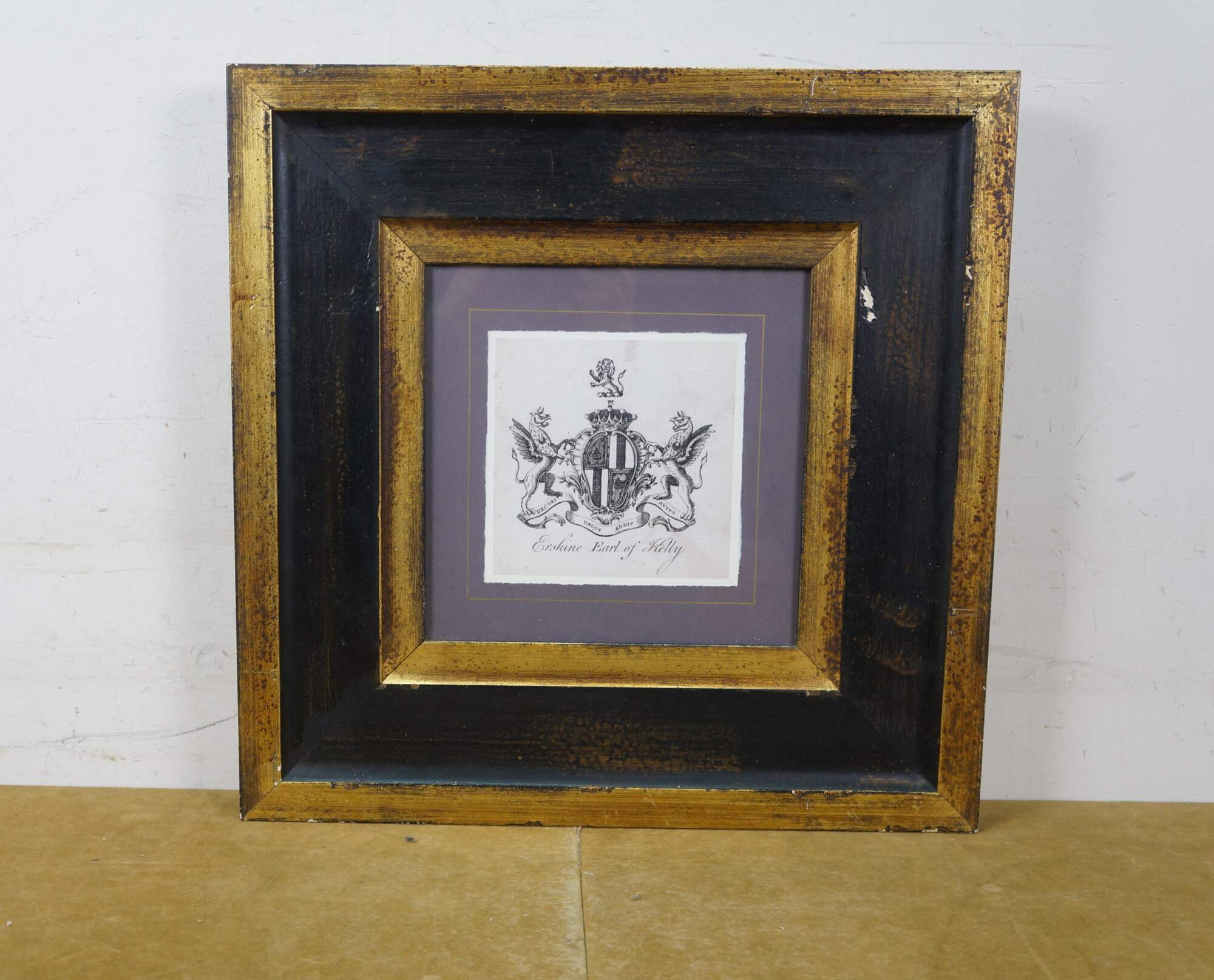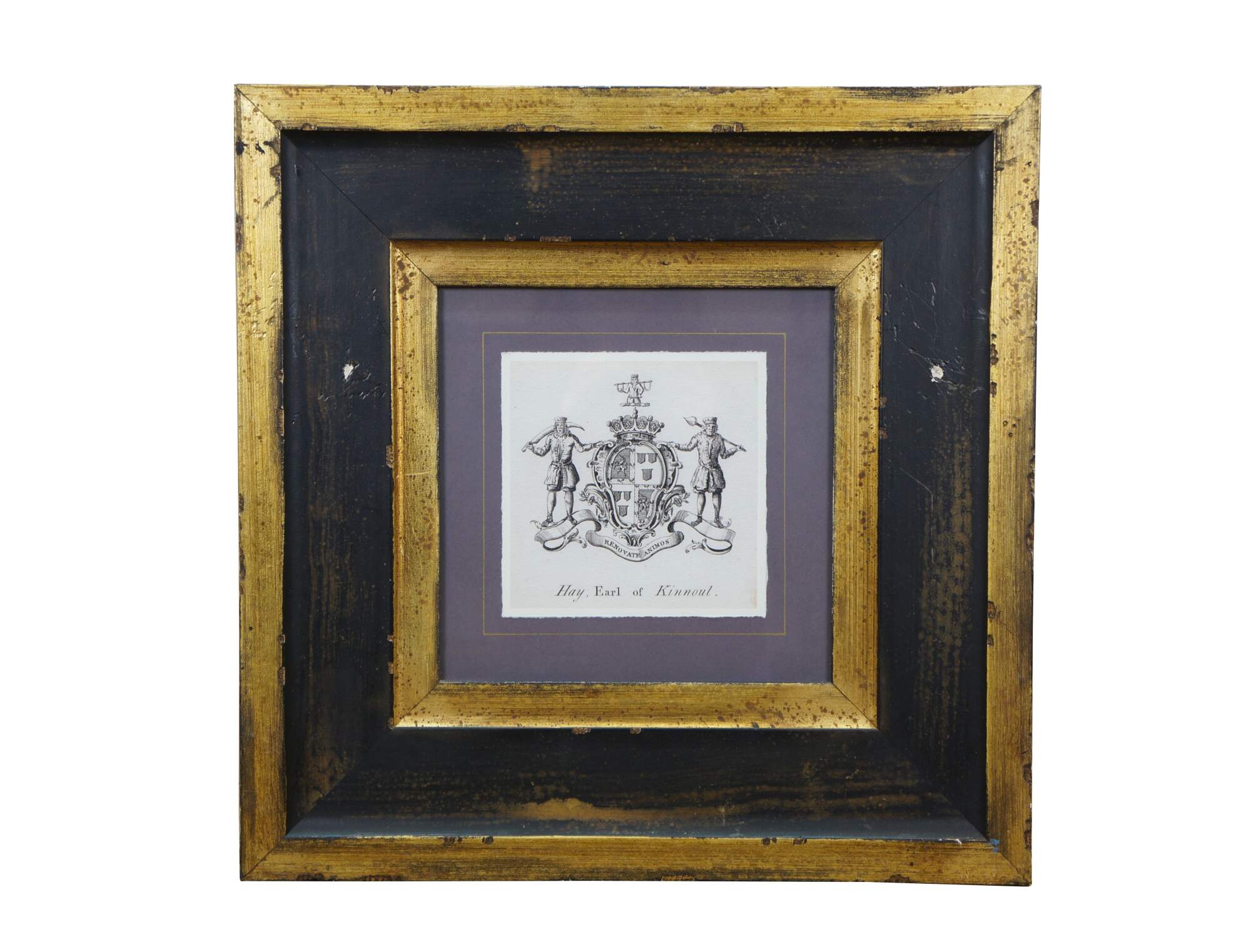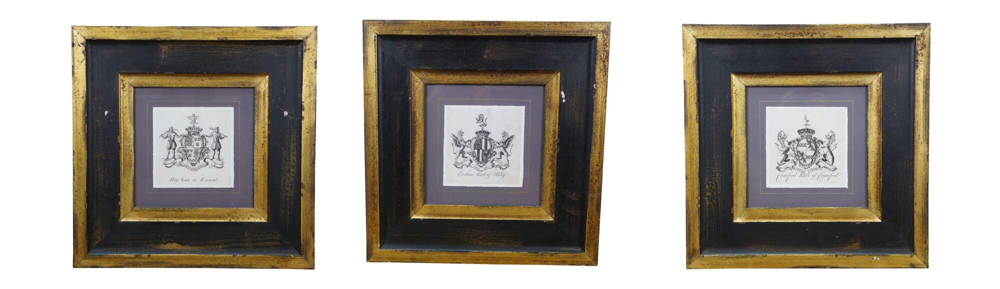 Set of three black and white prints on paper of the heraldic coats of arms of Erskine Earl of Kelly, Cranford Earl of Cranford, and Hay Earl of Kinnoul. Black and gold wood and gesso frame; purple mat. Framed by Soicher Marin for Due Process Stable Trading Company.
