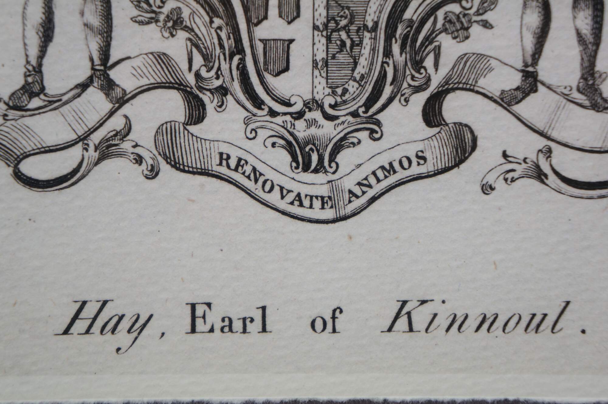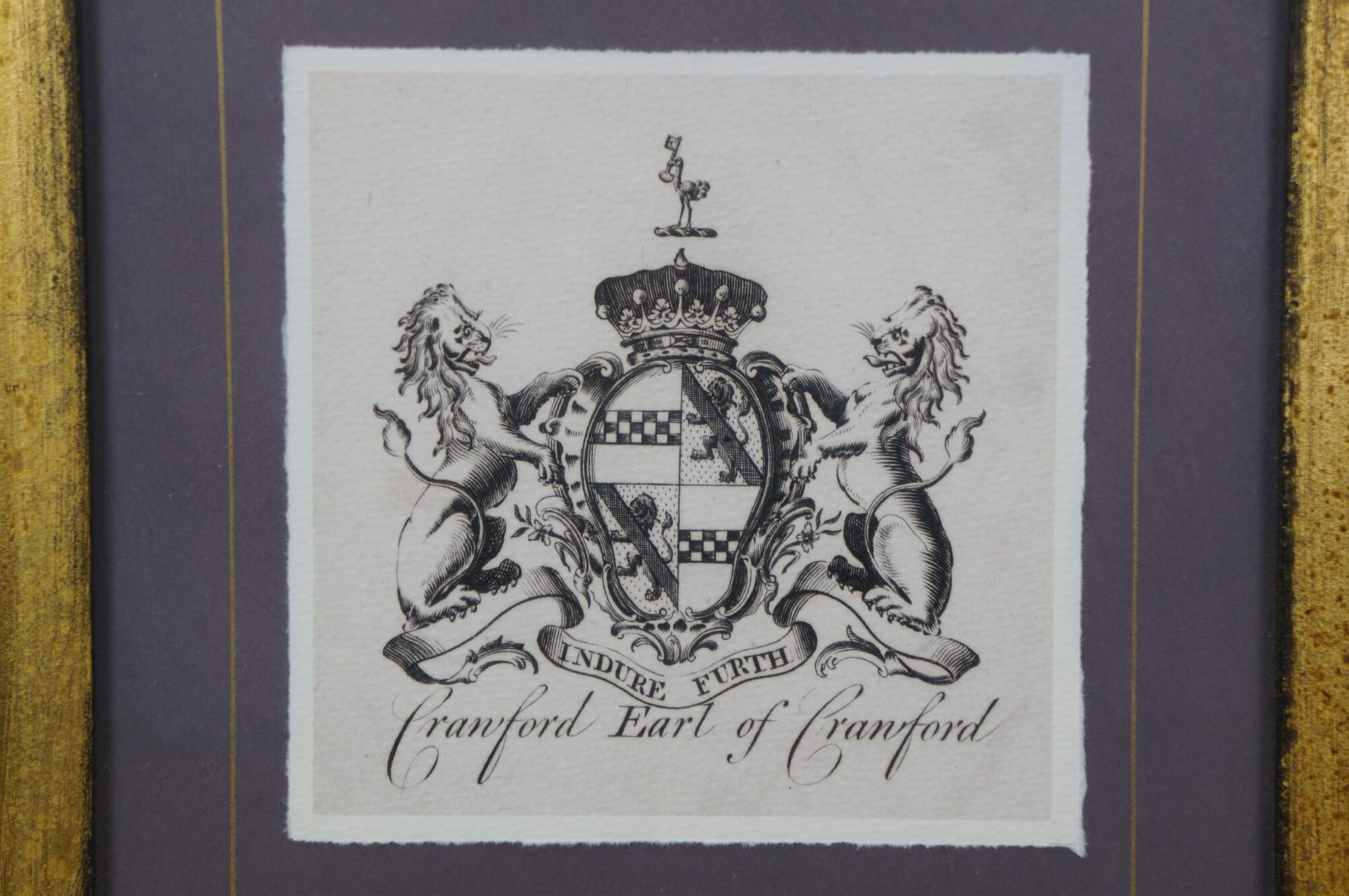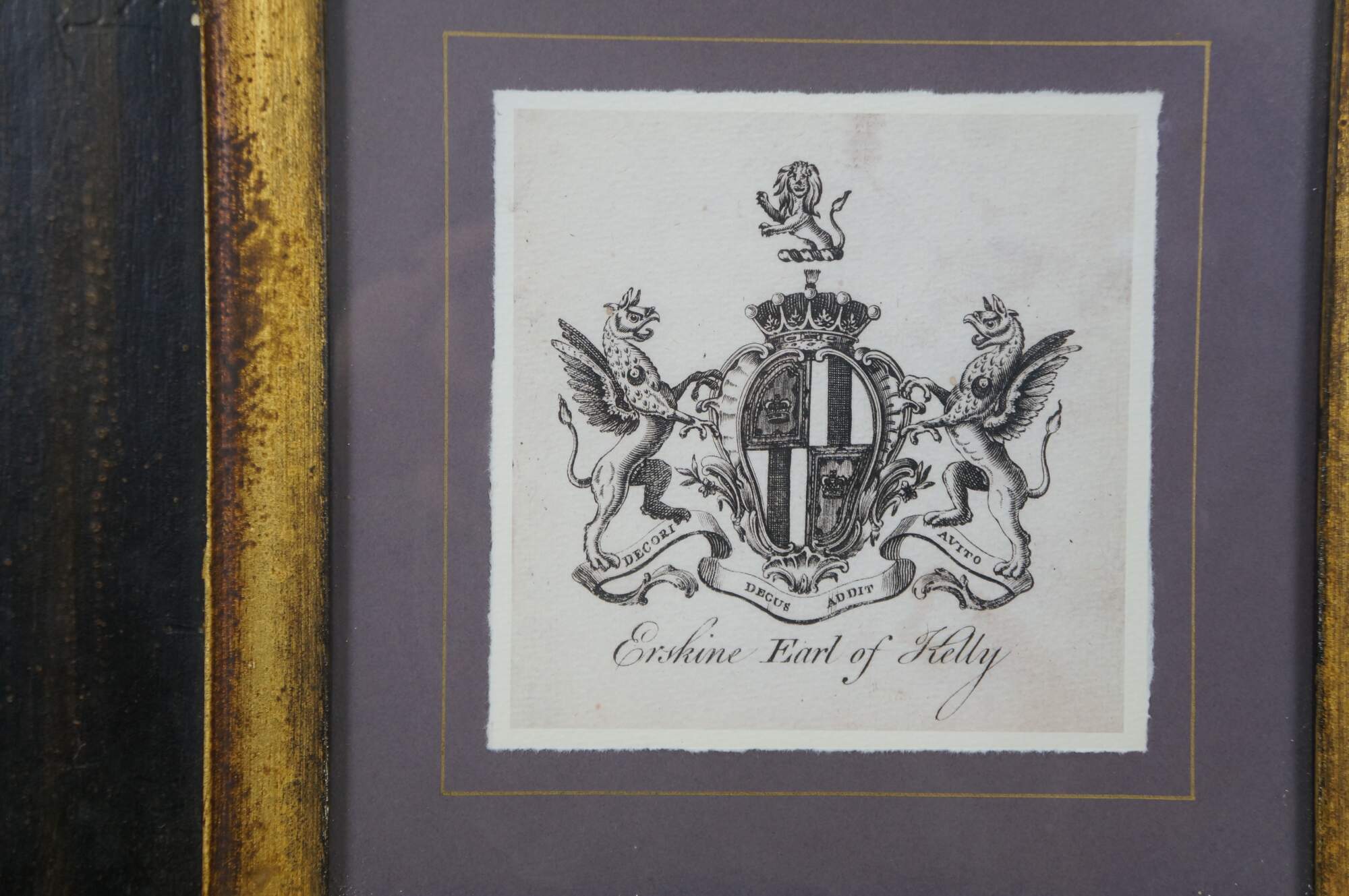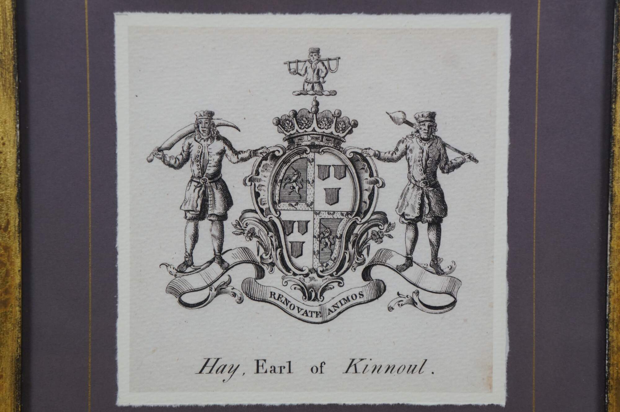 Set of three black and white prints on paper of the heraldic coats of arms of Erskine Earl of Kelly, Cranford Earl of Cranford, and Hay Earl of Kinnoul. Black and gold wood and gesso frame; purple mat. Framed by Soicher Marin for Due Process Stable Trading Company.