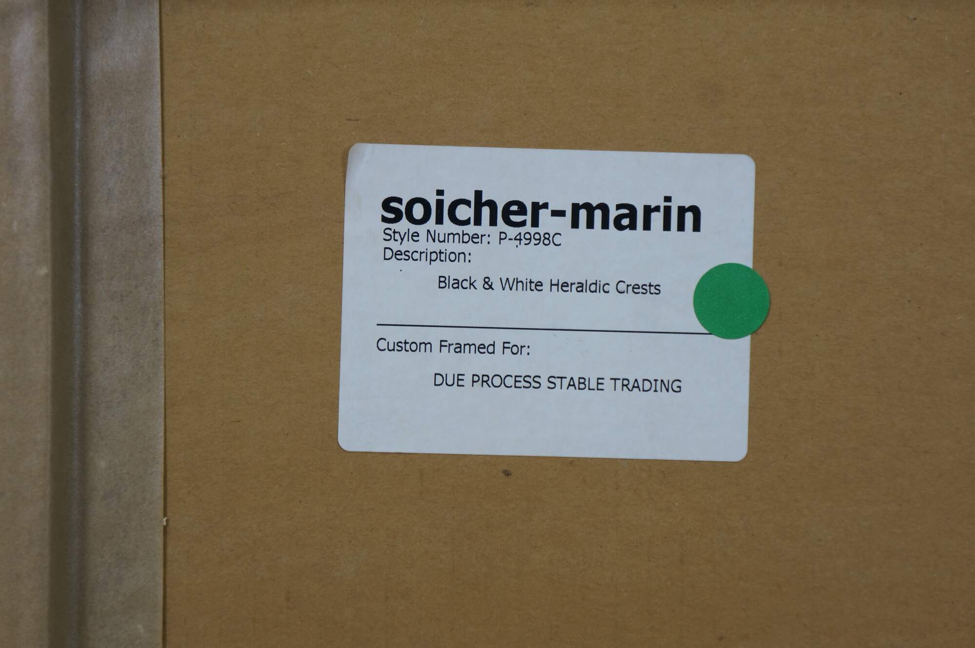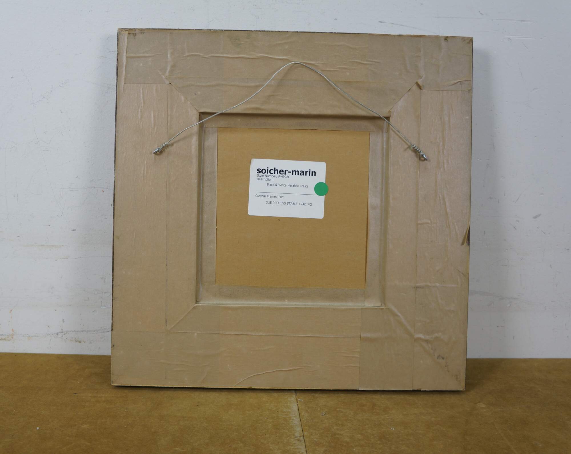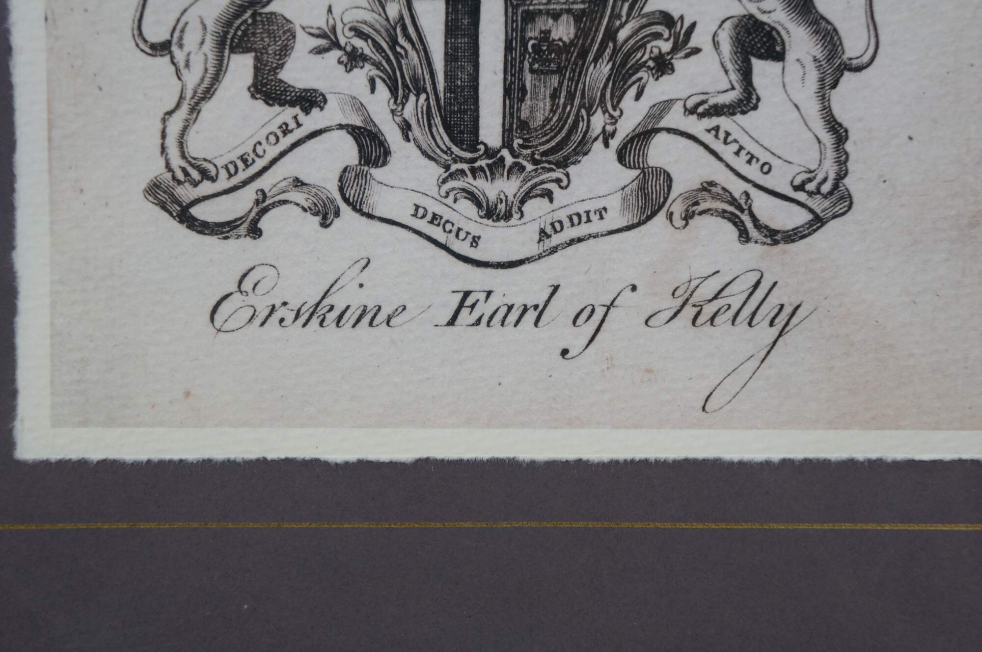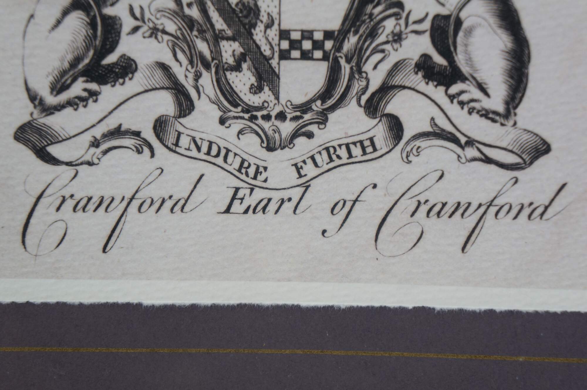 Set of three black and white prints on paper of the heraldic coats of arms of Erskine Earl of Kelly, Cranford Earl of Cranford, and Hay Earl of Kinnoul. Black and gold wood and gesso frame; purple mat. Framed by Soicher Marin for Due Process Stable Trading Company.