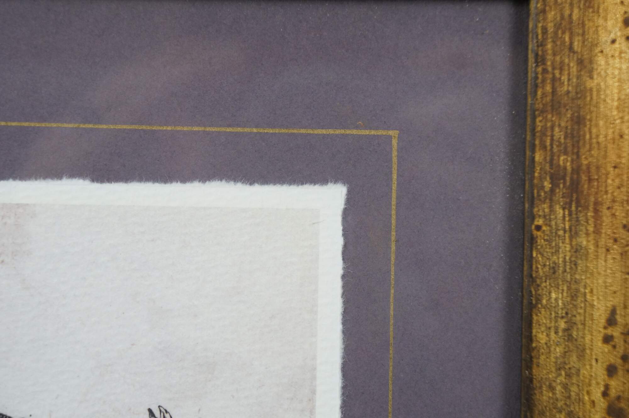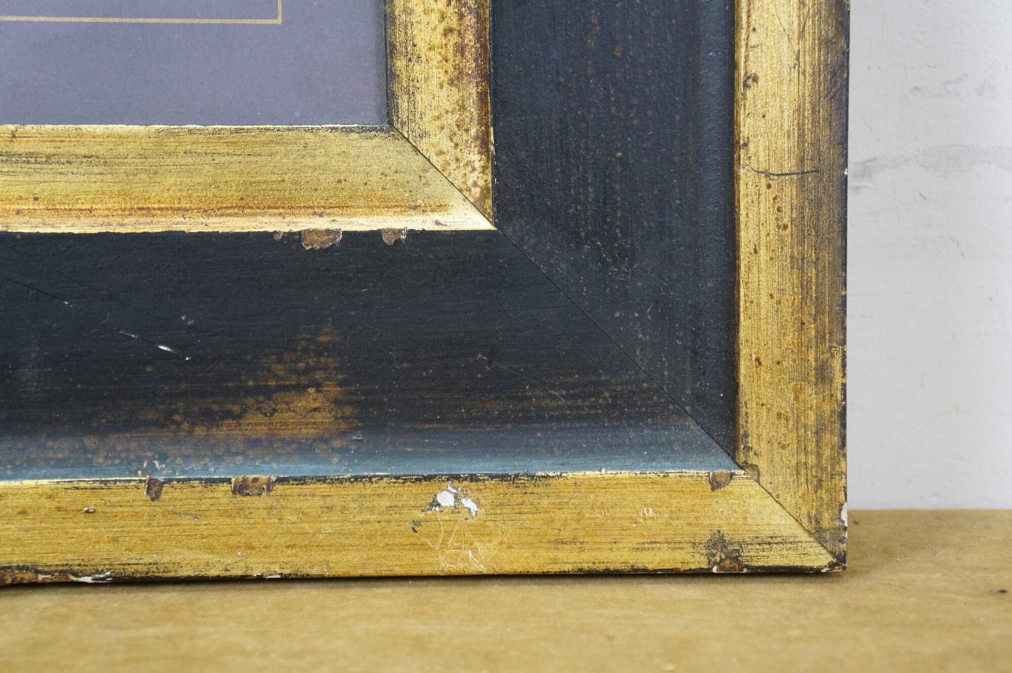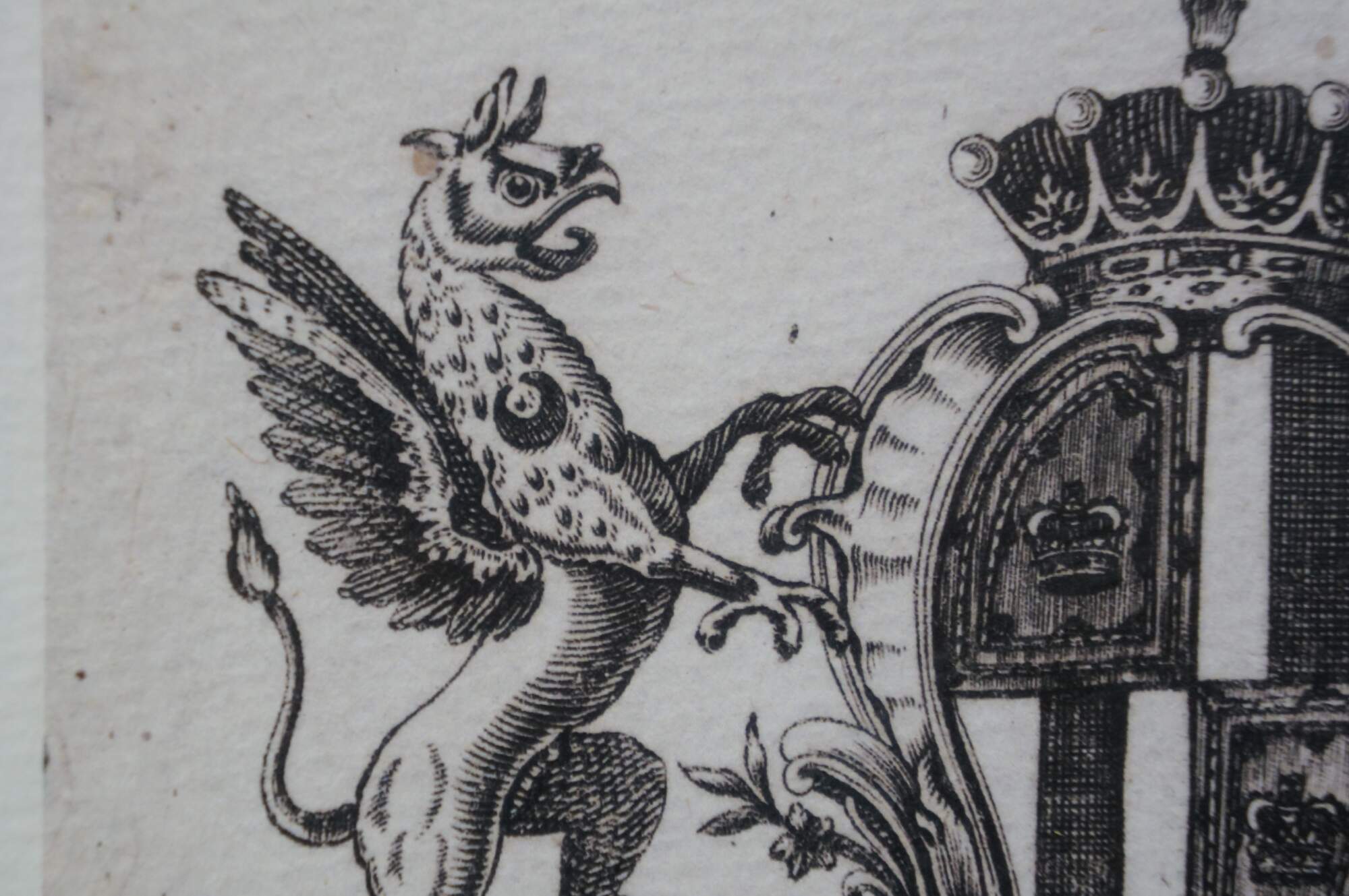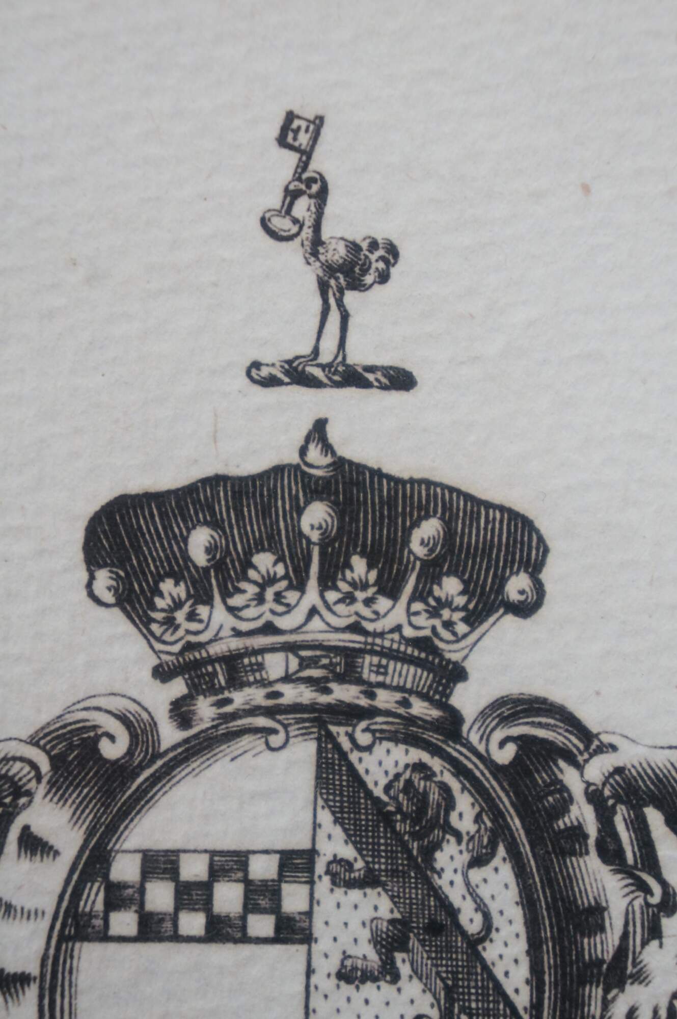 Set of three black and white prints on paper of the heraldic coats of arms of Erskine Earl of Kelly, Cranford Earl of Cranford, and Hay Earl of Kinnoul. Black and gold wood and gesso frame; purple mat. Framed by Soicher Marin for Due Process Stable Trading Company.