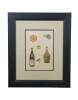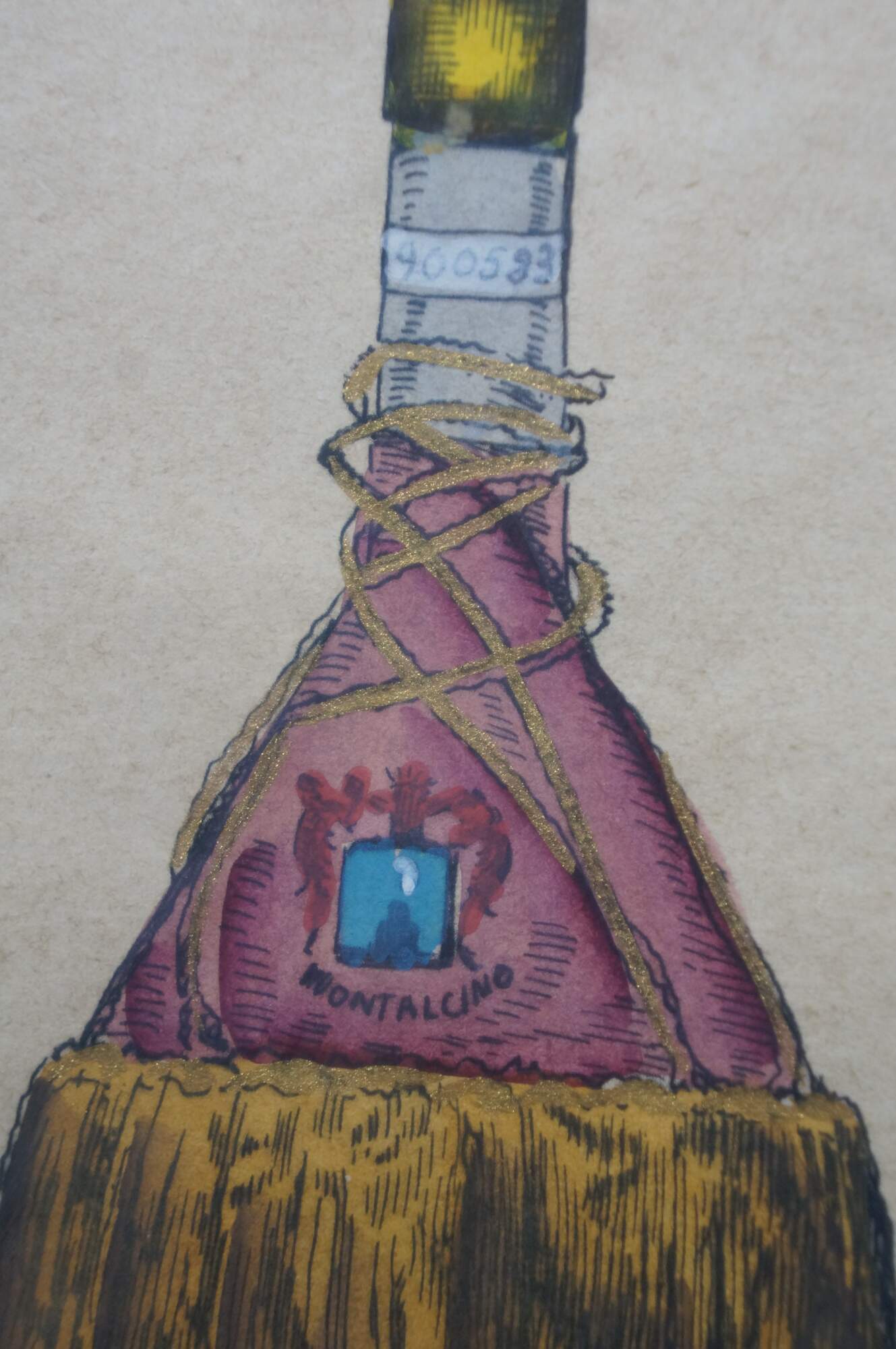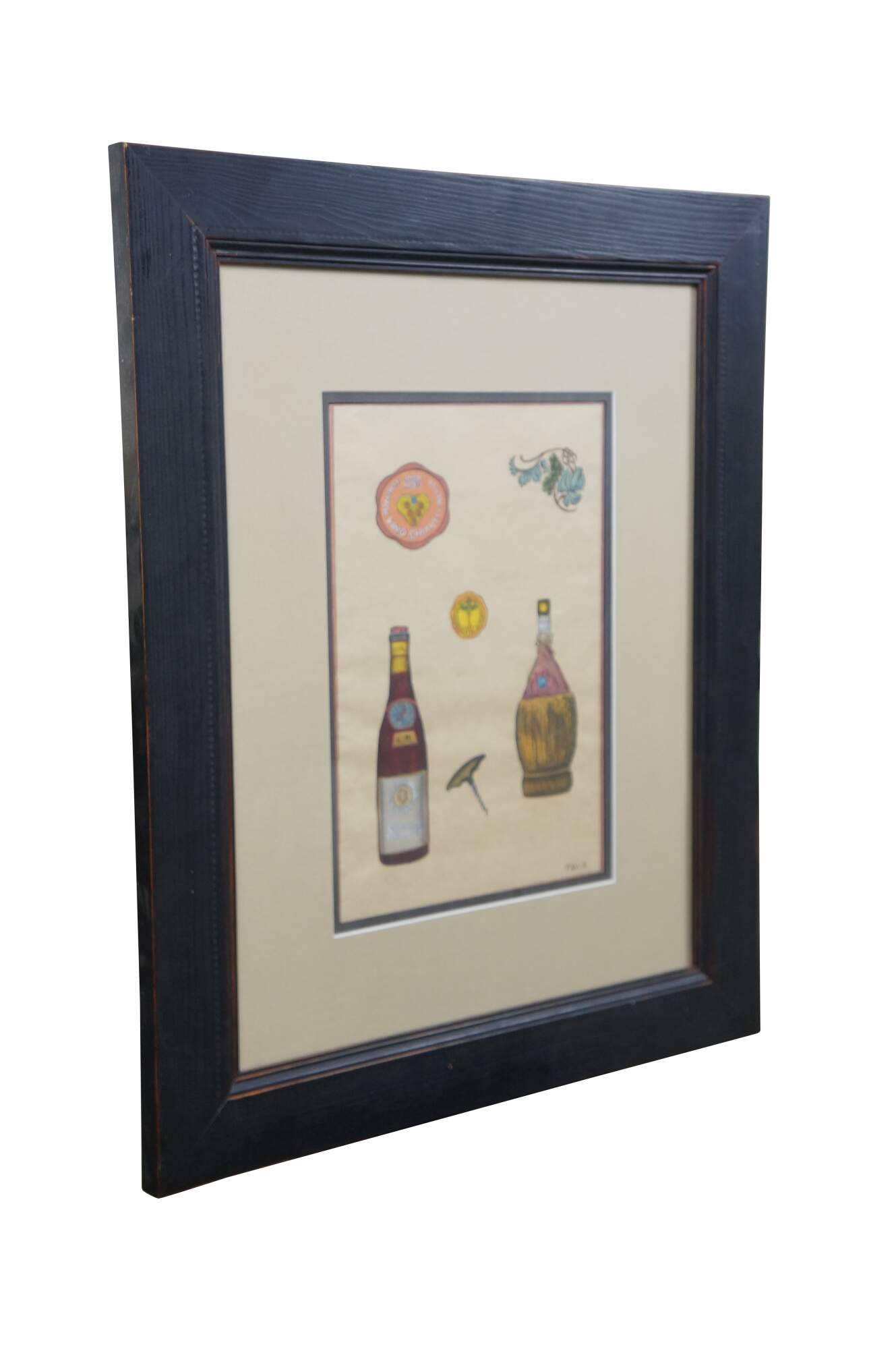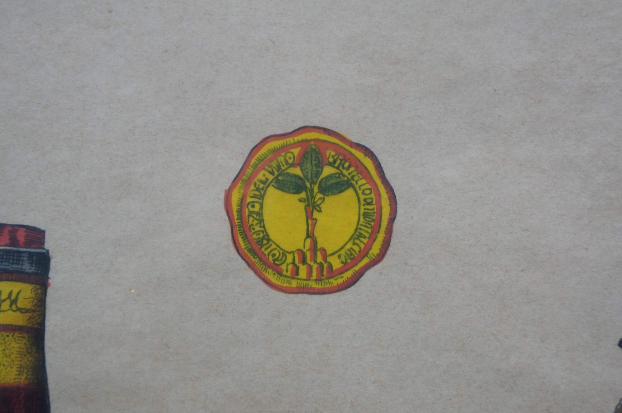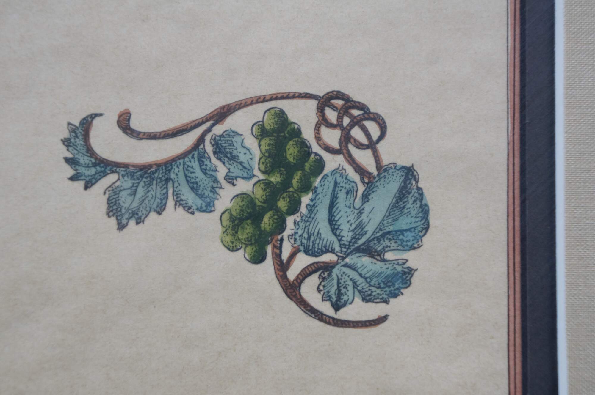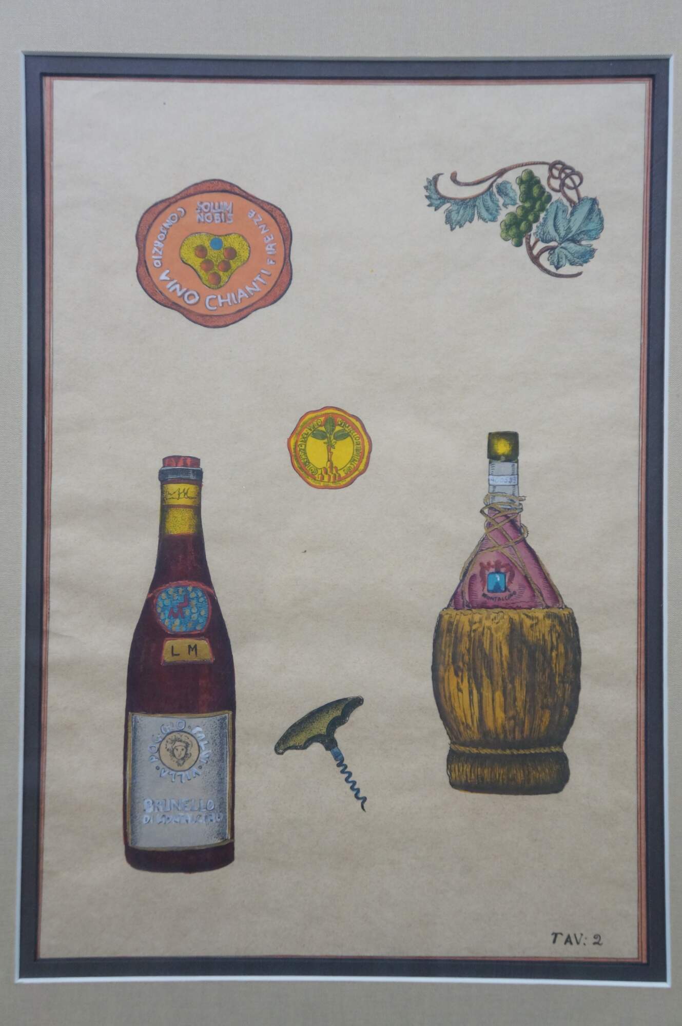 Early 21st century Italian hand colored print depicting an array of wine bottles, grapes / grapevines, corkscrew and labels. Black painted wood frame; black and beige linen layered mat. Brunello Di Montalcino, Chianti. Original engraving from 1900 created by Maestro Virgilio Naldini