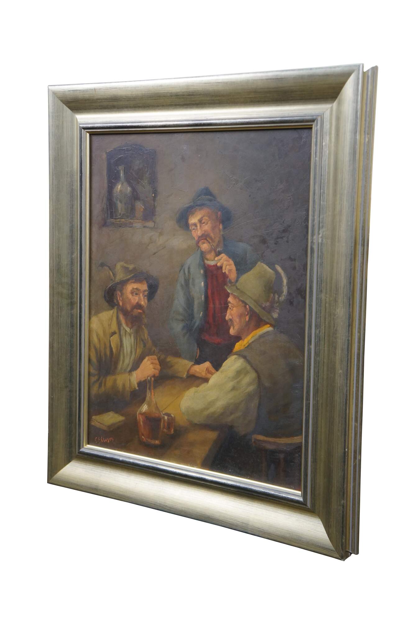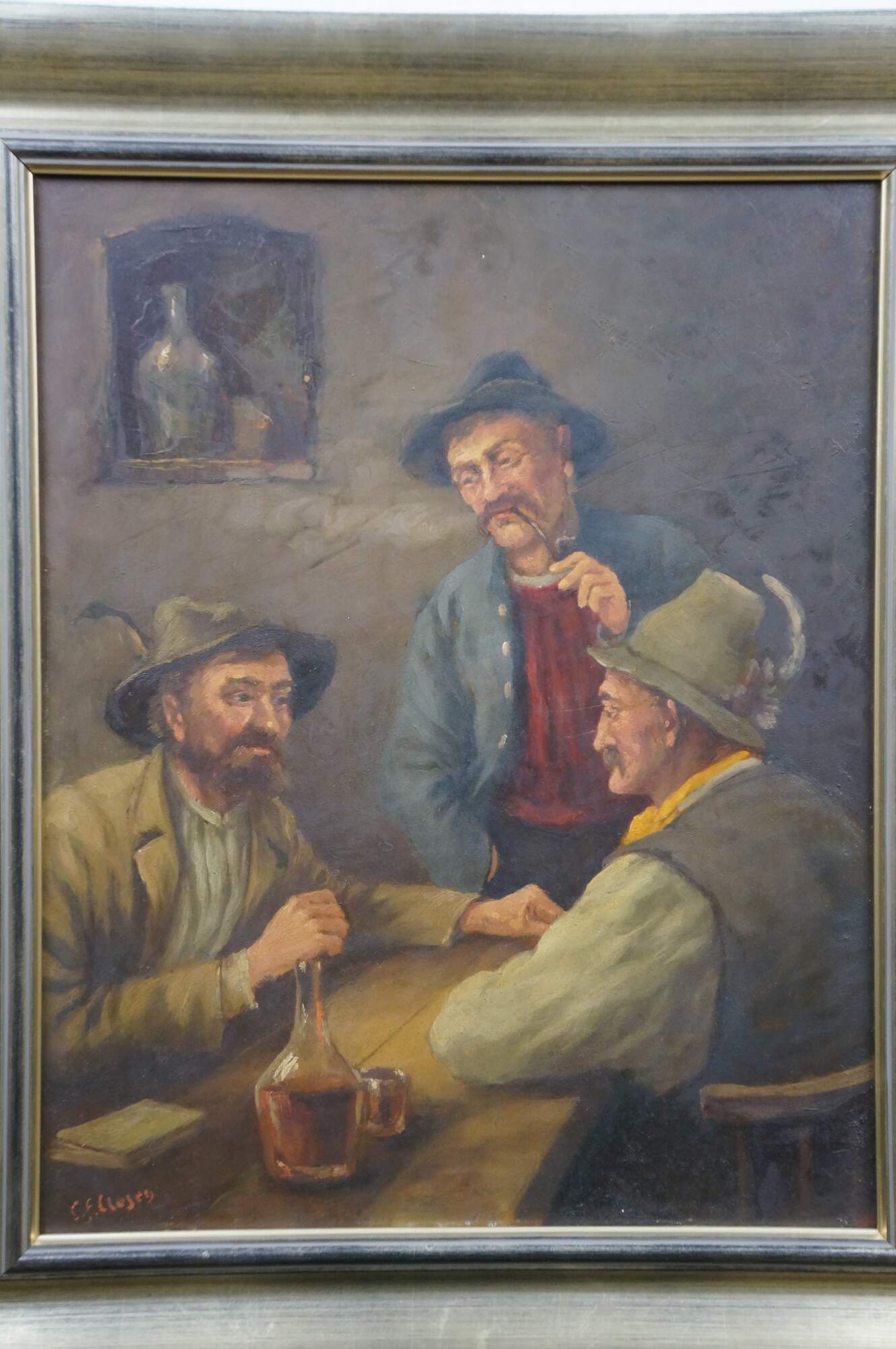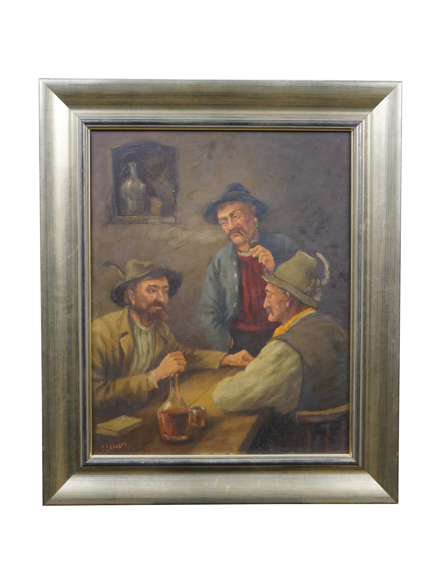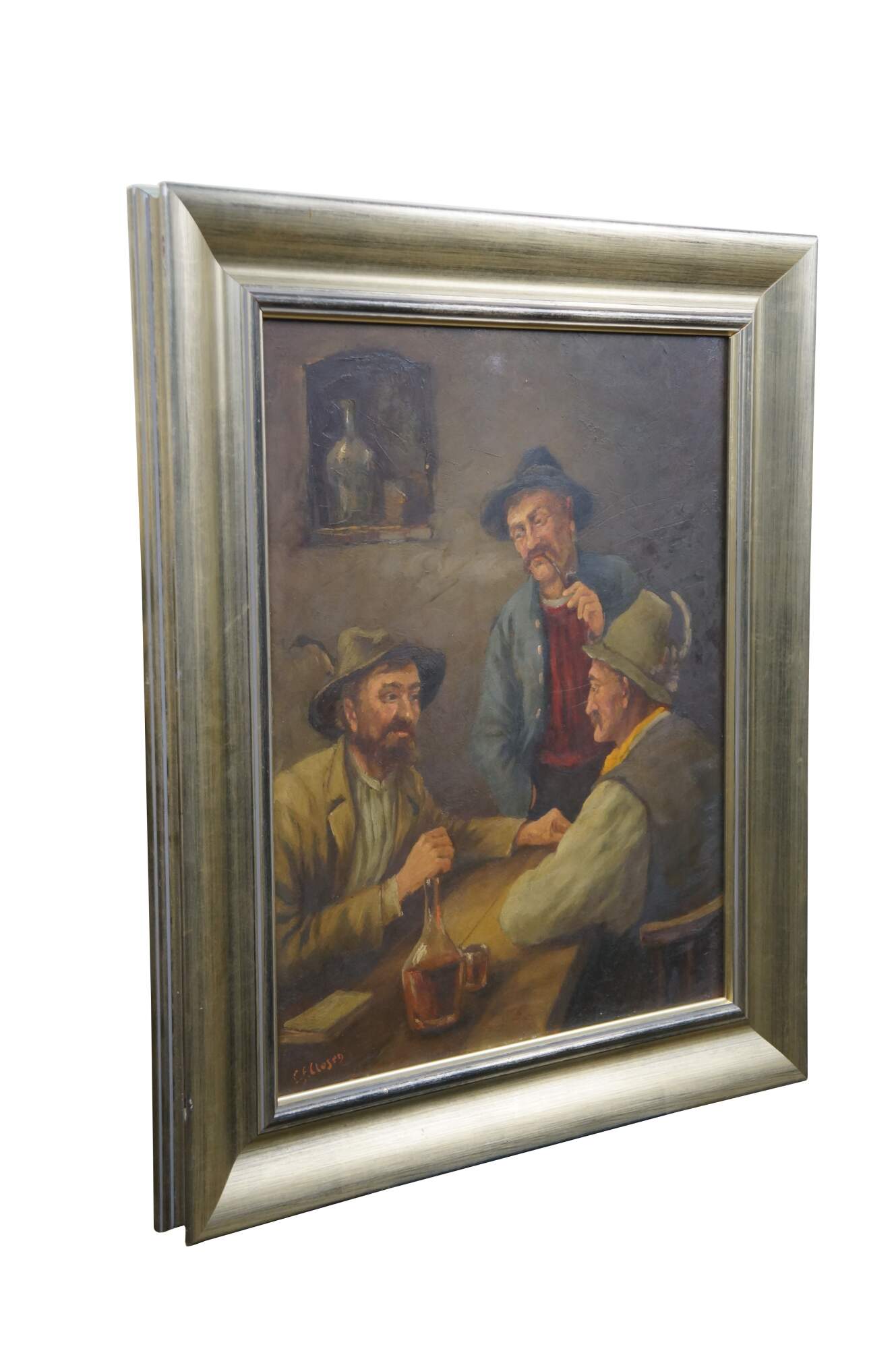 Antique oil on board painting depicting a trio of men in caps with feathers, seated at a rustic tavern table. Signed lower left. Attributed by previous seller as being by C.F. Close - 19th Century Ireland. . Beveled champagne gilt composite frame.