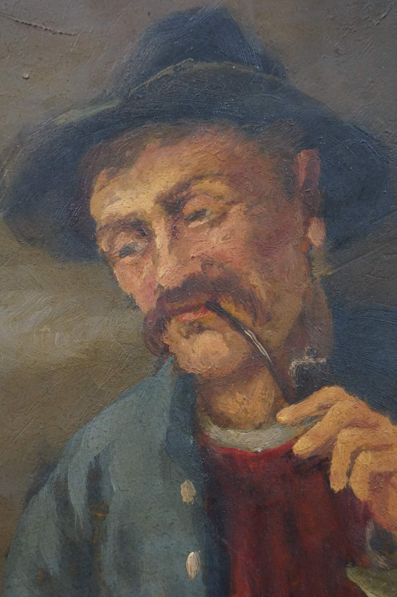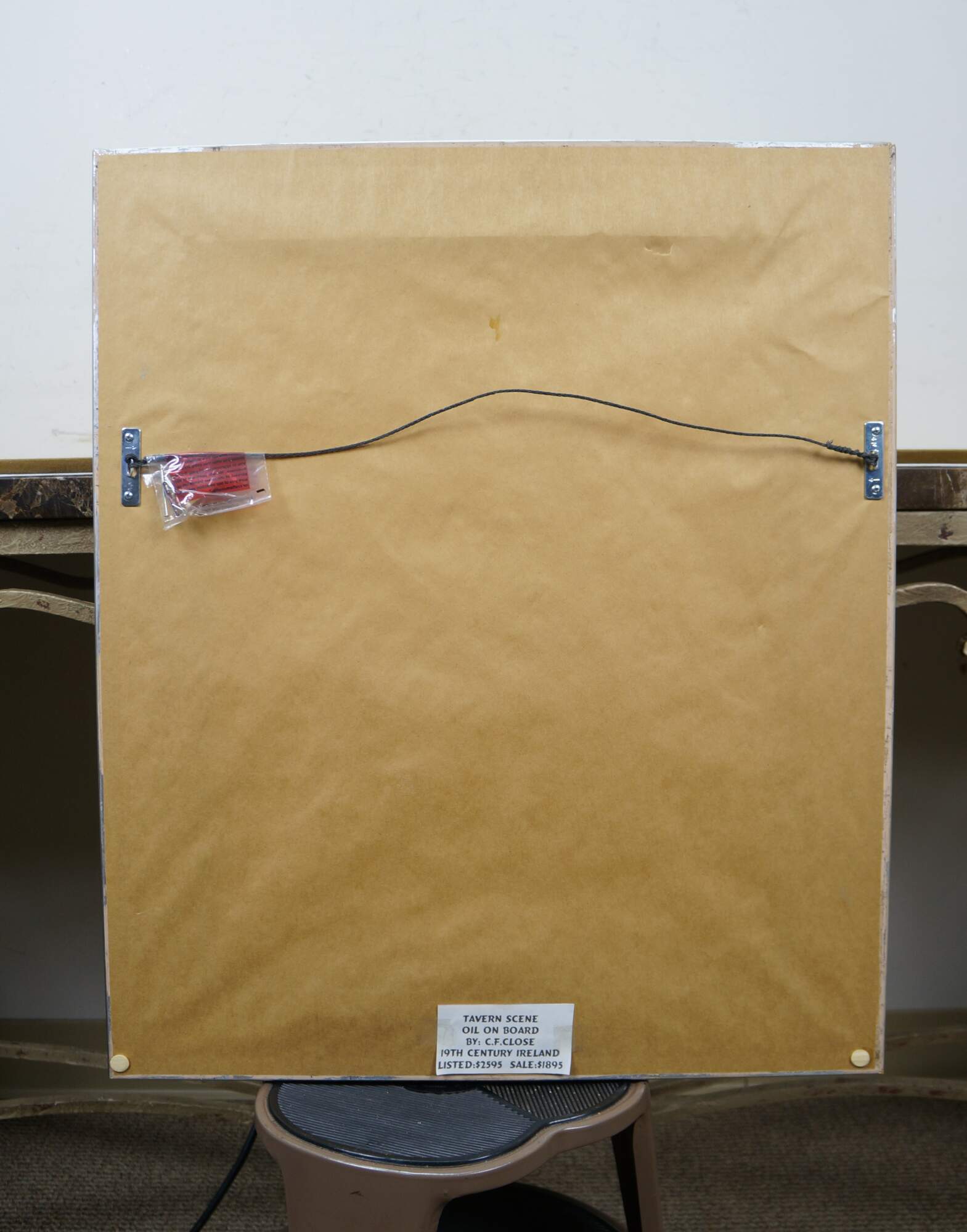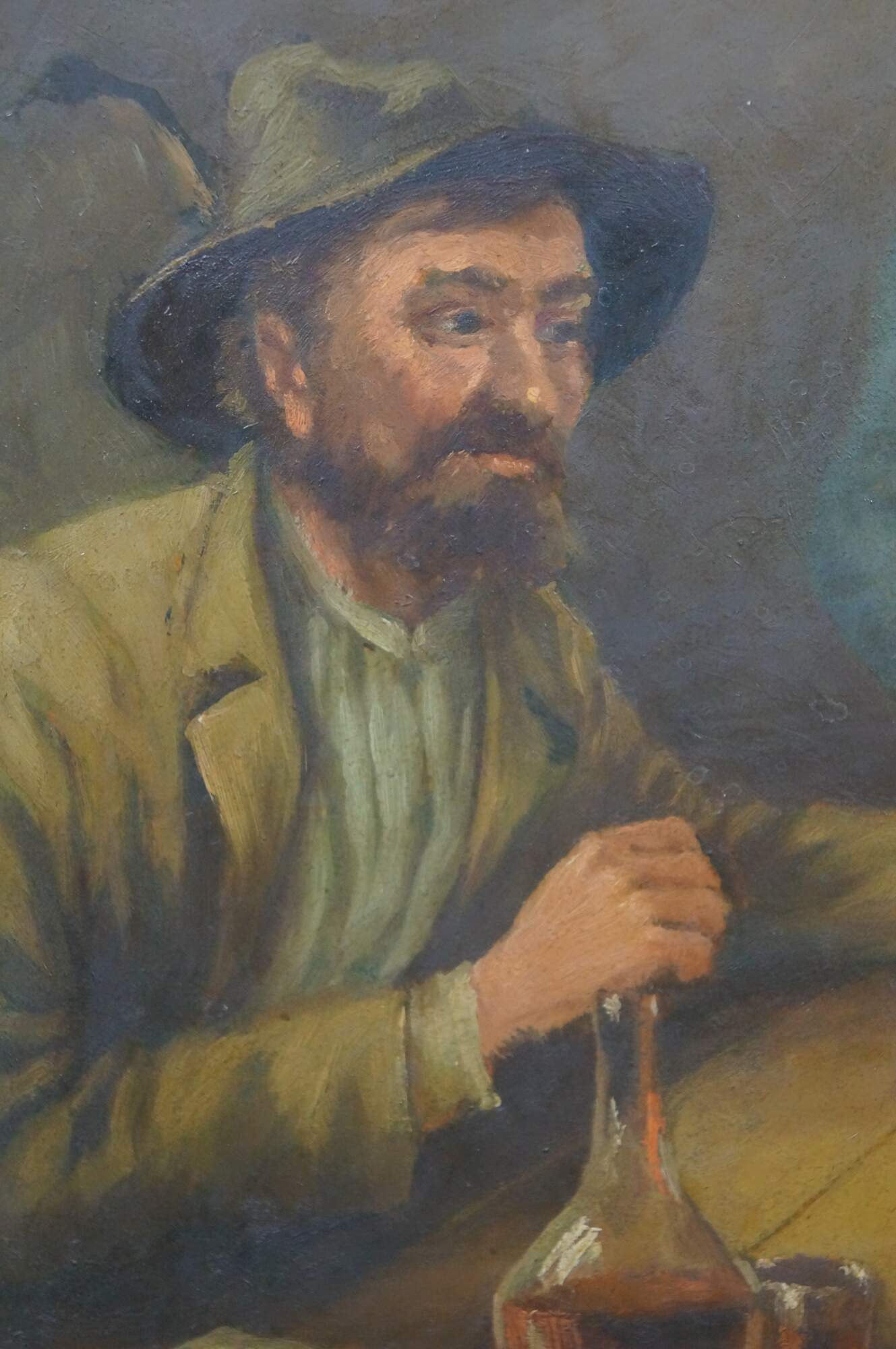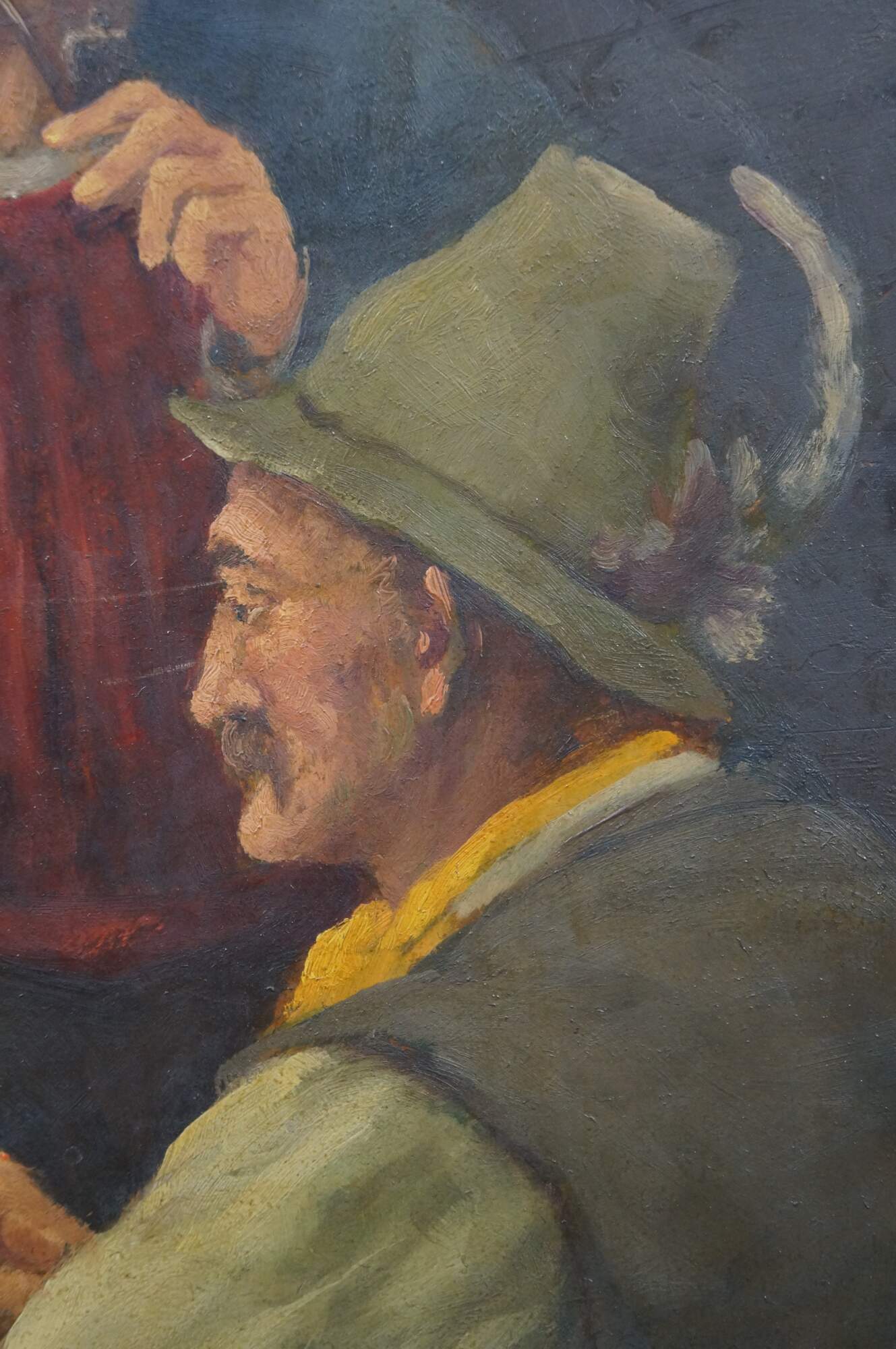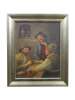 Antique oil on board painting depicting a trio of men in caps with feathers, seated at a rustic tavern table. Signed lower left. Attributed by previous seller as being by C.F. Close - 19th Century Ireland. . Beveled champagne gilt composite frame.