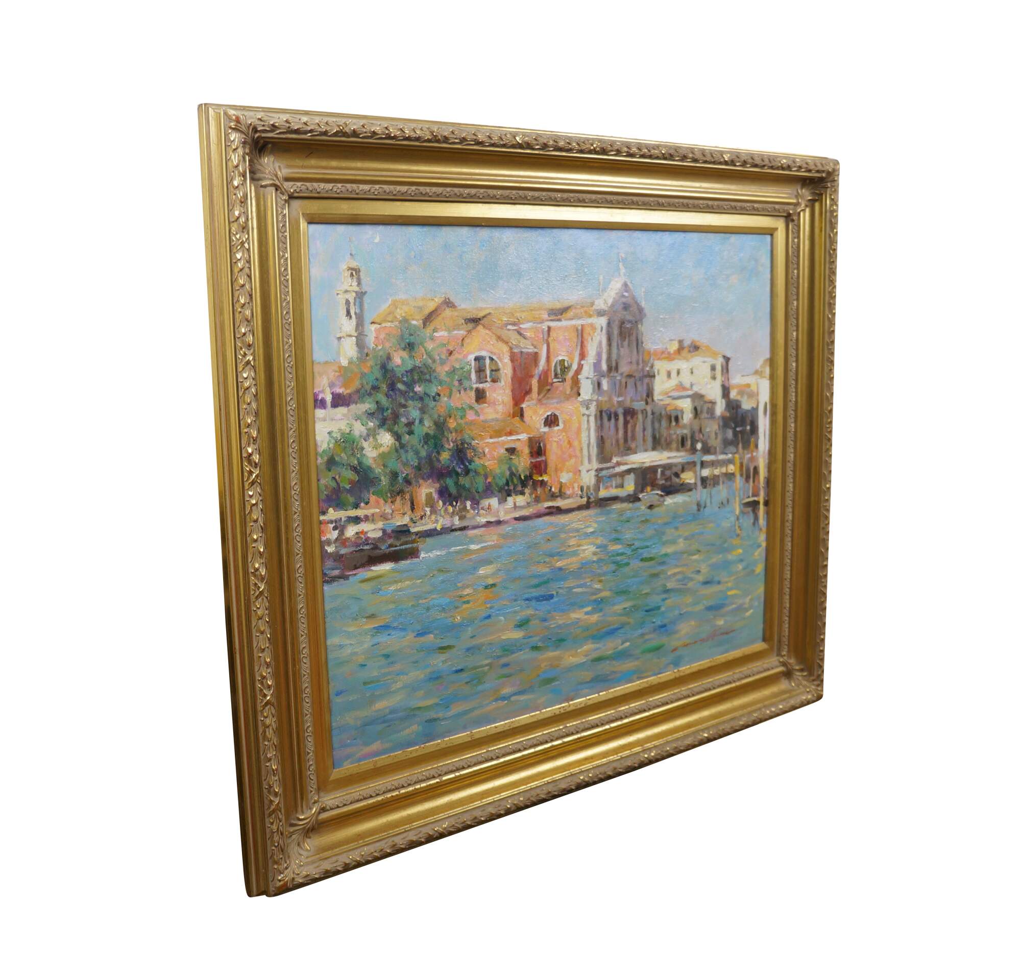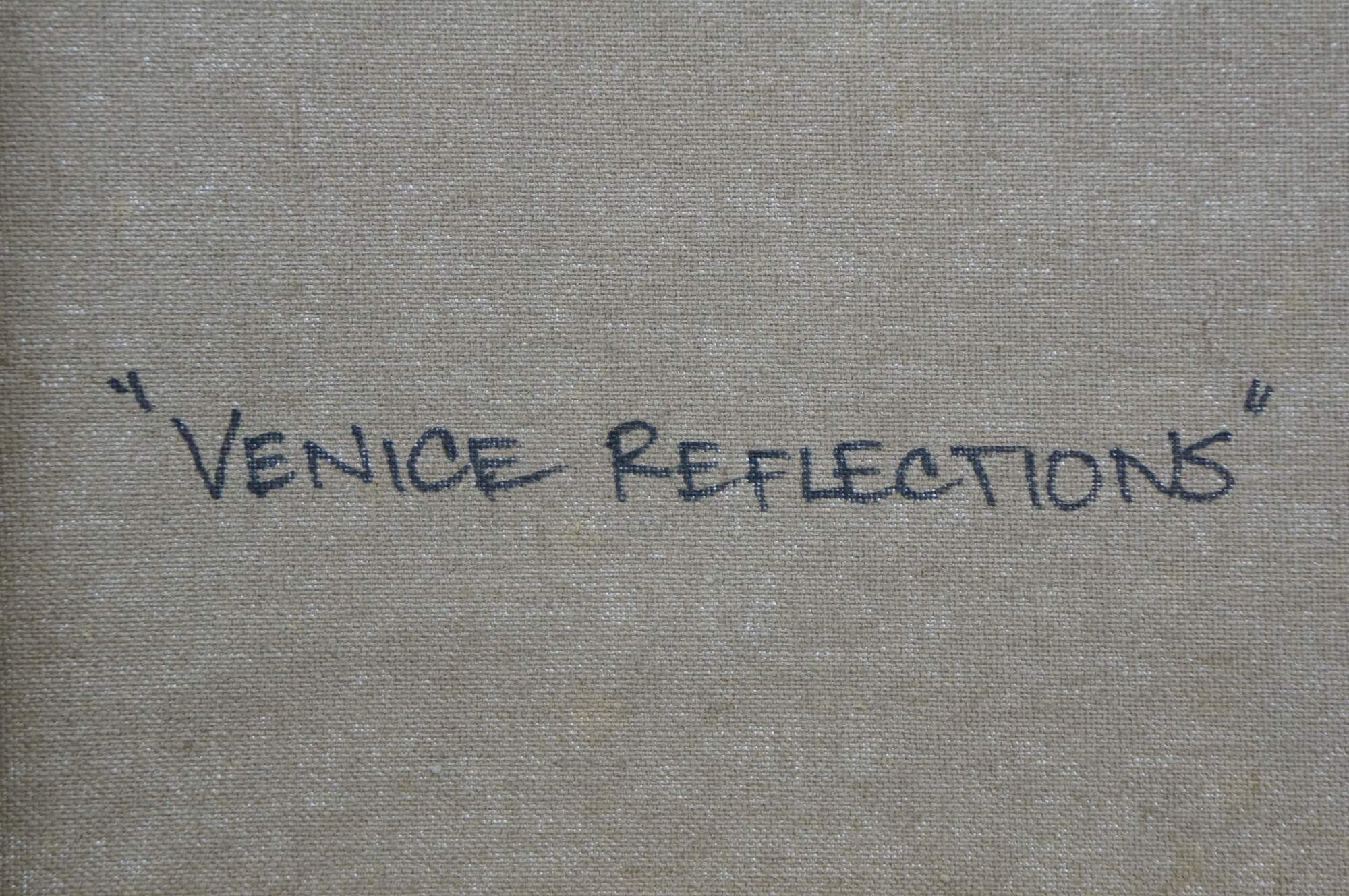 Late 20th century oil on canvas painting titled "Venice Reflections" by Leonard Wren. Impressionist cityscape showing a view of San Stae from the water of the Grand Canal in Venice, Italy. Signed, lower right. Titled on reverse. wood & gesso
