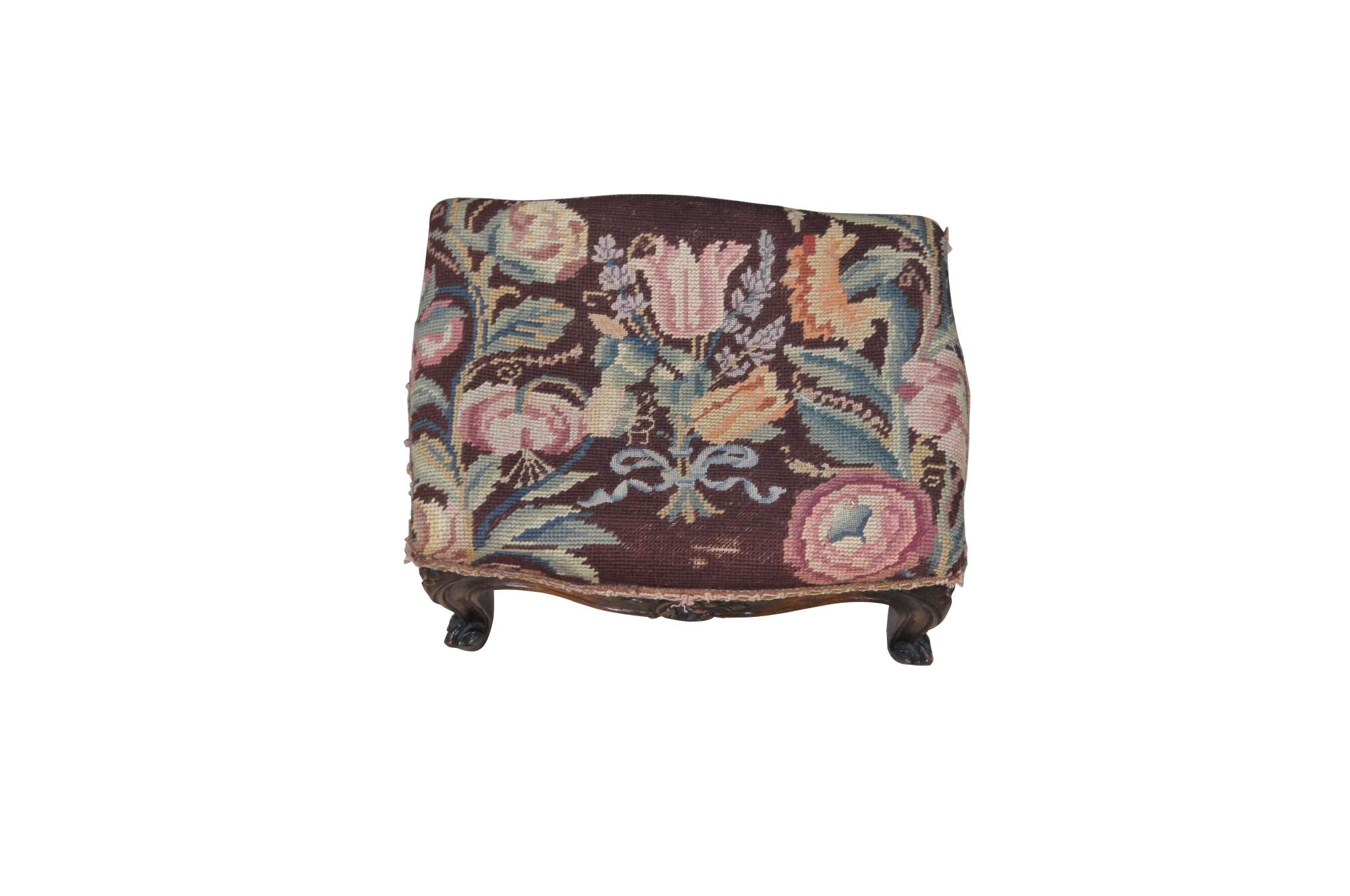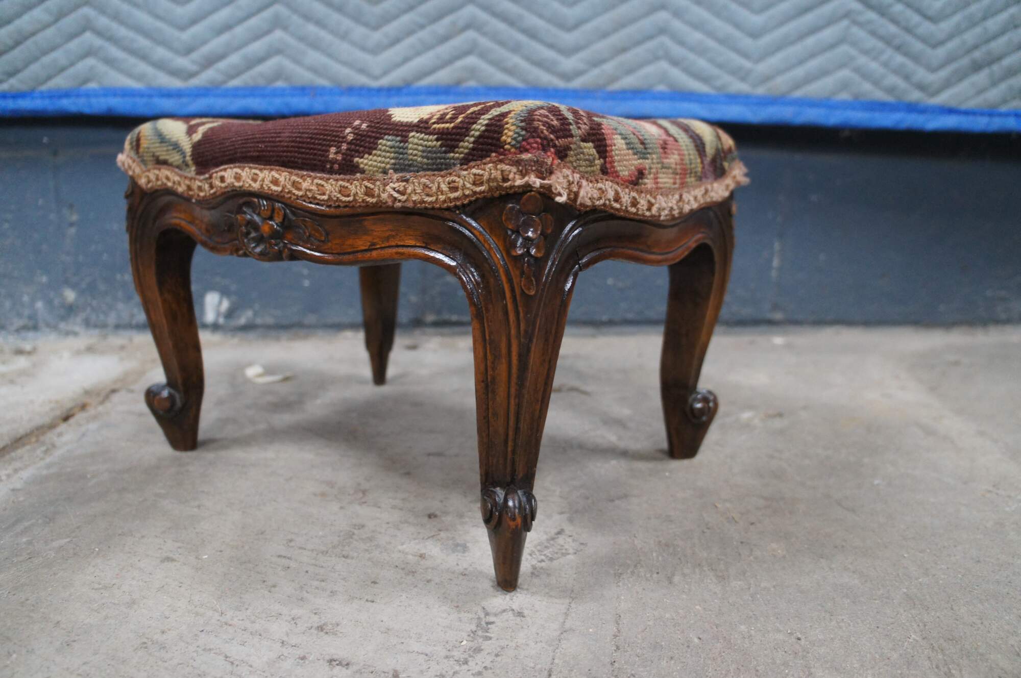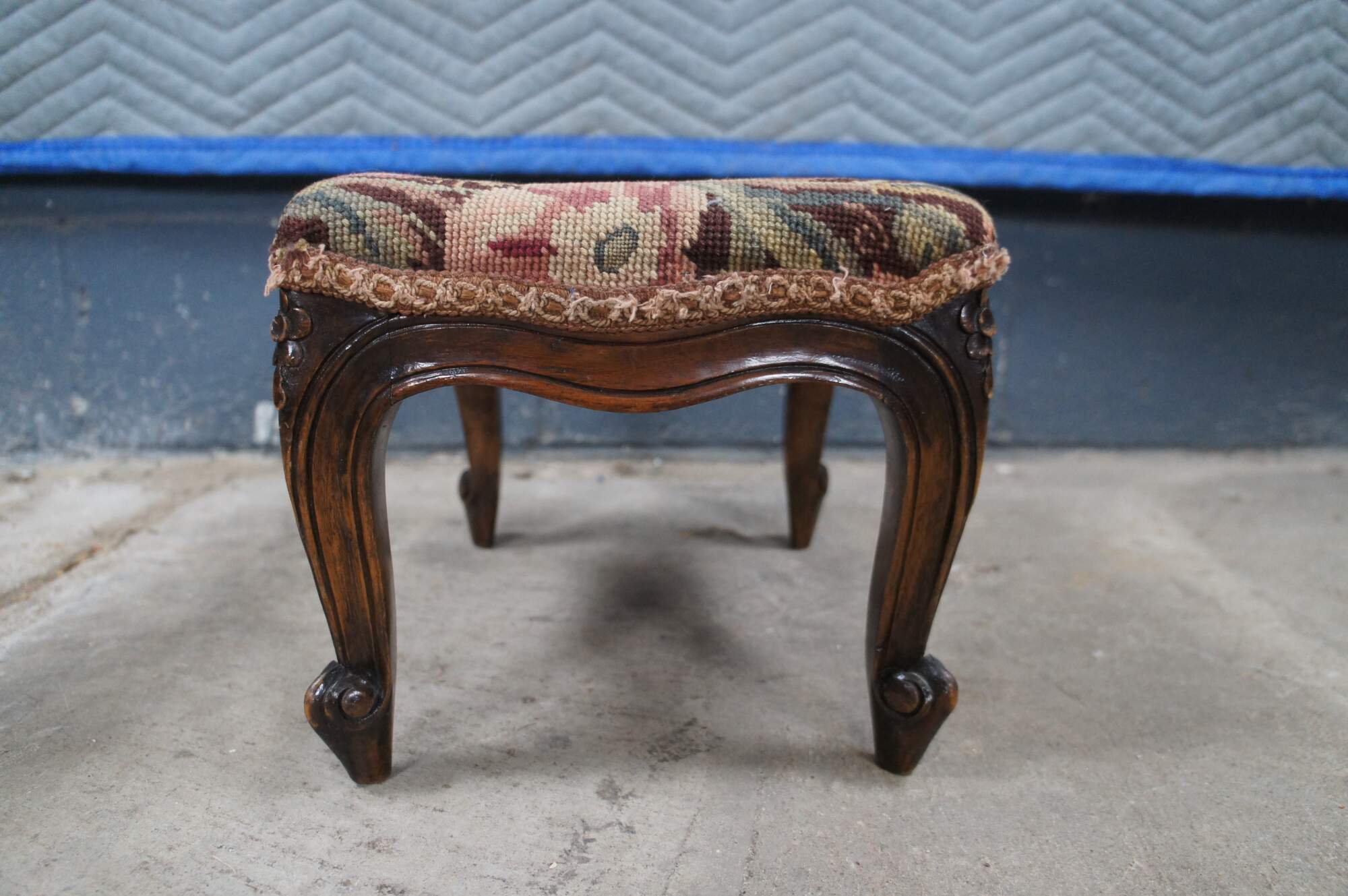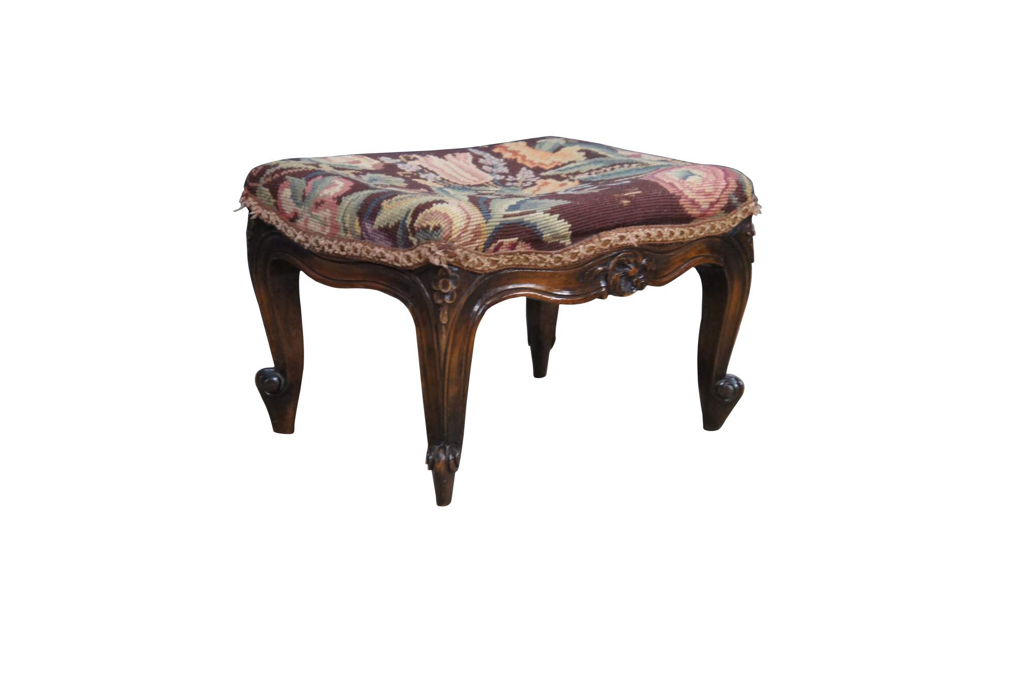 Antique French Louis XV stool, foot rest or ottoman. Made of walnut featuring serpentine form with carved floral, scalloped, and acanthus accents, and a Neoclassical floral rose and ribbon needlepoint upholstery..