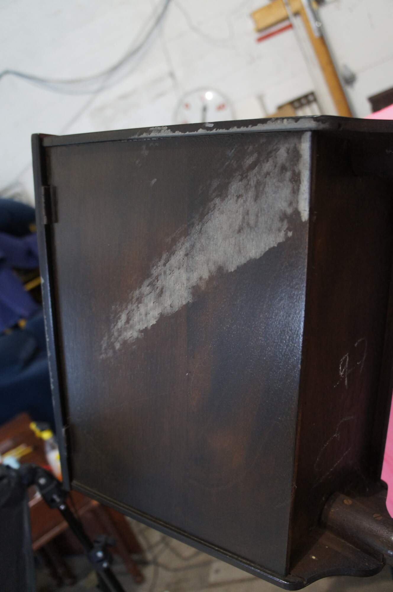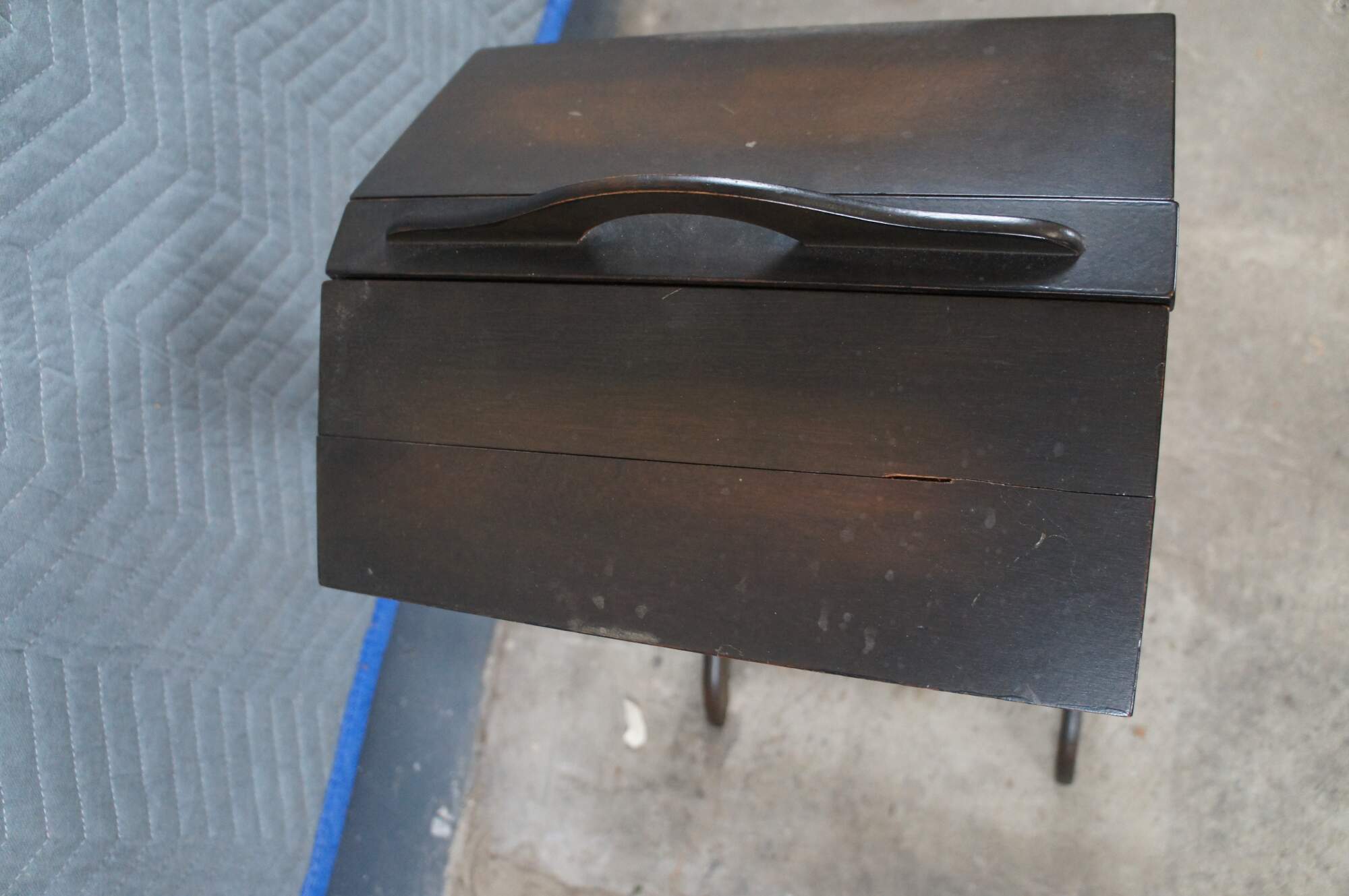 Structurally solid, marking, scuffing, split in top lid, finish loss.