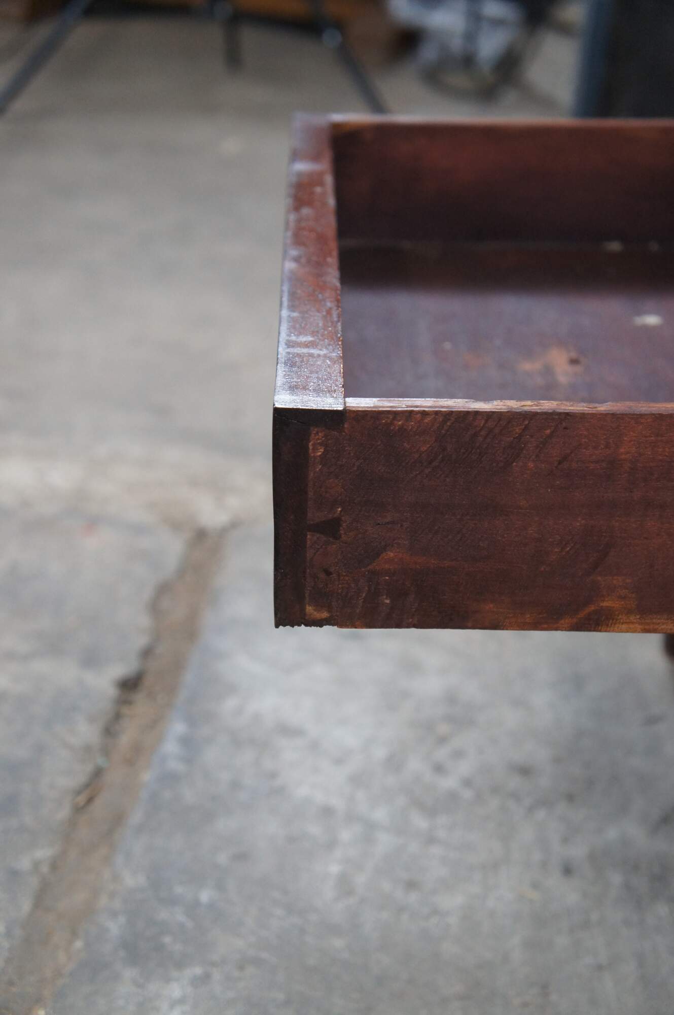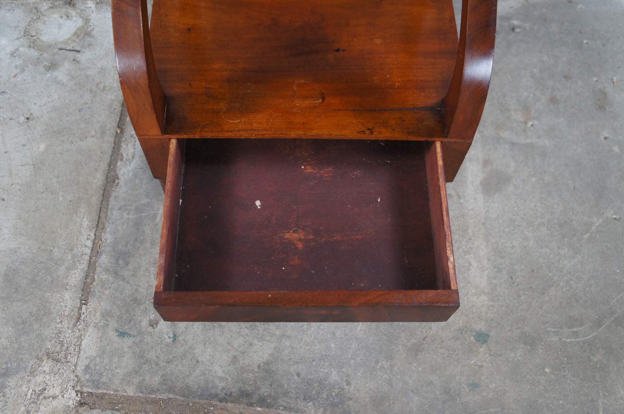 Antique two tier wash stand / parlor side table / nightstand. Made of flame mahogany featuring American Empire styling with large upper gallery surrounding a bowfront shelf, supported by scrolled and turned legs. Includes one lower drawer.
