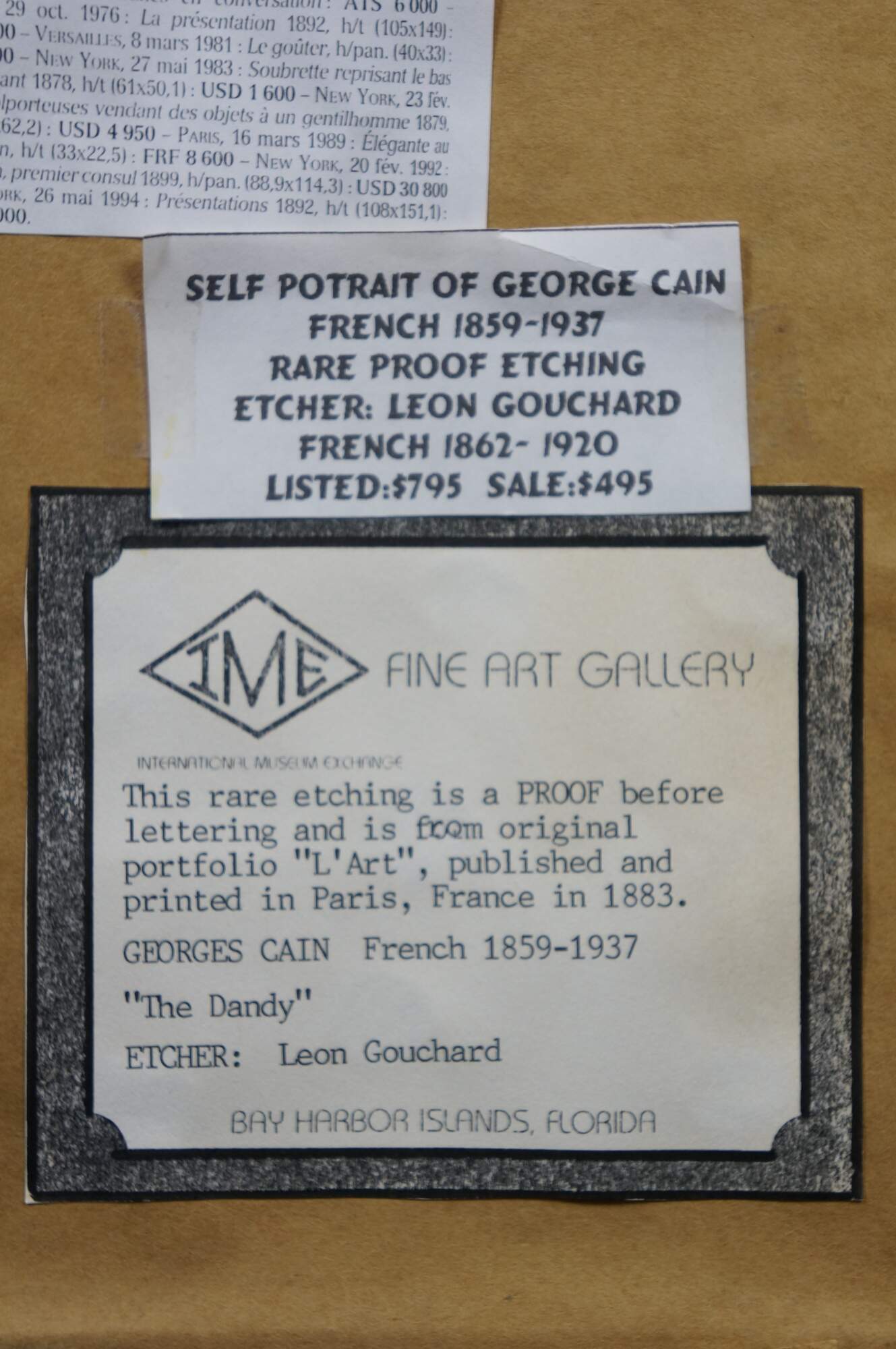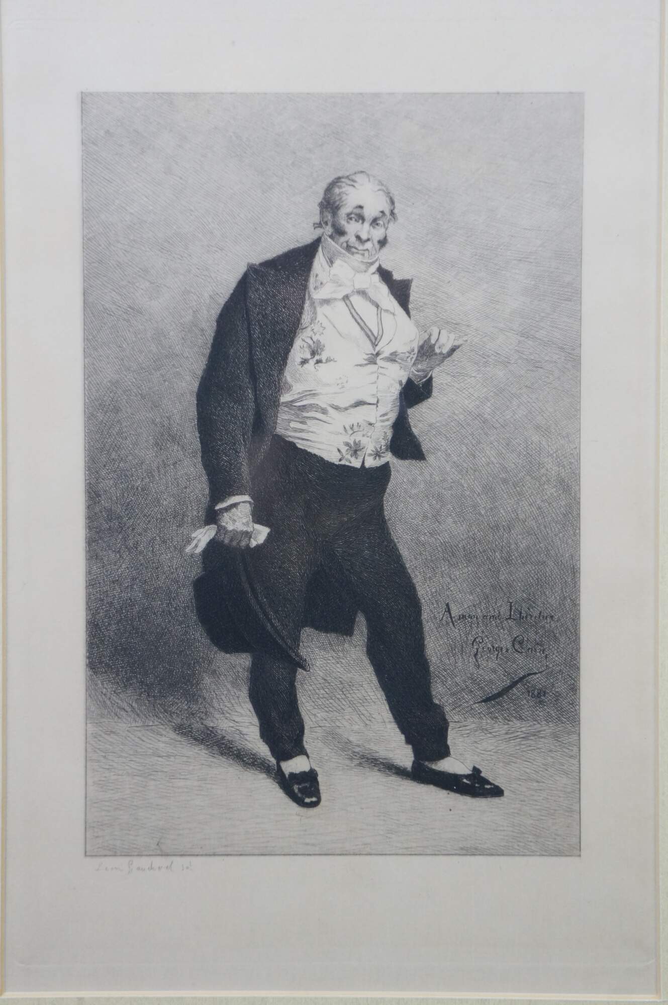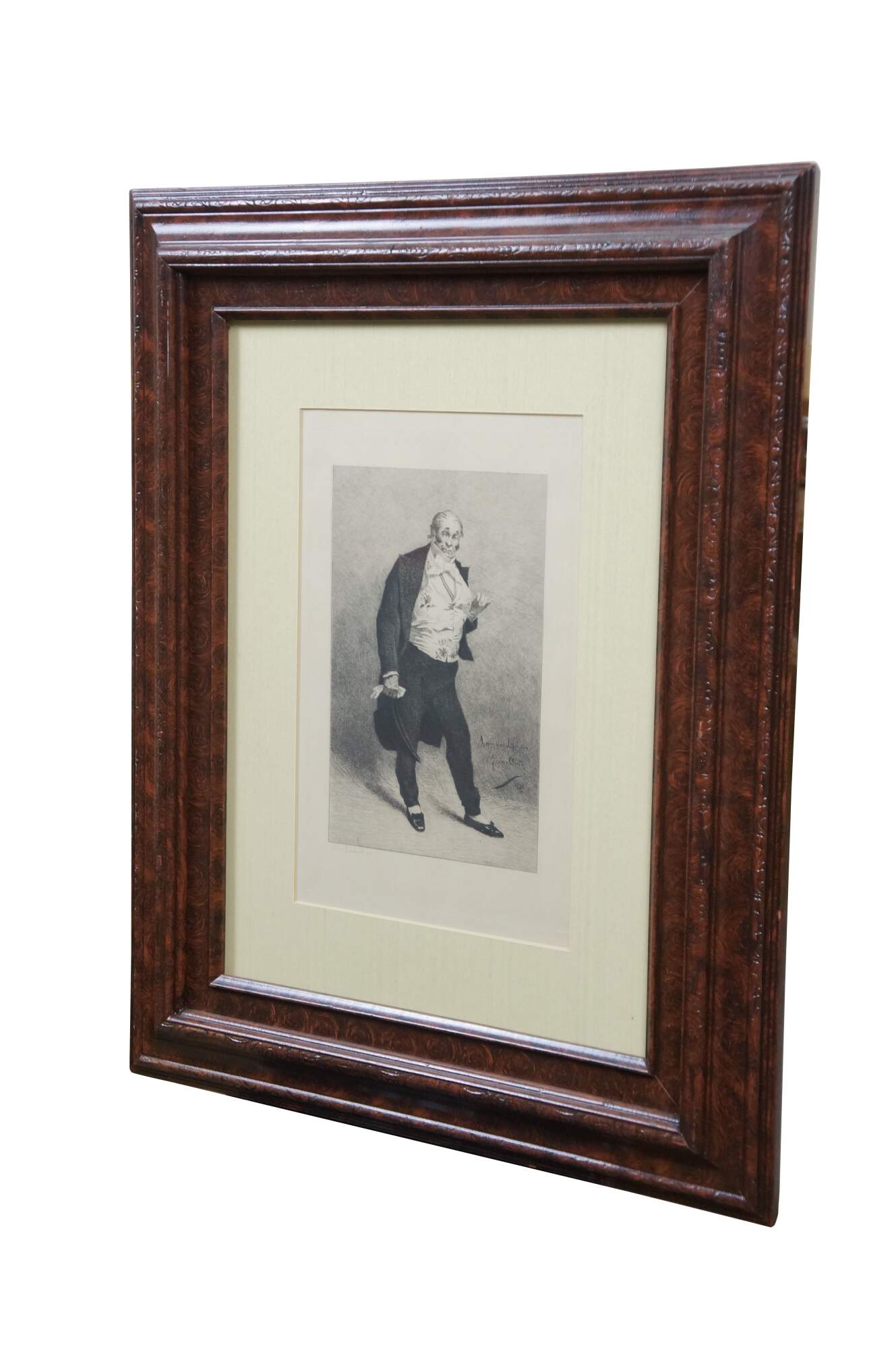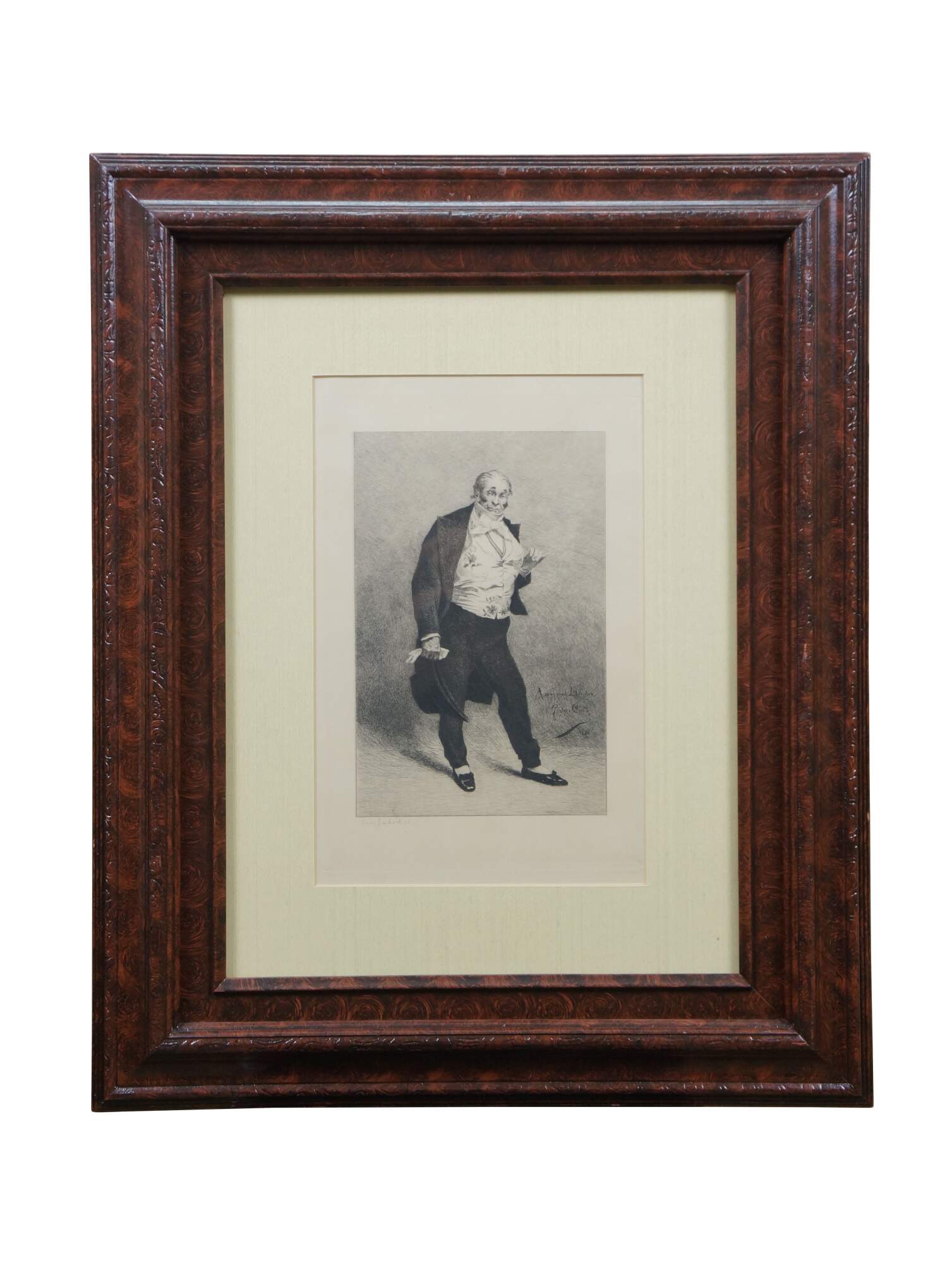 Late 19th century black and white etching of "Portrait de Lhéritier (Romain Thomas, dit), acteur (1809-1885) dans le rôle de Cordenbois de "la Cagnotte" de Labiche (Portrait of Lhéritier (Romain Thomas, known as), actor (1809-1885) in the role of Cordenbois in "La Cagnotte" by Labiche) by Georges Cain. Depicts a gentleman in evening wear with a floral vest, holding gloves and hat. Inscribed "A mon ami Lhéritier (To my friend Lethier) Georges Cain 1881" at lower right. Etcher Leon Gouchard. From "Proof Etchings for L'Art - 1883." Wood frame with raised bevel and painted wood grain; white mat.