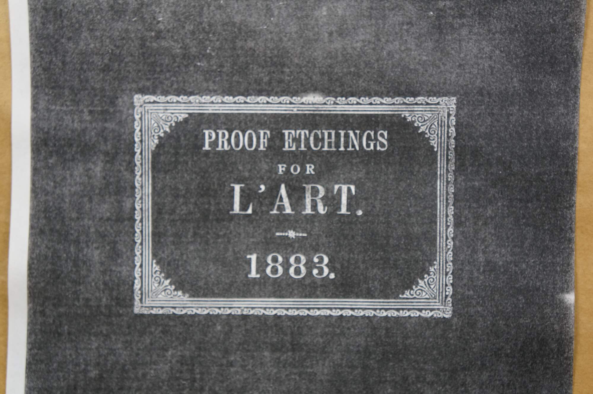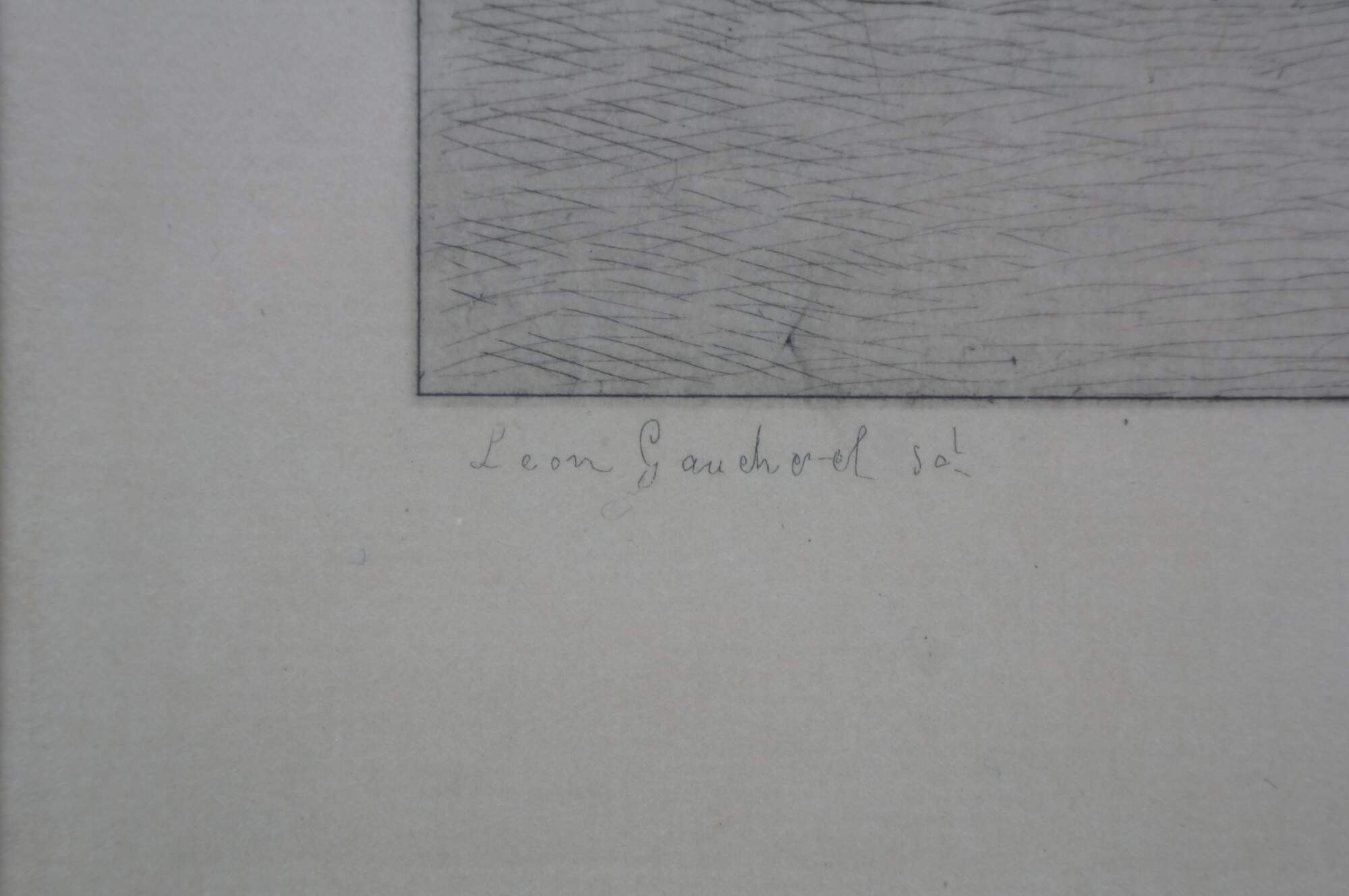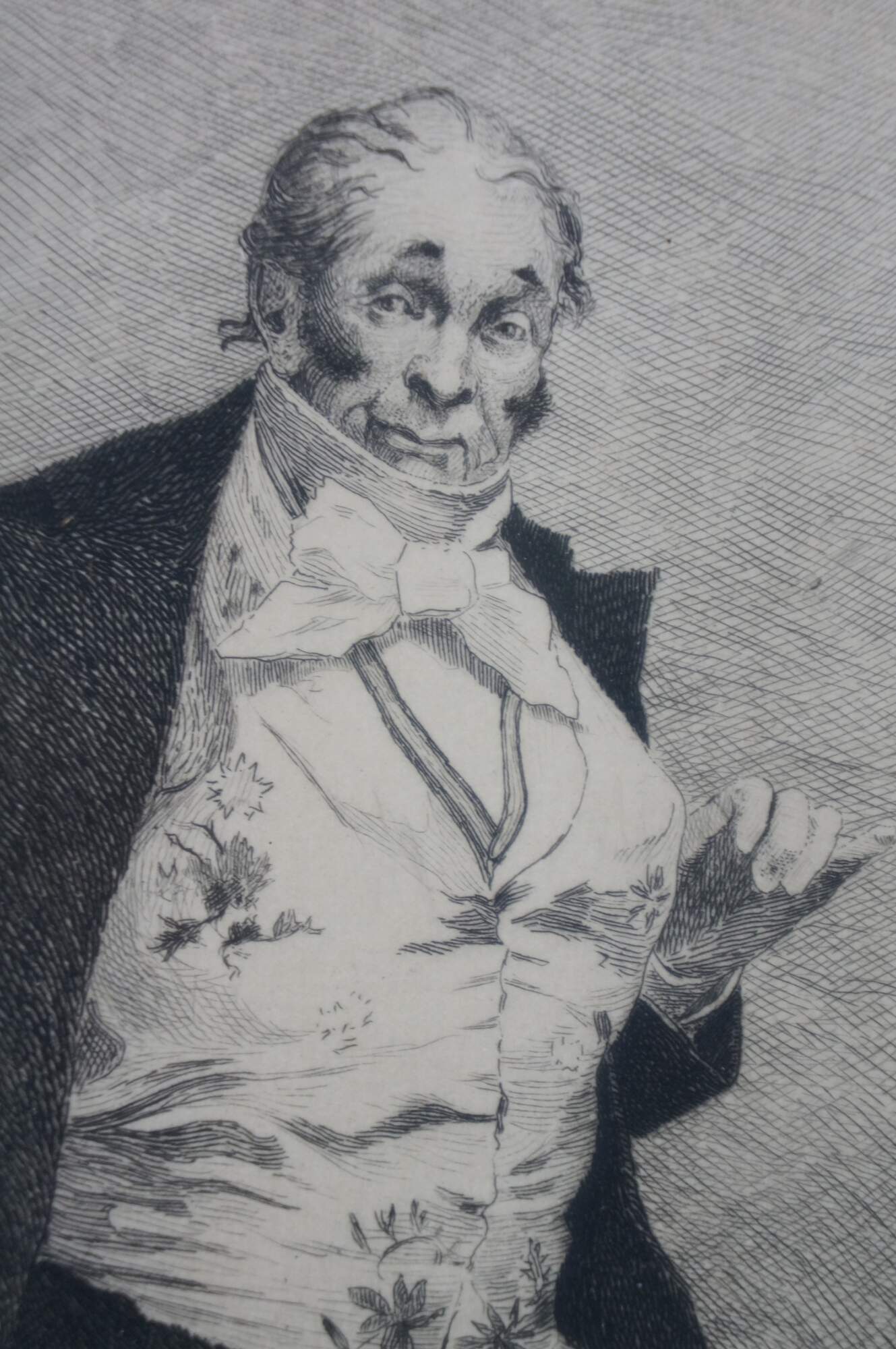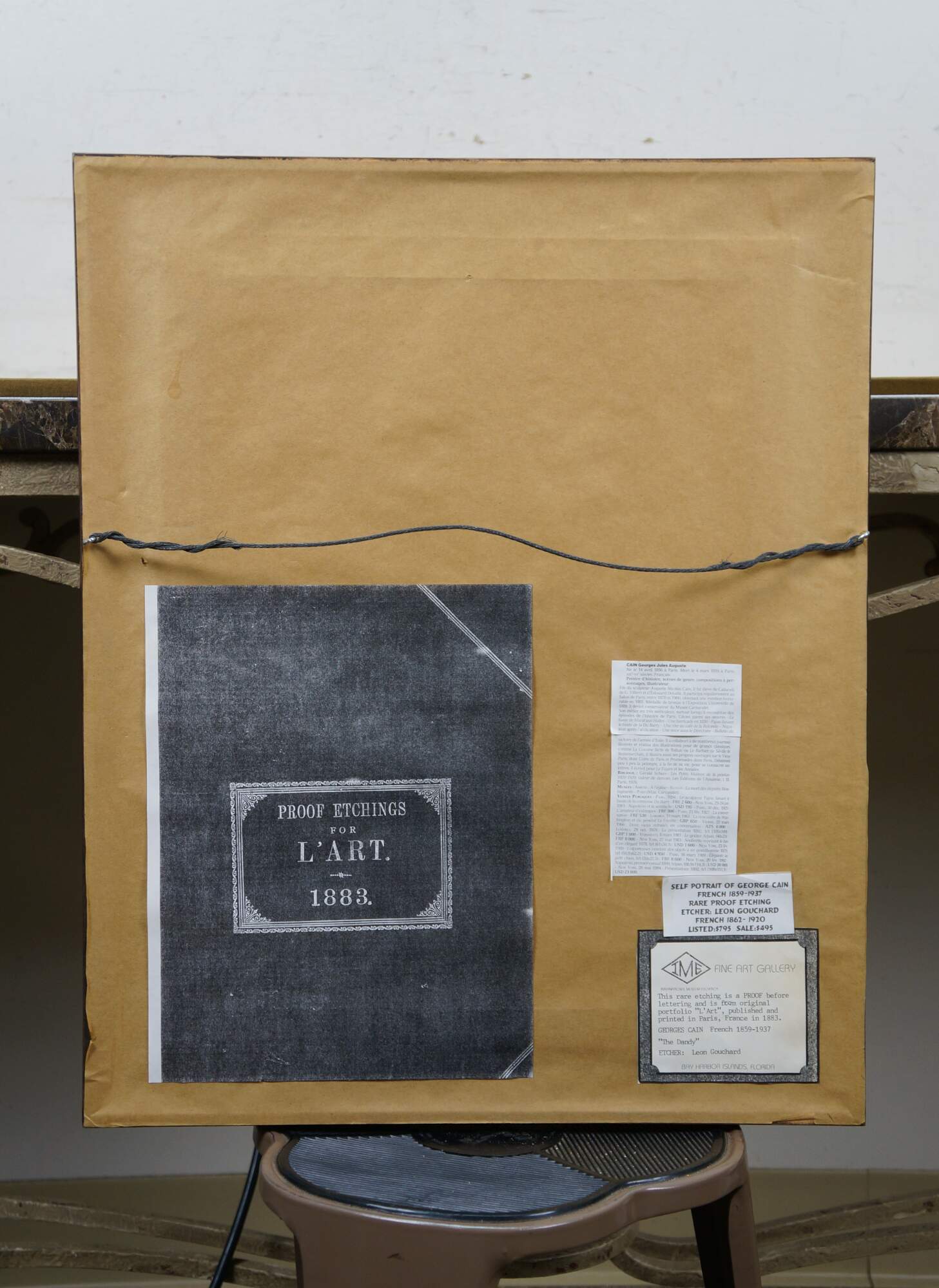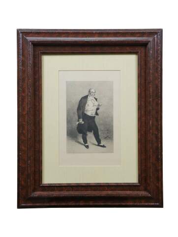 Late 19th century black and white etching of "Portrait de Lhéritier (Romain Thomas, dit), acteur (1809-1885) dans le rôle de Cordenbois de "la Cagnotte" de Labiche (Portrait of Lhéritier (Romain Thomas, known as), actor (1809-1885) in the role of Cordenbois in "La Cagnotte" by Labiche) by Georges Cain. Depicts a gentleman in evening wear with a floral vest, holding gloves and hat. Inscribed "A mon ami Lhéritier (To my friend Lethier) Georges Cain 1881" at lower right. Etcher Leon Gouchard. From "Proof Etchings for L'Art - 1883." Wood frame with raised bevel and painted wood grain; white mat.