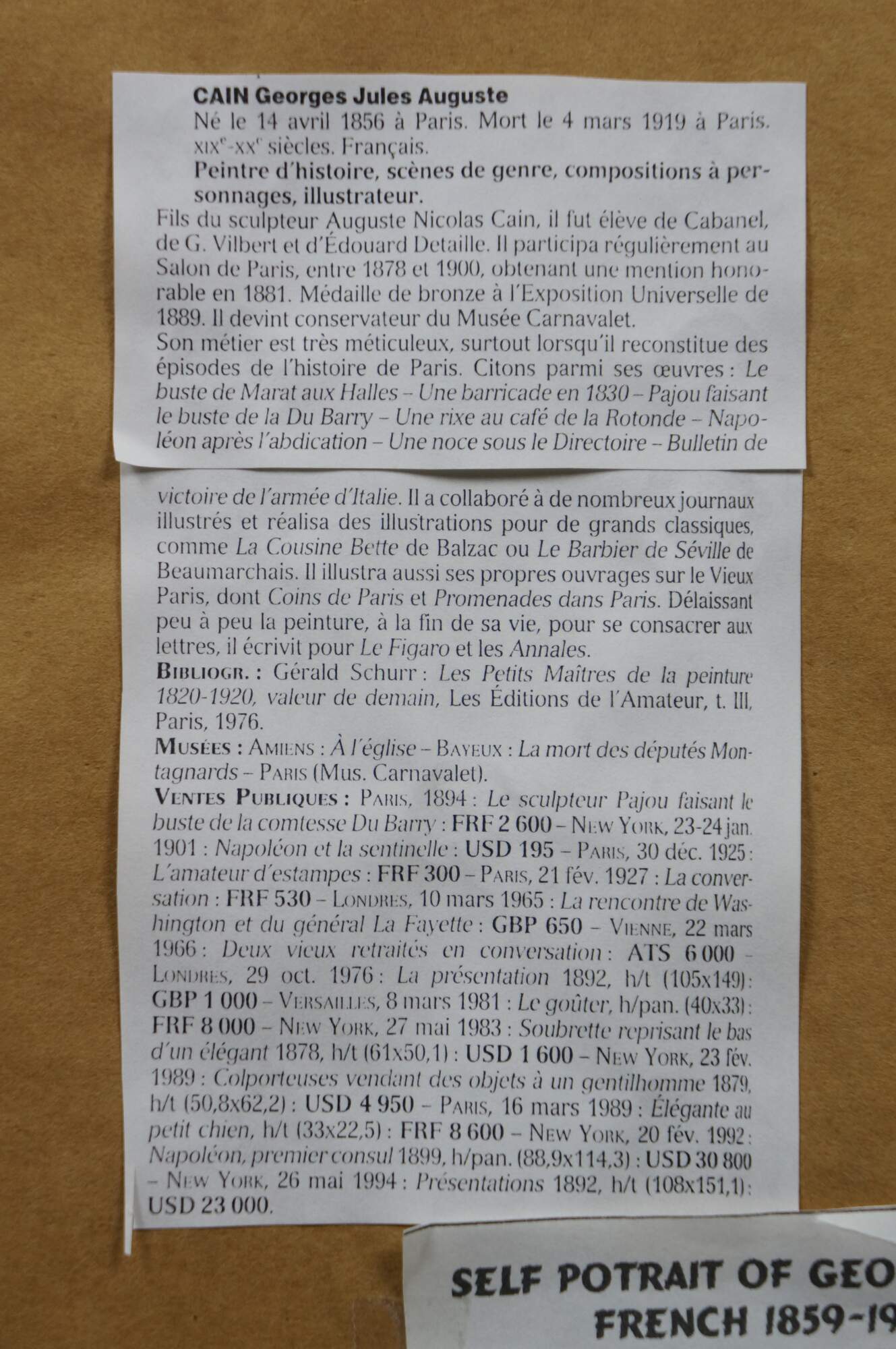 "Georges-Jules-Auguste Cain (16 April 1856, Paris - 4 March 1919, Paris) was a French painter, illustrator and writer, who specialized in the history of Paris, its monuments and its theaters. His grandfather, Pierre-Jules Mêne and his father, Auguste Cain were both animal sculptors. He studied with Alexandre Cabanel and Jean-Georges Vibert, but was most heavily influenced by Édouard Detaille. In 1878, he made his debut at the Salon with Fumeur de l'époque Louis XV (Smoker from the Time of Louis XV) and continued to exhibit there on a regular basis until 1900. He illustrated the Barber of Seville by Beaumarchais and several works by Honoré de Balzac, including La Cousine Bette and La Bourse. His works may be seen in the Musée Baron Gérard in Bayeux, the Musée de Picardie in Amiens, and the Musée Carnavalet in Paris, where he served as Curator from 1897 to 1914. His brother Henri was a famous librettist. A square in Le Marais, near the Musée Carnavalet, has been named in his honor." (Wikipedia)