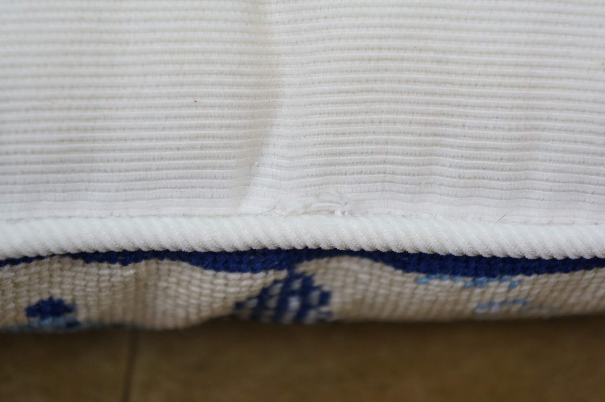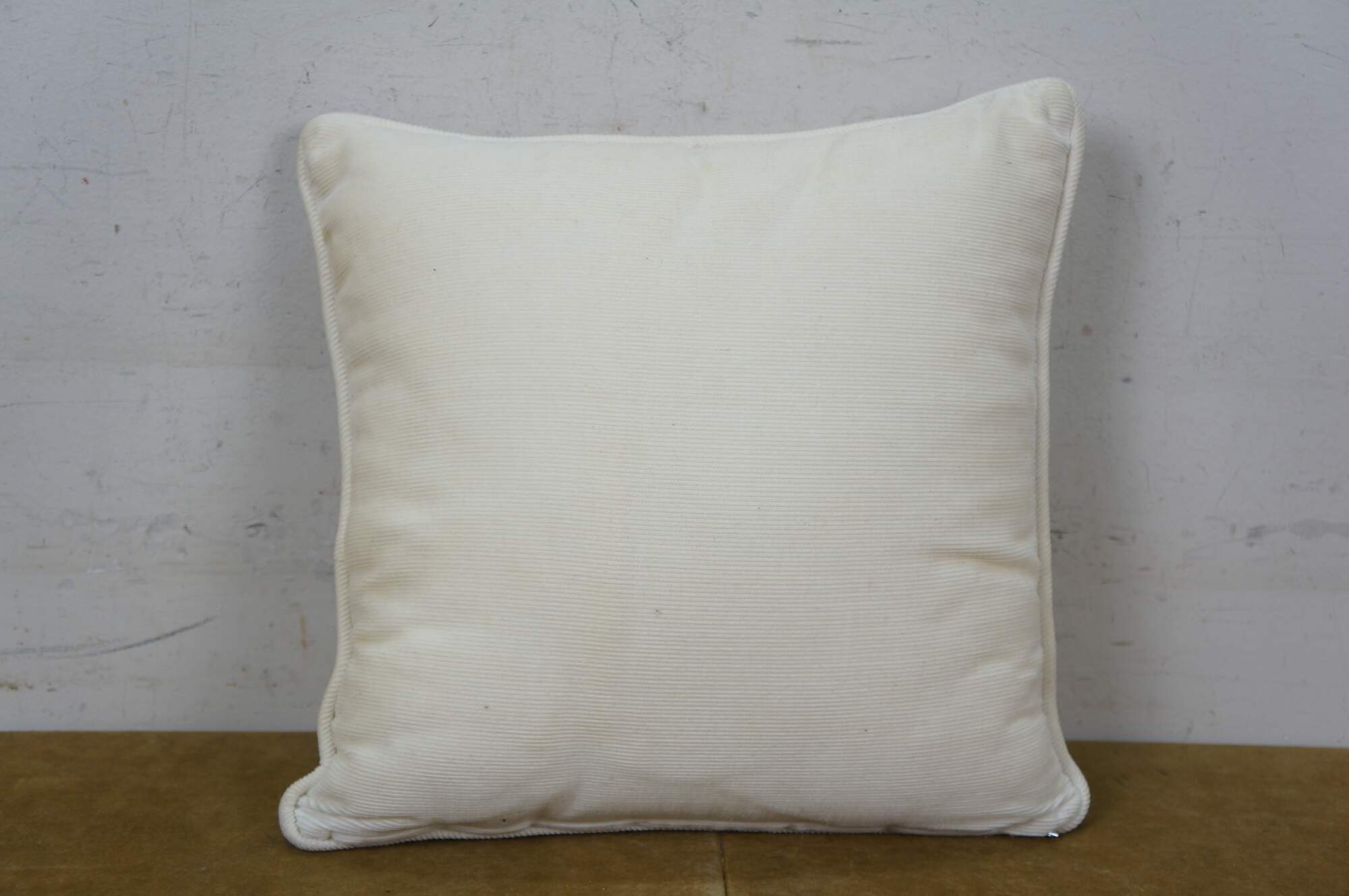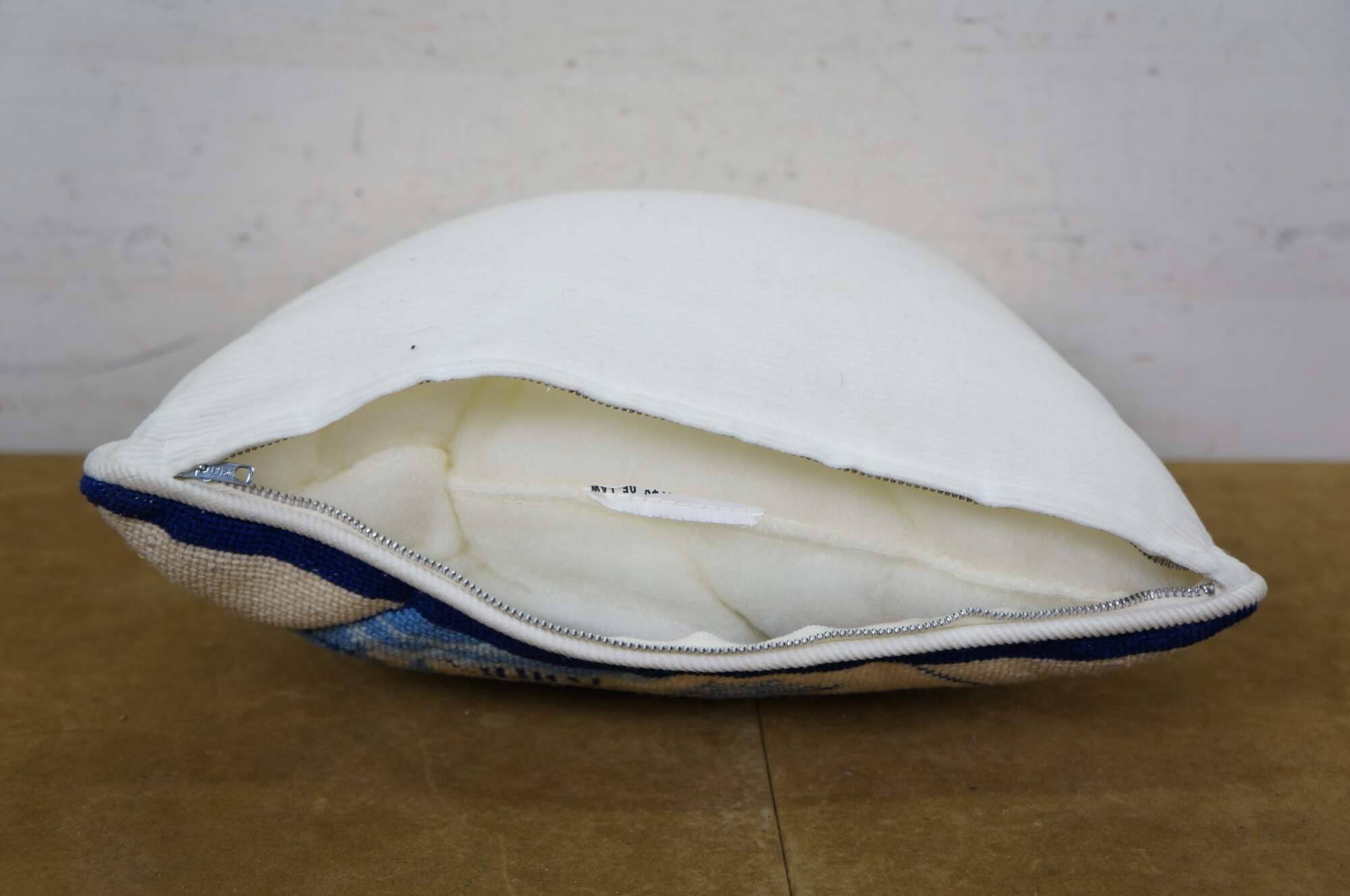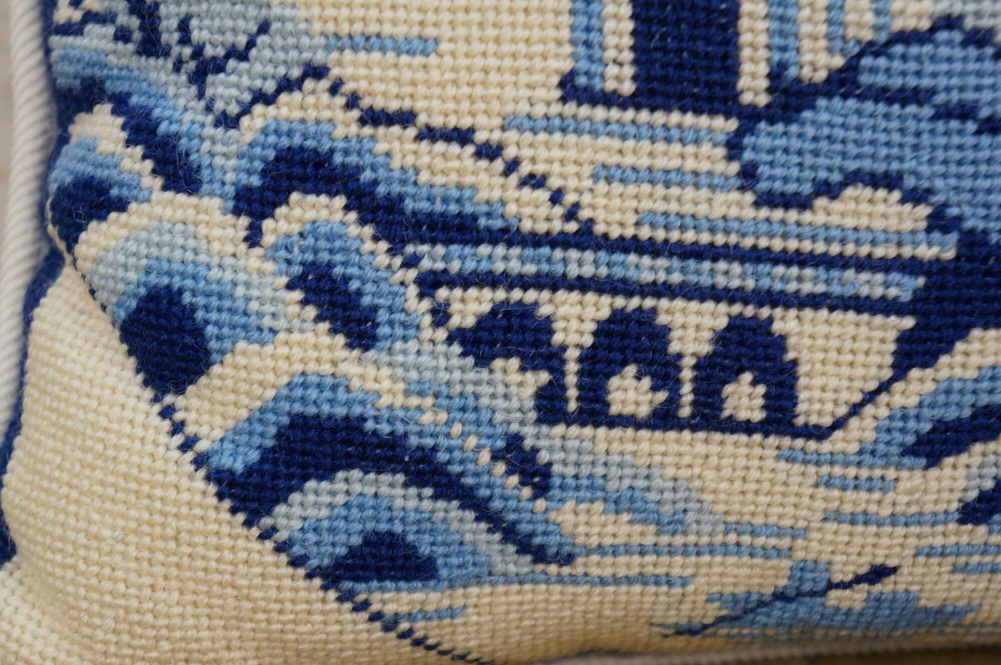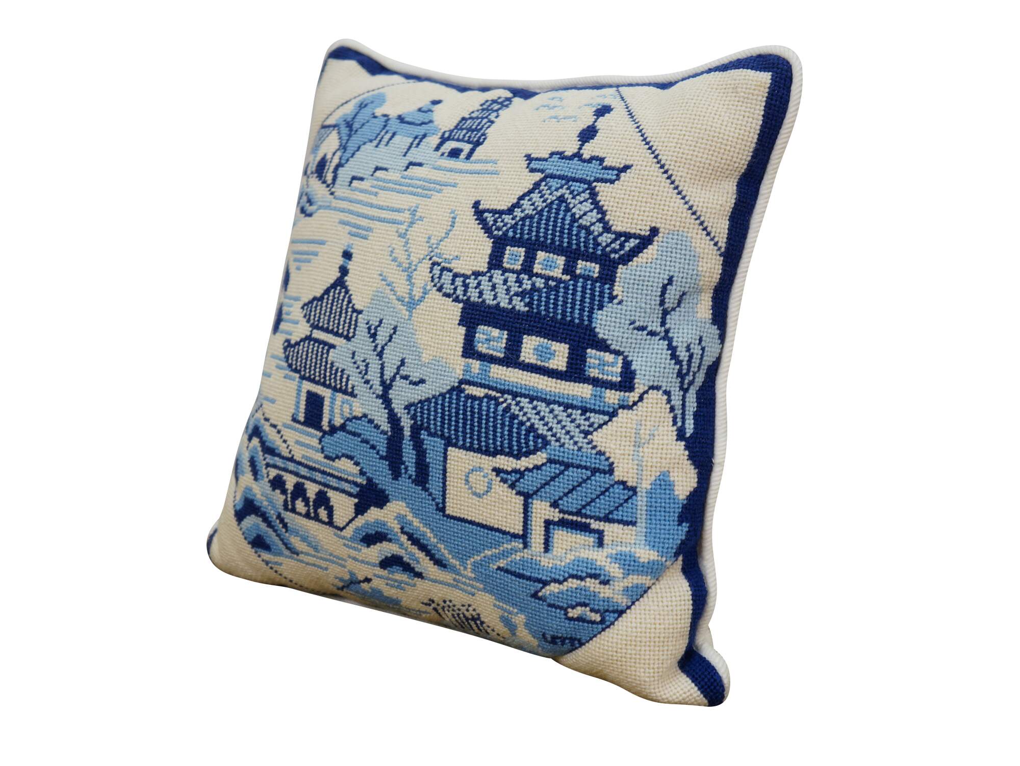 Late 20th century blue and white throw pillow featuring a cross stitched / needplepoint Blue Willow / chinoiserie inspired landscape of pagodas. Blue trim. White courderoy back and piping. Zipper closure, fiber filled.